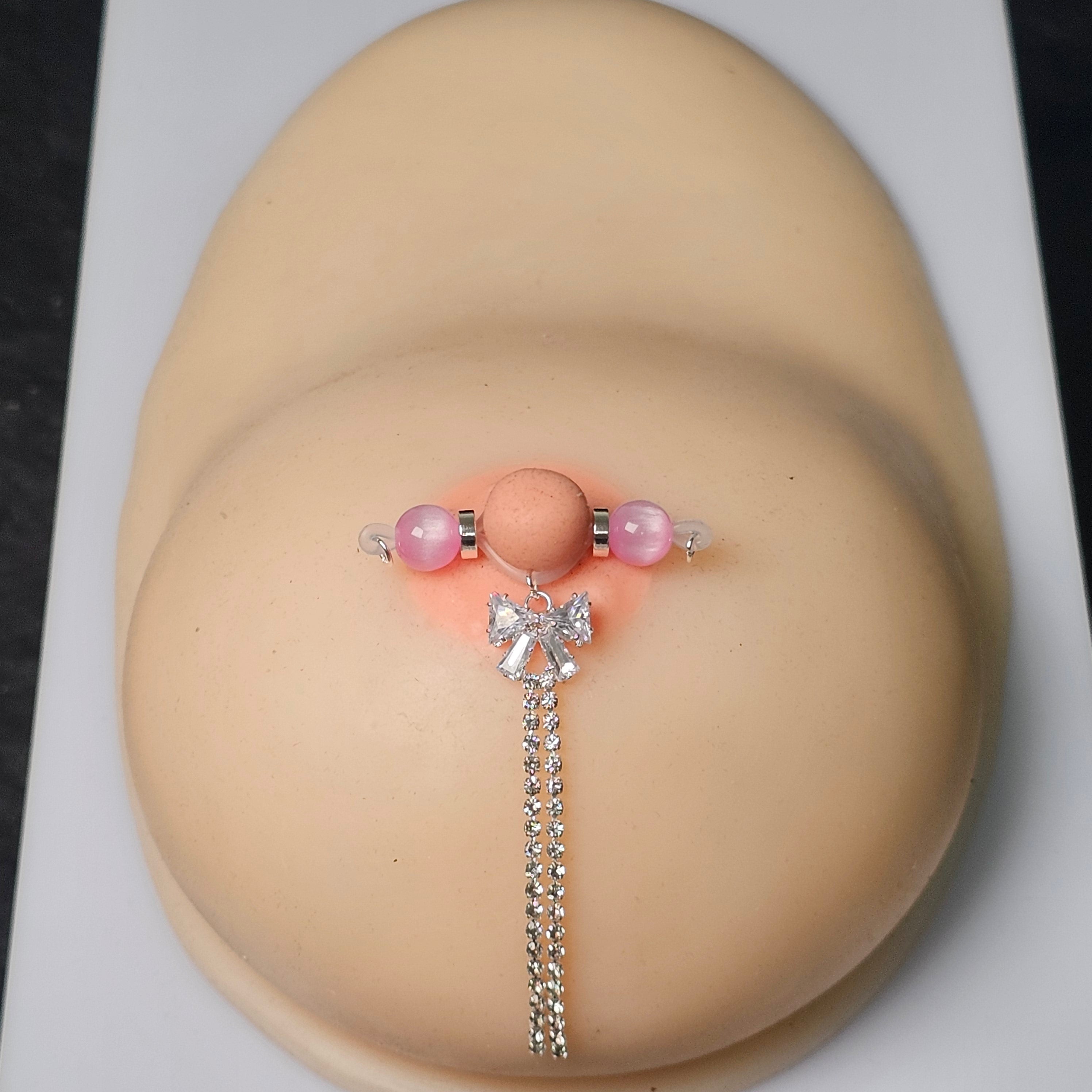 This barbell-style adjustable nipple clamp features pink gemstone beads paired with a crystal bow and diamond chain pendant, embodying a blend of elegance and playfulness. The pink gemstones radiate a gentle glow, embodying a delicate and romantic touch. The bow symbolizes lightness and beauty, while the diamond chain detail adds a shimmering texture, creating a sophisticated and refined look. The clamp's smooth, adjustable construction provides stability and durability, allowing for customized tightness and comfort, combining practicality and aesthetics. The overall design strikes a balance between sweetness and sensuality, creating a feminine yet assertive look. Whether worn for everyday wear or as a statement piece for special occasions, this nipple clamp highlights the wearer's unique temperament and taste, making it an ideal choice for those seeking elegance and exclusivity.