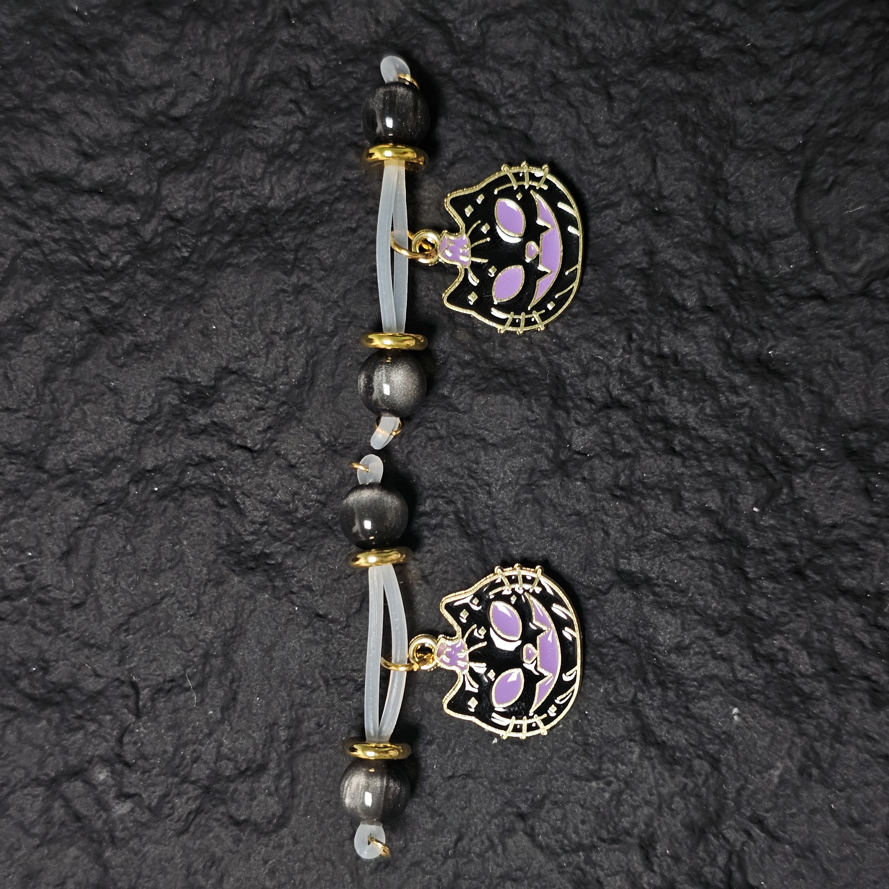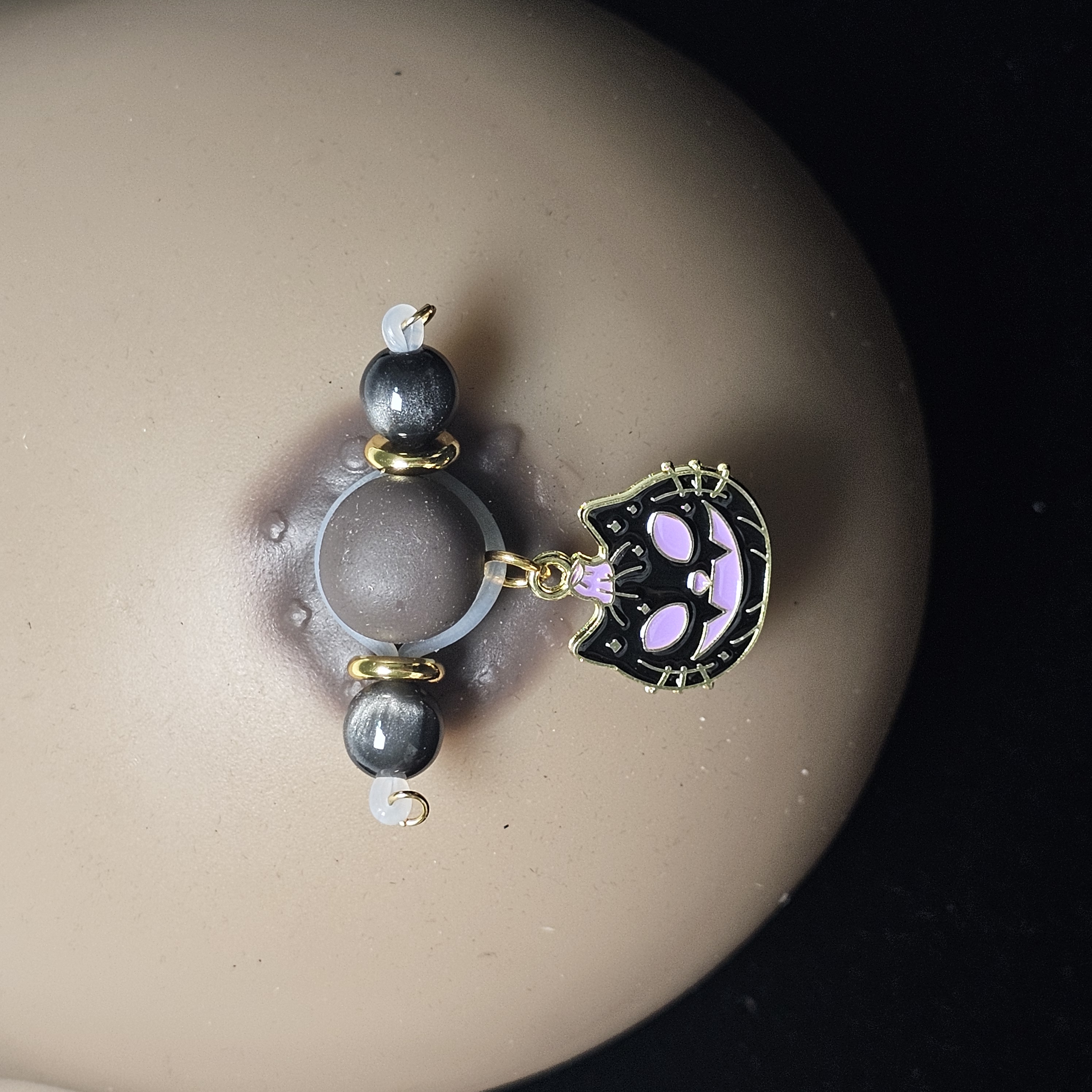 This nipple clamp cleverly blends mysterious cool with festive playfulness, creating a unique and eye-catching accessory. The classic barbell construction is sturdy yet refined, and paired with black beads, it exudes a cool and powerful understated elegance. The pendant, shaped like a kitten, features realistic and playful details, embodying the joy of Halloween while adding a touch of playfulness and cuteness. The bright and mysterious black and purple kitten adds dimension and visual impact to the overall look. The clamp is adjustable for a secure fit, ensuring comfort and freedom of movement. Whether worn as a styling embellishment for a holiday party or as a subtle, everyday statement piece, this nipple clamp is sure to add sparkle and conversation, making it an ideal gift or personal accessory.