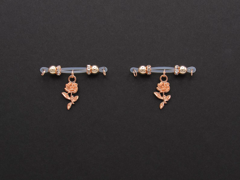A pair of adjustable barbell style fake nipple piercers. Avoid the pain and discomfort associated with piercing, safer and more hygienic. Made with food grade silicone band, and rose gold pendant, the beads are 5mm diameter premium artificial pearls 🩷
