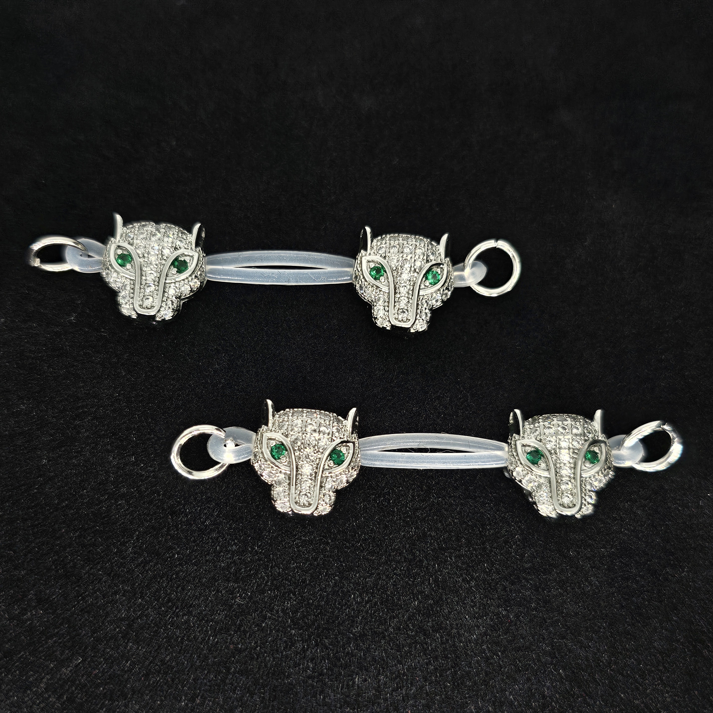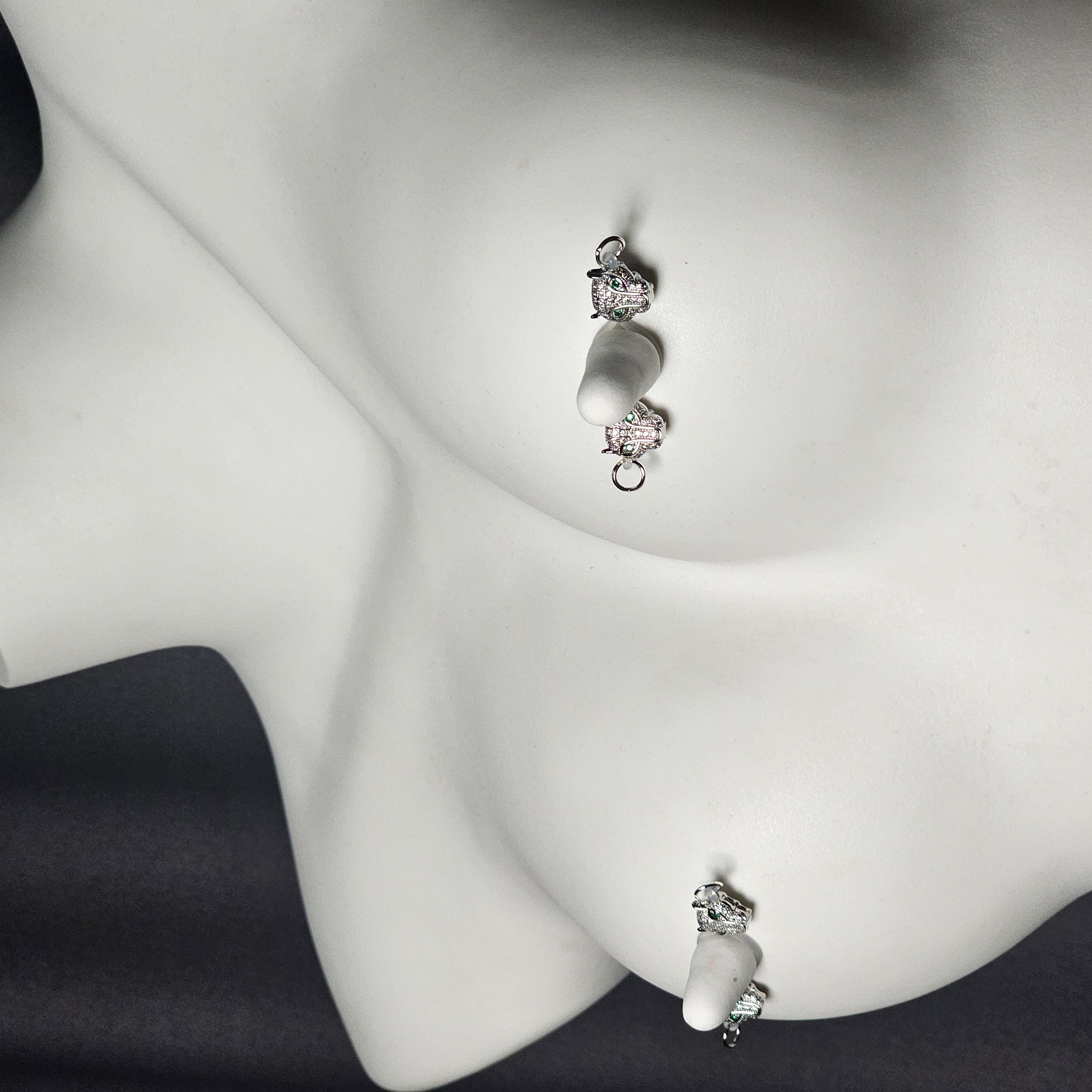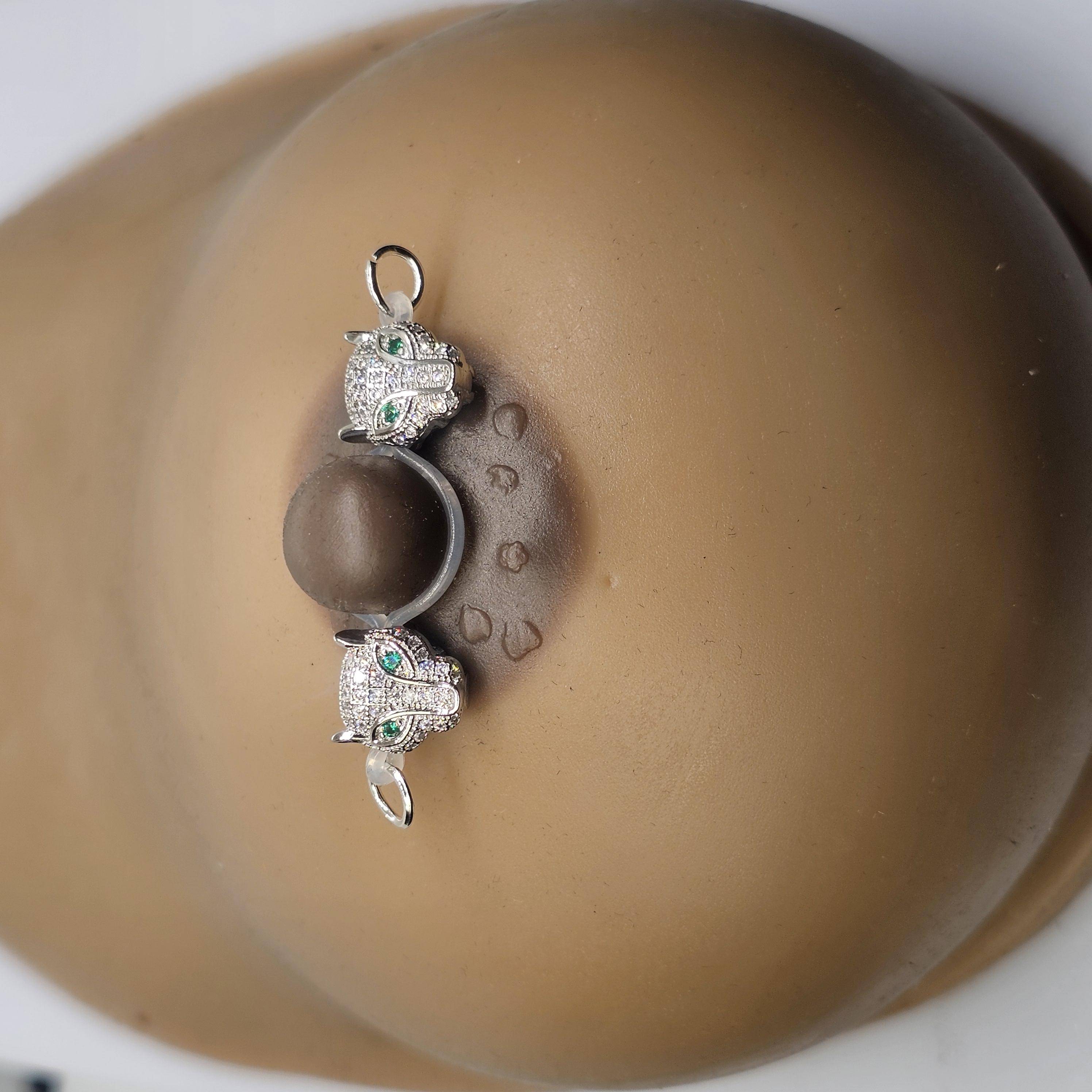 This adjustable barbell-style nipple clip features a bold silver leopard head design with striking green gemstone eyes. The polished metallic finish adds a luxurious, edgy touch, perfectly blending wild elegance with modern sensuality. Crafted with precision, it offers both beauty and comfort during wear. The adjustable tension allows for a personalized fit, making it suitable for both beginners and experienced users. Whether worn as a statement accessory for private moments or paired with lingerie for a seductive allure, this piece embodies confidence, strength, and irresistible charm. A perfect choice for those who love exquisite, daring designs.