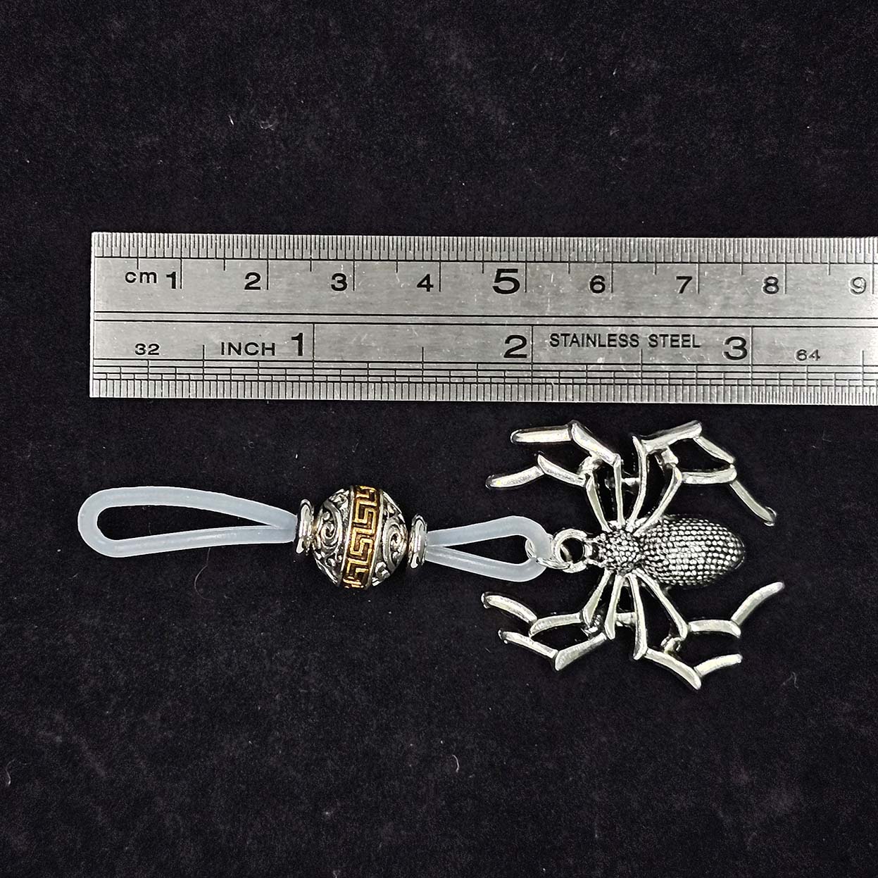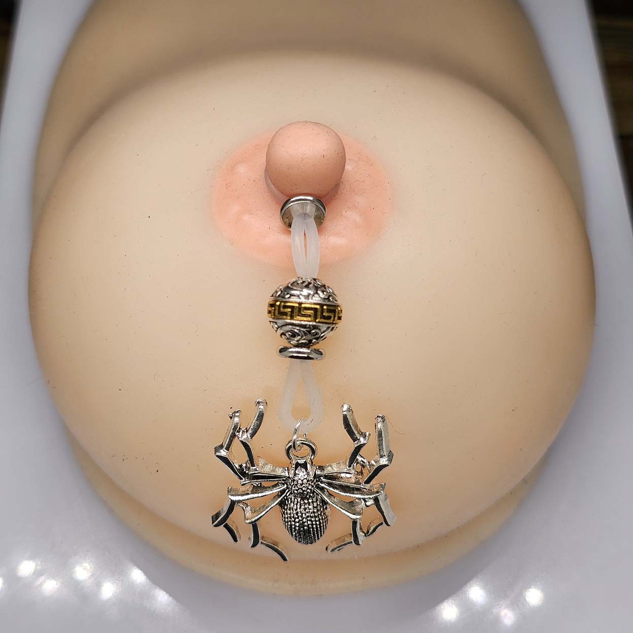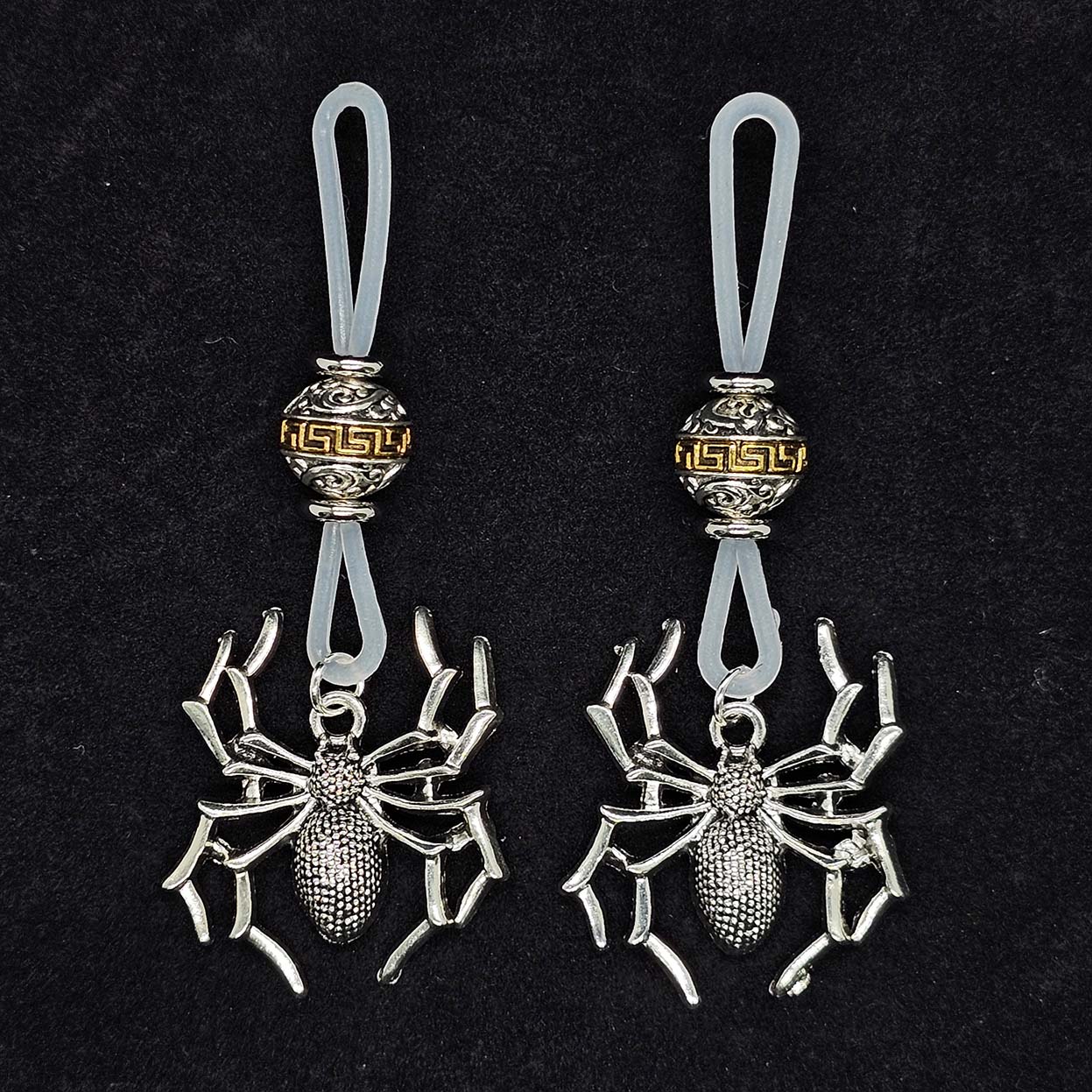 A striking design that blends silver and gold-accented totem beads with an intricate silver spider pendant, crafted into adjustable nipple clips. The contrast between cool metallic tones and warm golden details creates a bold yet sophisticated statement. The spider motif adds a touch of mysterious allure, while the polished finish enhances its elegant edge. This piece embodies both strength and refined beauty, making it perfect for those who love daring accessories with a luxurious touch.