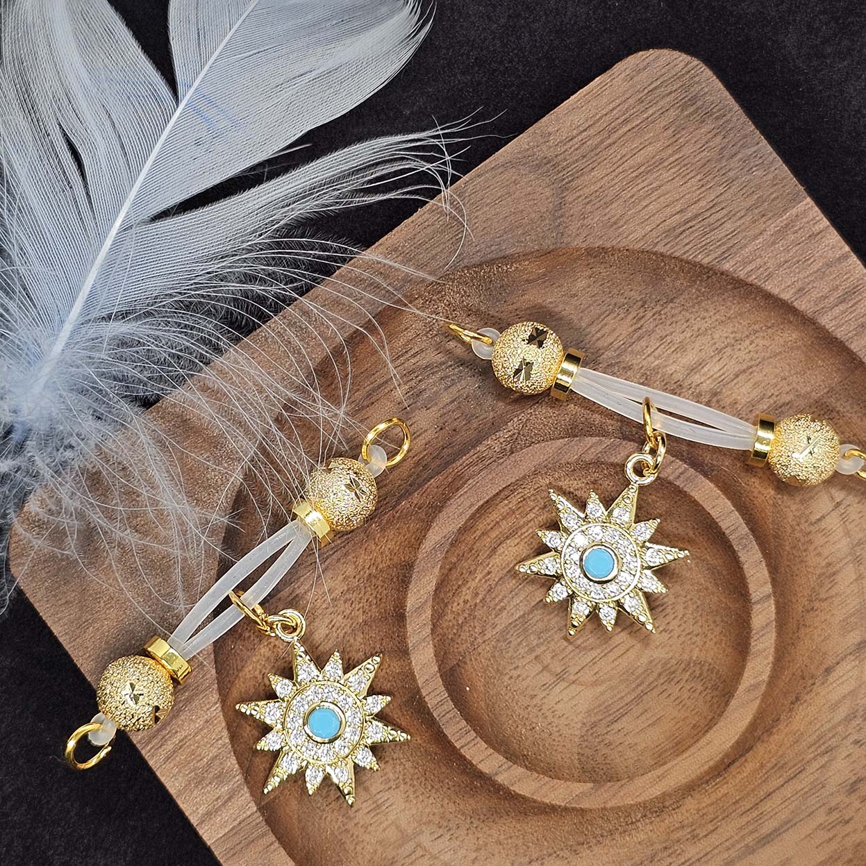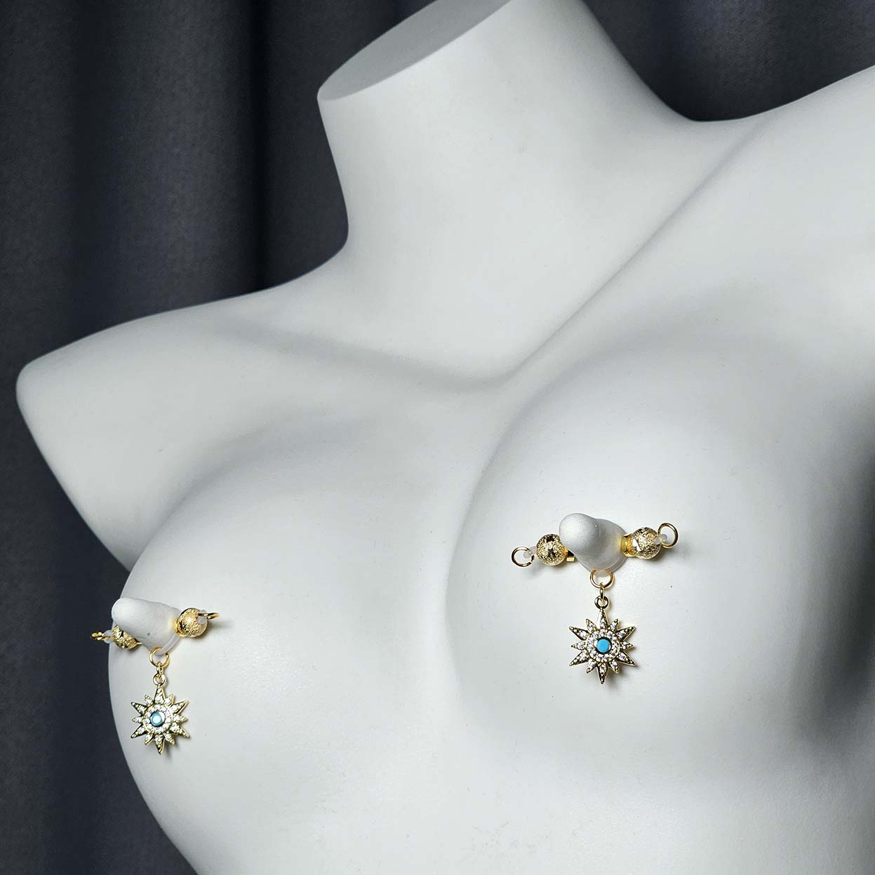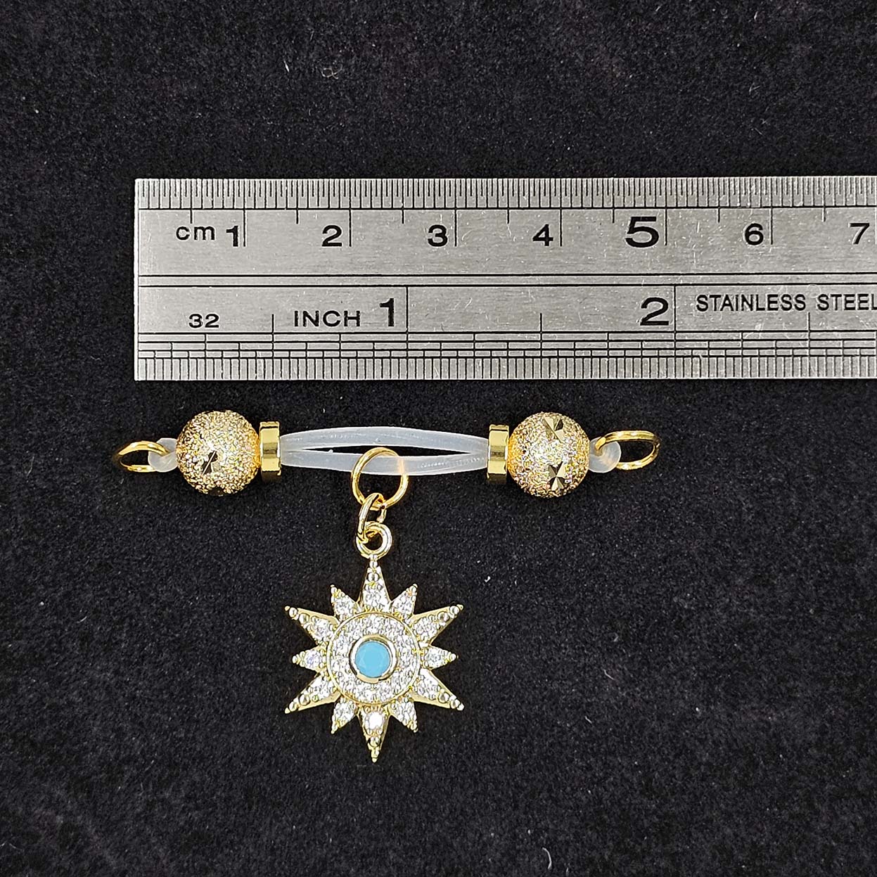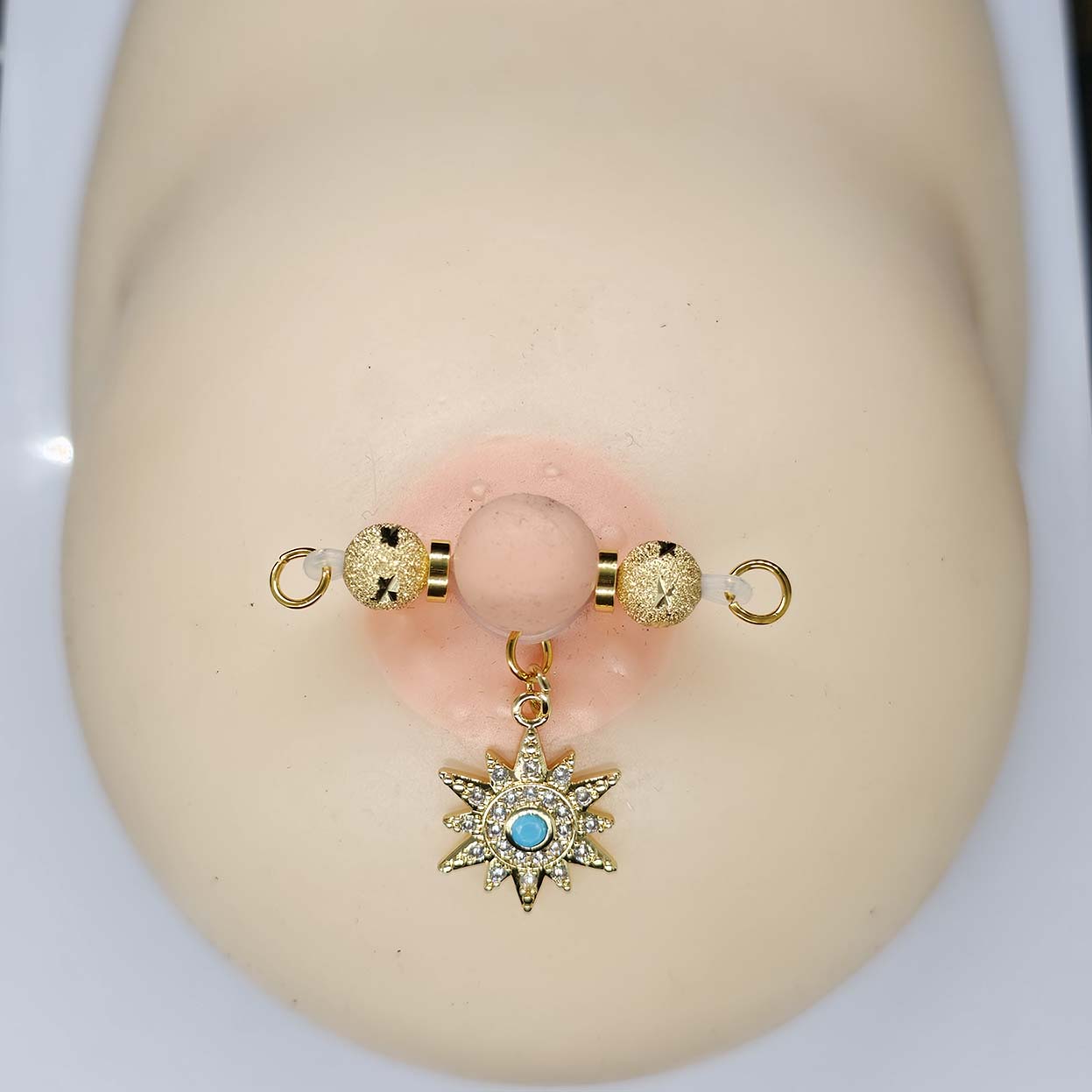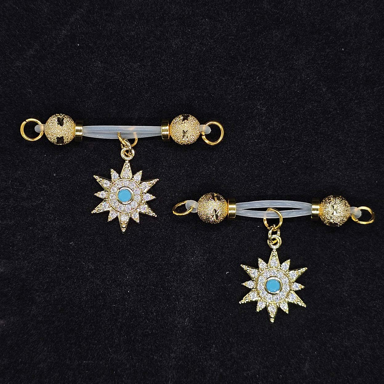 A luxurious barbell-style design featuring matte gold beads and a radiant sunflower pendant set with a vivid blue gemstone, crafted into adjustable nipple clips. The soft matte finish enhances the gold’s warmth, while the gemstone’s deep blue hue adds a refined touch of contrast. The sunflower motif exudes vitality and elegance, blending modern minimalism with timeless charm. This piece balances bold structure and delicate detailing, making it perfect for those who seek sophistication with a hint of playful allure.