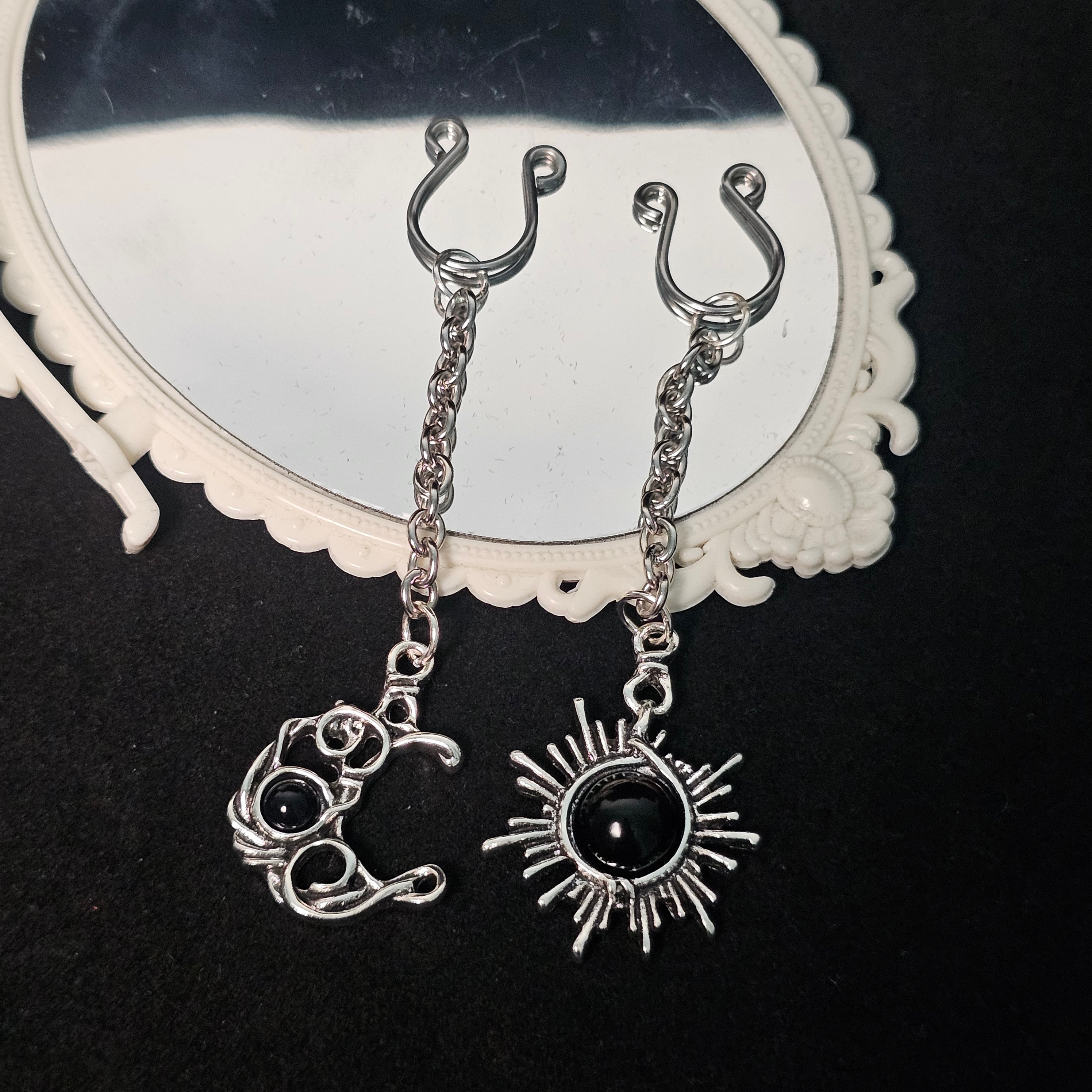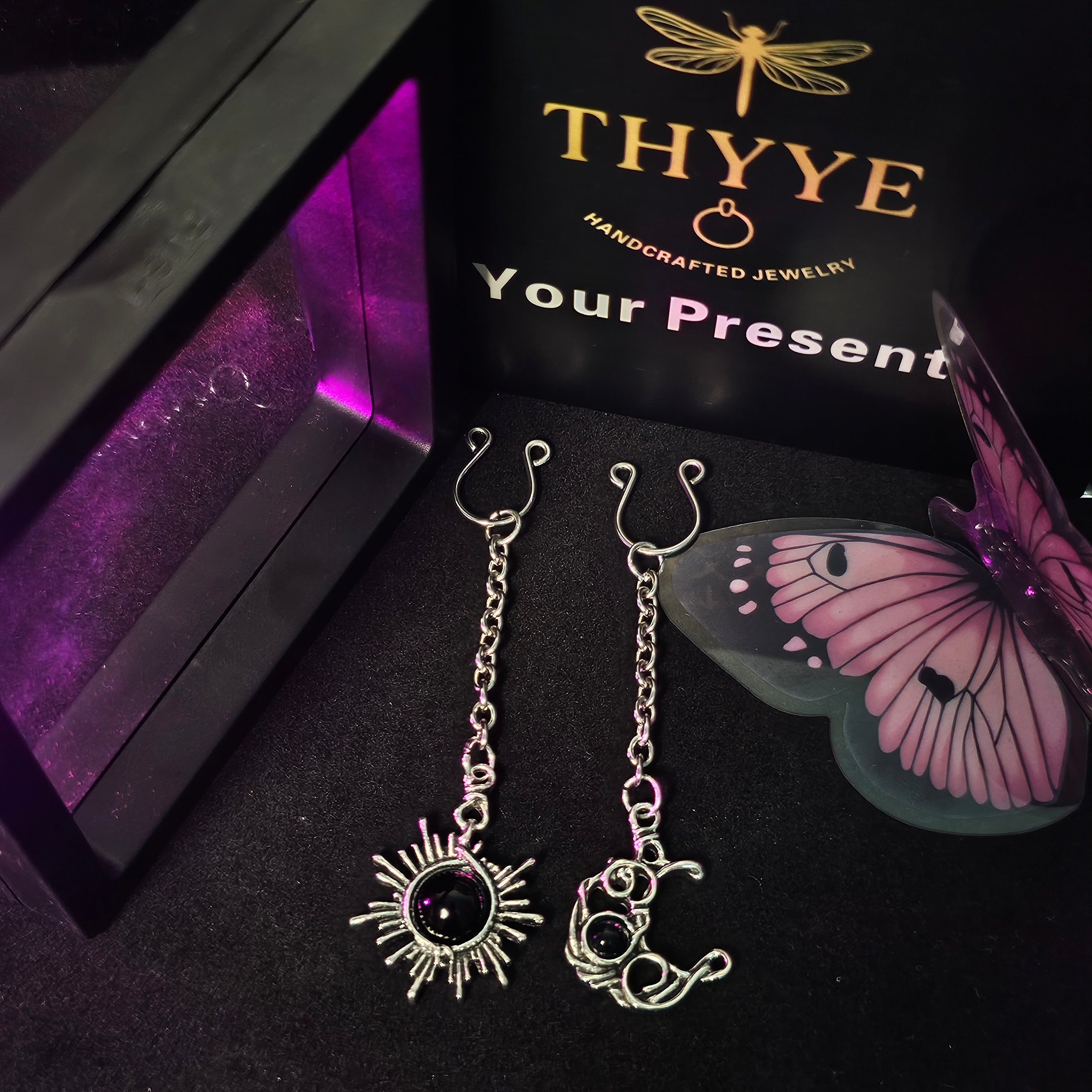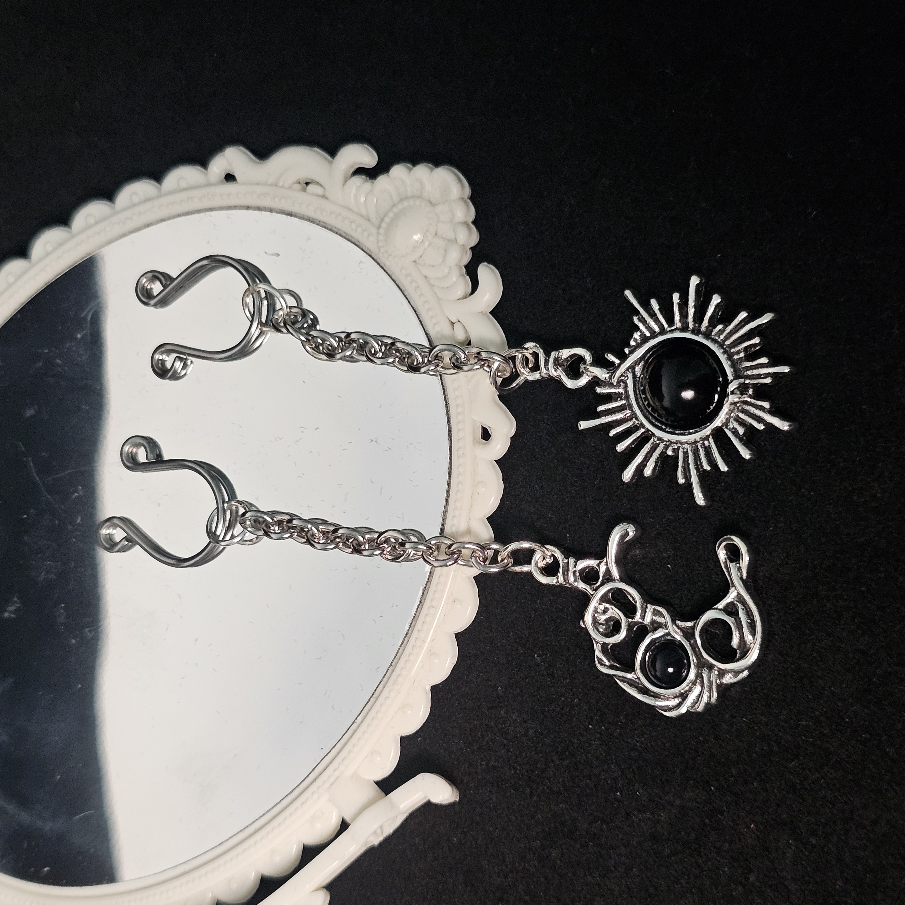 This nipple clamp, paired with exquisite moon and sun pendants and a delicate silver chain, exudes a sense of mystery and balance. The silver horseshoe ring exudes a strong sheen, creating a simple yet powerful expression. The moon and sun symbolize yin and yang, night and day, adding depth and a dynamic spirit to the overall look. The silver chain adds a touch of depth and elegance to the wearer. The clamp's adjustable design allows for precise adjustment of tension for comfort and stability. Whether used as a statement accessory, a festive embellishment, or a playful interaction between couples, it creates a unique atmosphere and charm. More than just an accessory, it is an artistic expression that symbolizes balance and individuality.