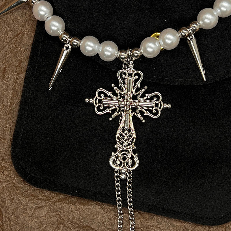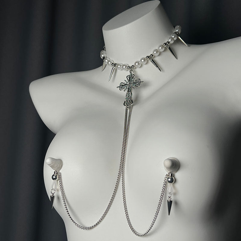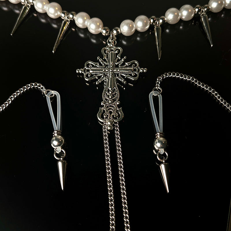 This adjustable, non-perforated nipple clamp boldly collides the softness of pearls with the dark feel of studs and crosses, blending gothic aesthetics with niche design to create a highly impactful style statement for you. ✨