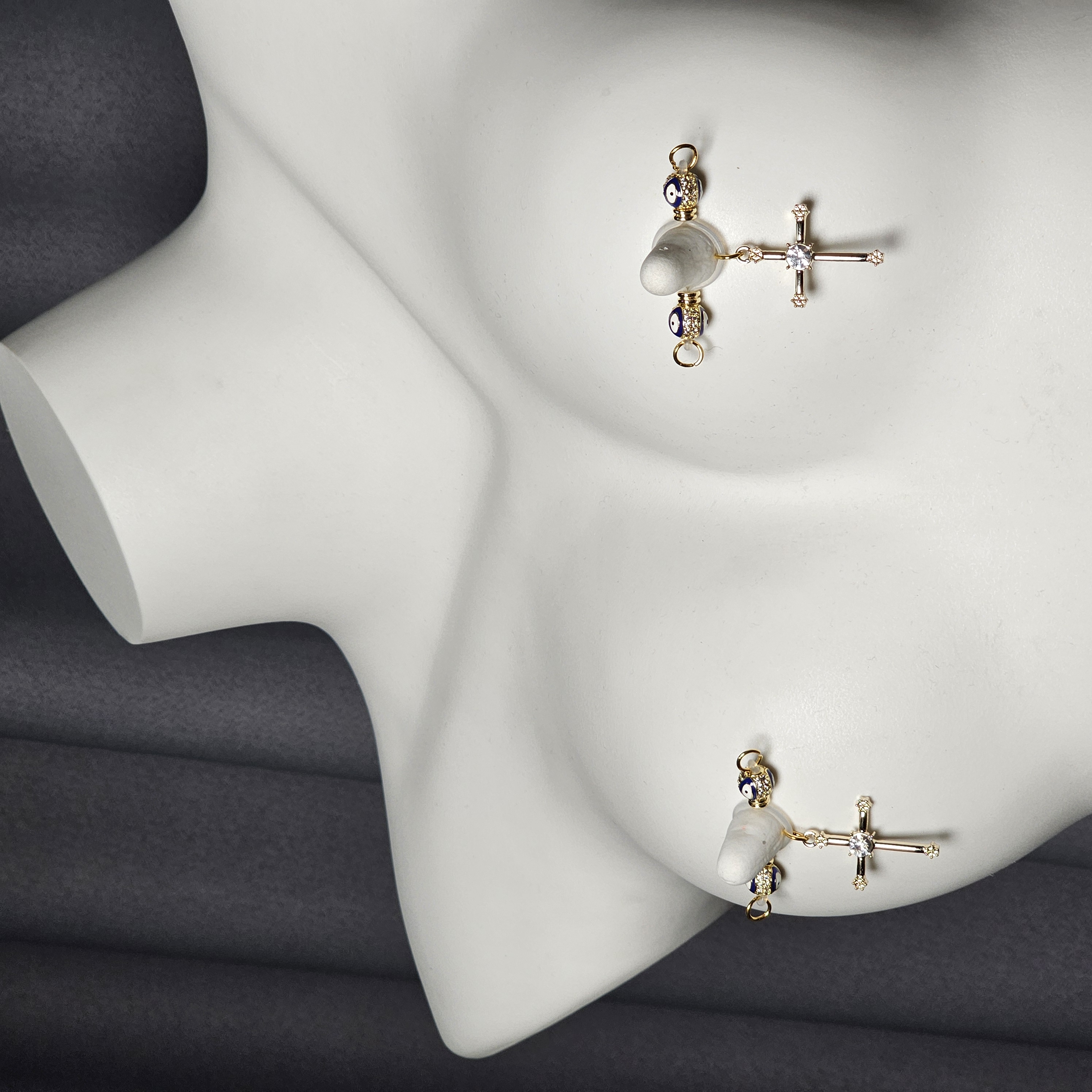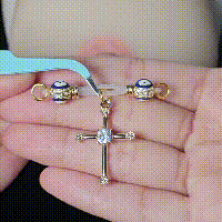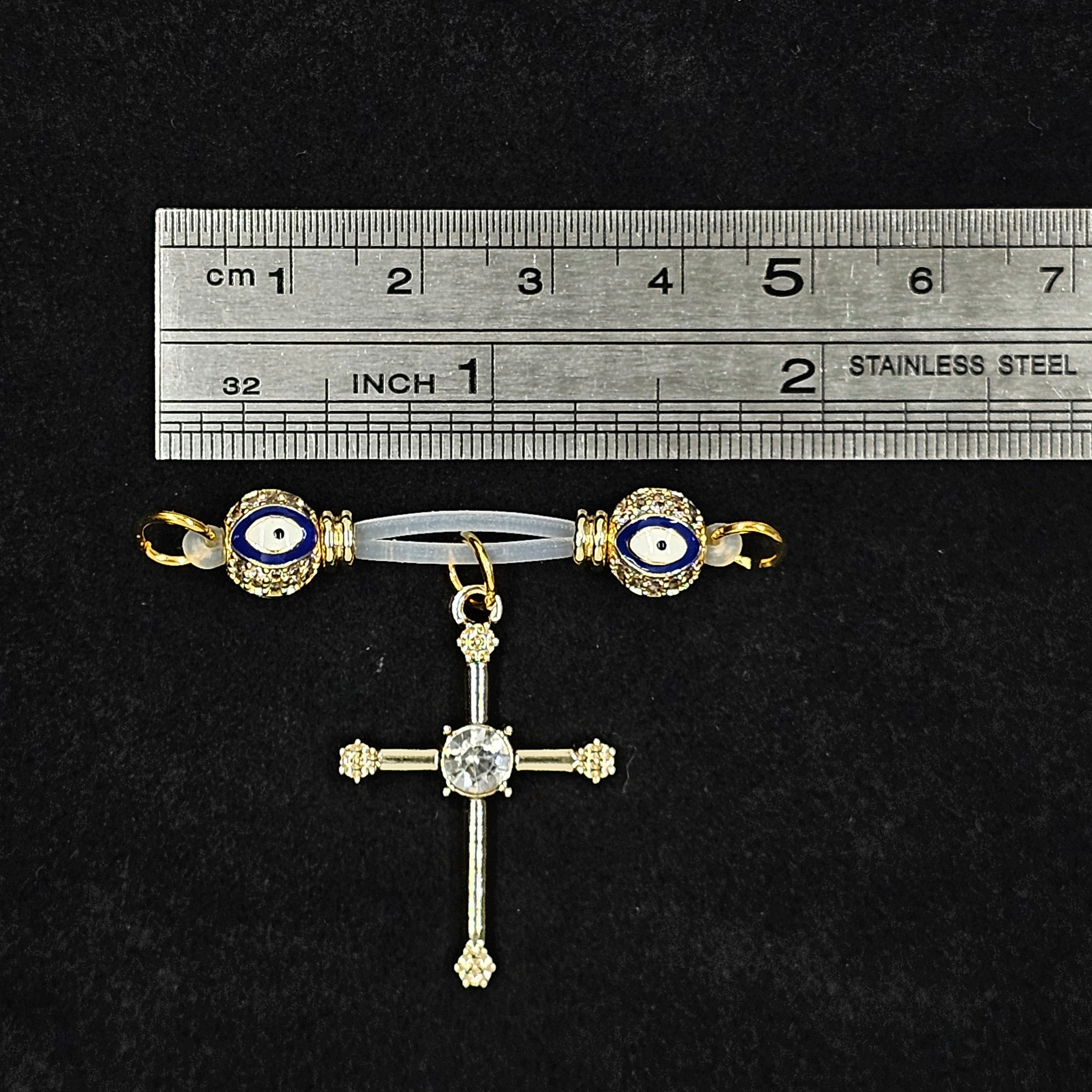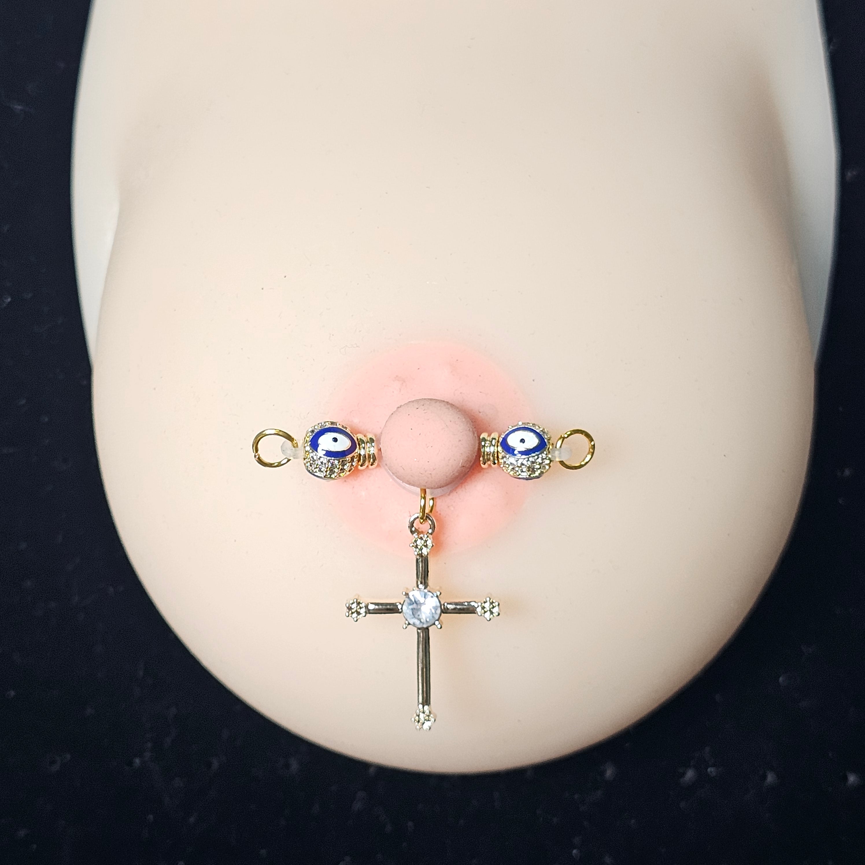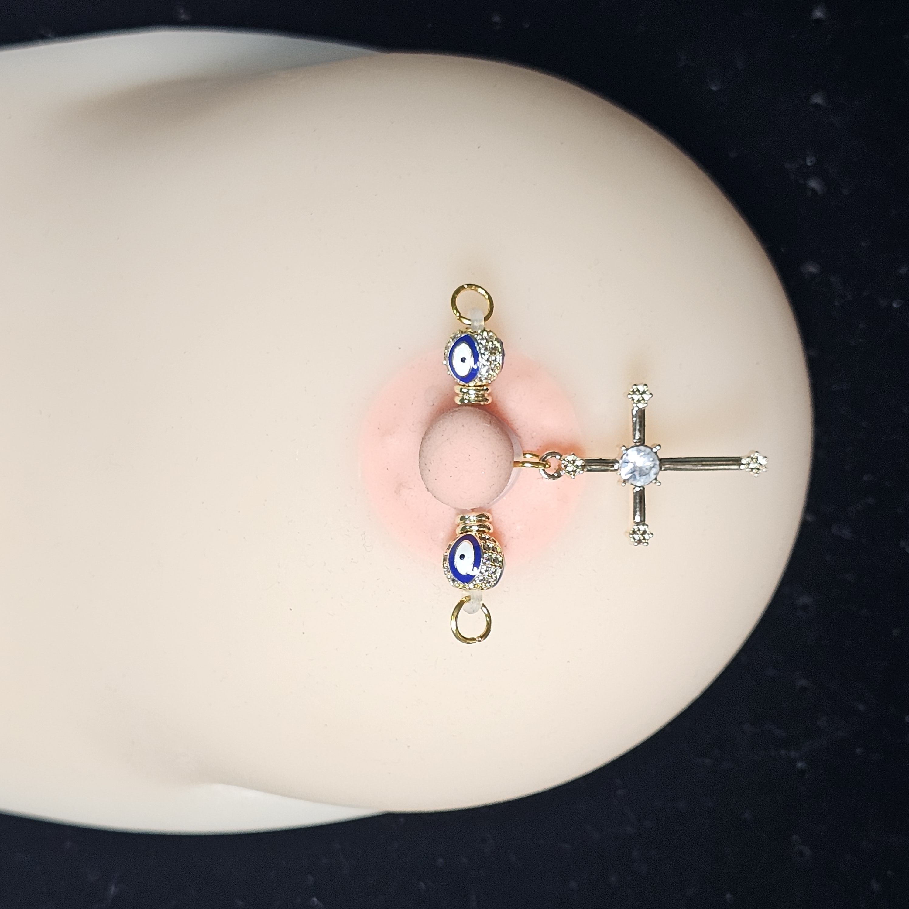 The gold barbell design combines an irregular eye motif with bamboo textures, accented by a diamond-encrusted 3D cross pendant. Its refined details shine with understated brilliance, while the adjustable fit ensures comfort and versatility. Each curve embodies a balance of strength and grace, radiating confidence, mystery, and sophisticated sensuality.