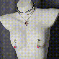 Each piece is handmade and made to order! A limited supply ensures uniqueness and rarity. With your purchase, you'll receive the latest necklace and nipple clamp set. A striking design featuring adjustable nipple clips adorned with red gemstone floral motifs, paired with a silver chain necklace embellished with a red moon pendant and stud details. The vivid crimson tones and metallic accents create a sensual, bold, and sophisticated statement.