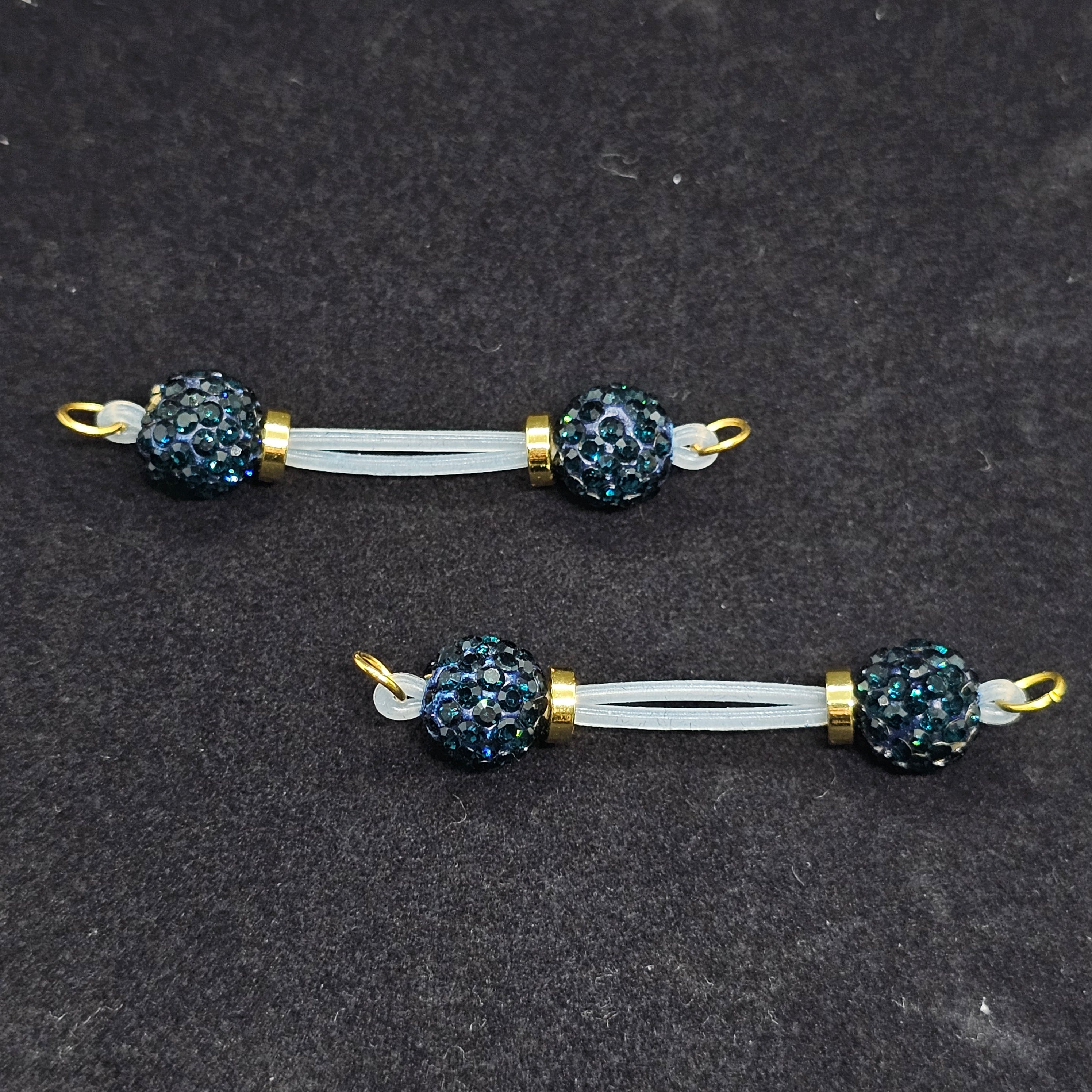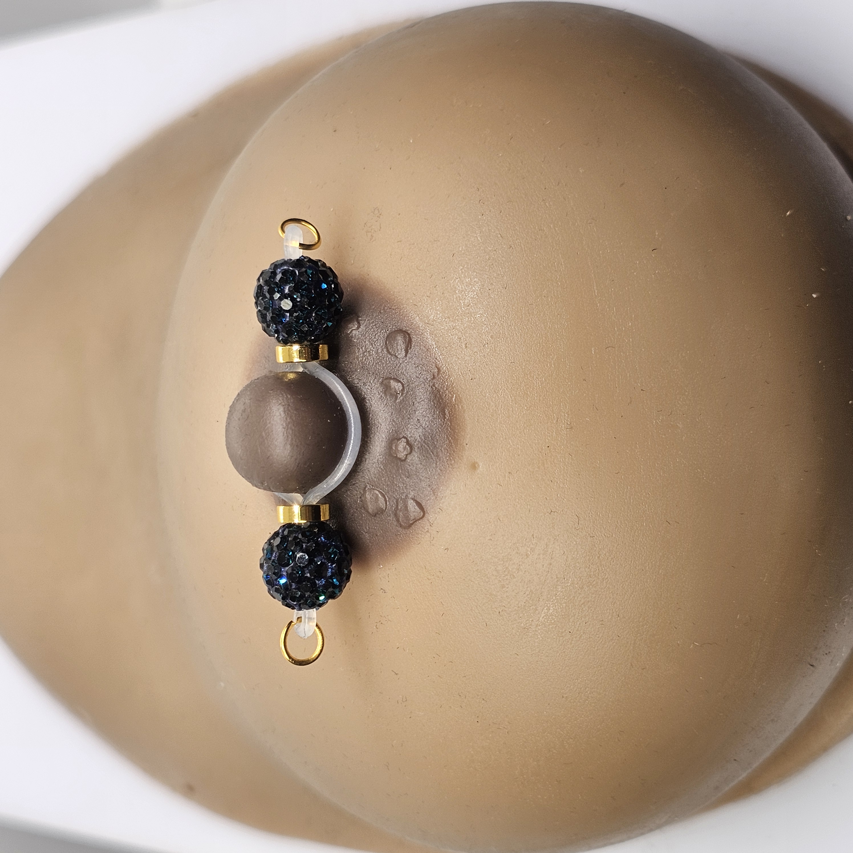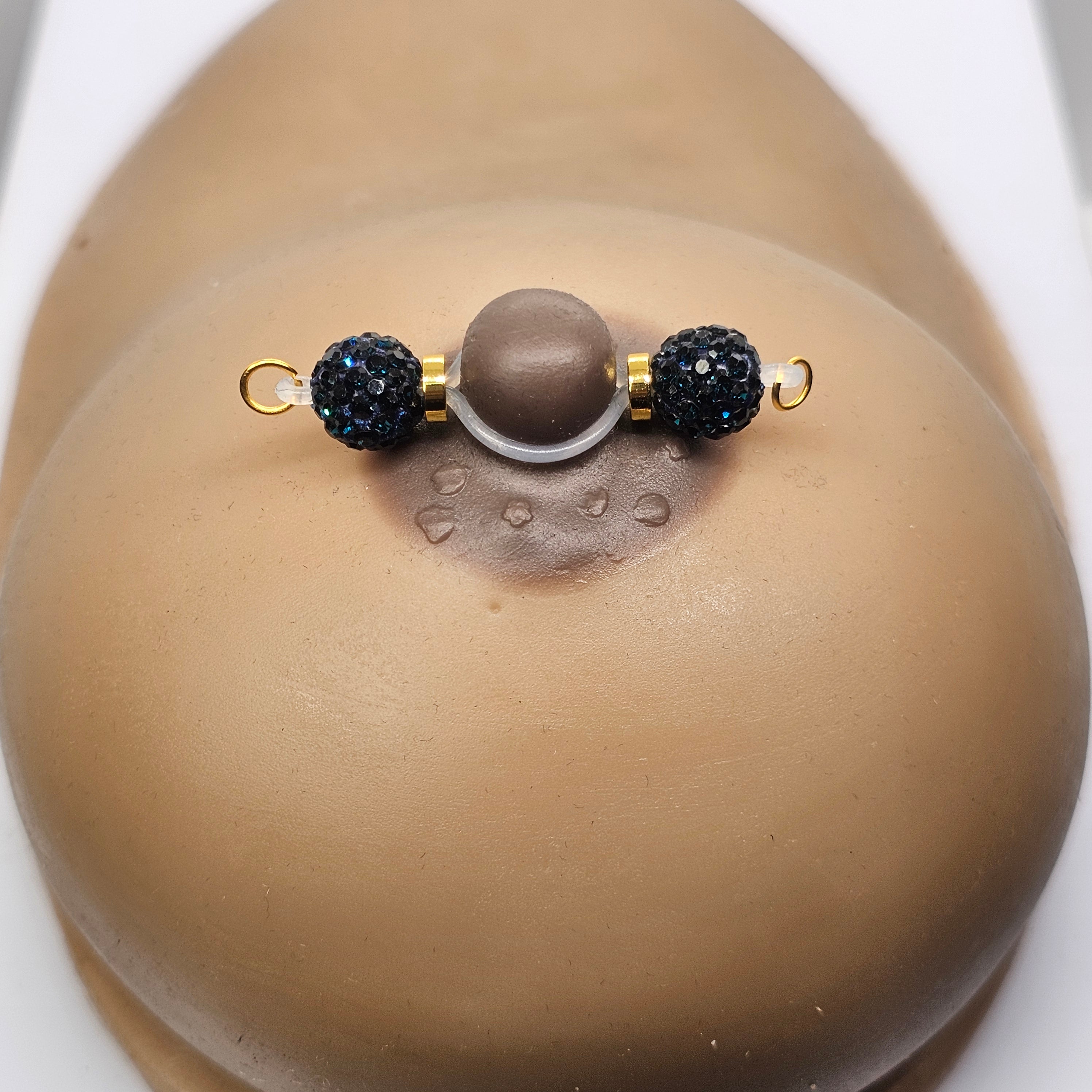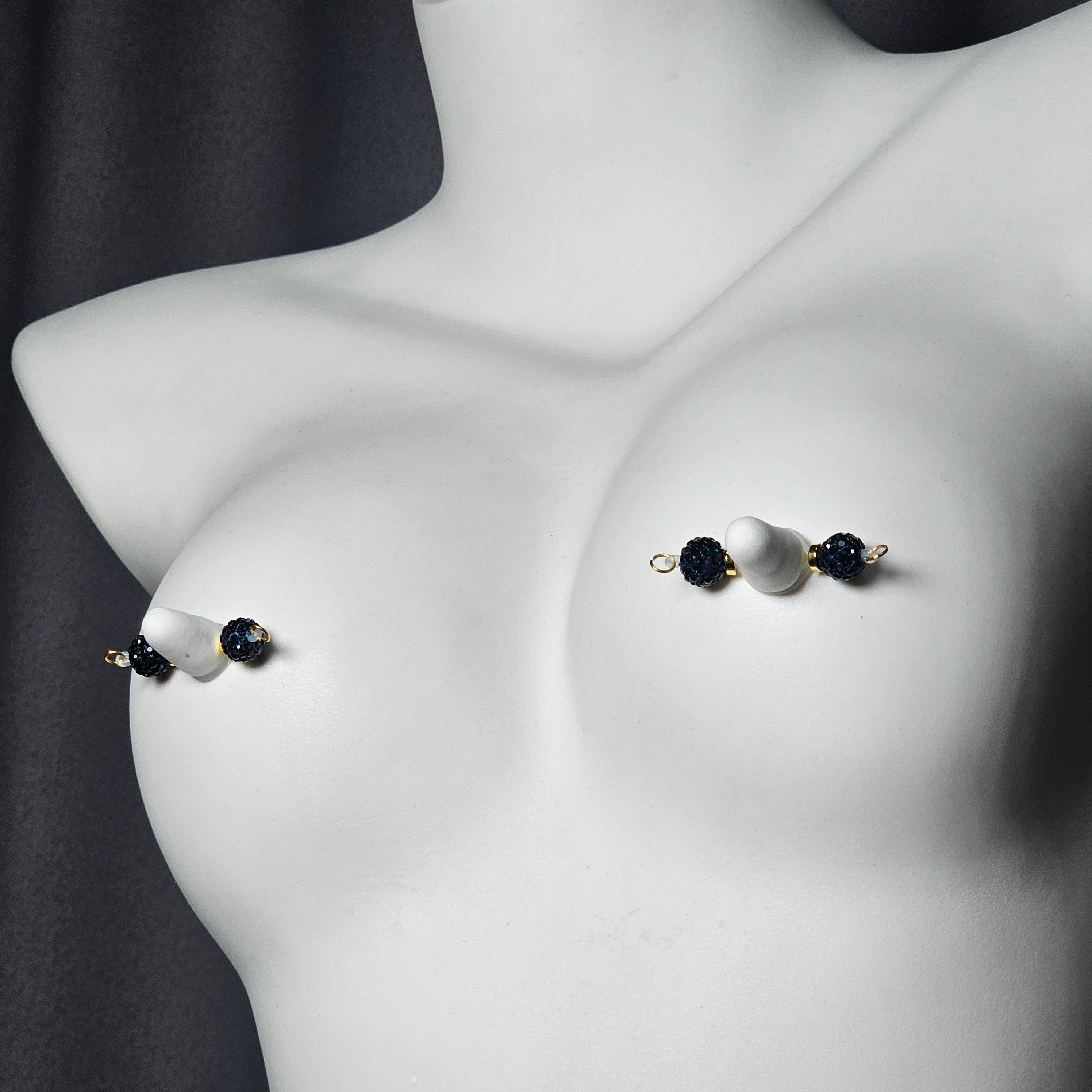 This adjustable barbell-style nipple clip features a striking combination of deep black-blue gemstone beads paired with a sleek golden ring. The rich, mysterious tones contrast beautifully with the warm gold, creating a sophisticated and seductive aesthetic. Crafted with precision, the polished metal surface ensures a smooth and comfortable fit. The adjustable tension design allows for personalized comfort, suitable for both beginners and experienced users. Whether worn alone as a bold statement or paired with lingerie for a touch of sensual elegance, this piece embodies power, confidence, and modern allure. A perfect accessory for those who appreciate refined, daring designs.