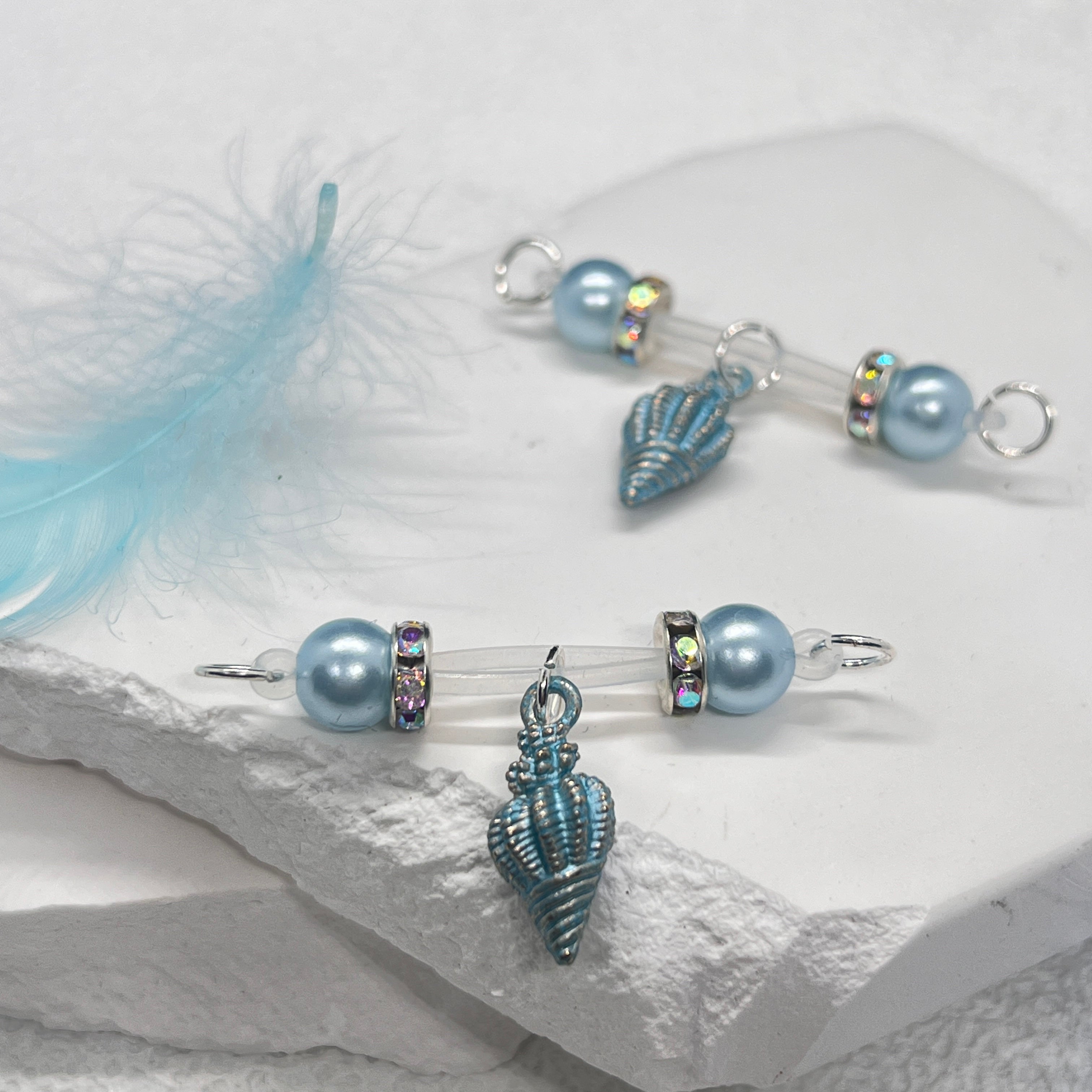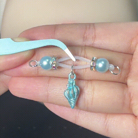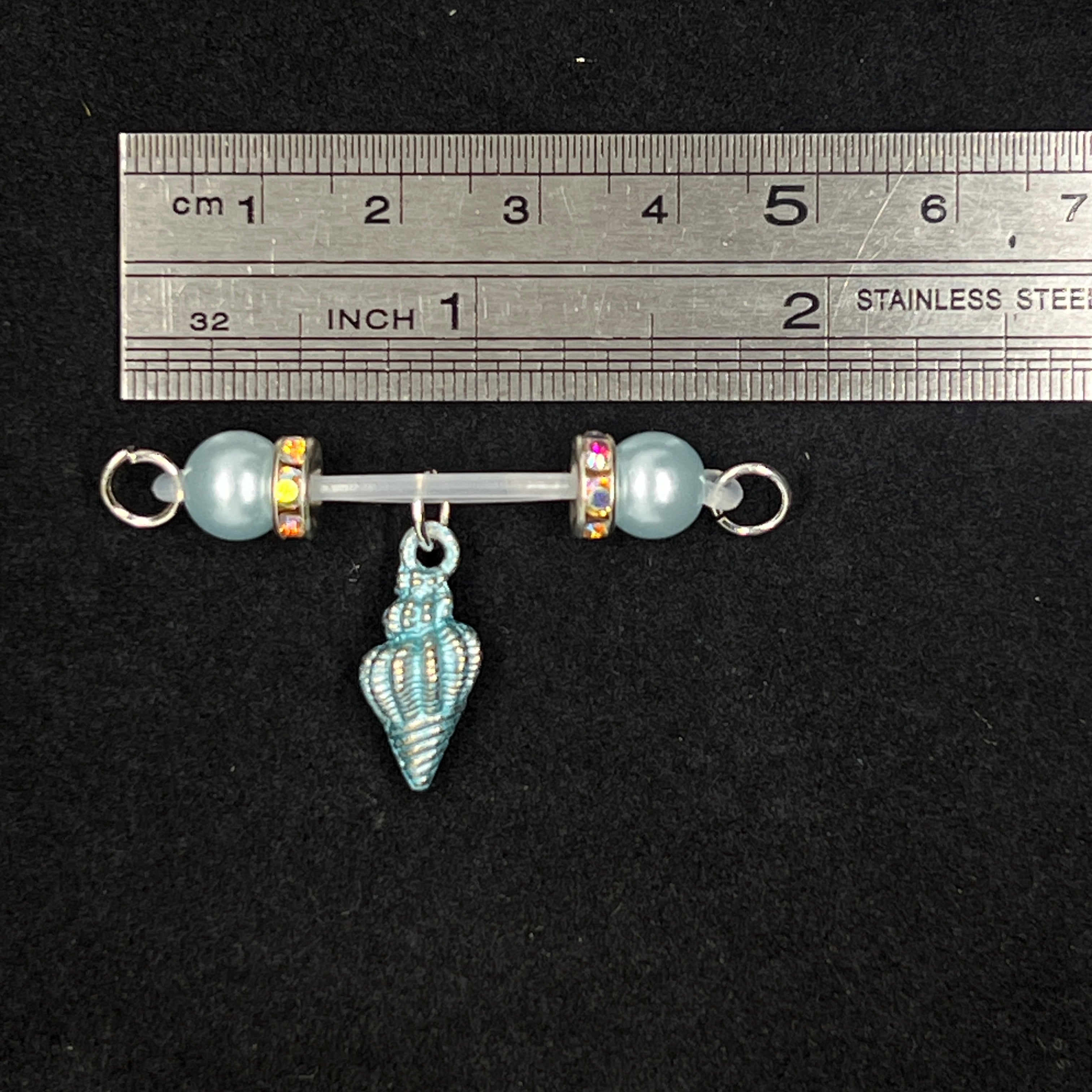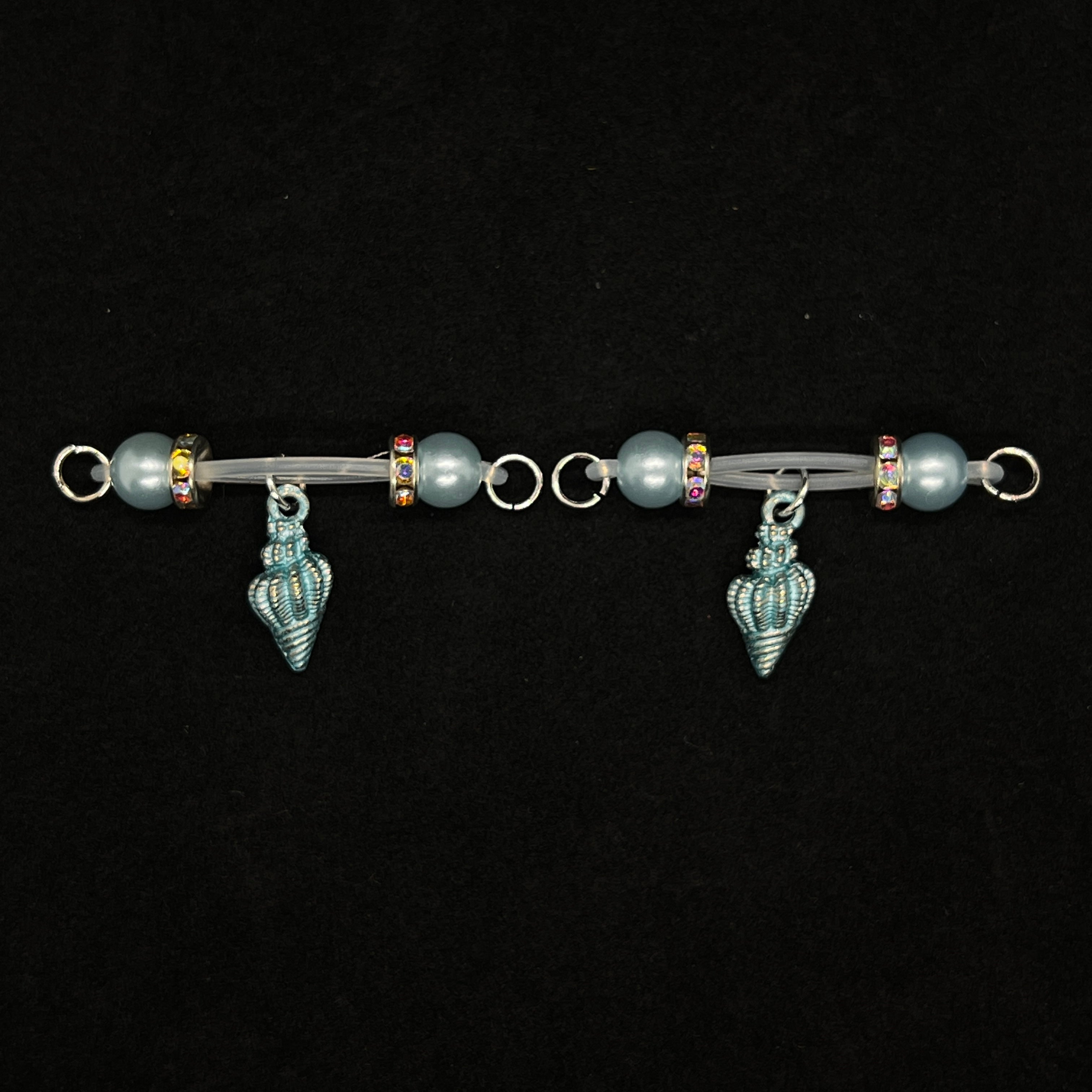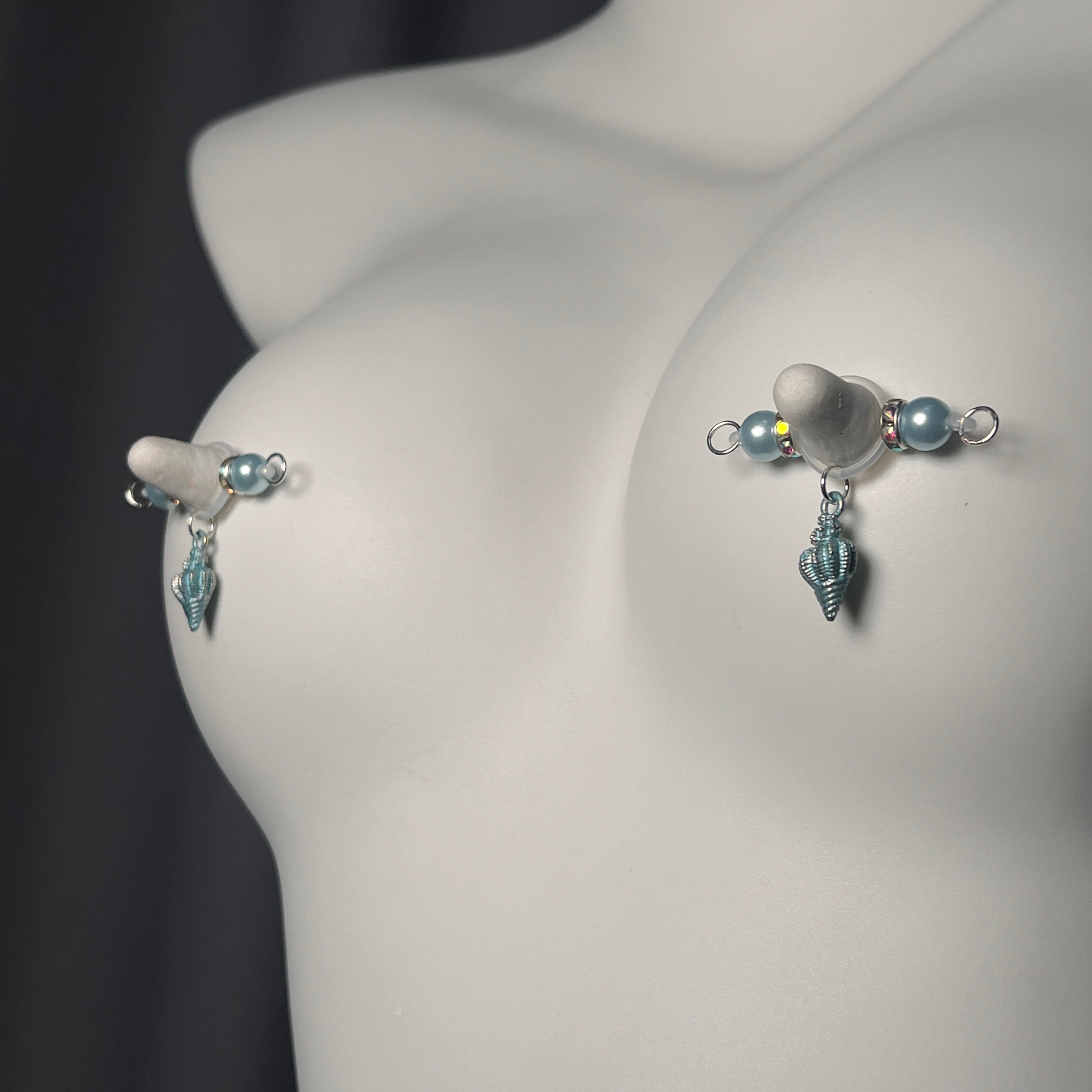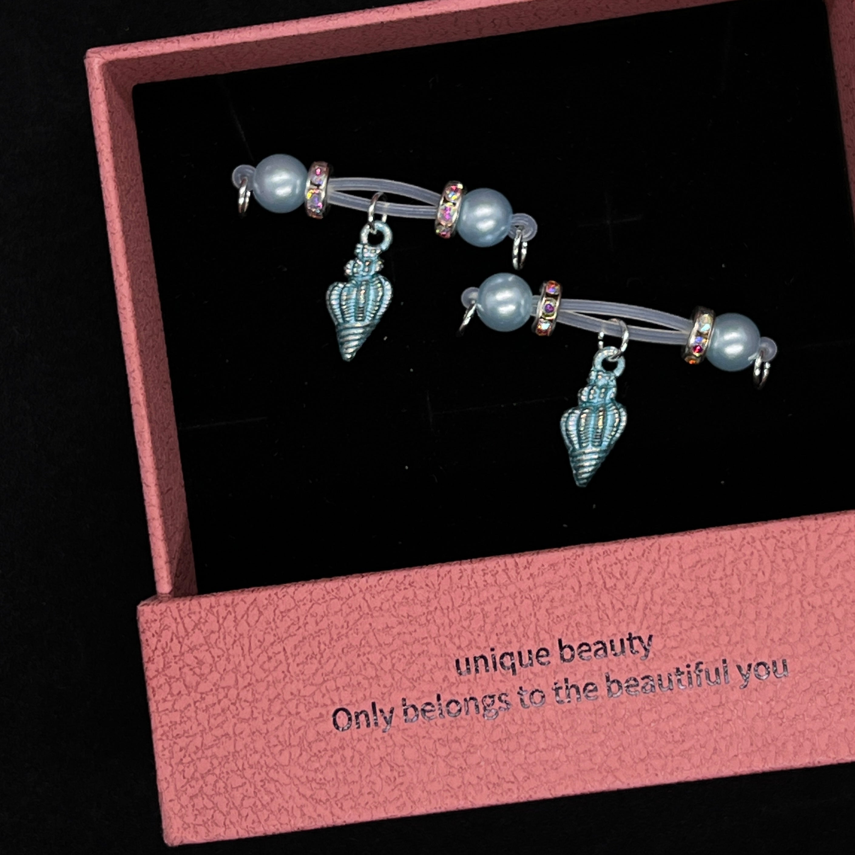 This barbell-style adjustable nipple clip features a serene blue bead paired with a blue shell nut-shaped pendant. The design embodies a perfect balance of strength and elegance, combining industrial charm with refined sensuality. Its smooth metallic finish and subtle oceanic hues create a captivating accessory that feels bold yet sophisticated.