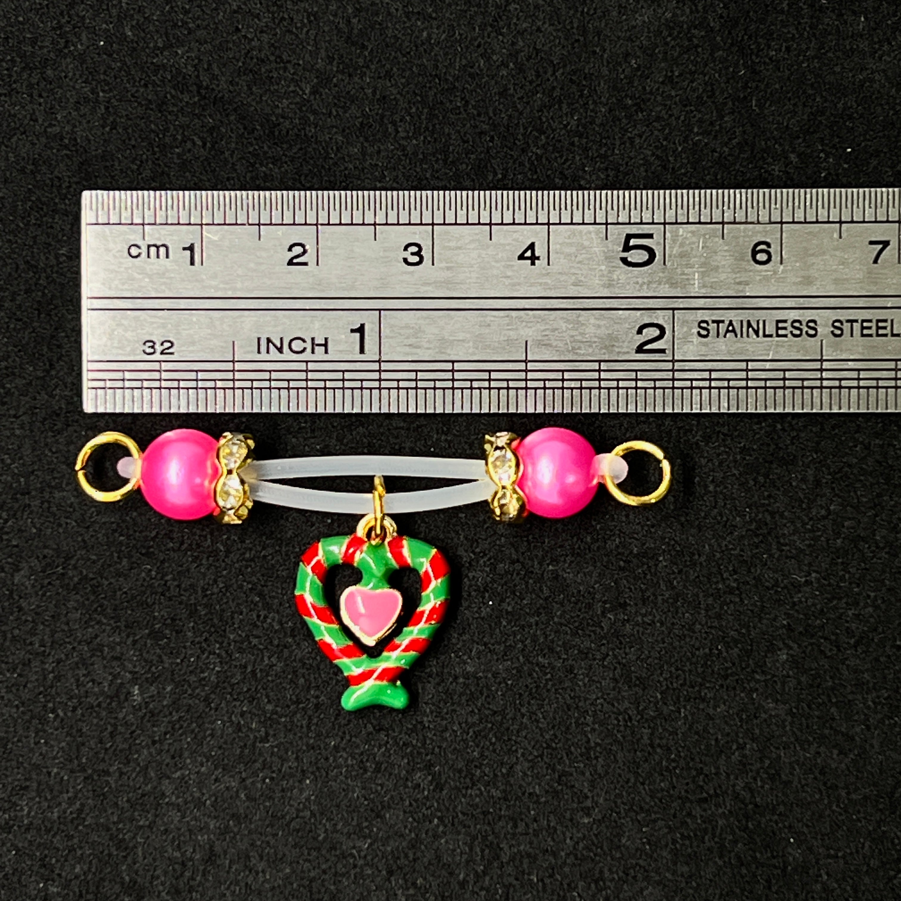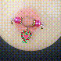 This barbell-style adjustable nipple clip features a rose-red bead, a red-green heart-shaped lucky knot pendant, and a delicate pink heart charm. Blending playful charm with refined elegance, it creates a subtle yet striking accessory that adds a touch of personality to any ensemble.