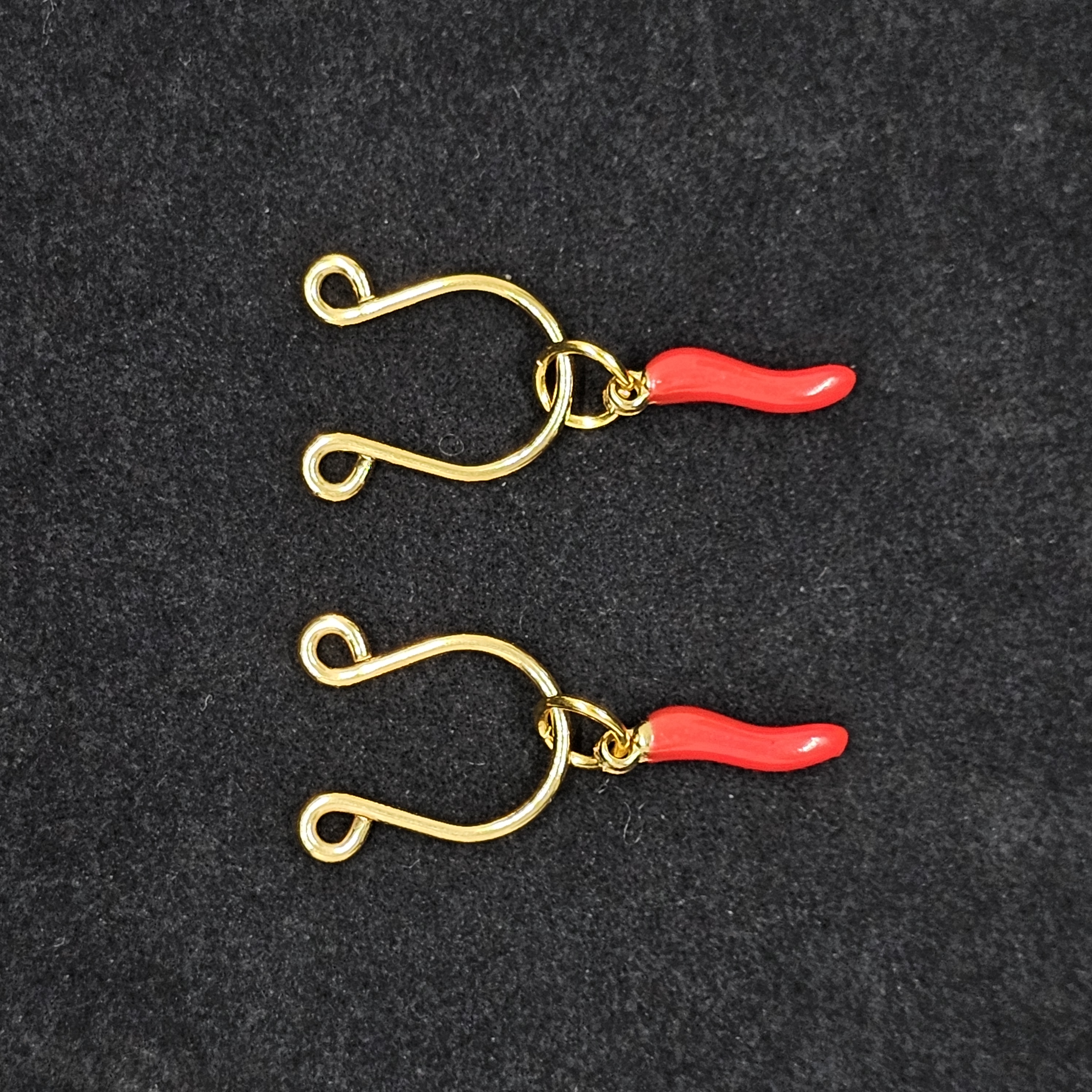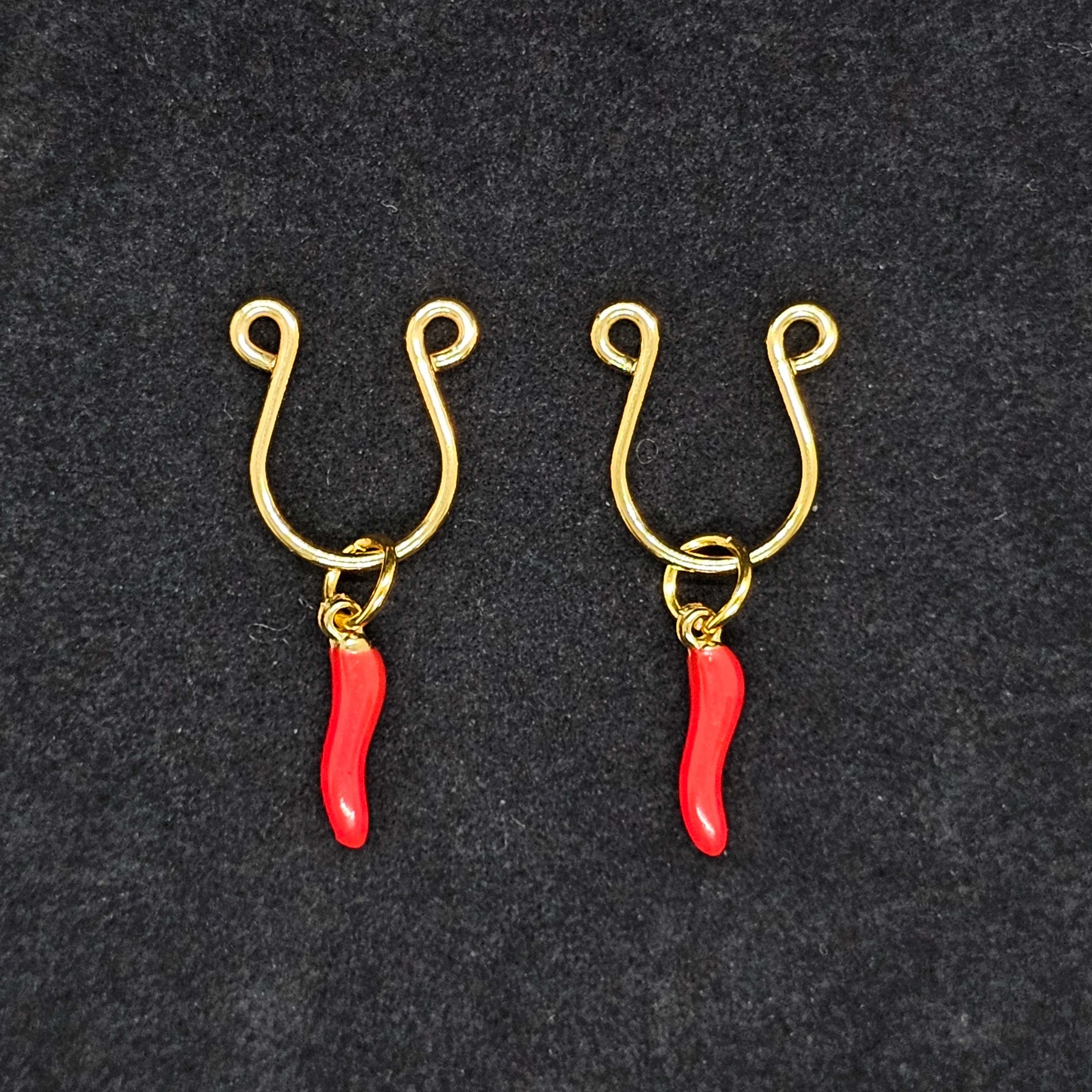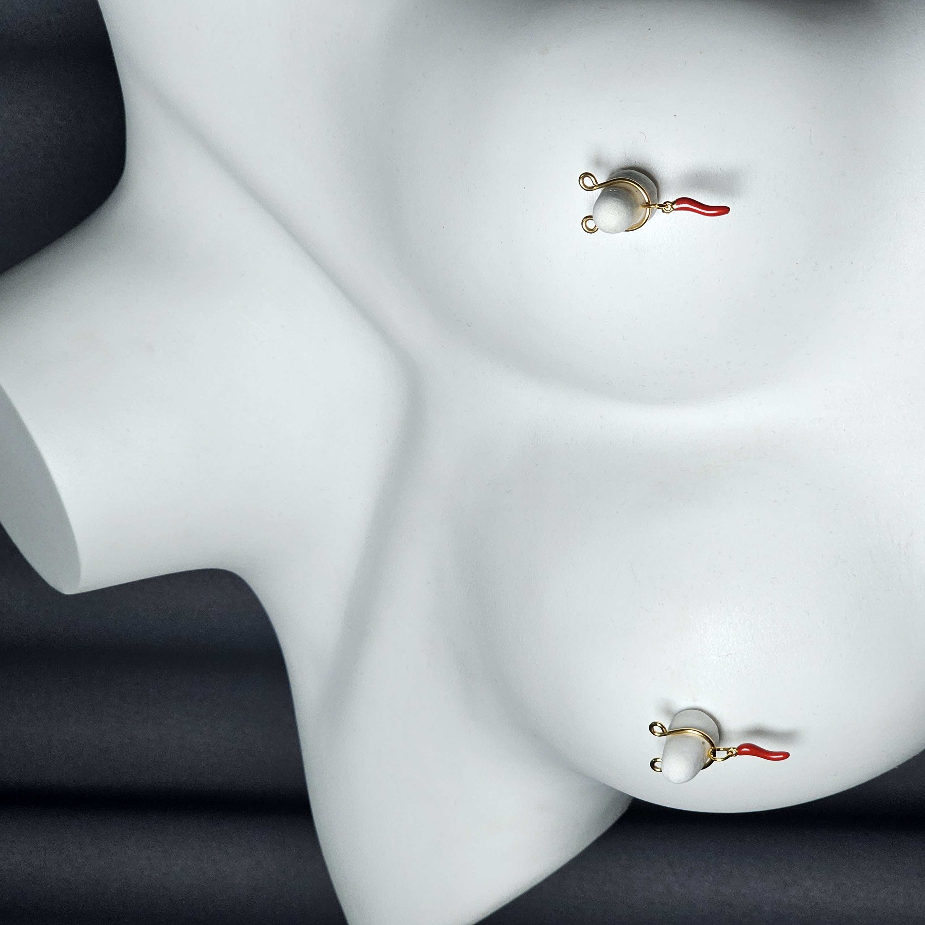 The golden horseshoe rings trace graceful strength through sleek curves, paired with fiery red chili pendants that embody passion and bold individuality. The adjustable design contours elegantly to the body, offering both lightness and comfort. A dialogue between gold’s luster and red’s vibrancy, it merges sensual allure with refined sophistication.