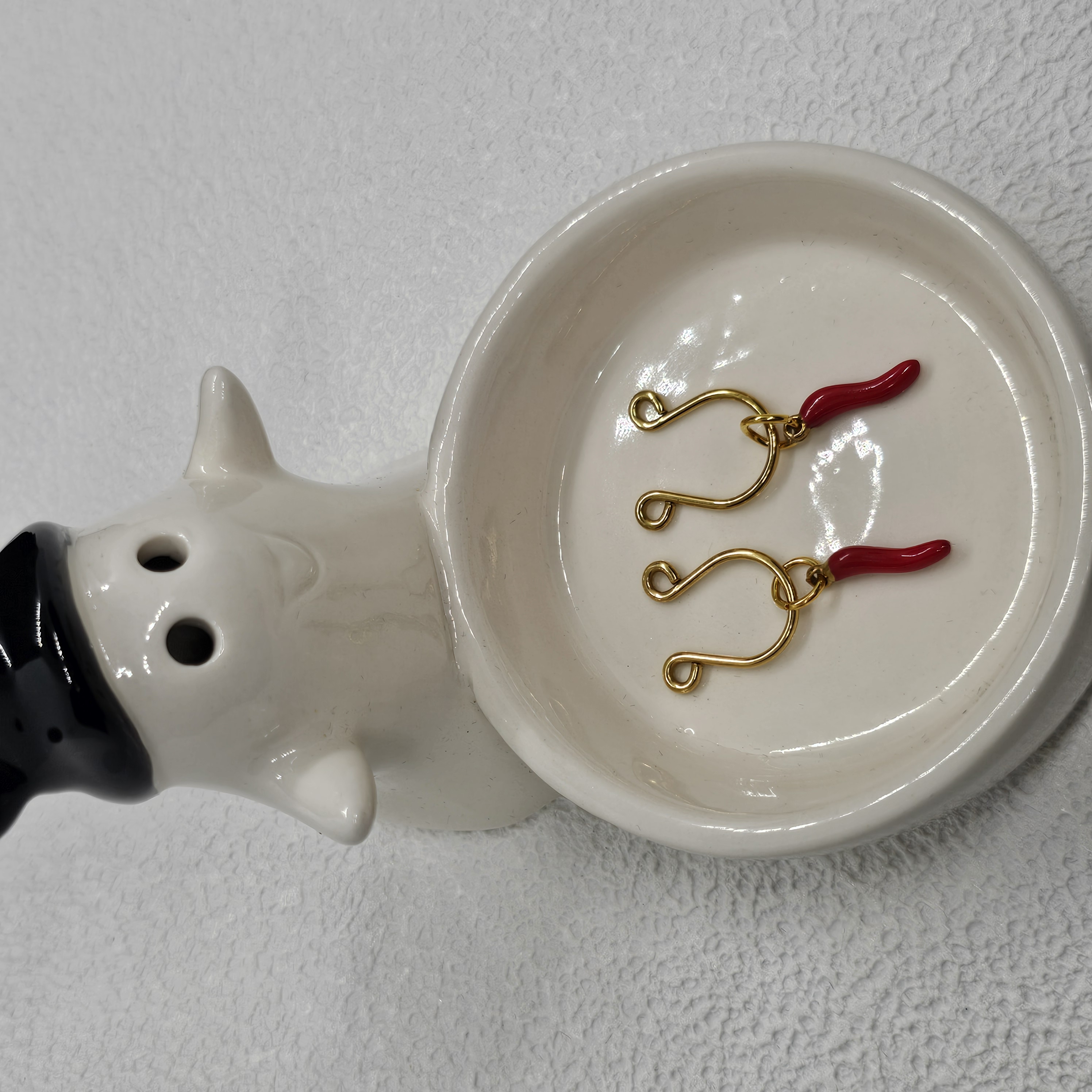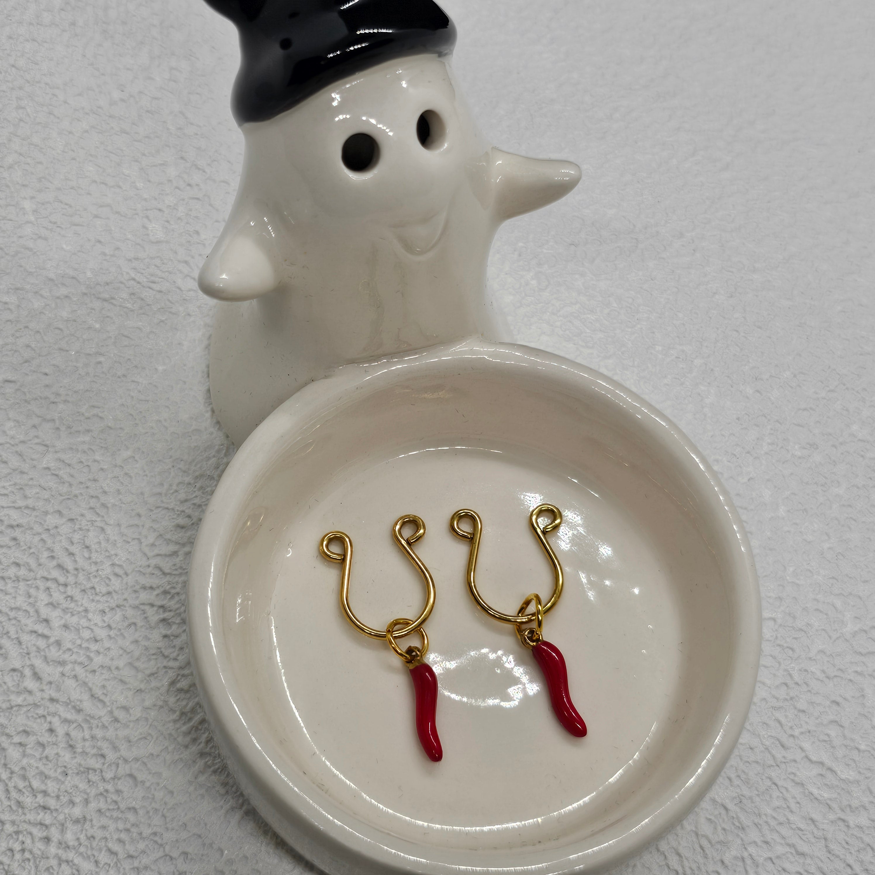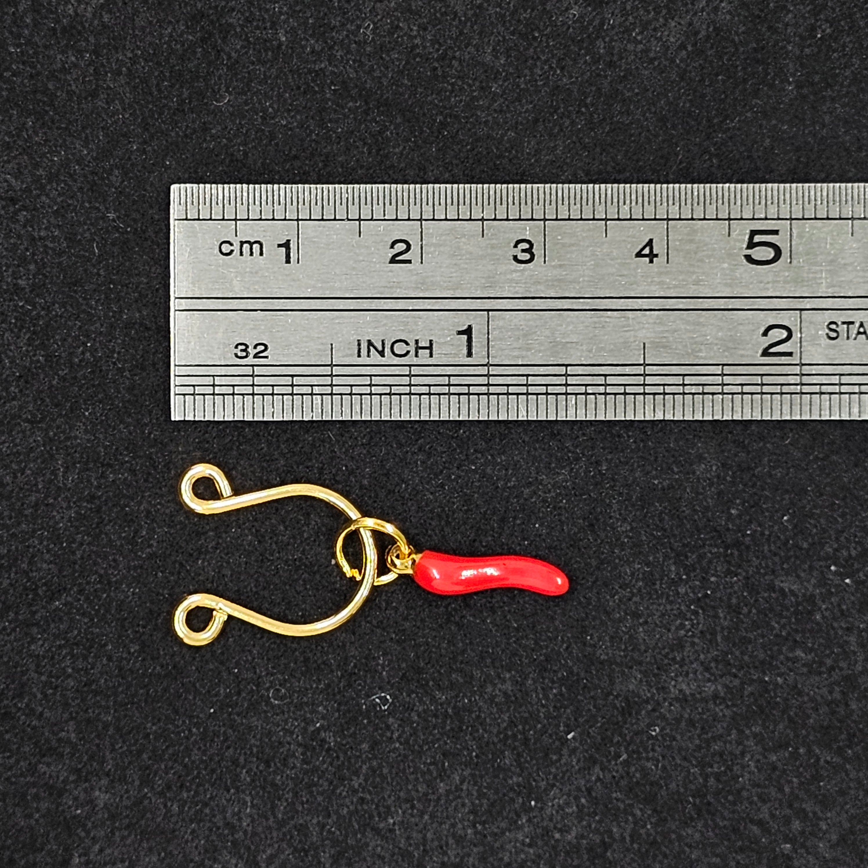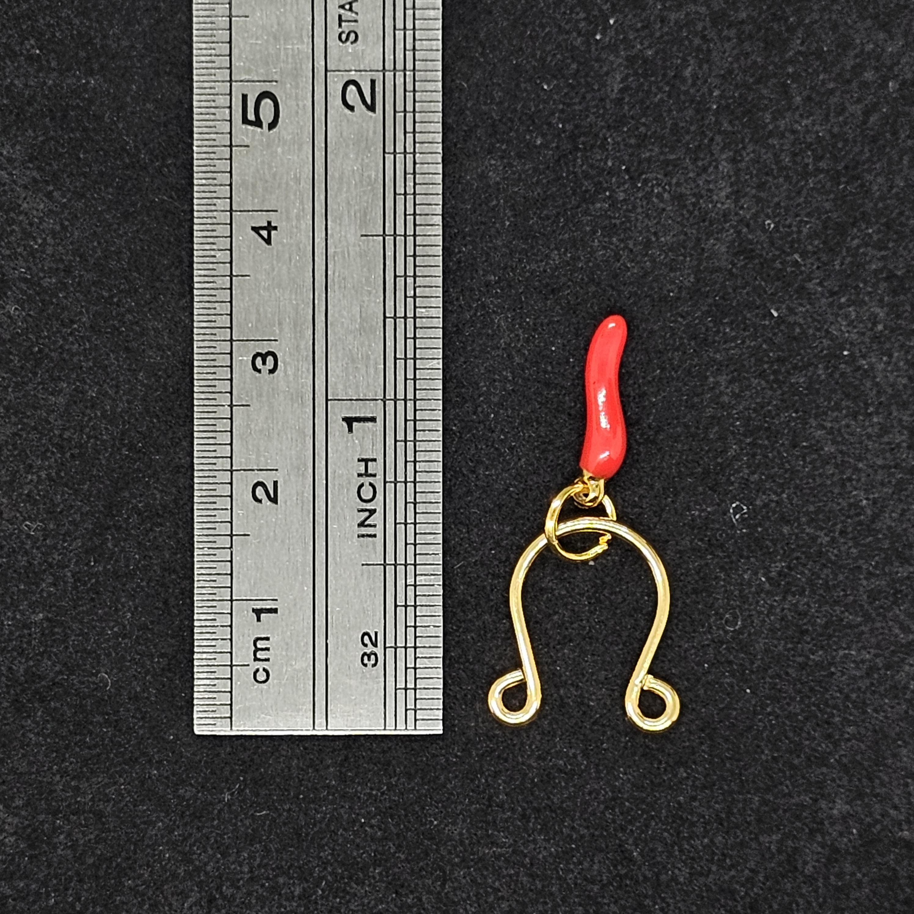 The golden horseshoe rings trace graceful strength through sleek curves, paired with fiery red chili pendants that embody passion and bold individuality. The adjustable design contours elegantly to the body, offering both lightness and comfort. A dialogue between gold’s luster and red’s vibrancy, it merges sensual allure with refined sophistication.