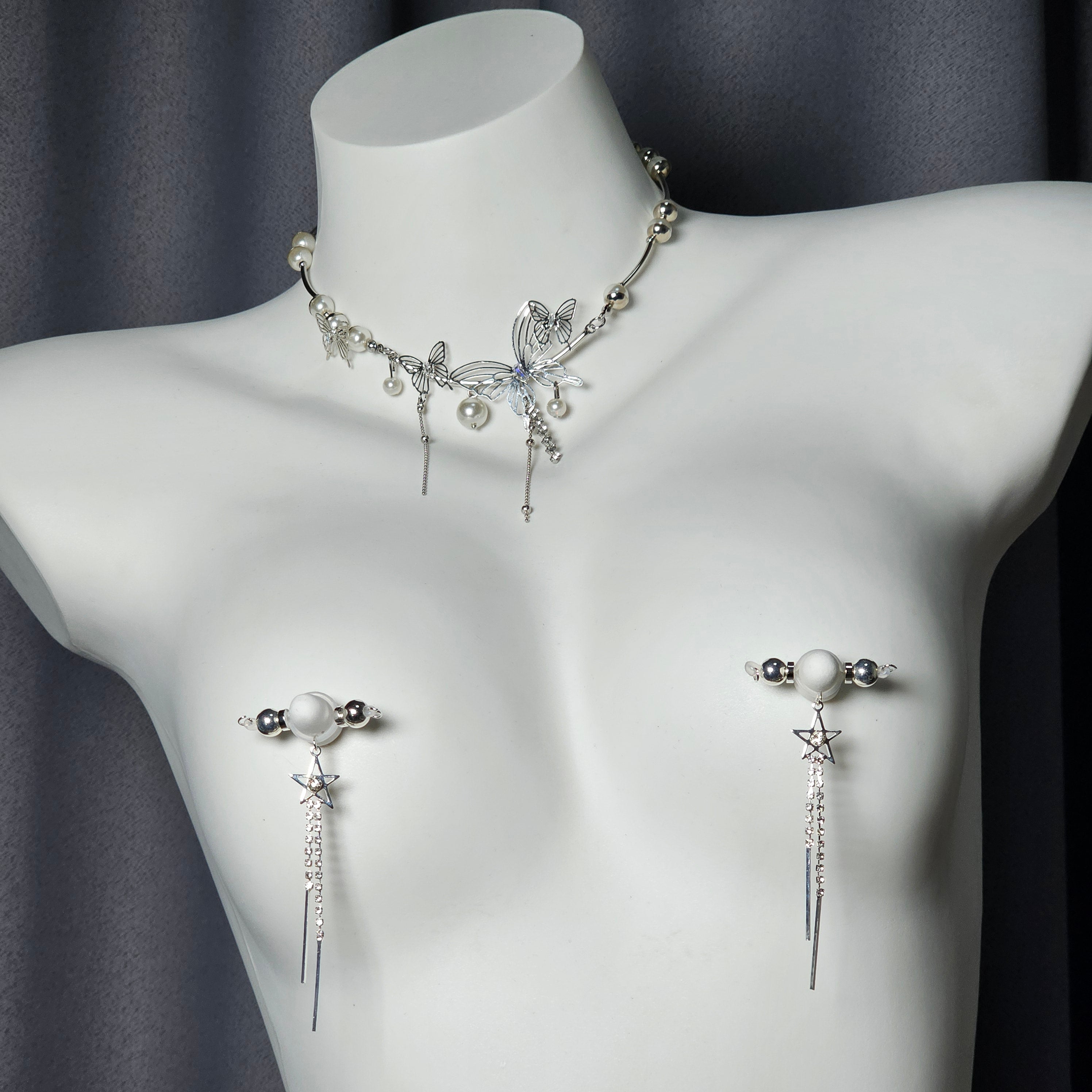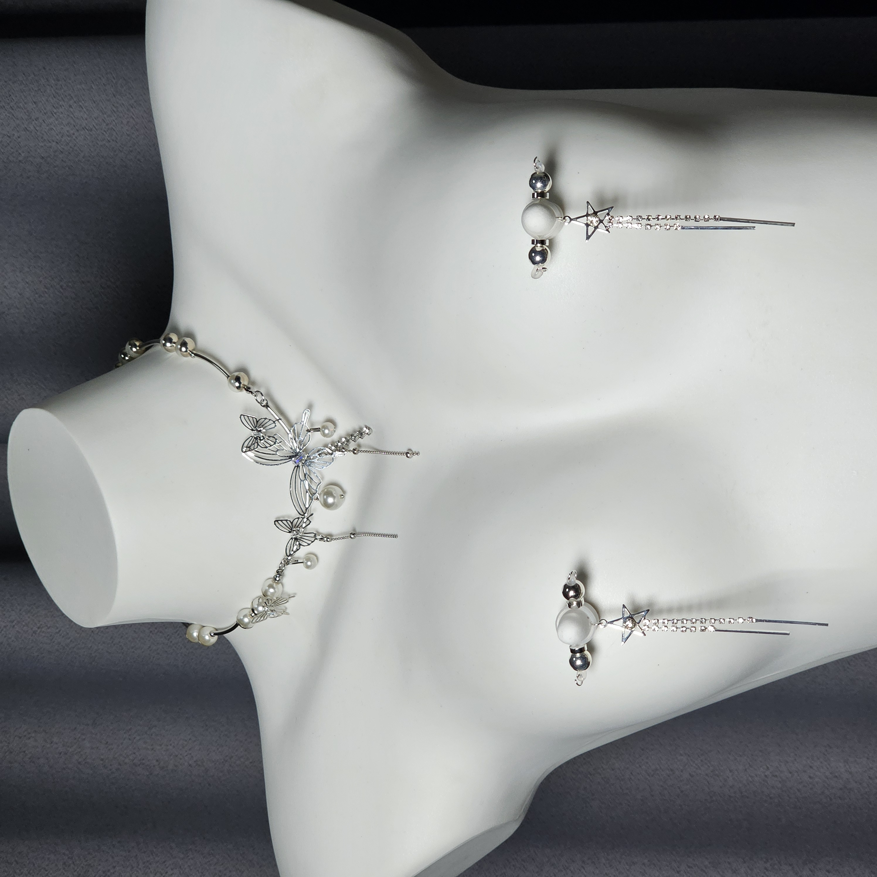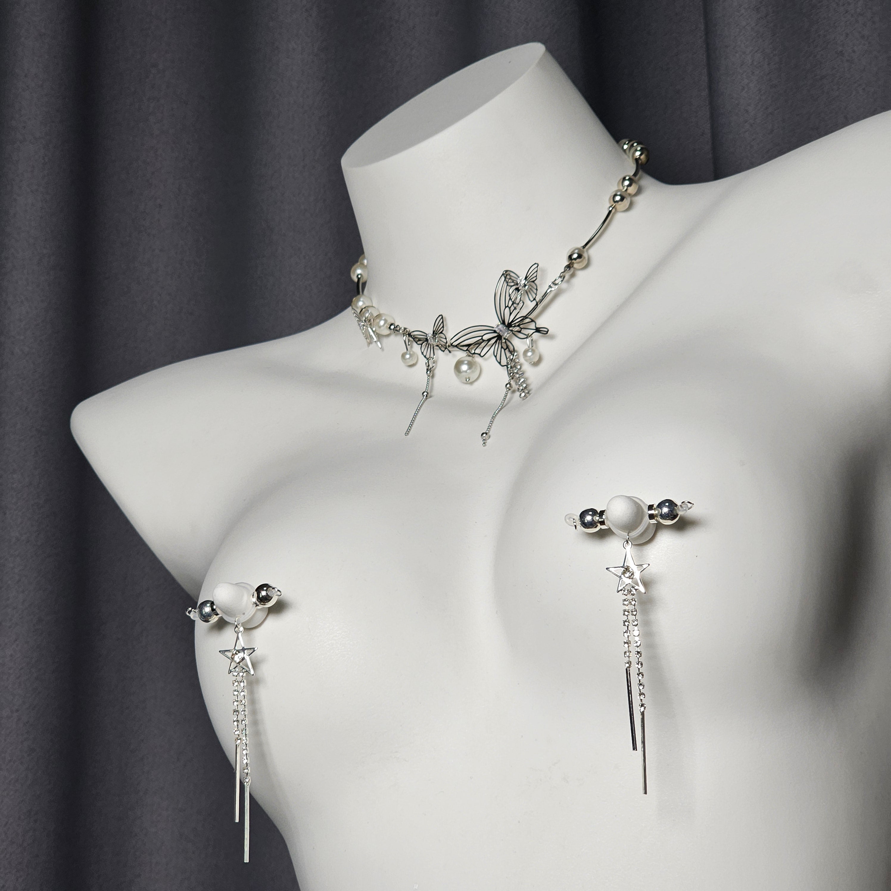 Silver butterfly, hollow star, pearls, and rhinestone tassel combine elegantly. This nipple clip and necklace set exudes refined luxury, blending elegance with contemporary style for a distinctive statement creates a festive atmosphere.