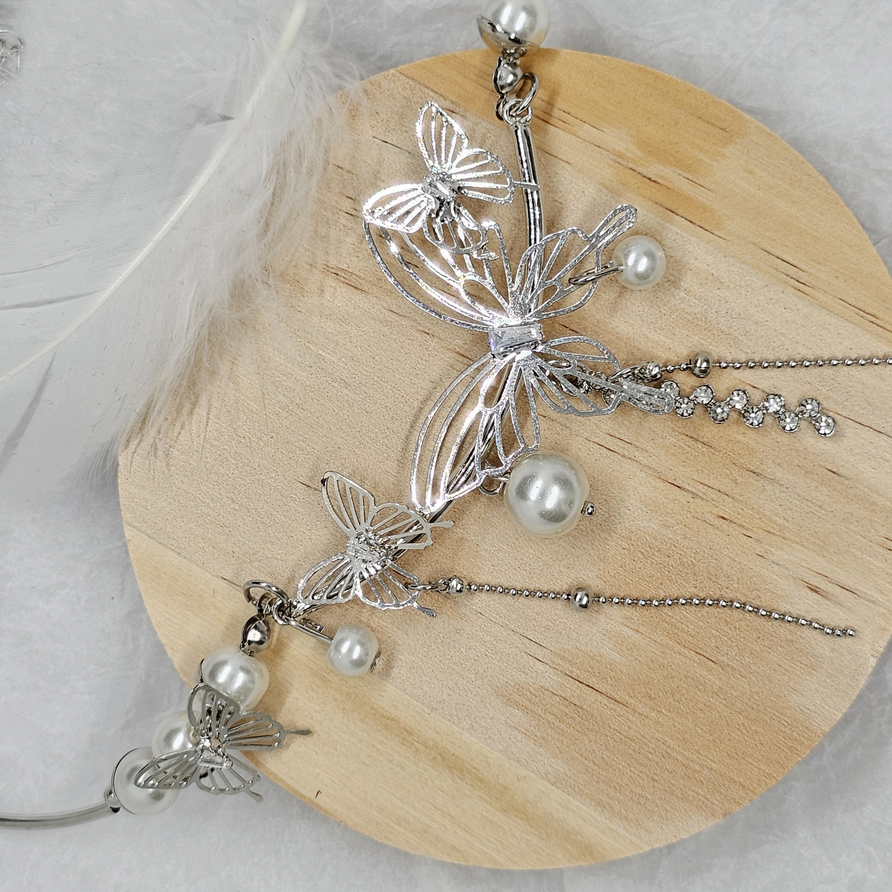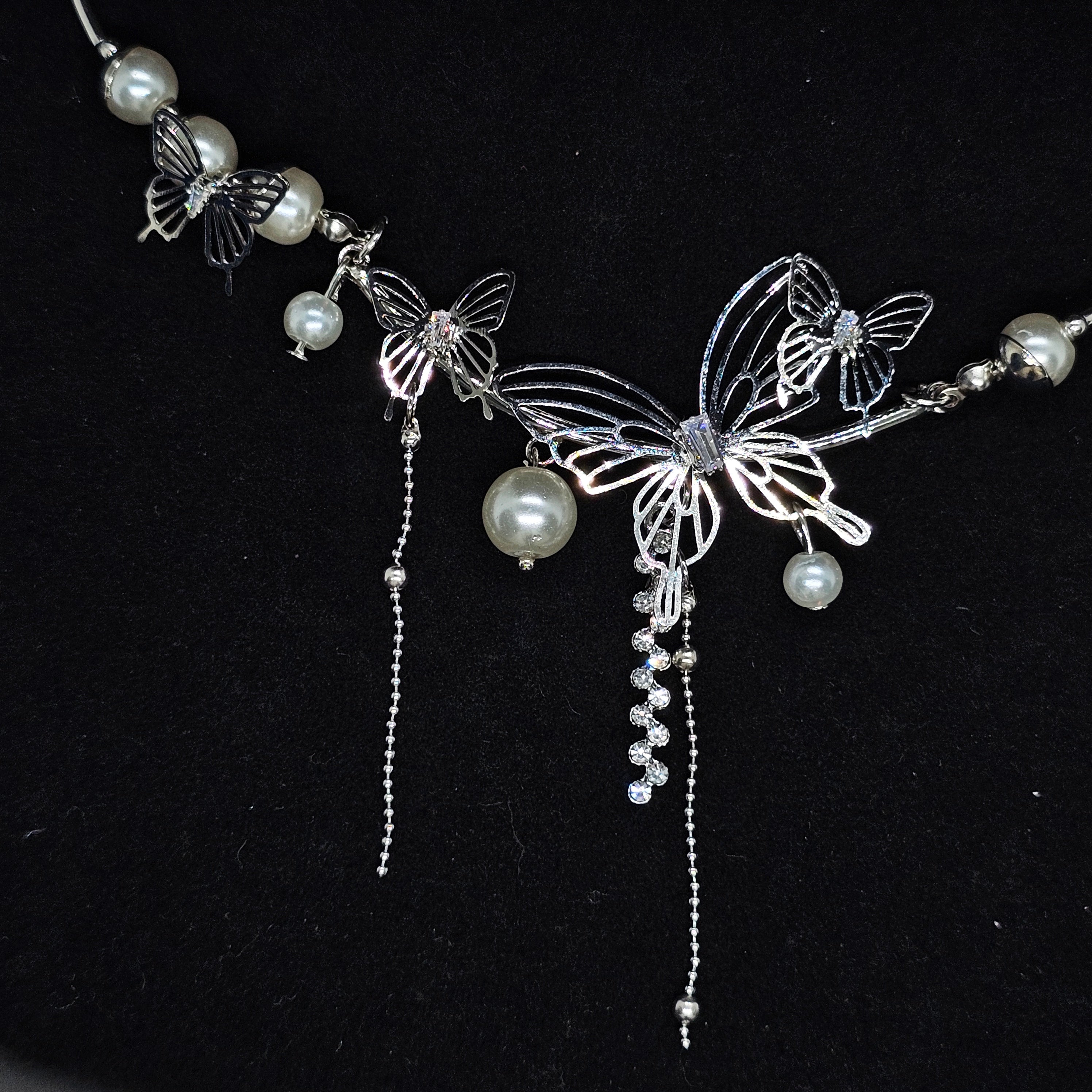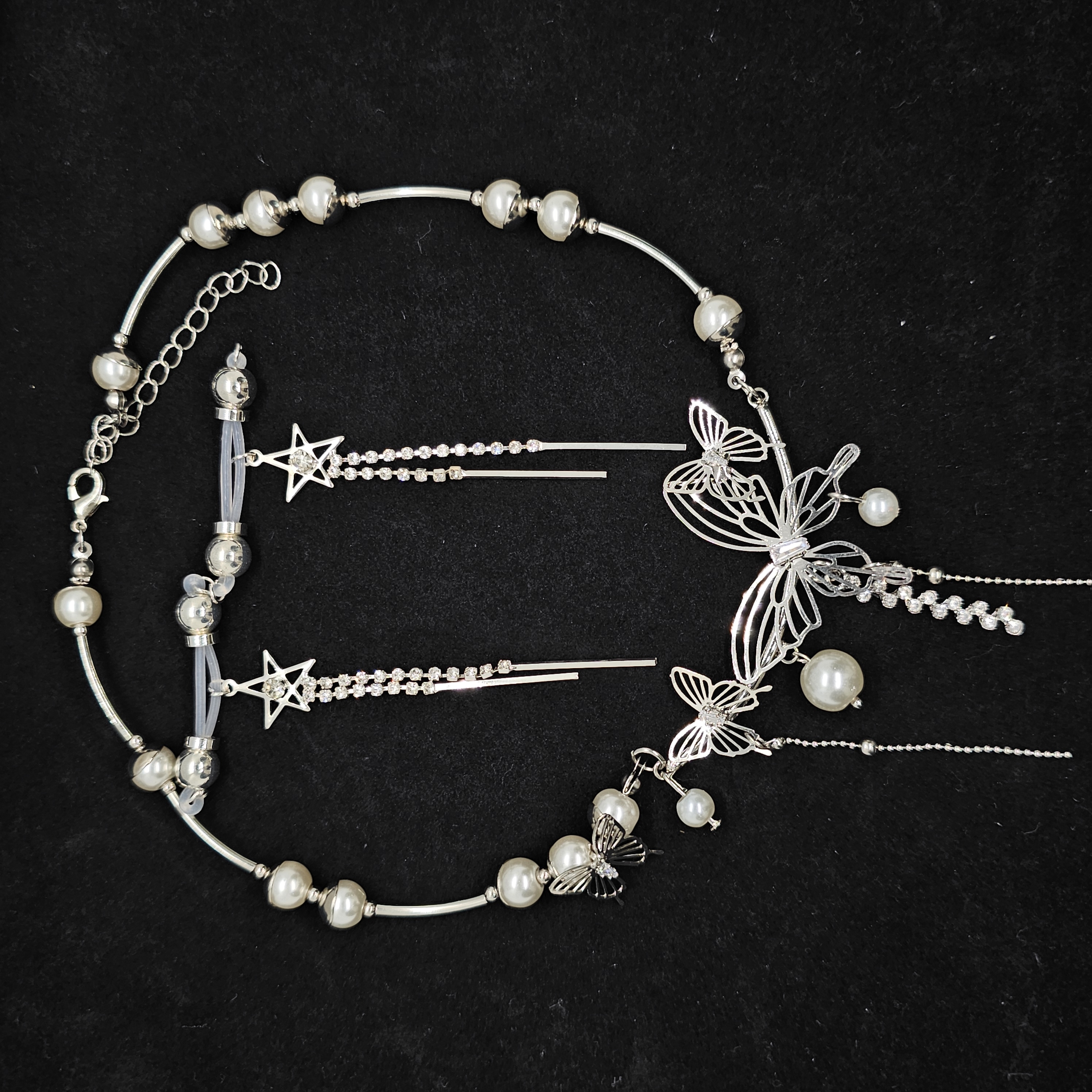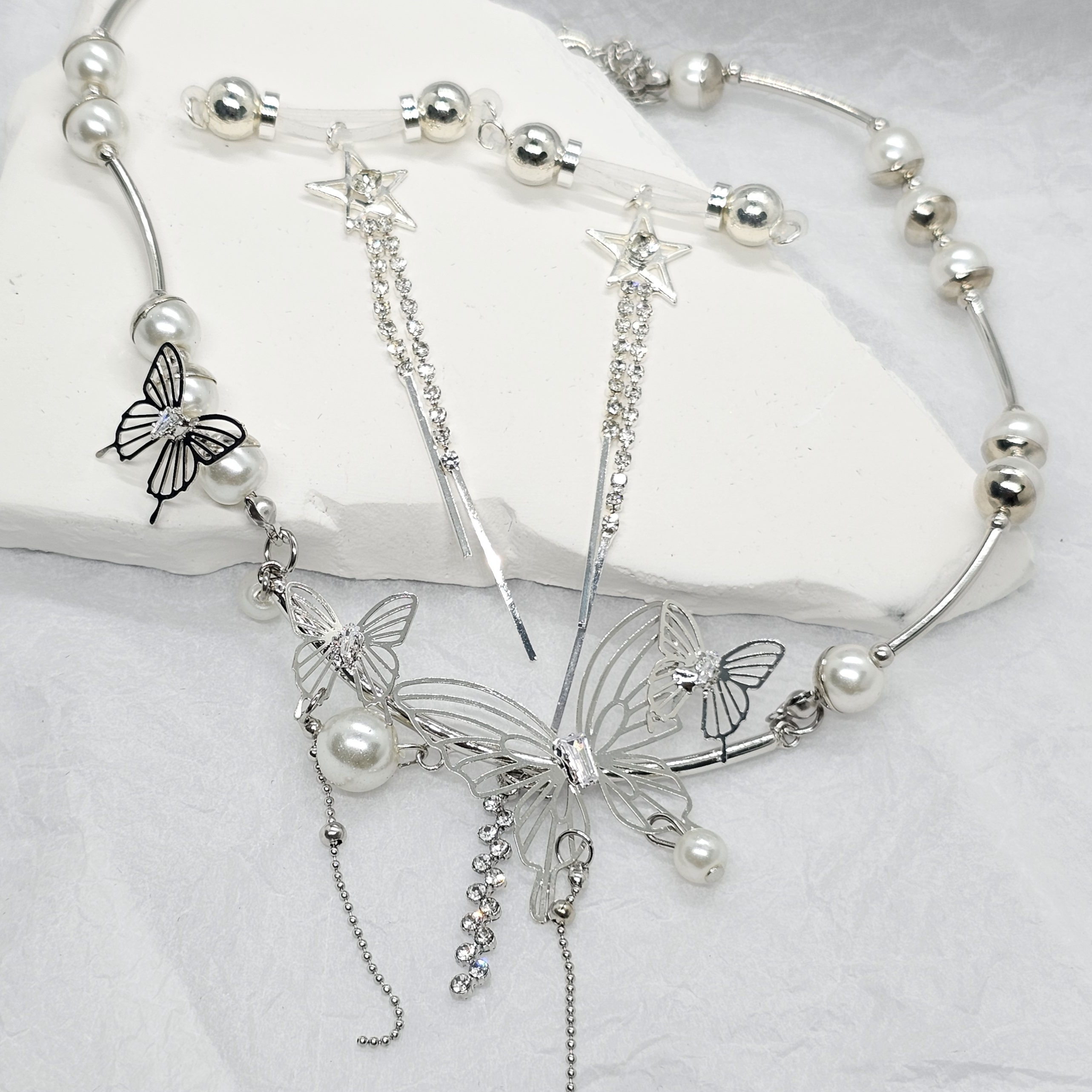 Silver butterfly, hollow star, pearls, and rhinestone tassel combine elegantly. This nipple clip and necklace set exudes refined luxury, blending elegance with contemporary style for a distinctive statement creates a festive atmosphere.
