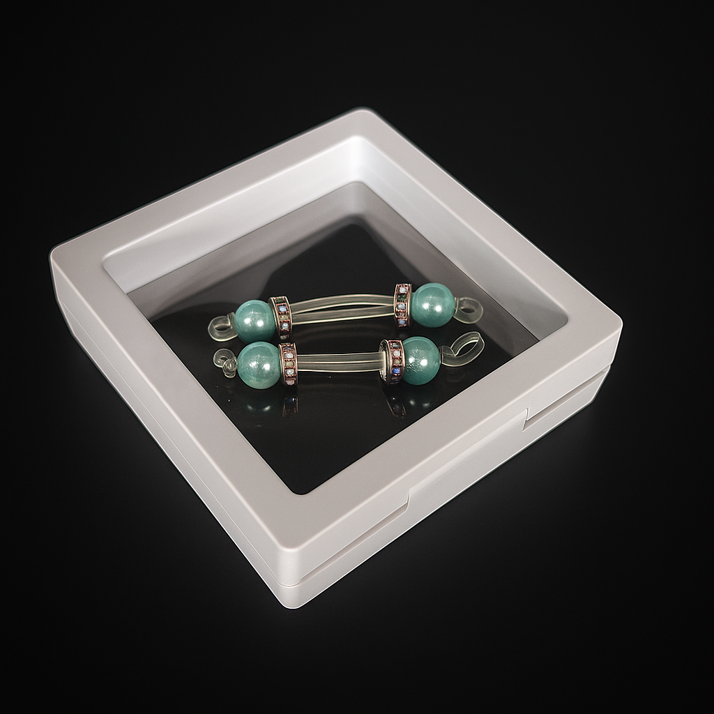A pair of adjustable barbell style dummy nipple piercers. Avoid the pain and discomfort associated with piercing, safer and more hygienic.