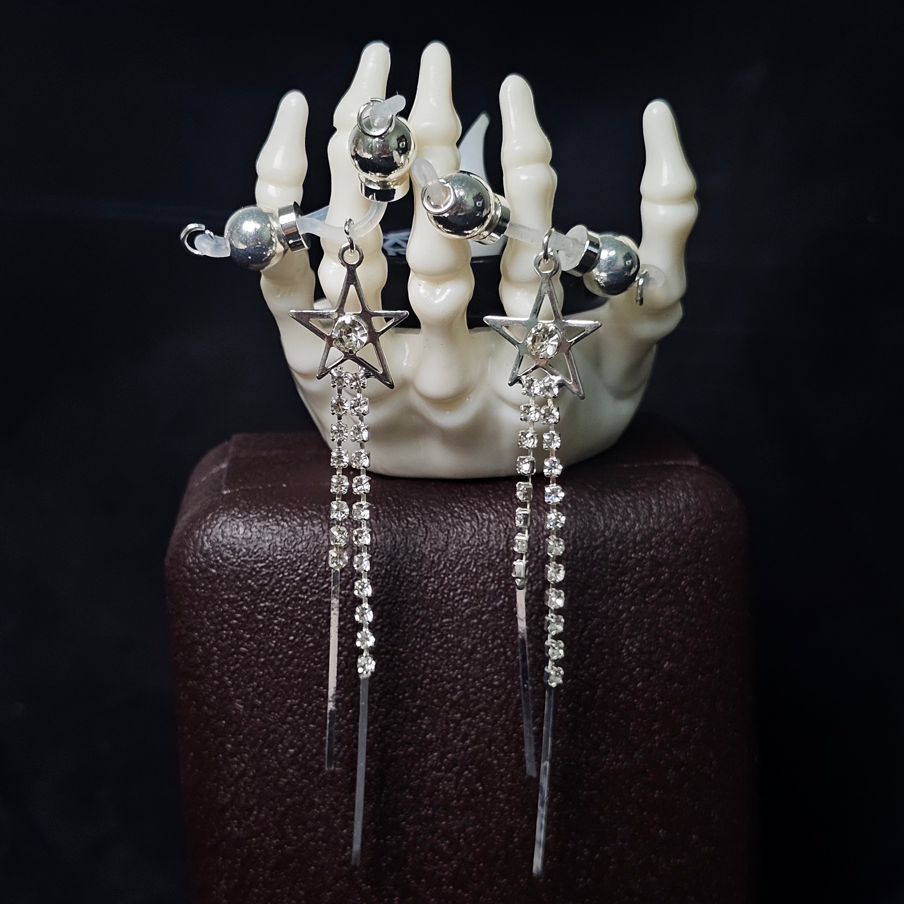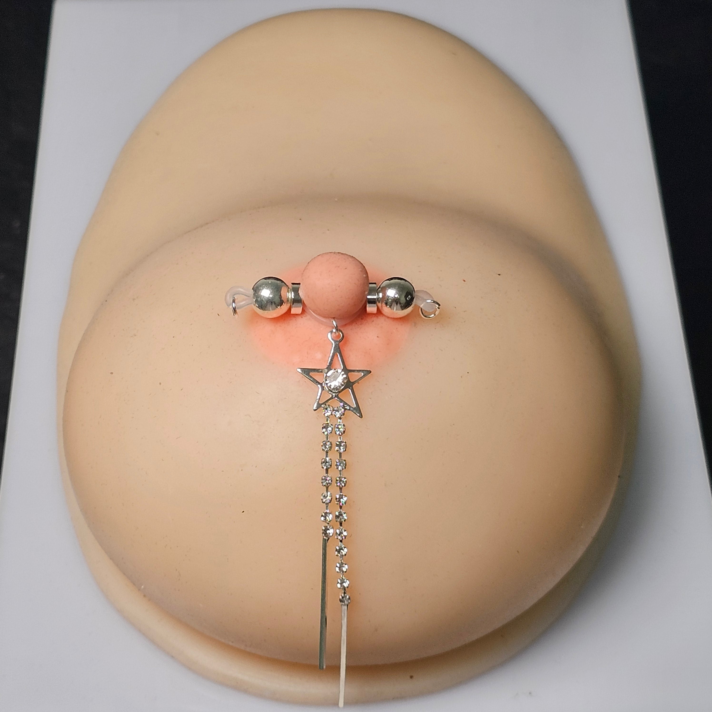 This barbell-style adjustable nipple clamp combines silver beads with a five-pointed star pendant, complemented by a shimmering diamond chain design, creating a bold and sophisticated look. The silver beads are delicately textured, exuding a cool yet understated sense of strength. The five-pointed star pendant symbolizes freedom and individuality, while the intricately set diamond chain shimmers in a play of light and shadow, lending the overall look a futuristic and stylish feel. The multiple rows of chain drape smoothly, creating a dynamic visual effect with movement, creating a bold yet elegant look. The clamp's smooth, adjustable design provides a secure and comfortable fit, easily adapting to different needs, balancing practicality with aesthetics. More than just a piece of jewelry, it's a style statement, allowing the wearer to strike a balance between sexiness and strength, individuality and sophistication. Whether a unique everyday accessory or a striking accessory for special occasions, it showcases the wearer's exceptional taste and unique charm.