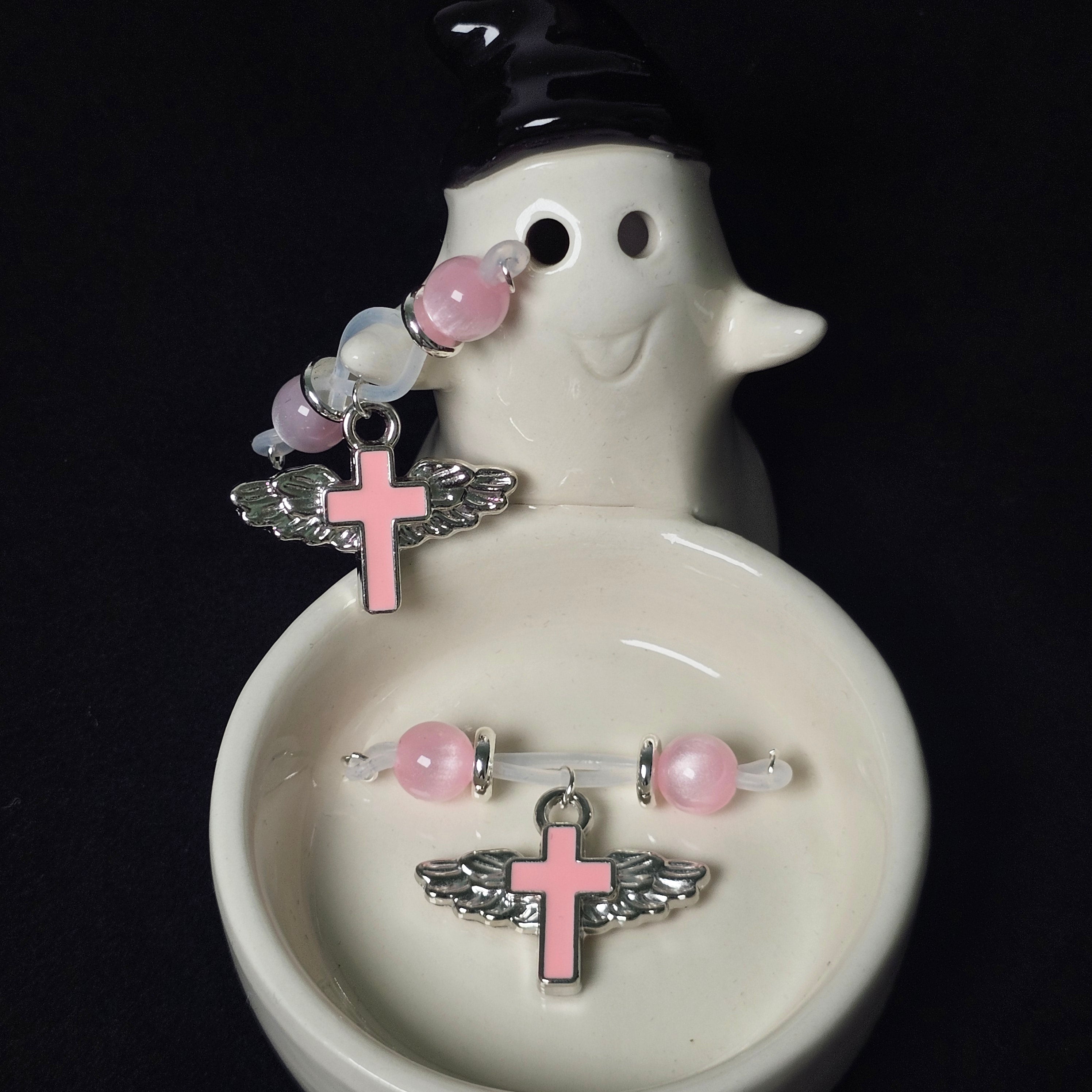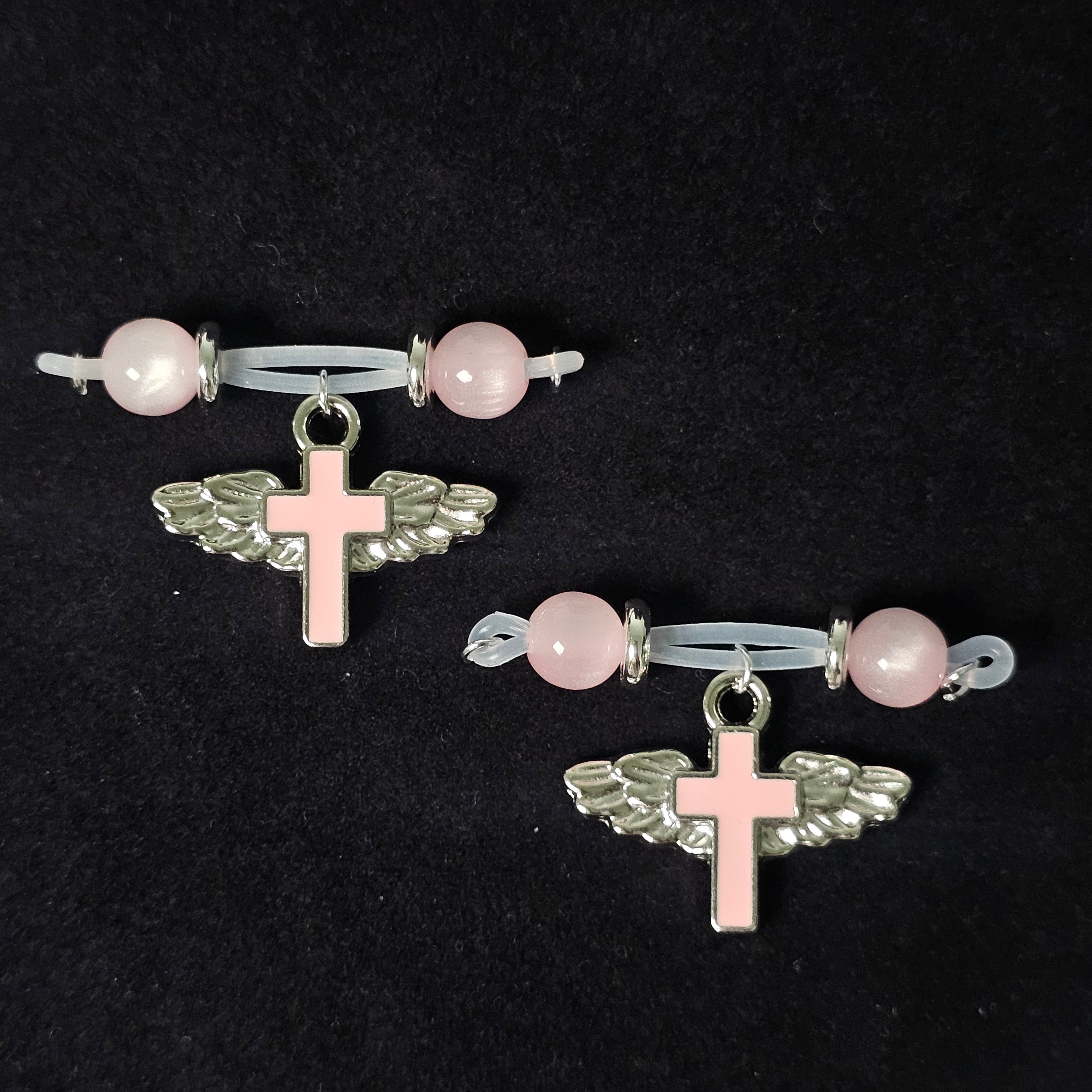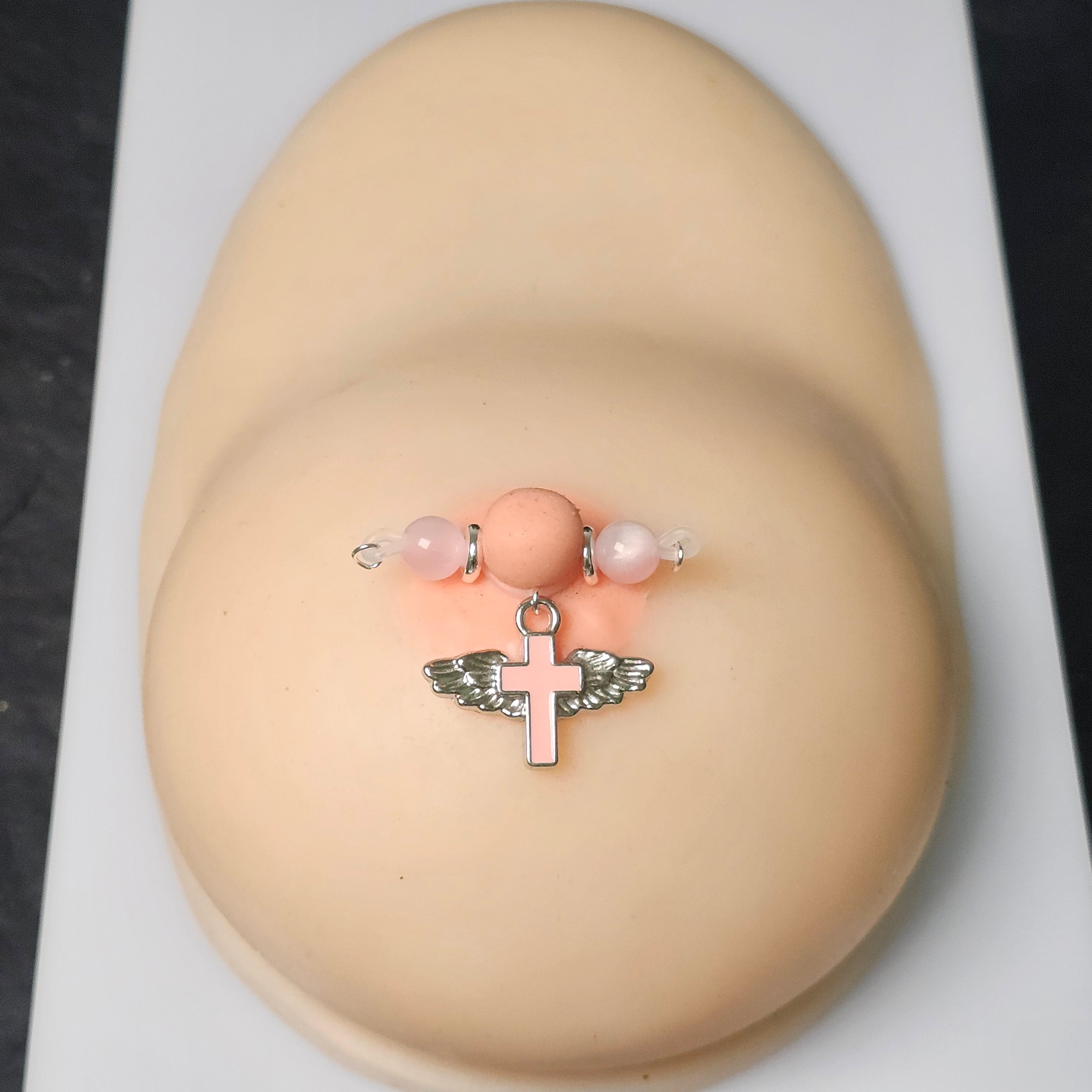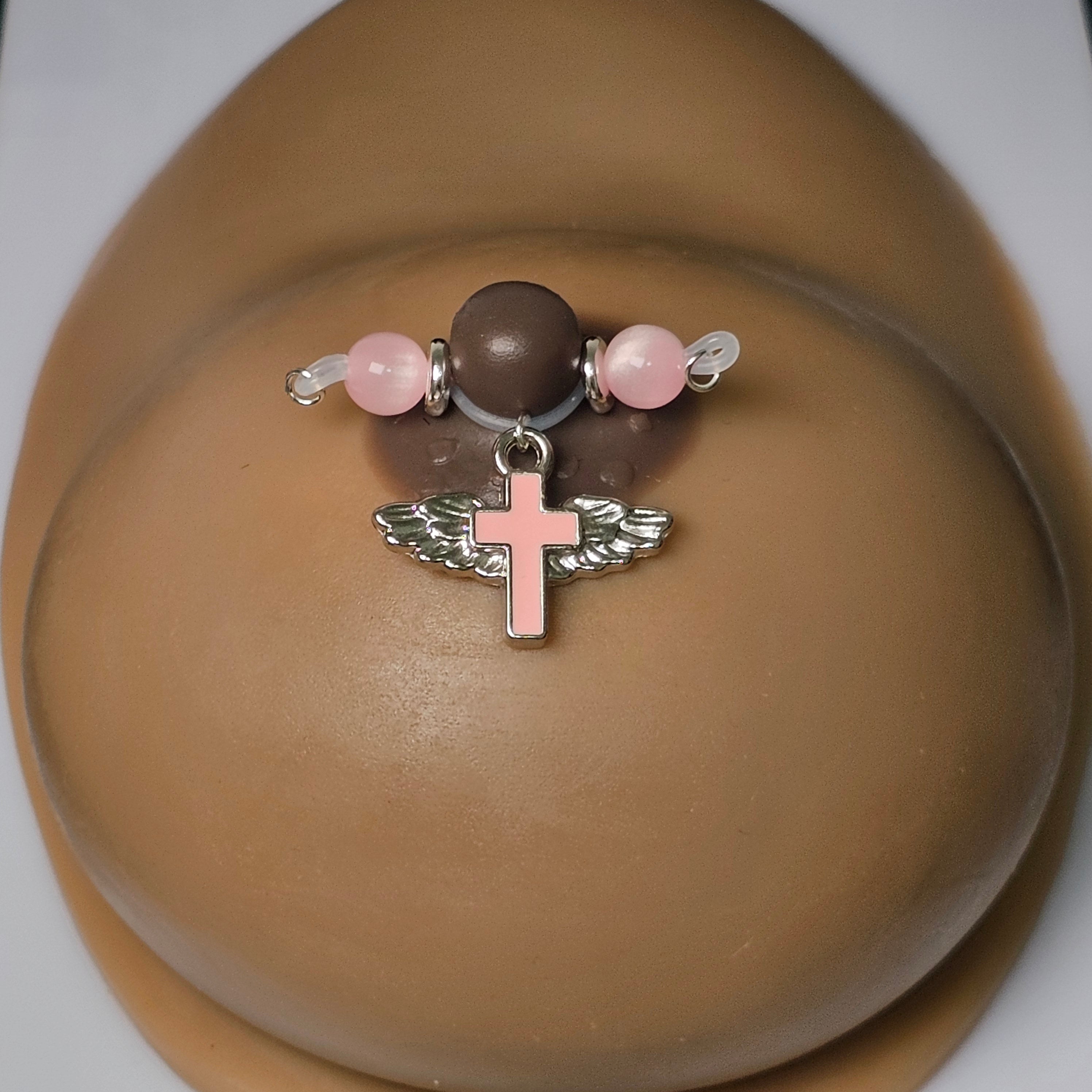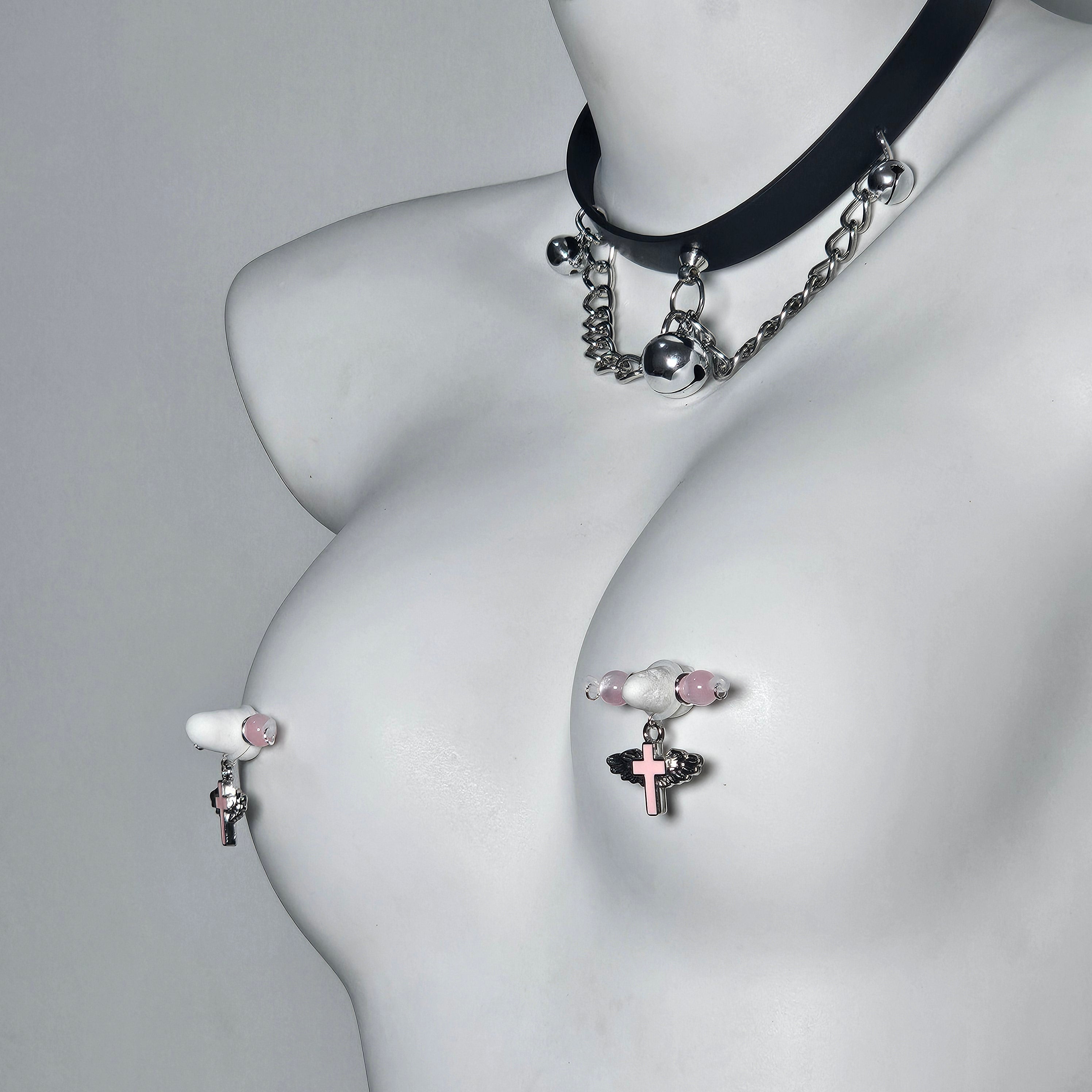This barbell-style adjustable nipple clamp features pink gemstone beads paired with a pink cross pendant with wings, creating a subtle blend of softness and strength. The soft radiance of the pink gemstones symbolizes romance and unique individuality, while the winged cross design adds a sense of freedom and protection. The overall design is both mysterious and elegant, creating a high-end and sophisticated visual effect. The clamp's sleek finish and stable construction allow for smooth adjustment and a comfortable fit, allowing for precise control of pressure, ensuring a comfortable fit while showcasing a unique aesthetic. The pink hue of the beads echoes the pendant details, creating a soft yet bold look. Whether worn as an everyday accent or a statement piece for a special occasion, this nipple clamp exudes confidence and style, making it an ideal choice for those seeking elegance and distinction.