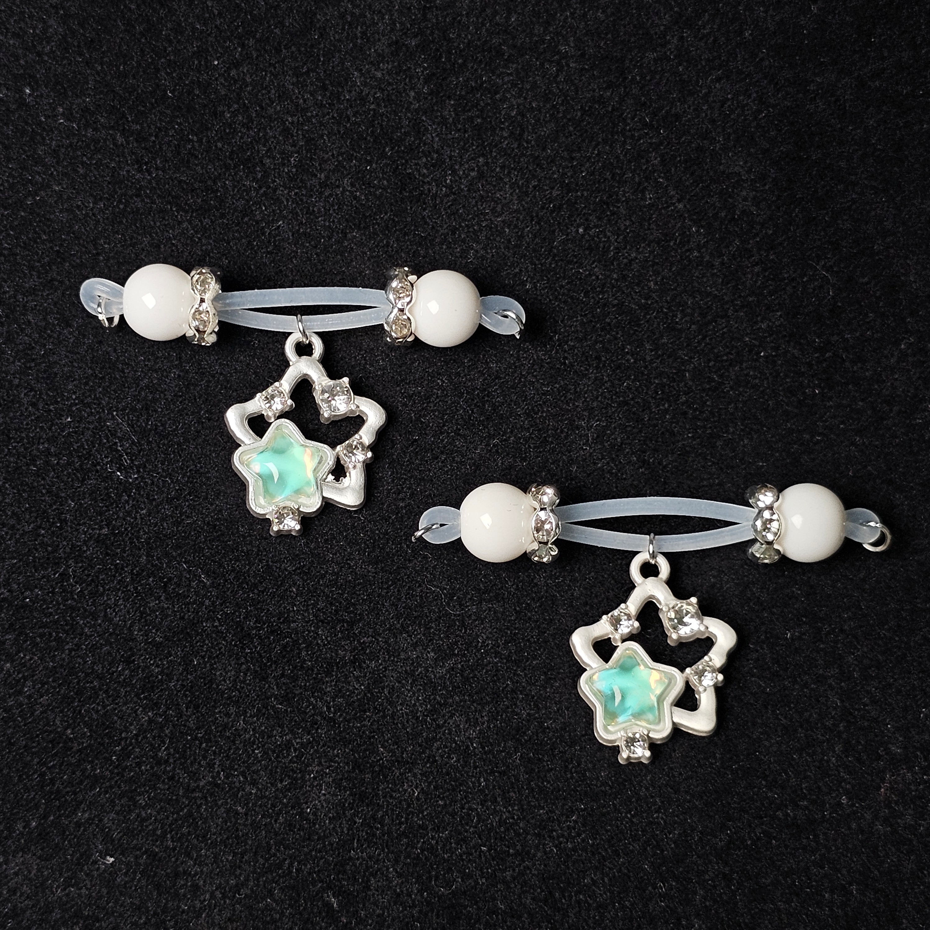 This barbell-style adjustable nipple clamp exudes elegance and boldness with its refined design. Polished white gemstone beads, accented with a five-petal flower design and an emerald green gemstone pendant, exude sophisticated allure. The barbell construction ensures durability, while the adjustable design offers comfort and flexibility. The smooth gemstones conform to the skin, balancing beauty and sensuality. The striking contrast of white and green creates a harmonious and eye-catching look, making this not just a fun accessory but a statement piece that showcases individuality, confidence, and charm.