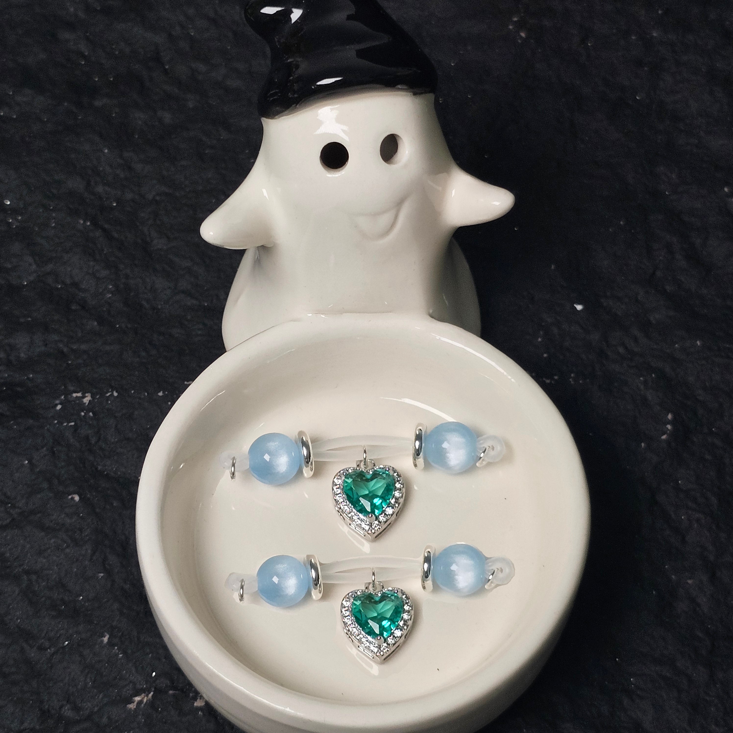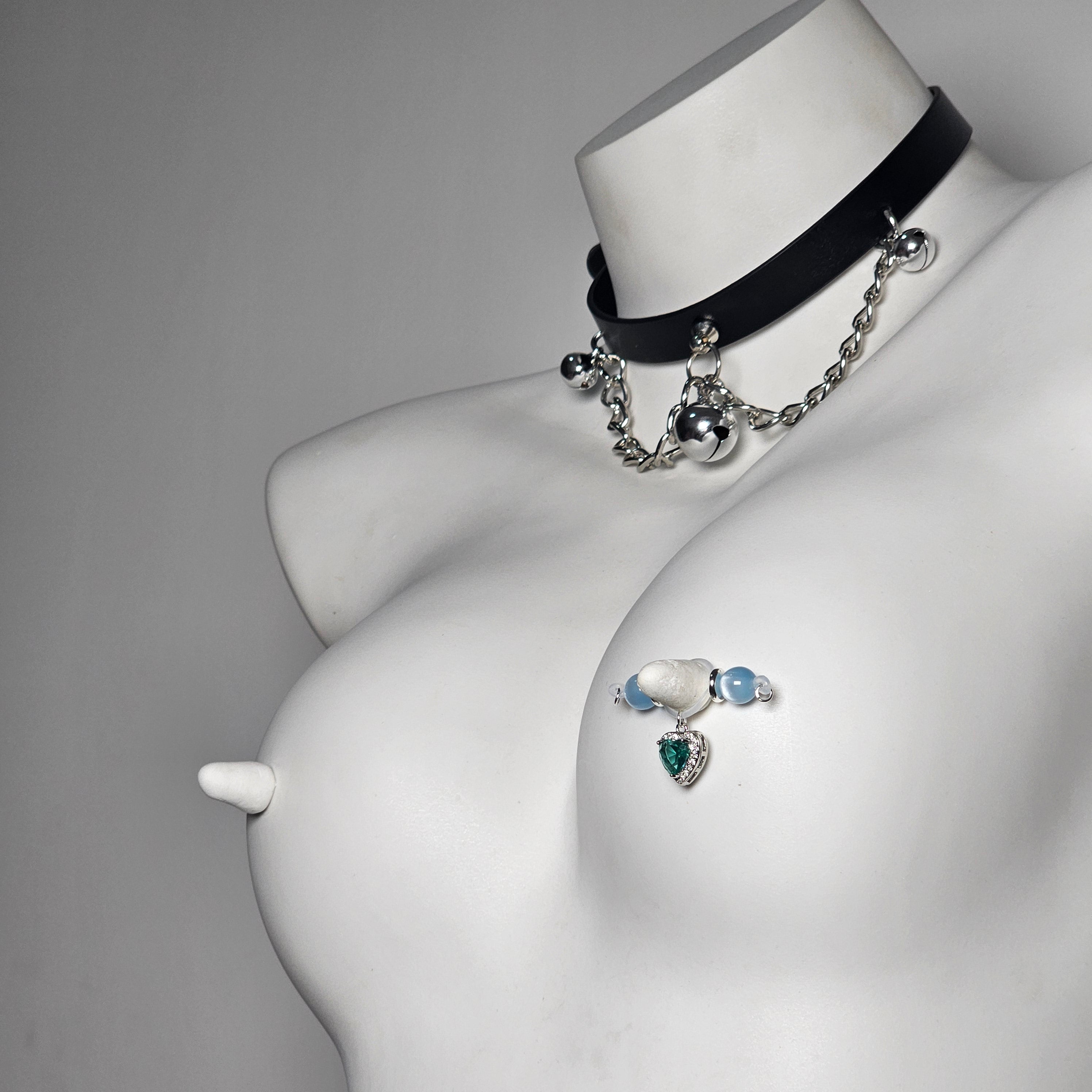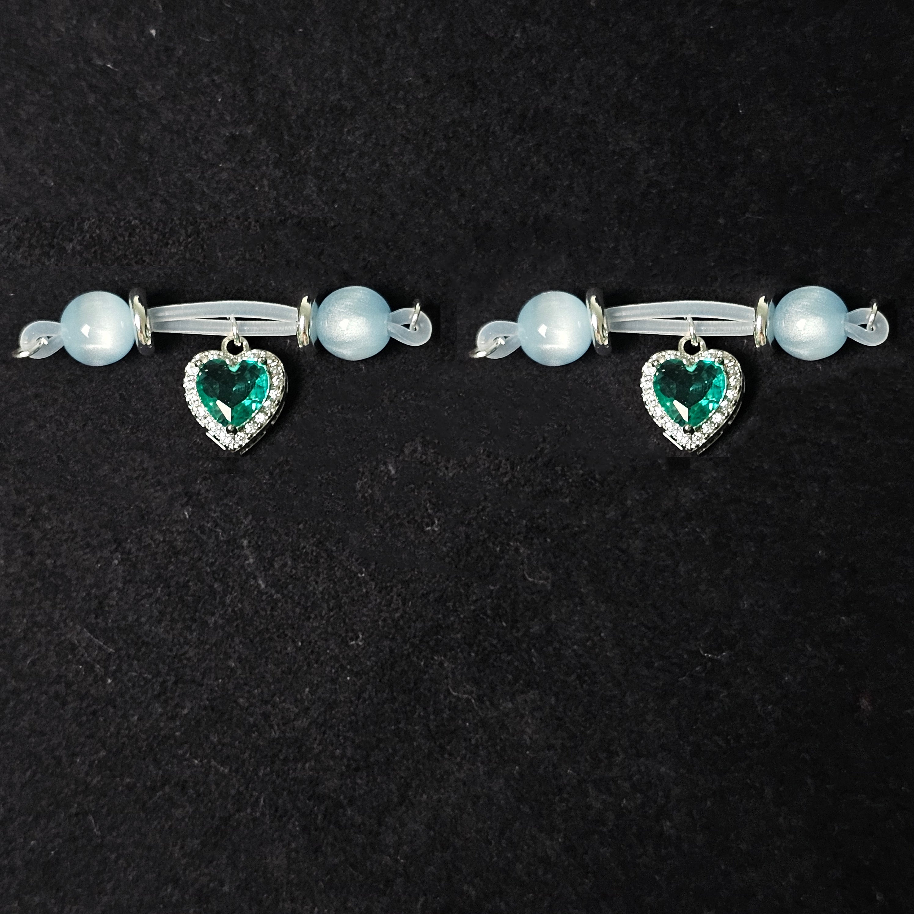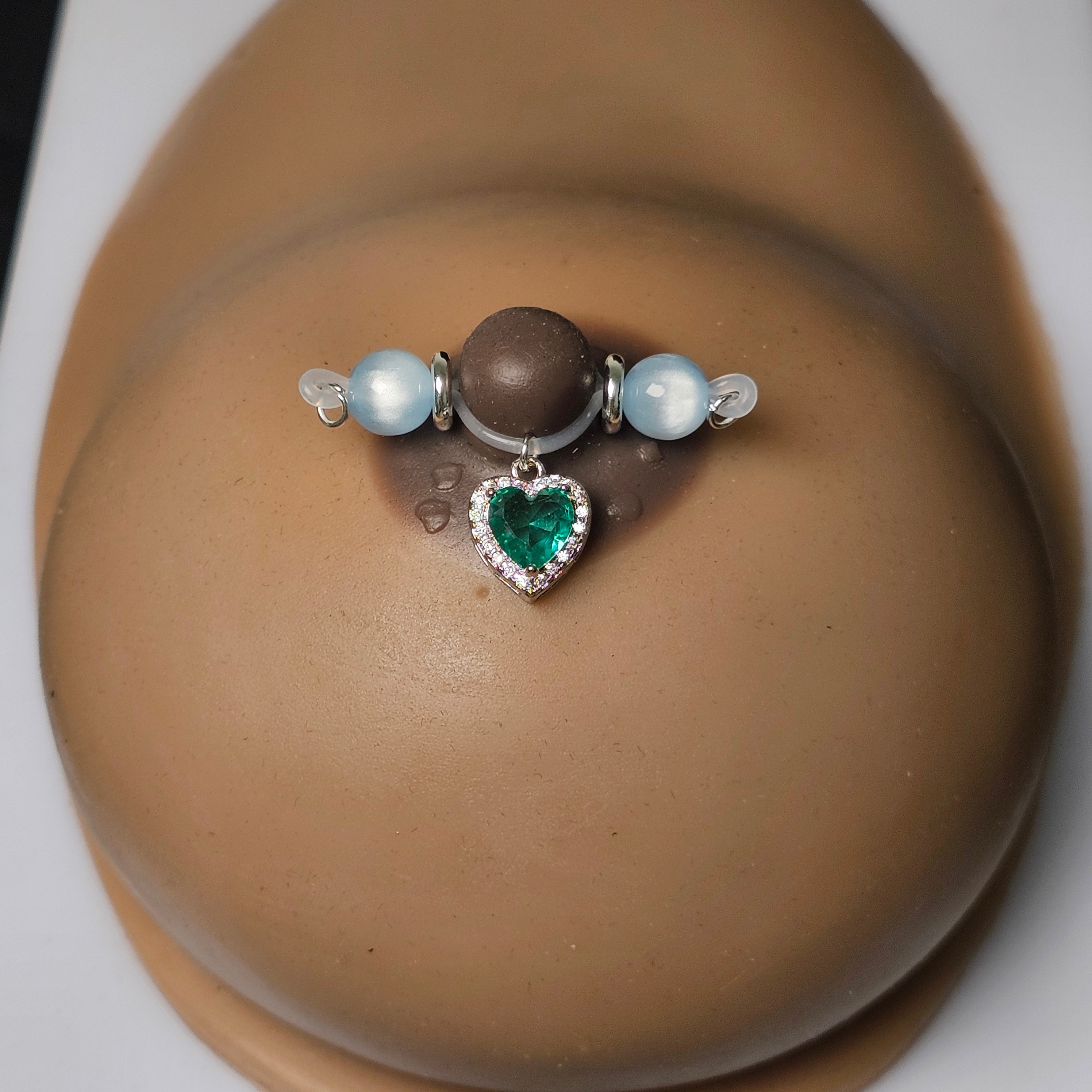 This barbell-style adjustable nipple clamp blends exquisite craftsmanship with modern charm. Polished light blue jade beads create a sense of tranquility and sophistication, while the lake green heart-shaped gemstone pendant, set with diamonds, adds elegance and movement. The simple barbell construction ensures durability, while the adjustable design offers comfort and personalization. More than just a private accessory, it's a fashion statement that showcases confidence and sophistication. The soft blue and vibrant green complement each other, creating a unique balance of tranquility and vitality. Ideal for those seeking exclusivity, luxury, and unforgettable experiences, this clamp perfectly blends art and functionality.