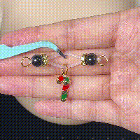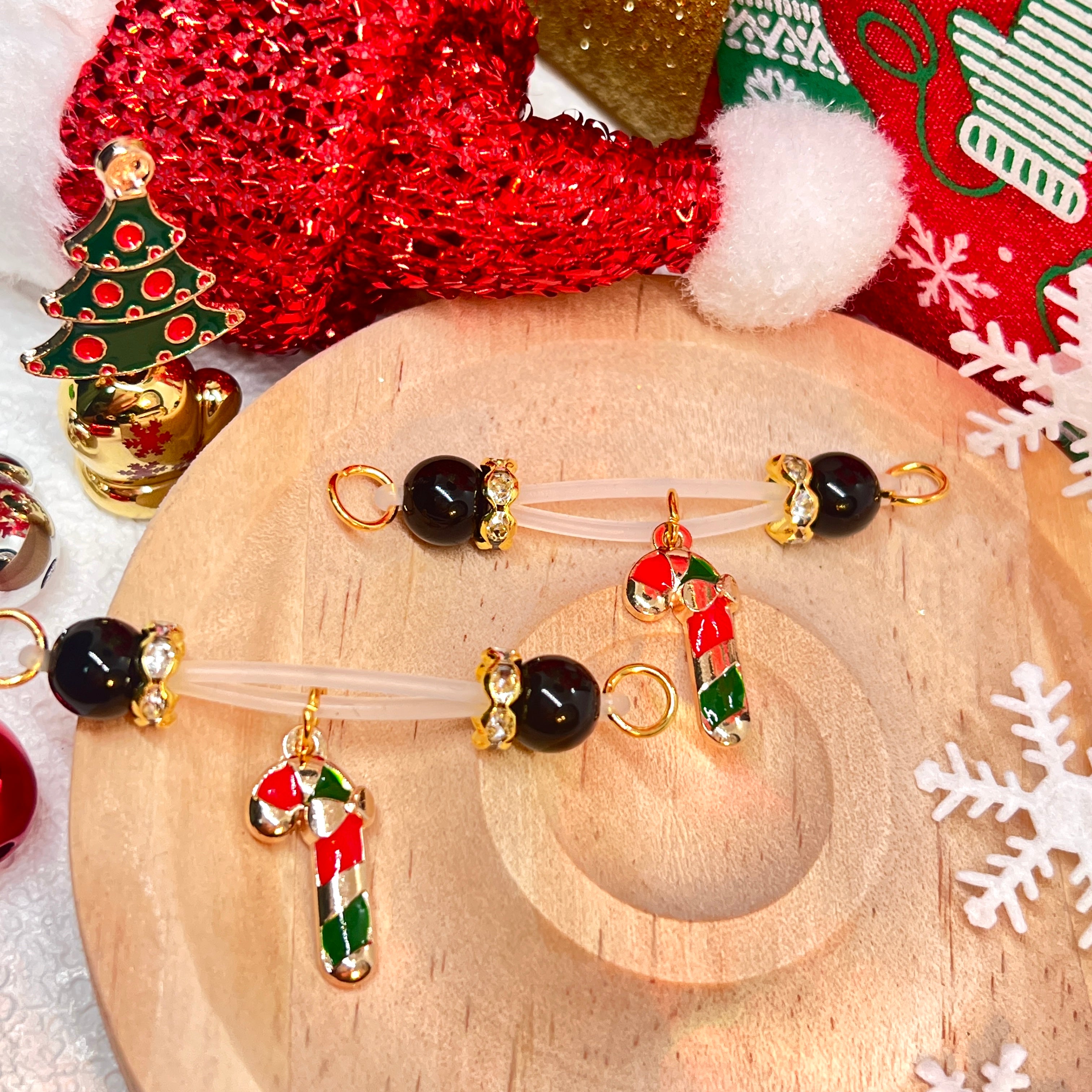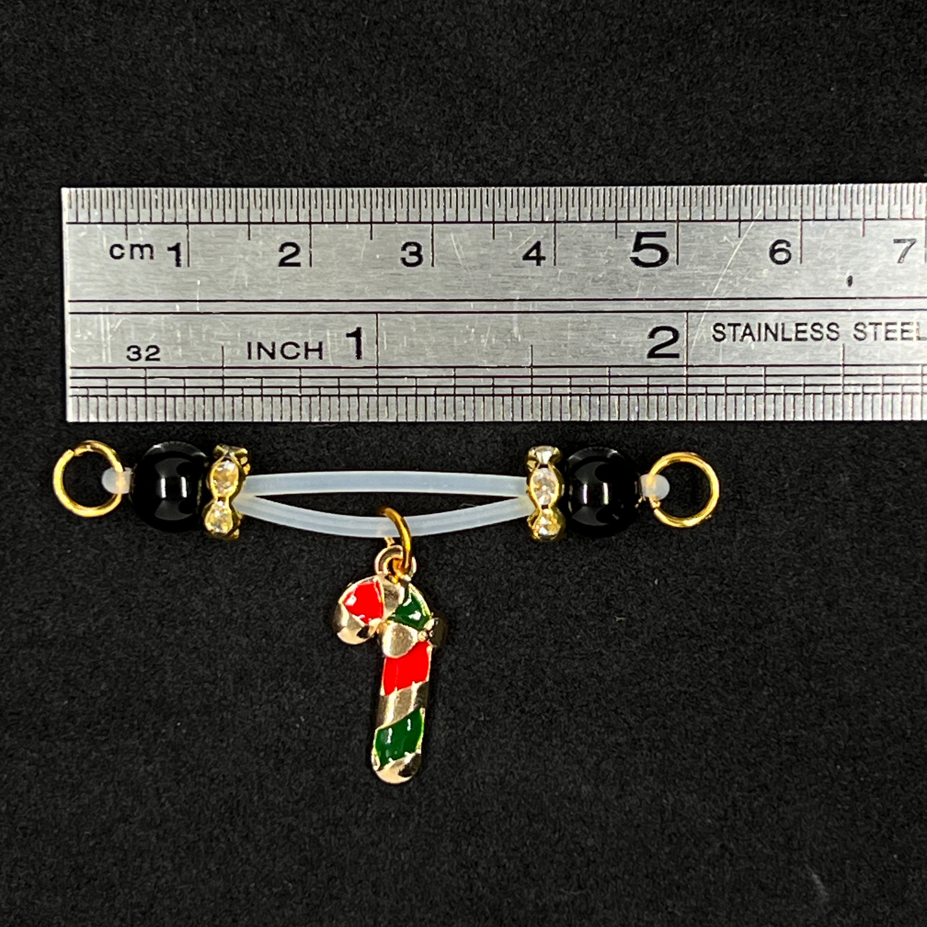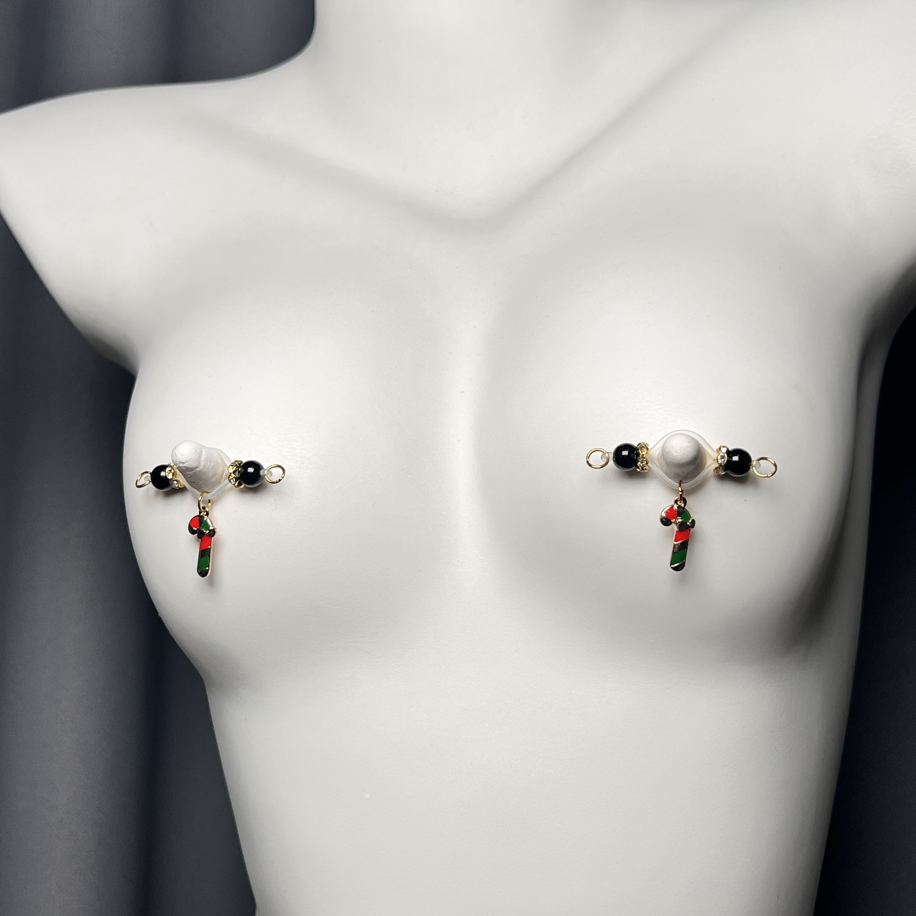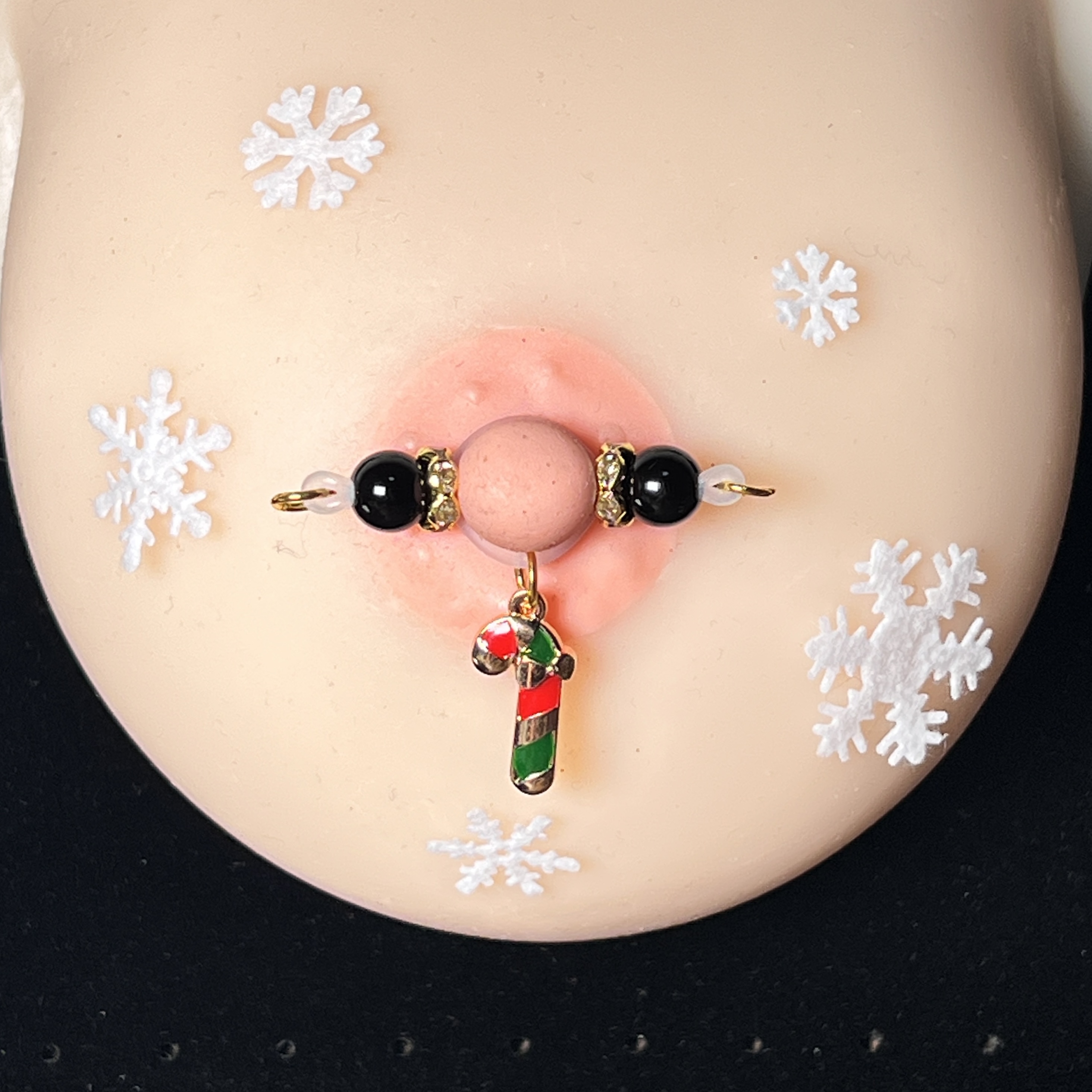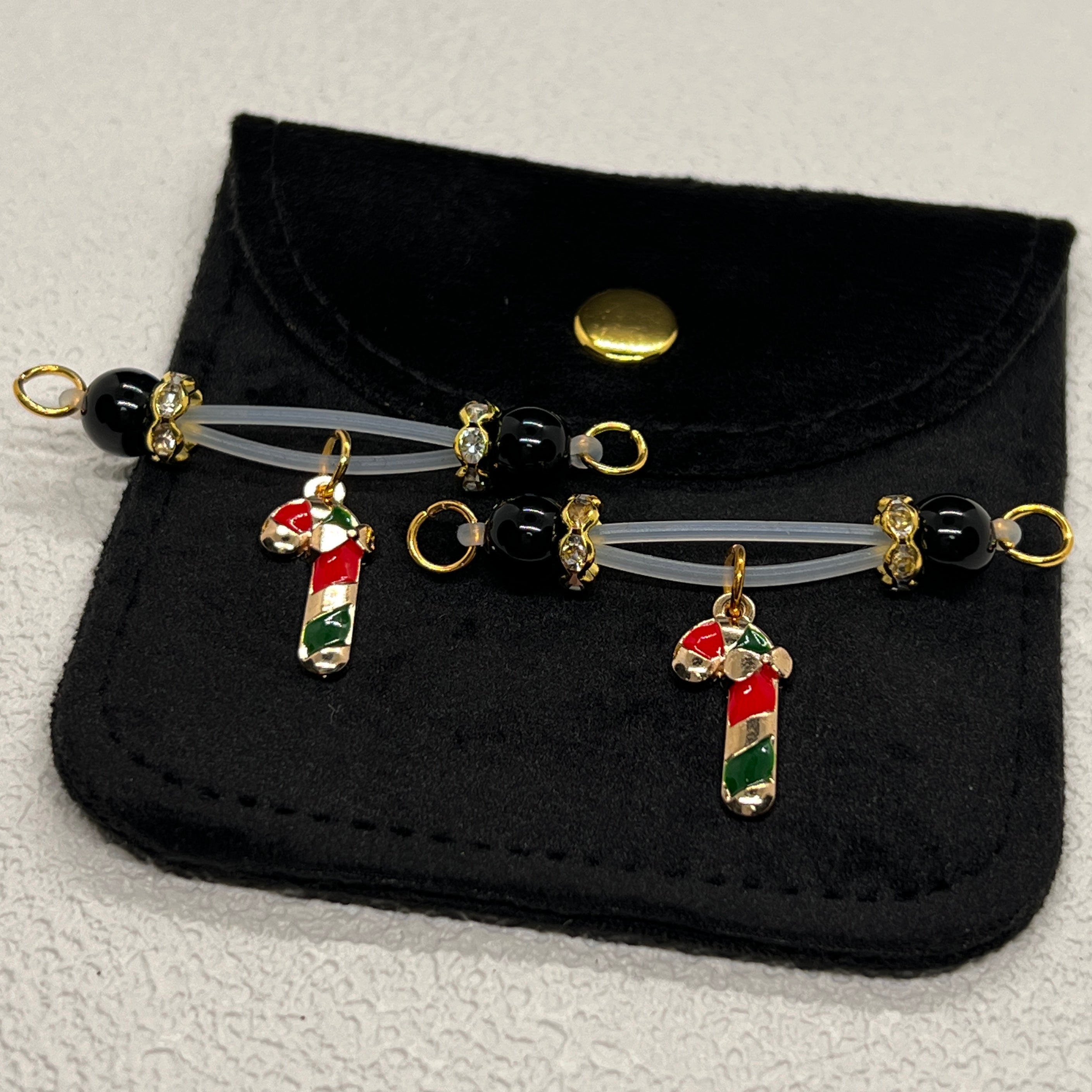 Celebrate the season with these adjustable barbell nipple clamps. Featuring sleek black gemstone beads and an elegant candy cane charm, they blend subtle sophistication with festive spirit. Comfortable, versatile, and eye-catching, these clamps are perfect for personal enjoyment or gifting, adding a refined holiday touch to any ensemble.