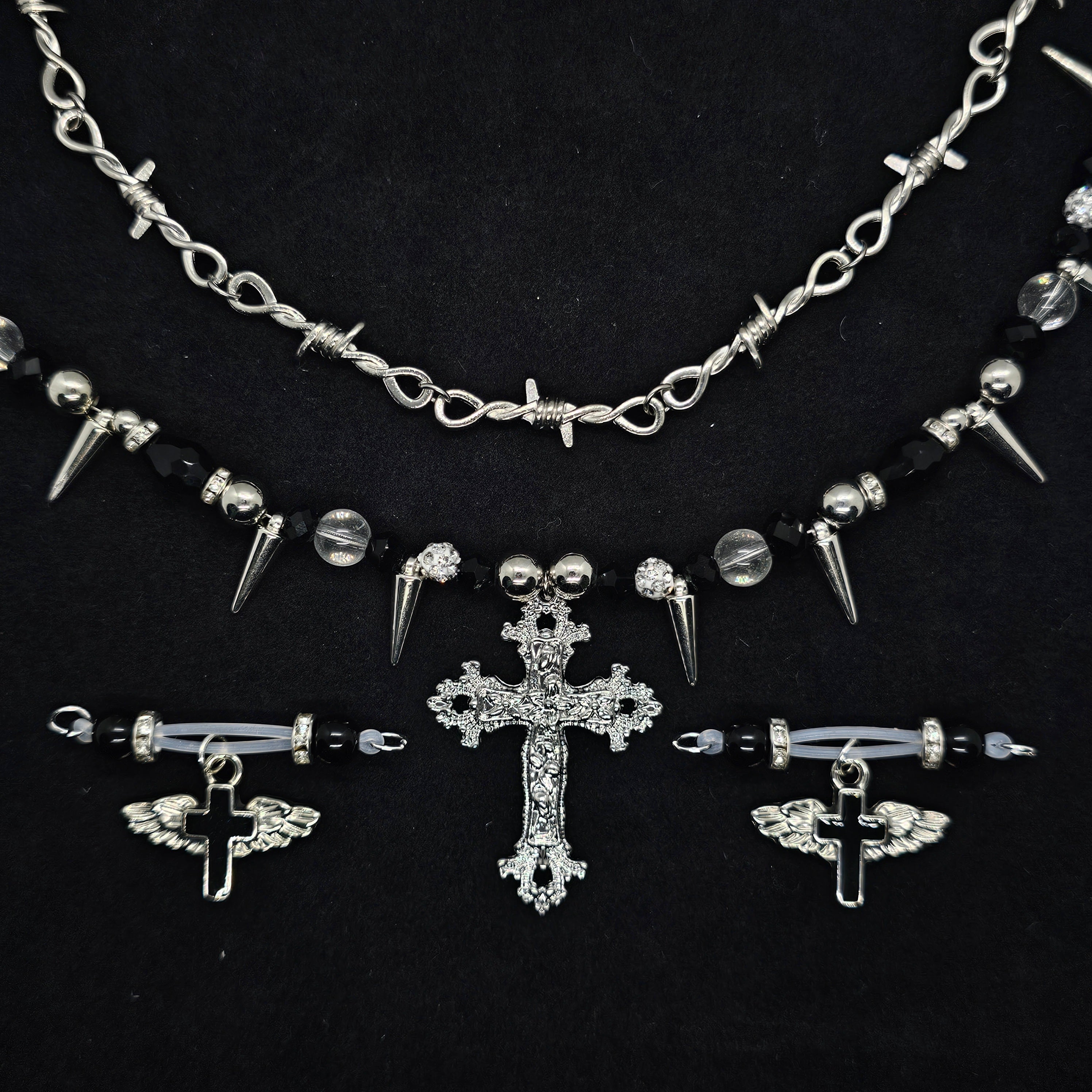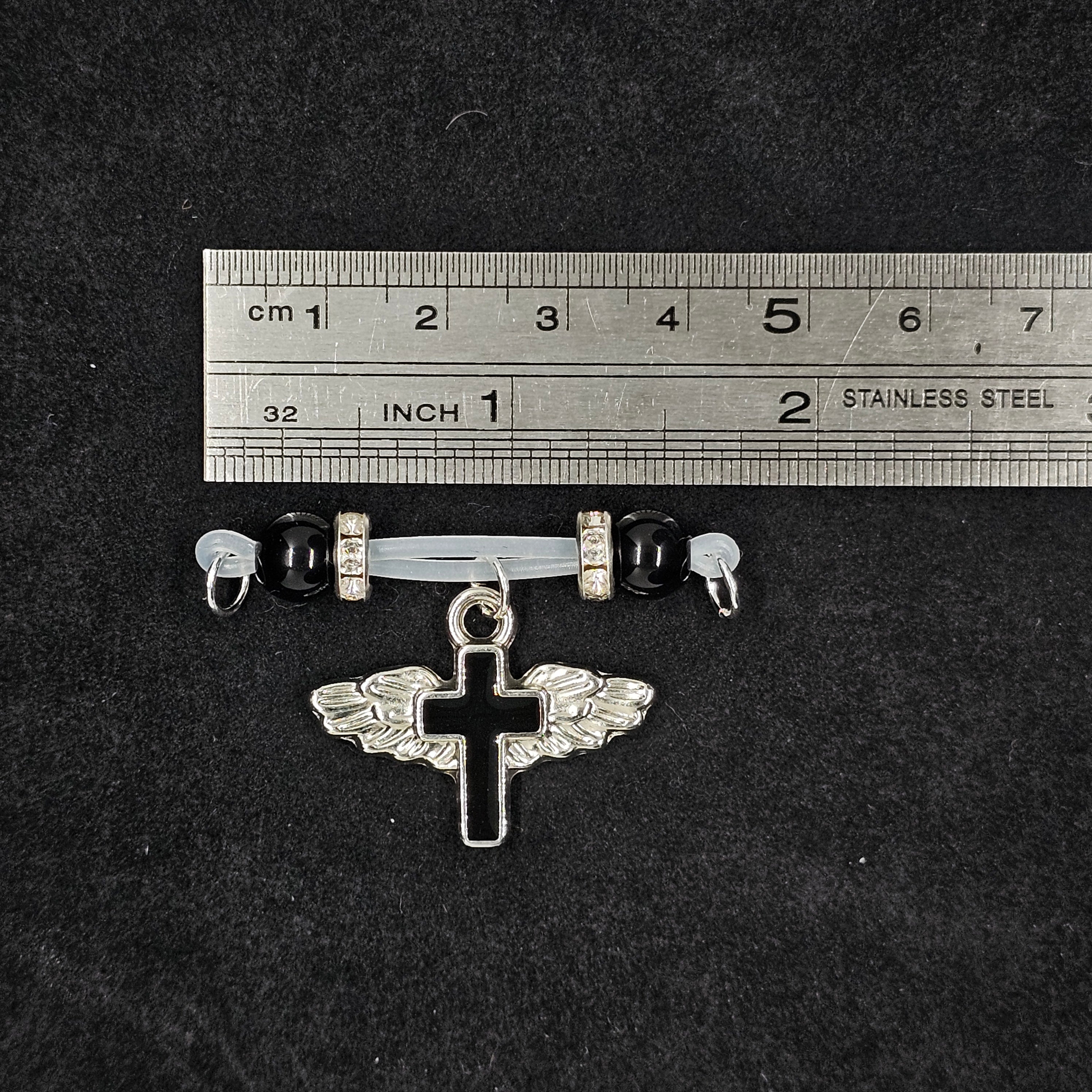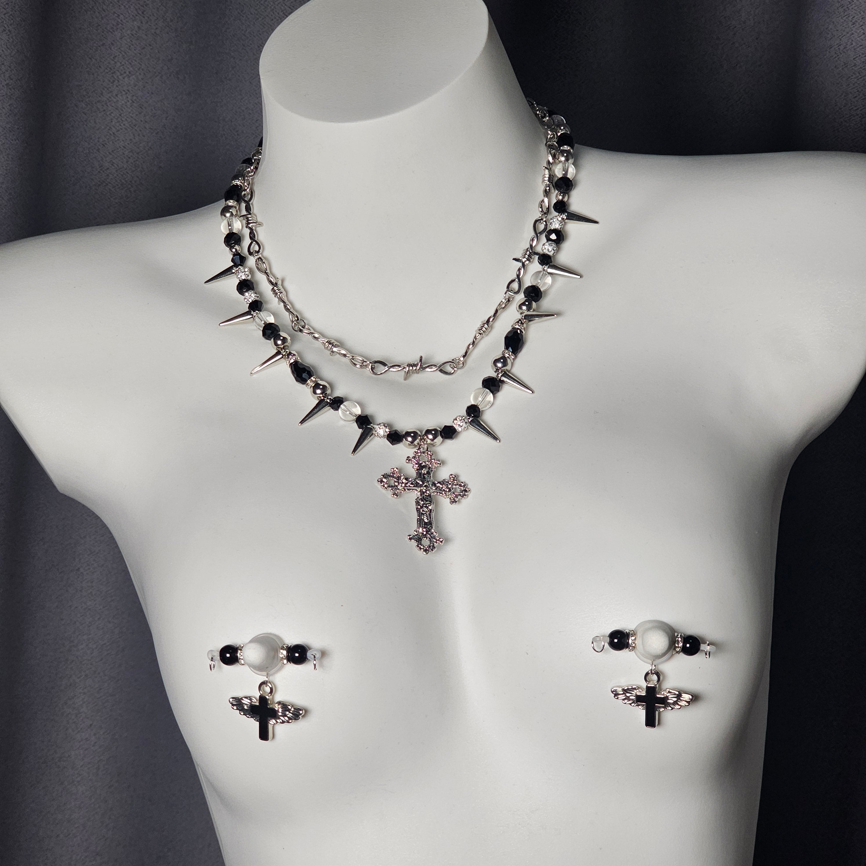 Exude edgy sophistication with this collection of adjustable barbell nipple clips. Featuring black beads with winged black cross pendants, translucent and black beads paired with silver studs, and intricately detailed vintage silver cross charms, each piece combines bold design with refined craftsmanship. Adjustable for comfort, these pieces elevate any ensemble, offering a unique blend of modern gothic allure and luxurious attention to detail. Perfect for self-expression, gifting, or adding a striking accent to your jewelry collection.