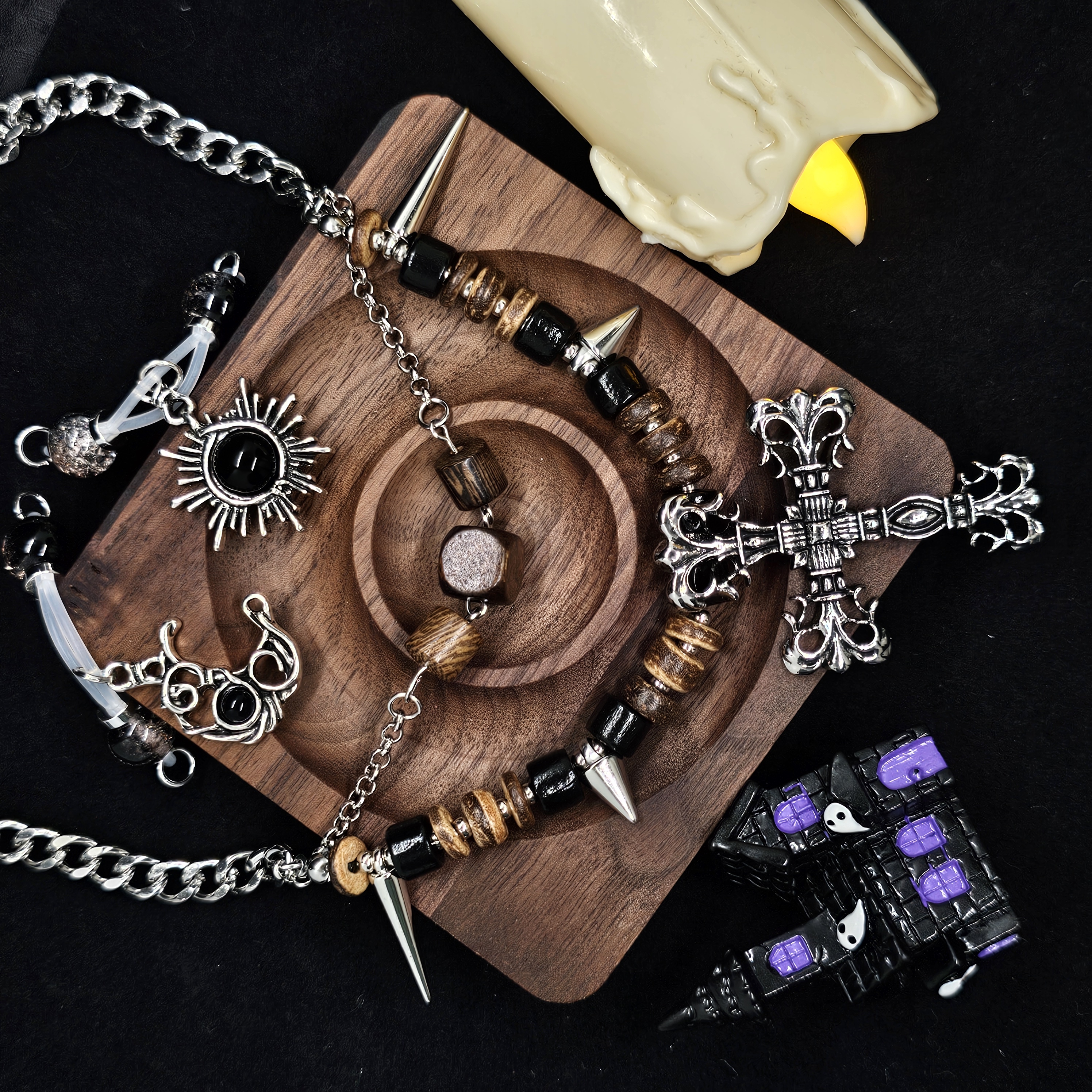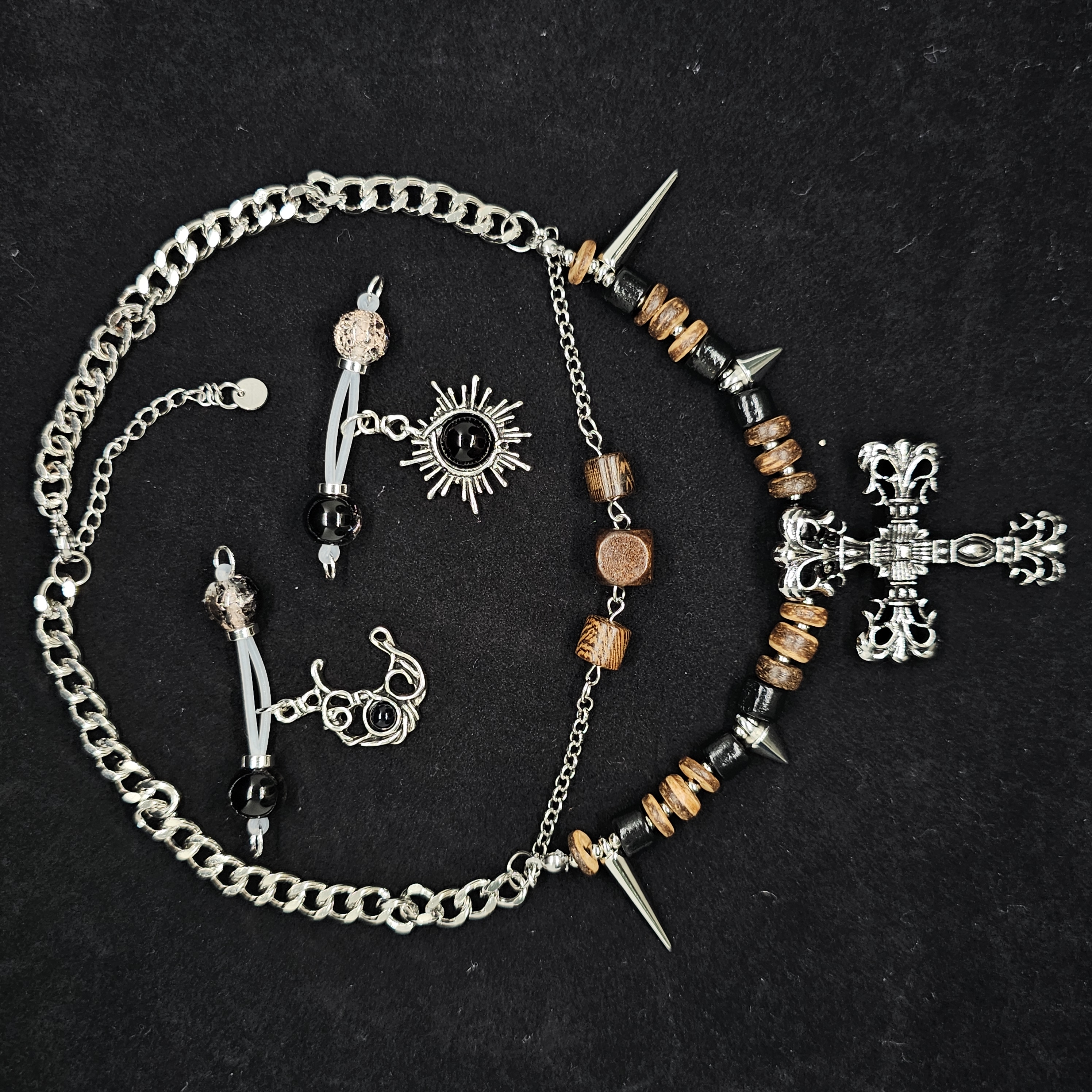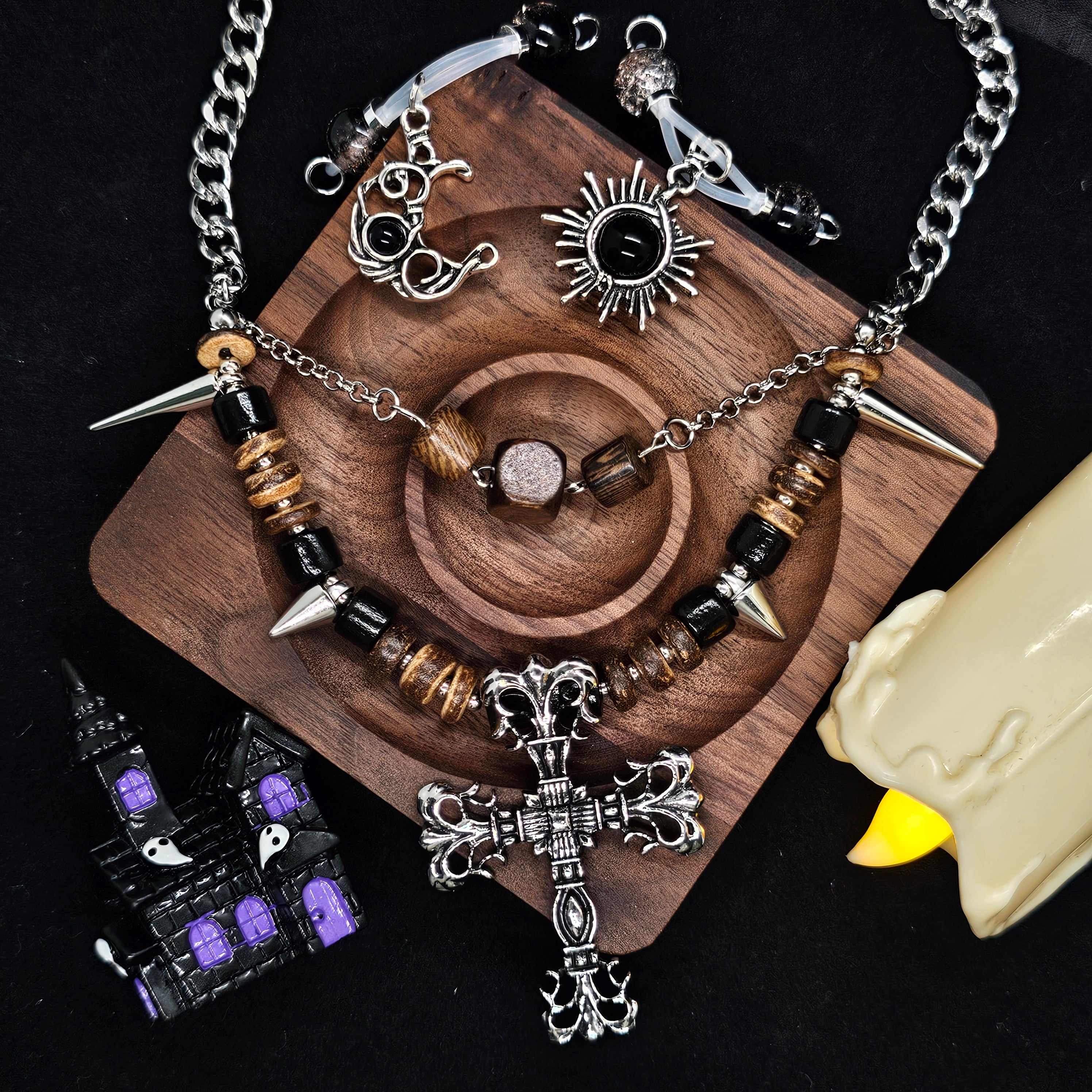 Silver moon and sun with black gemstones, wooden beads, and vintage cross create a mysterious, elegant vibe, blending retro and modern for a distinctive, refined statement creates a festive atmosphere.