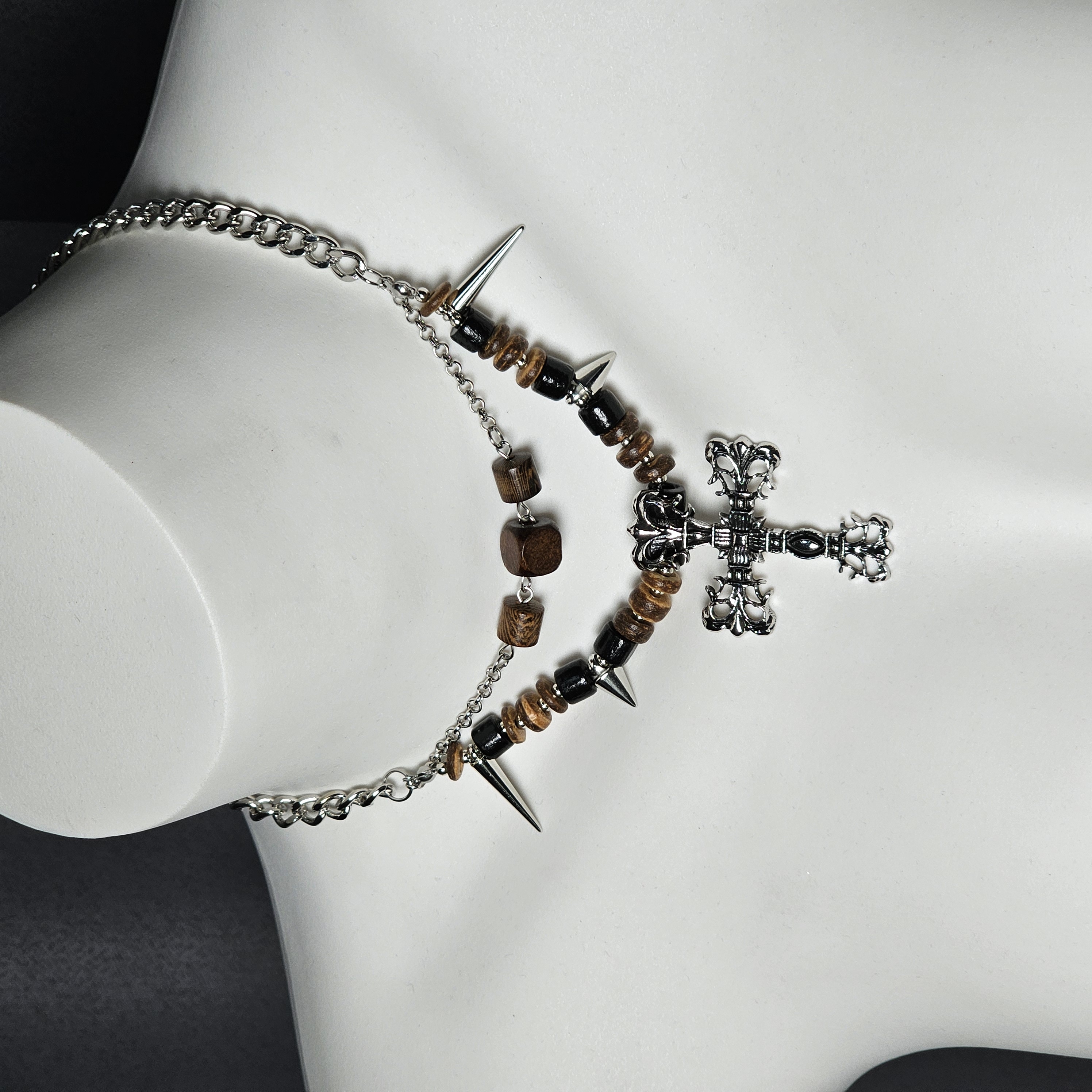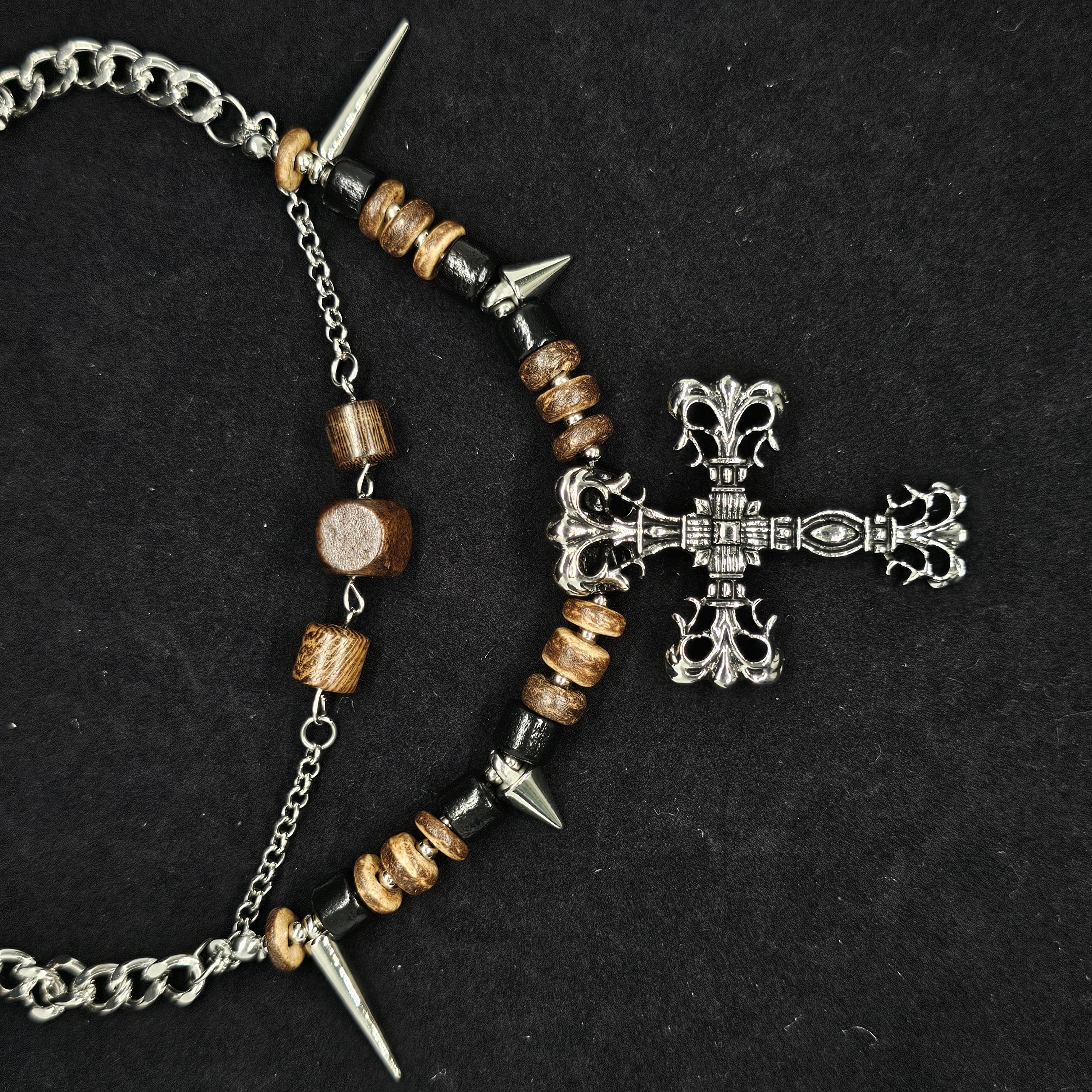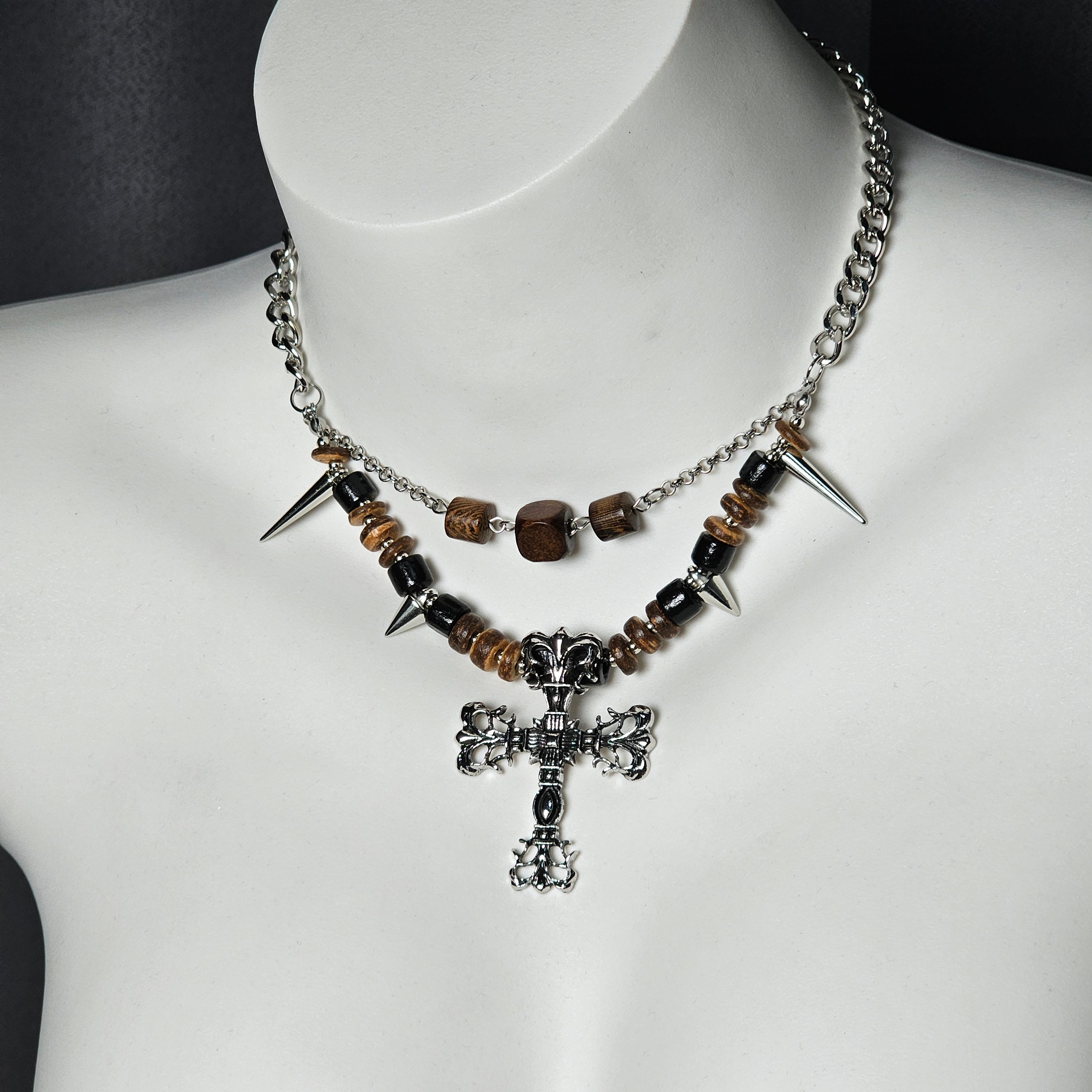 Silver moon and sun with black gemstones, wooden beads, and vintage cross create a mysterious, elegant vibe, blending retro and modern for a distinctive, refined statement creates a festive atmosphere.