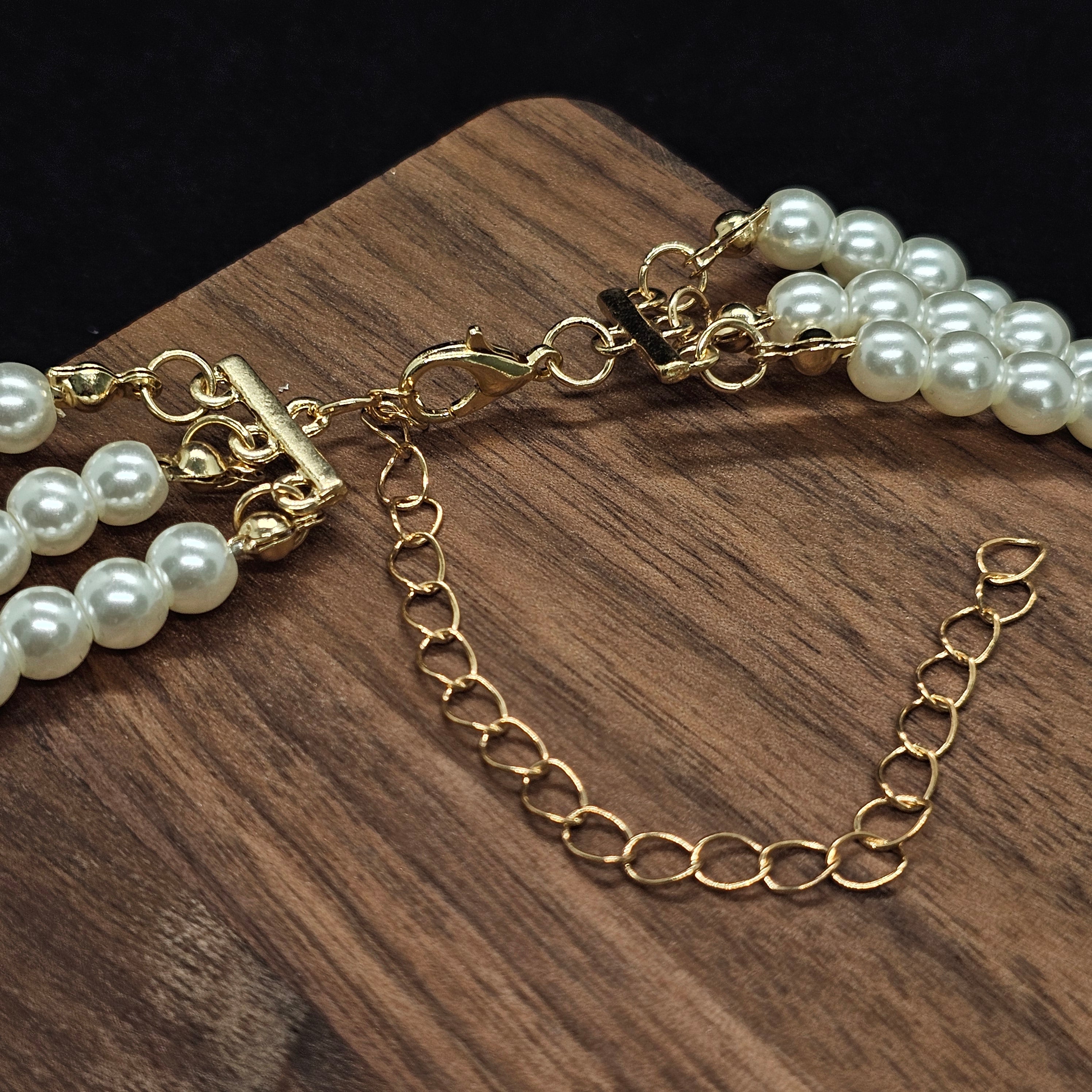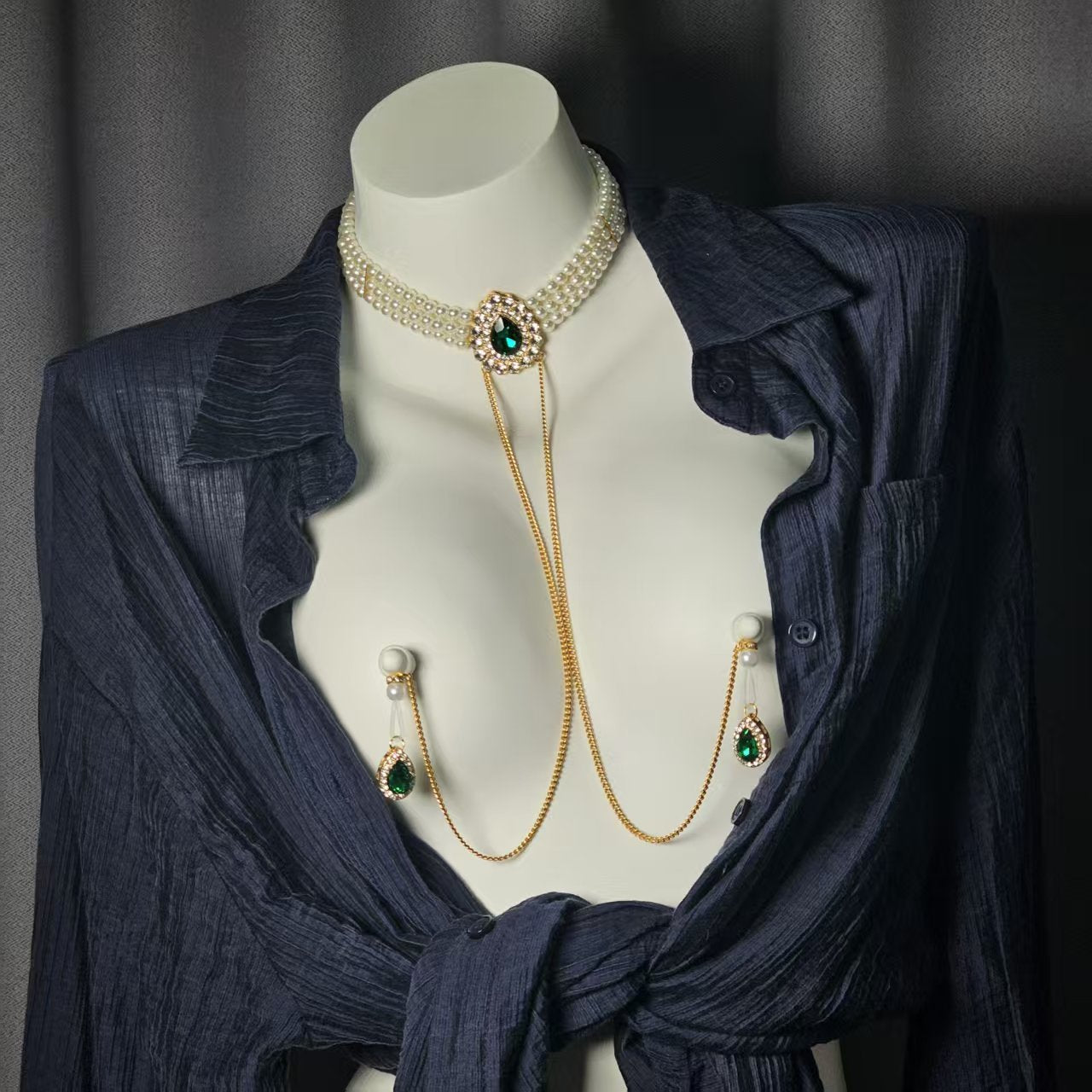Lustrous pearls meet radiant green faceted gems framed in sparkling crystals; the triple pearl chain with matching gemstone pendant embodies the perfect harmony of elegance and sophistication.