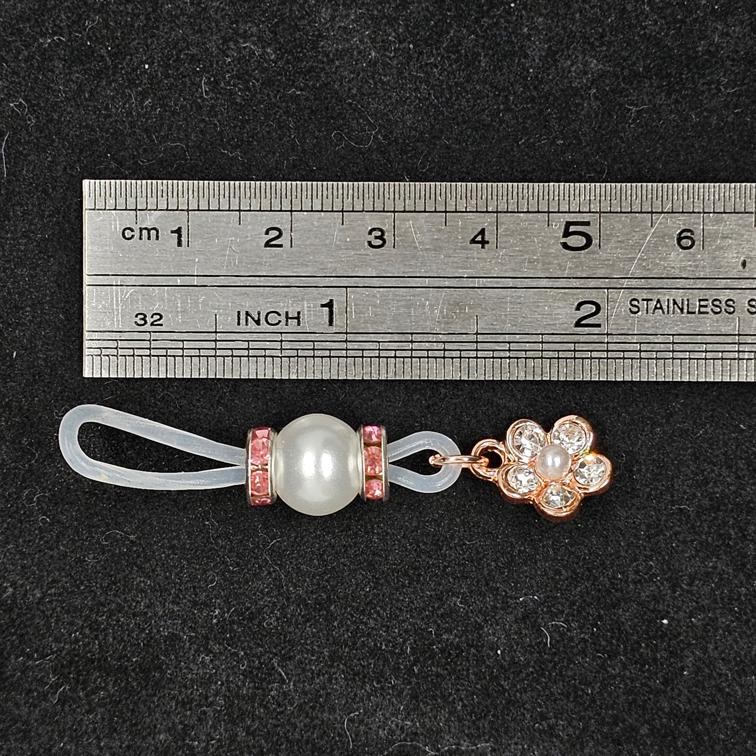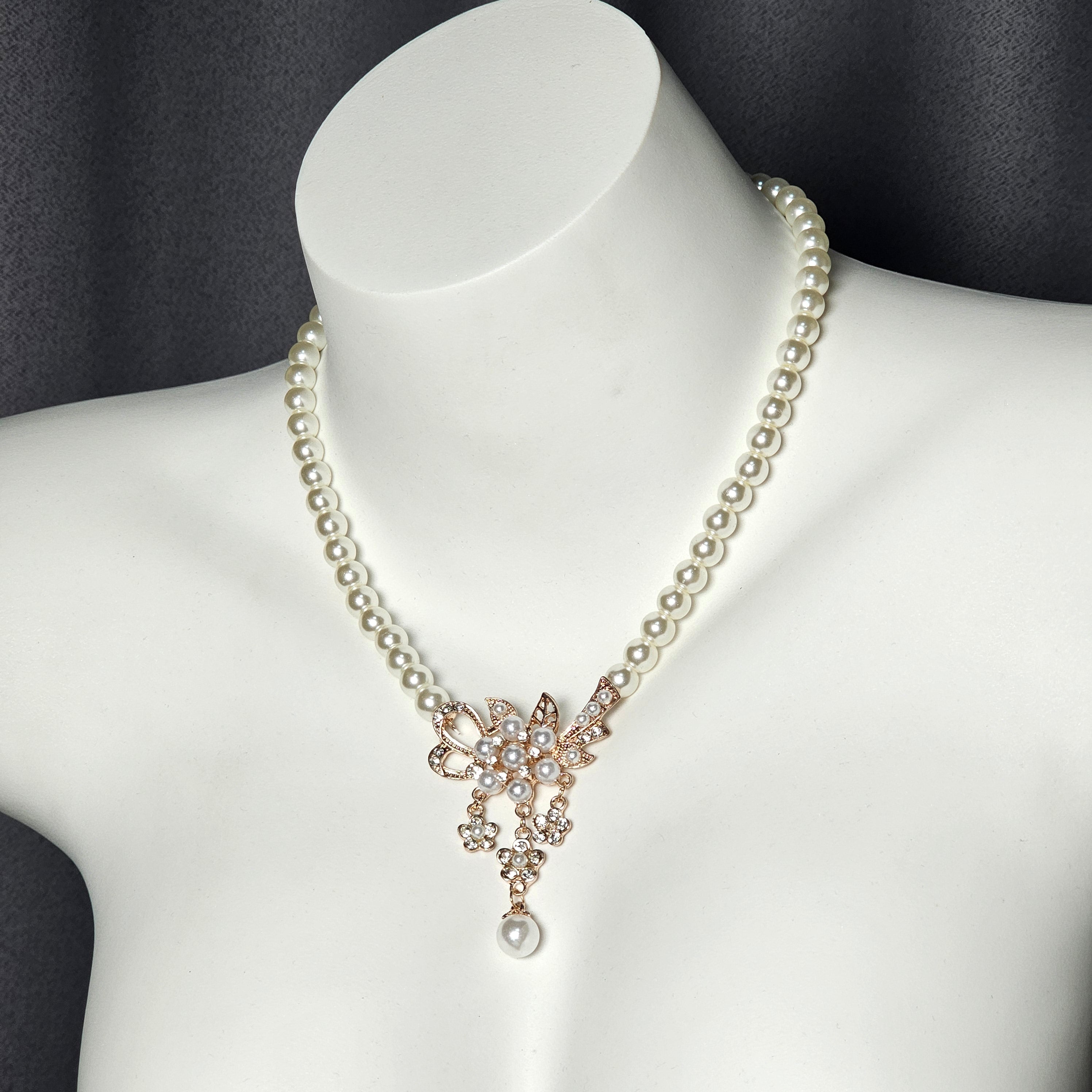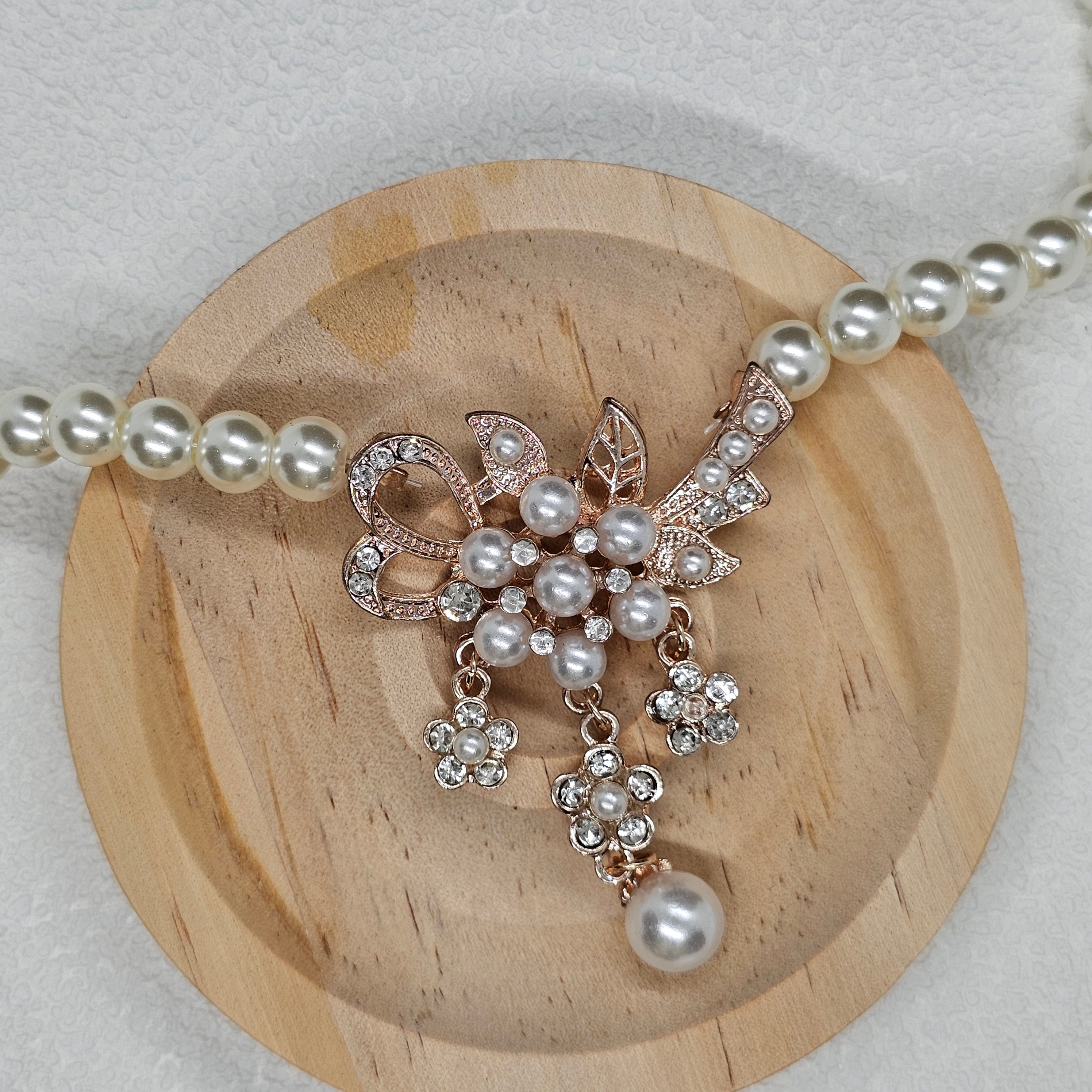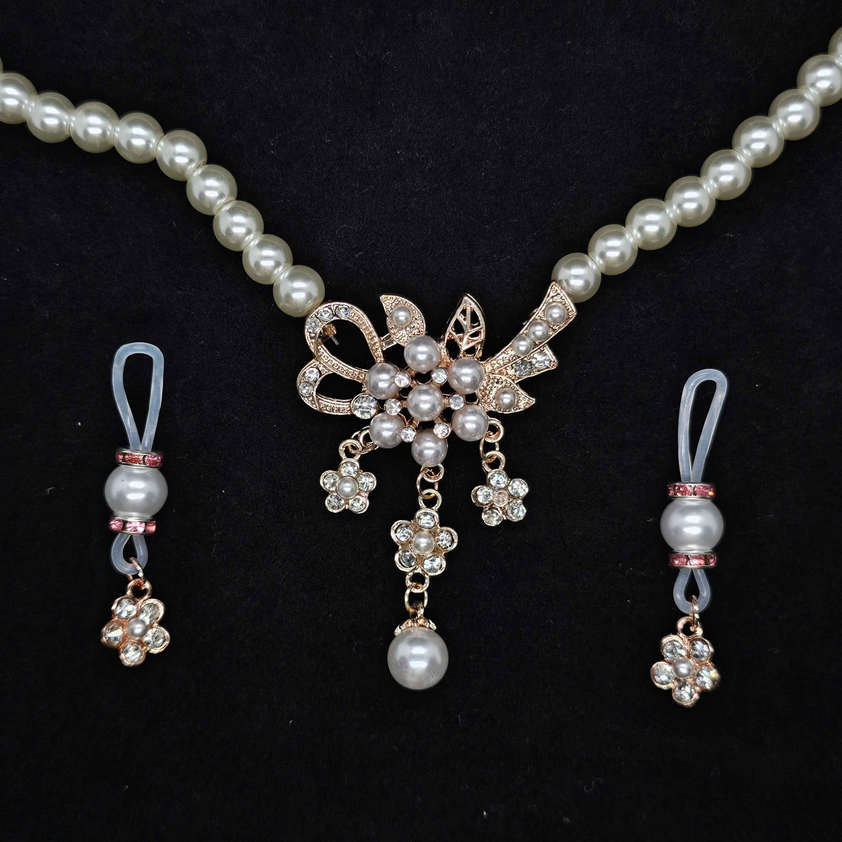 This piece features pink floral pendants and pearl beads, blending softness with refined elegance. The adjustable design and matching necklace exude a light, graceful charm.
