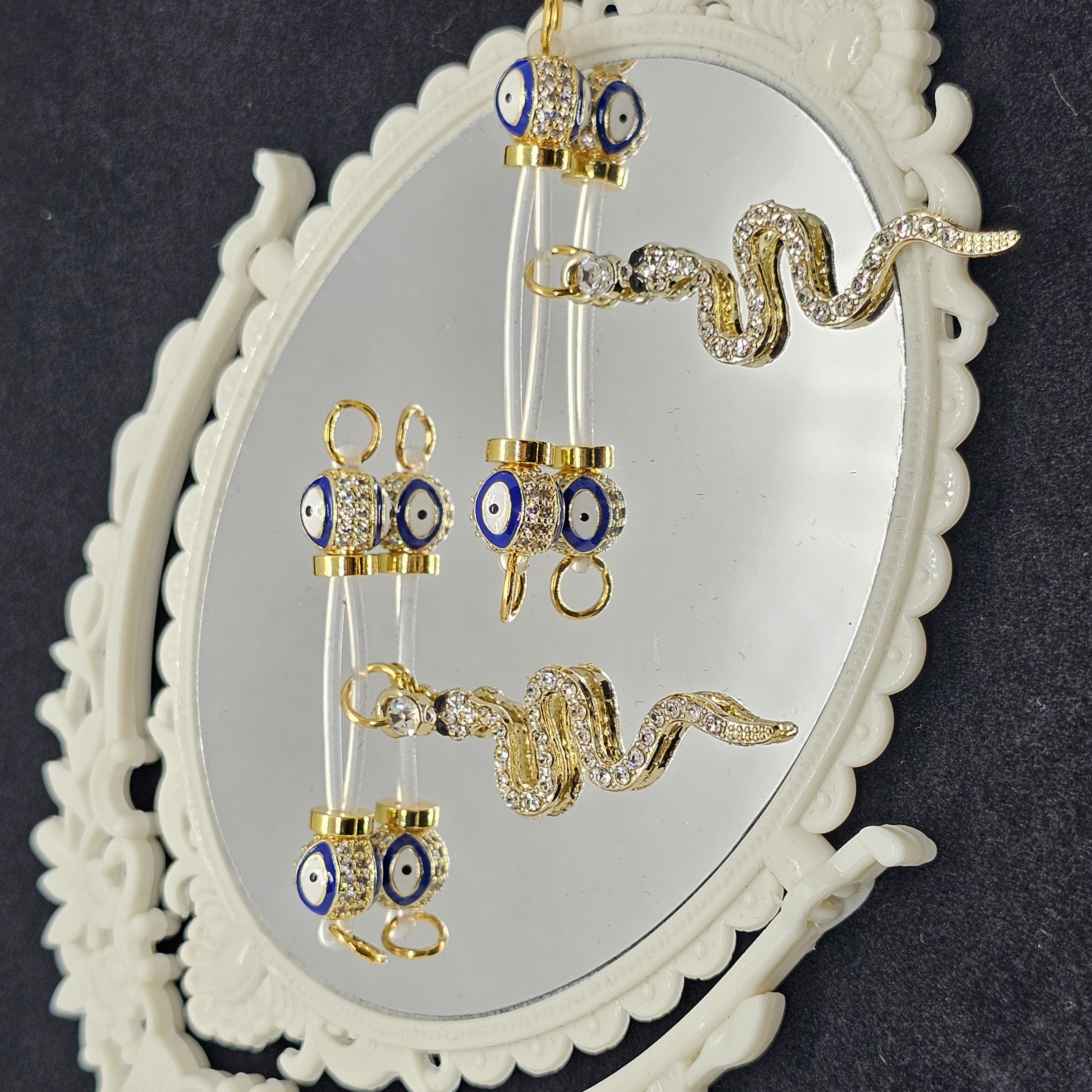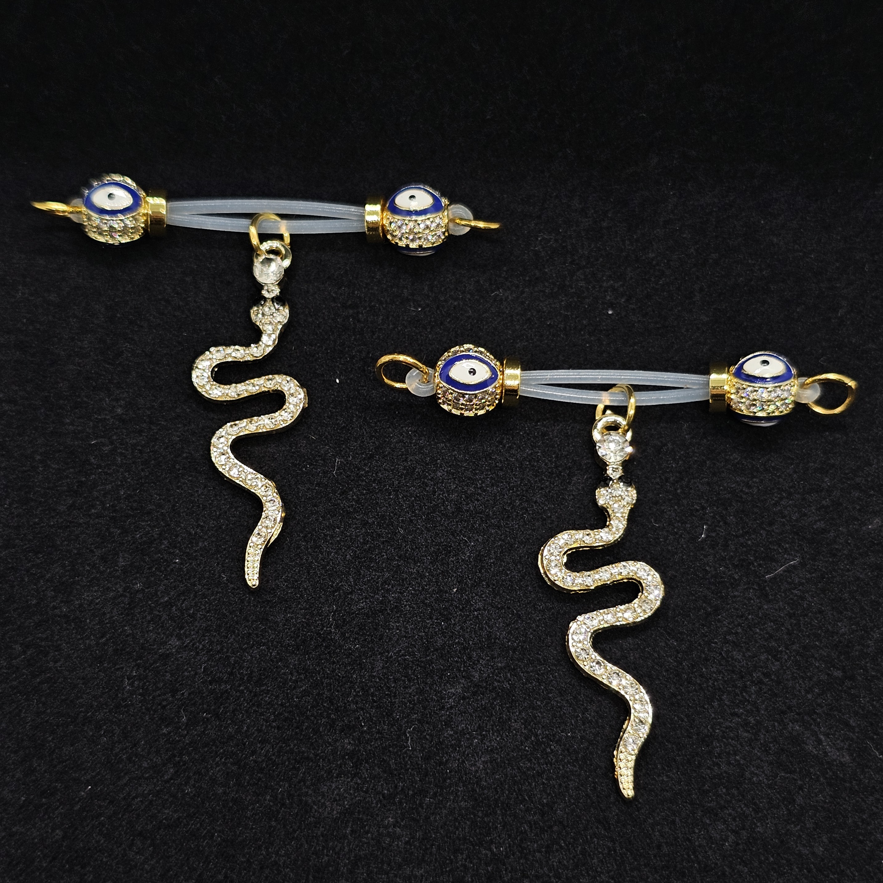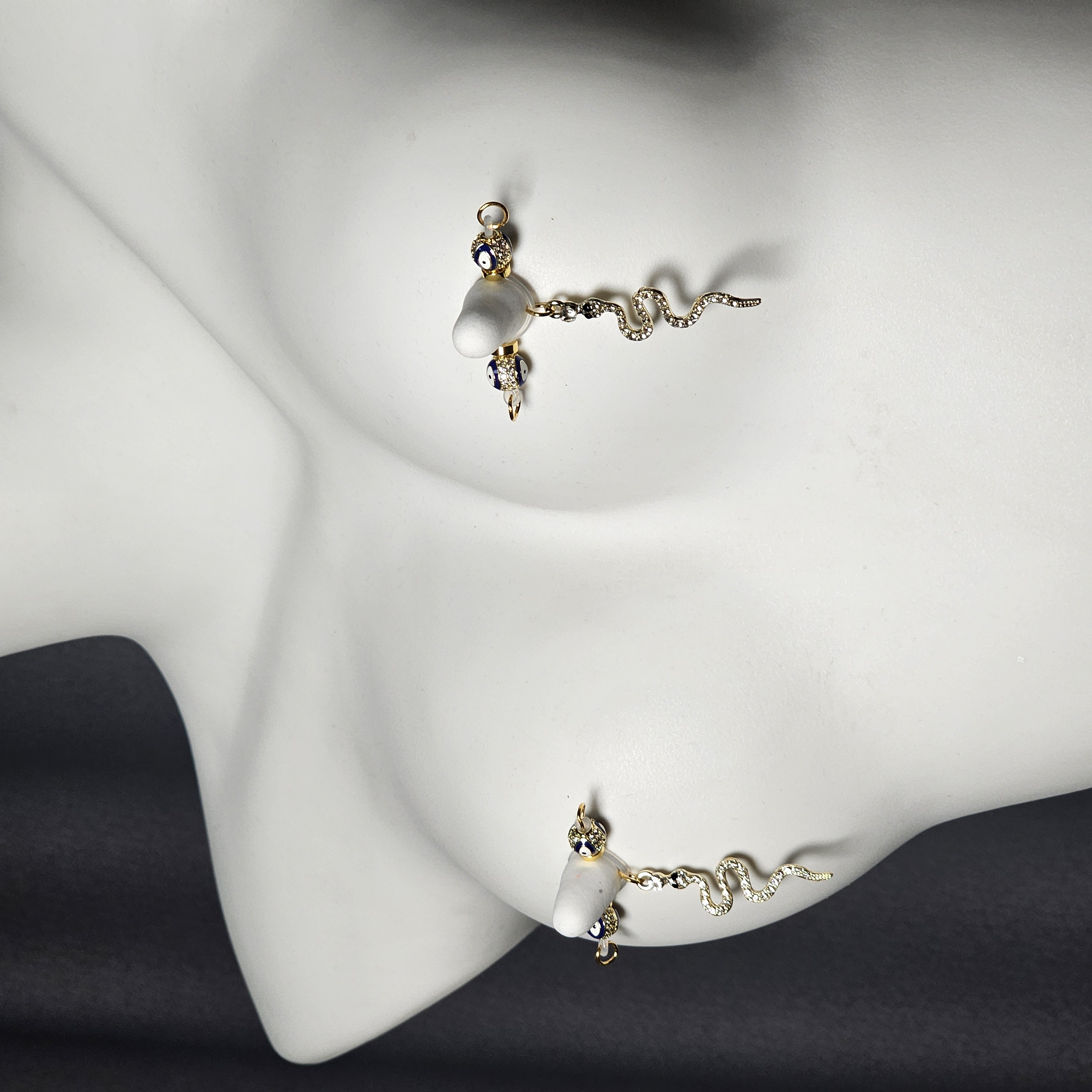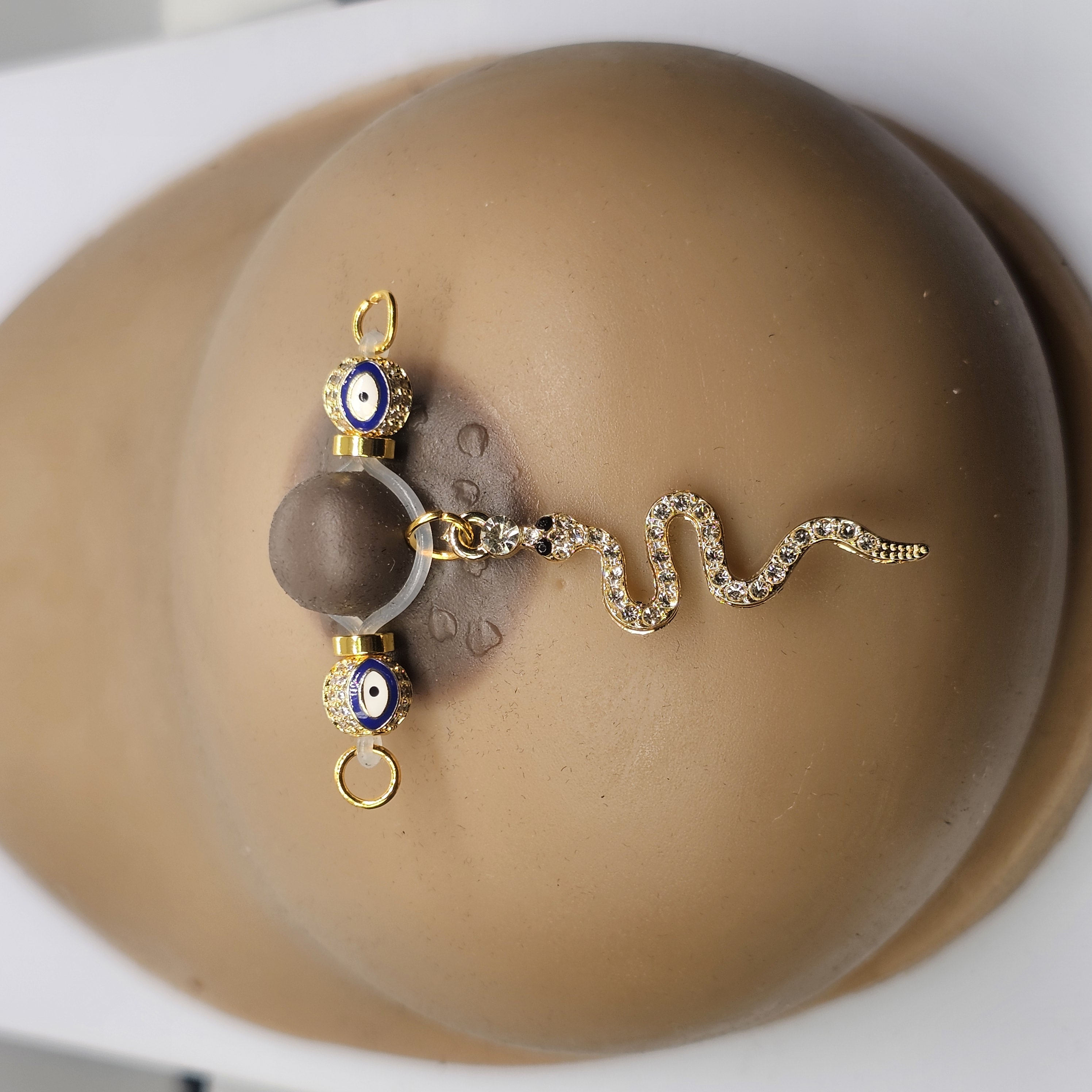 This adjustable barbell-style nipple clip features a stunning diamond-encrusted mystic eye bead, paired with a polished golden ring and an exquisite diamond-studded golden snake pendant. The combination of symbolic mysticism and refined craftsmanship creates a look that is both alluring and powerful. The smooth, high-shine metal ensures comfort during wear, while the adjustable tension offers a personalized fit for different preferences. Whether worn alone to highlight bold sensuality or paired with lingerie for a seductive statement, this piece embodies mystery, elegance, and confidence. A perfect choice for those who appreciate luxurious and daring designs.