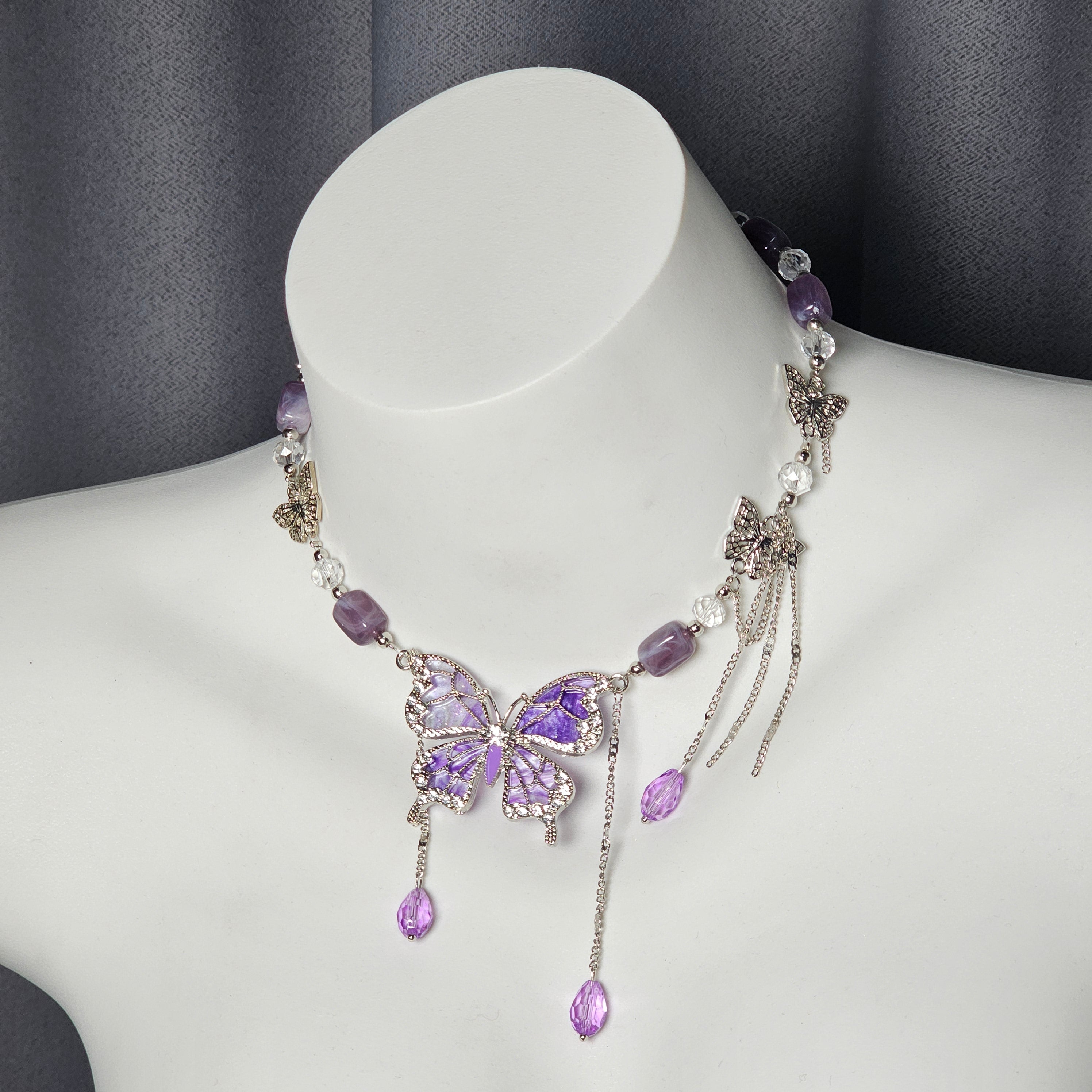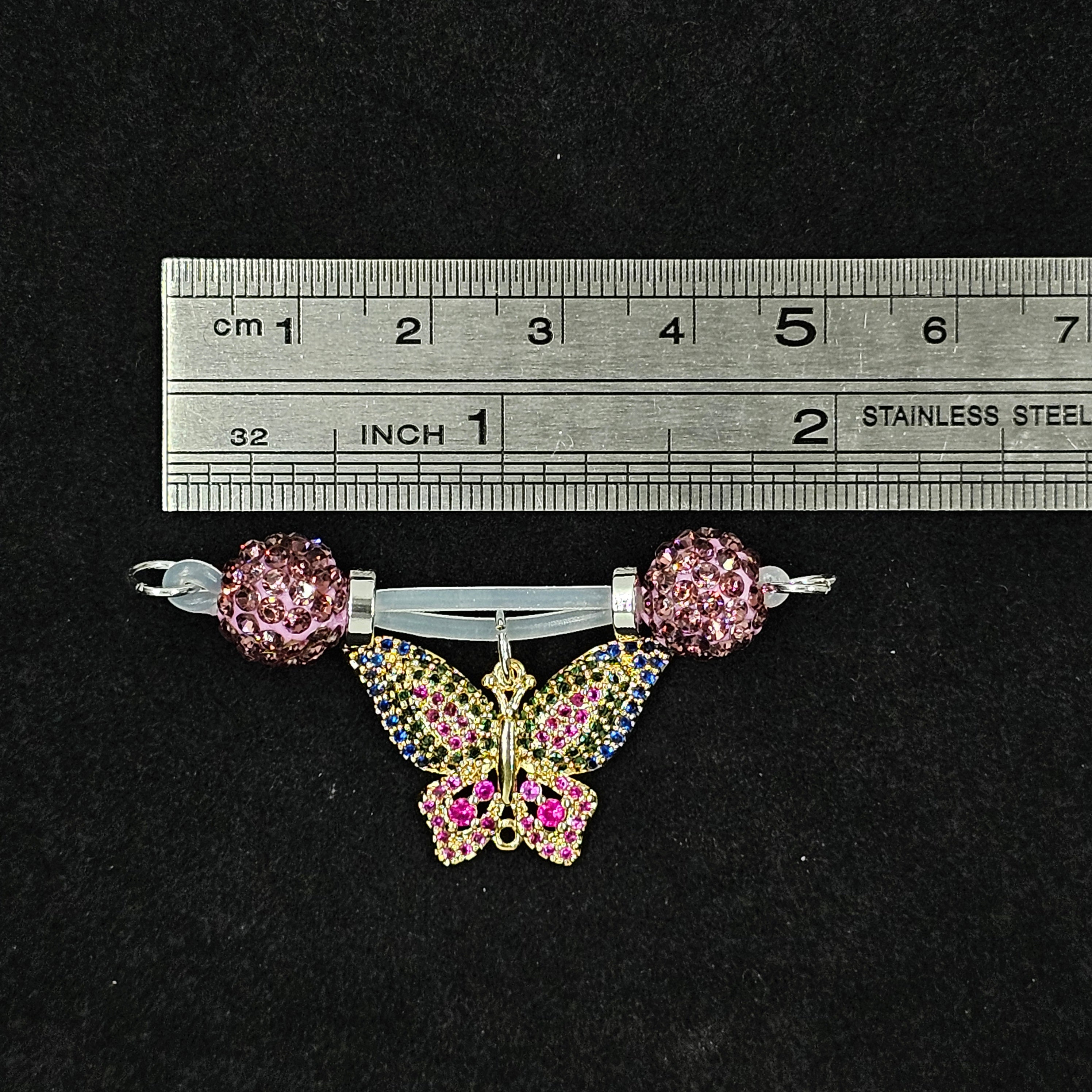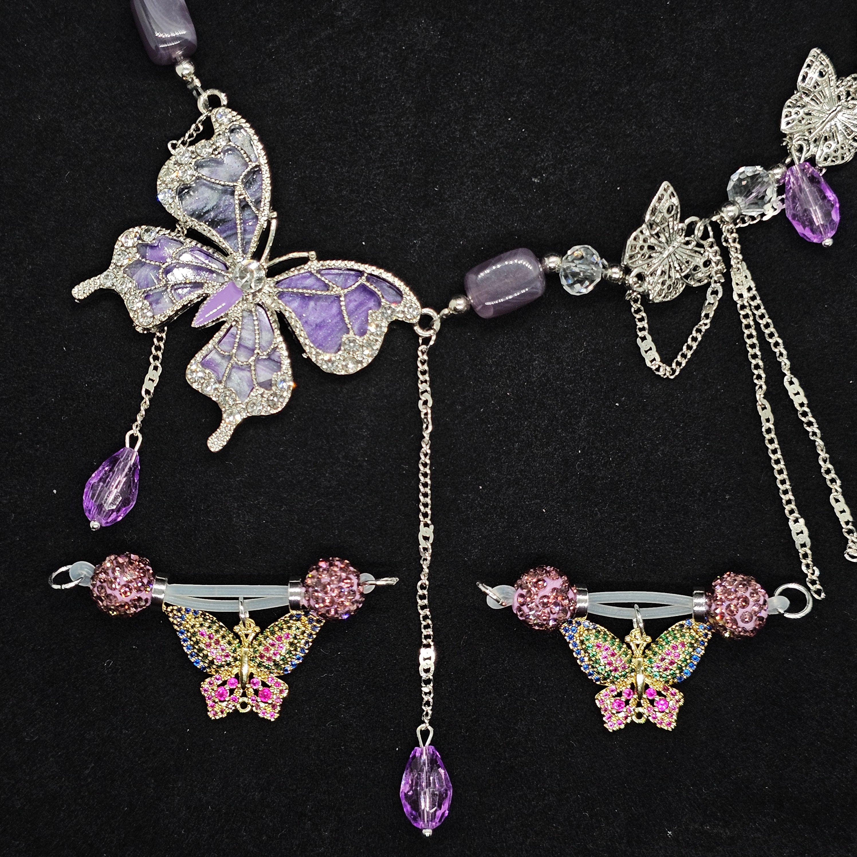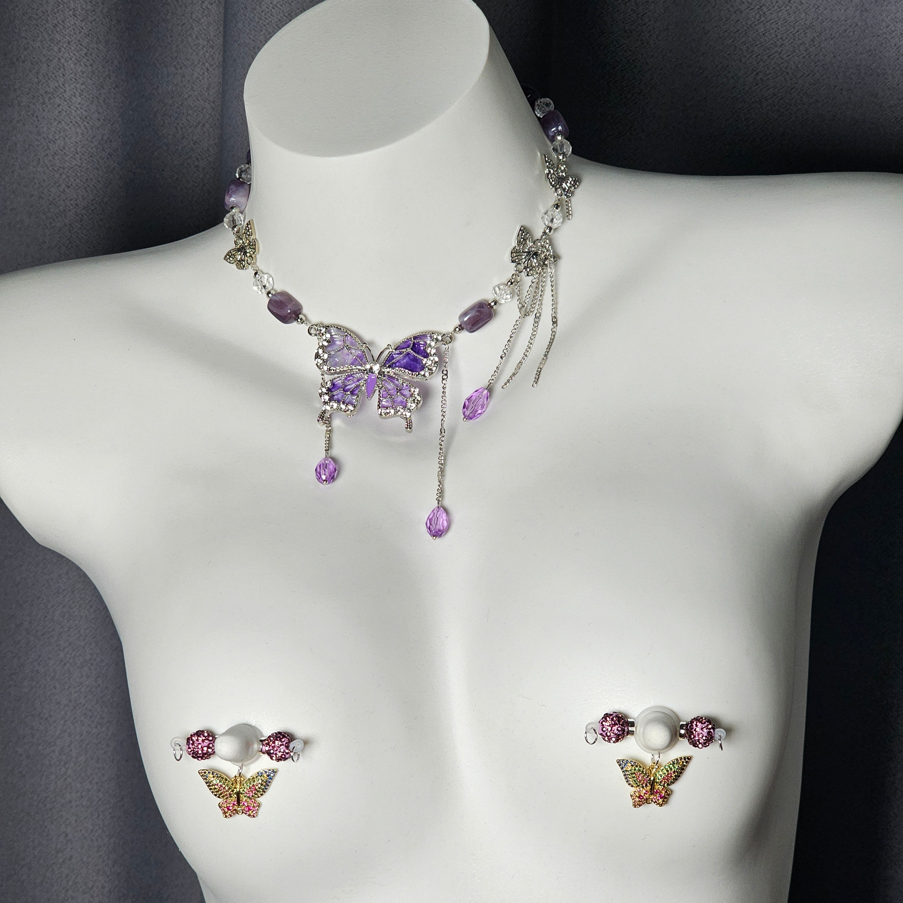 The nipple clip features pink rhinestone beads with a colorful butterfly pendant, adjustable barbell design for comfort and secure fit. The necklace showcases a silver chain with a purple crystal butterfly pendant, elegantly sparkling. Minimalist yet luxurious, both pieces blend fashion and refined details, making them ideal for expressing personal style and sophisticated taste.