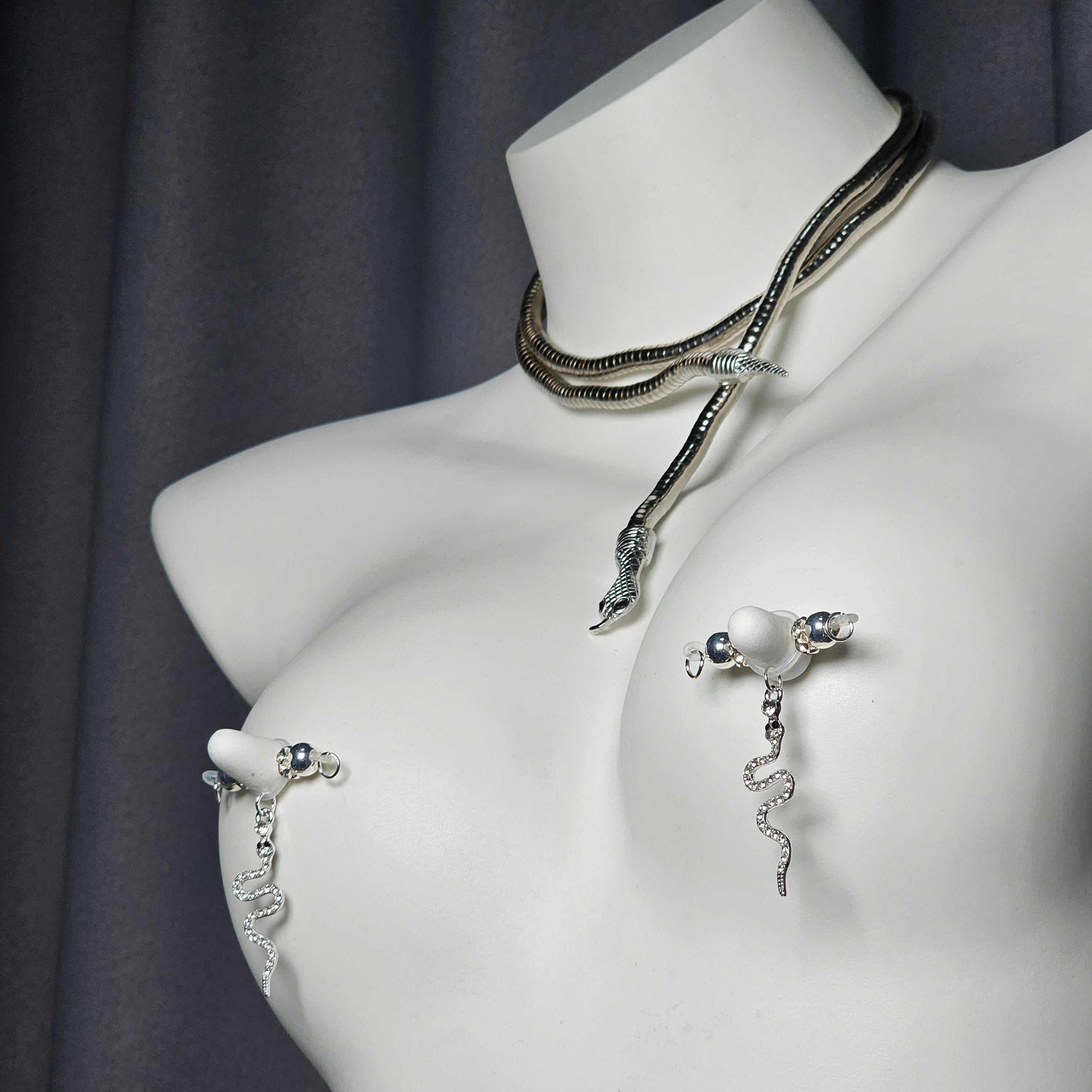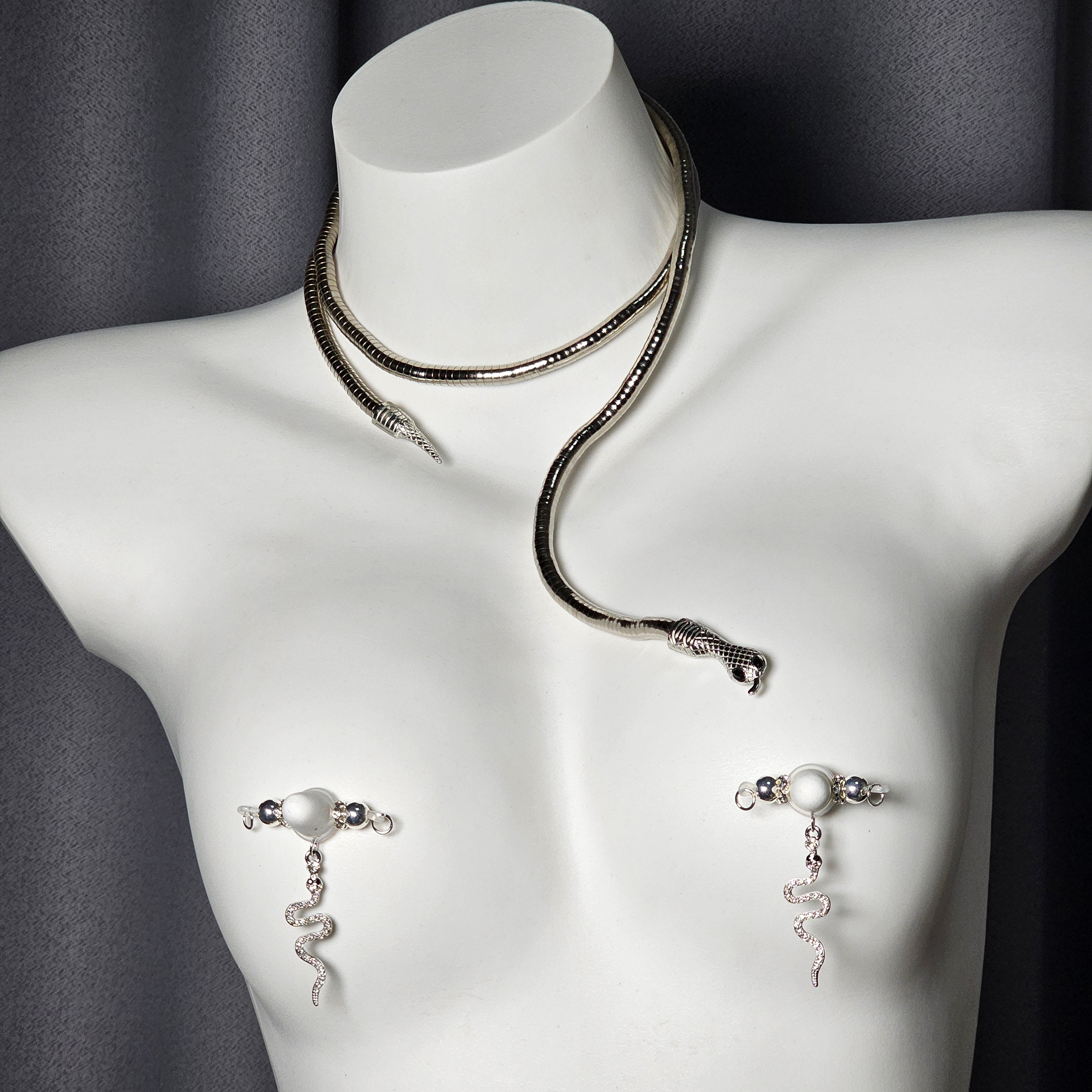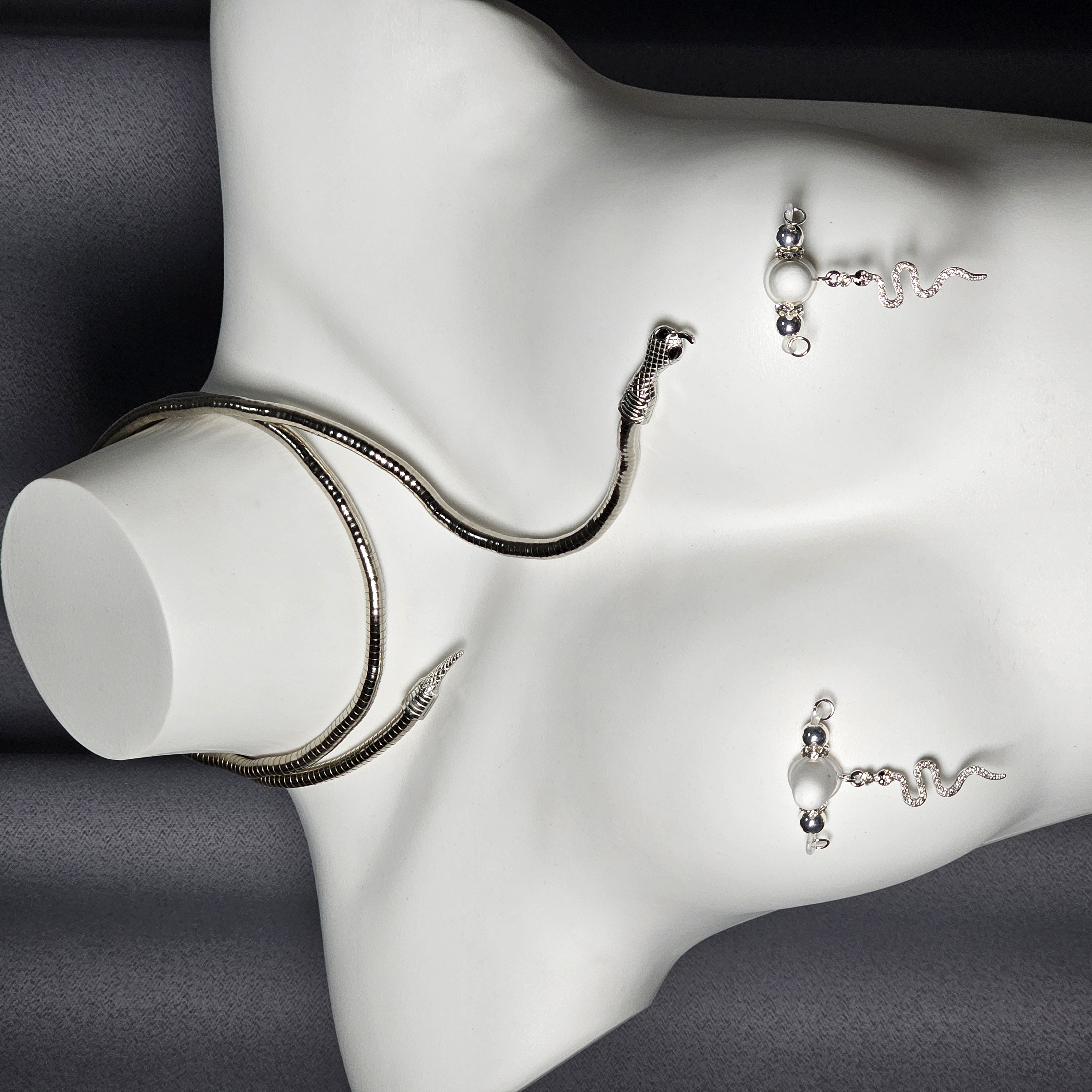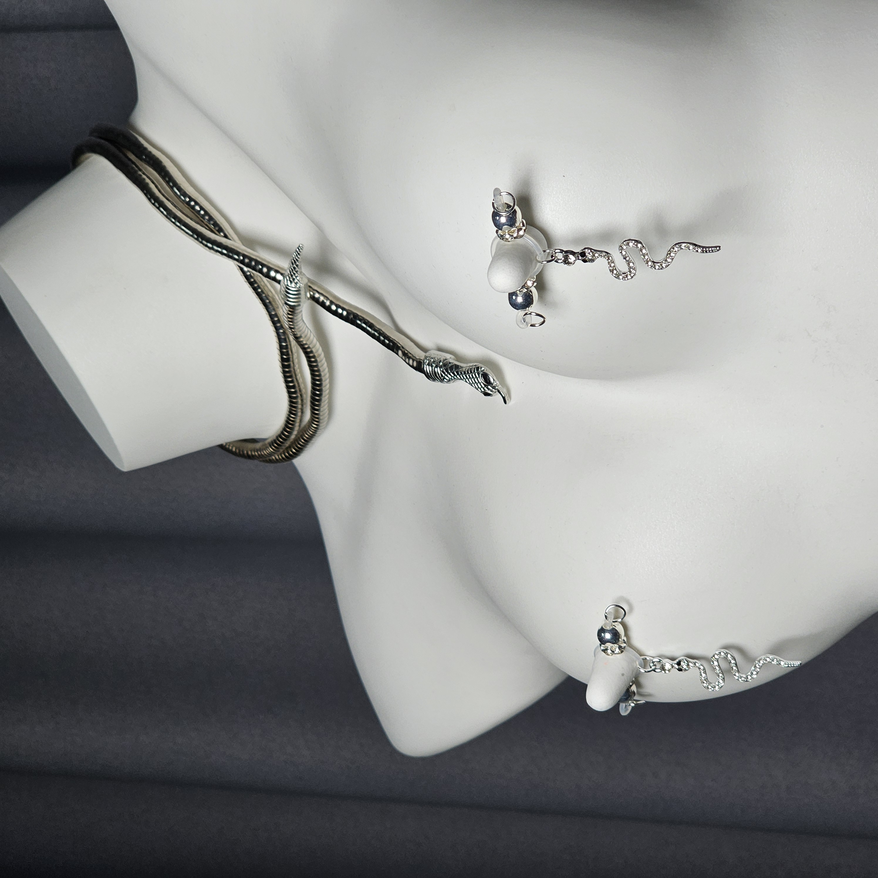 A striking silver ensemble featuring a serpentine ring chain, silver beads, and a serpent pendant—designed to serve elegantly as both a nipple clamp and a necklace.
