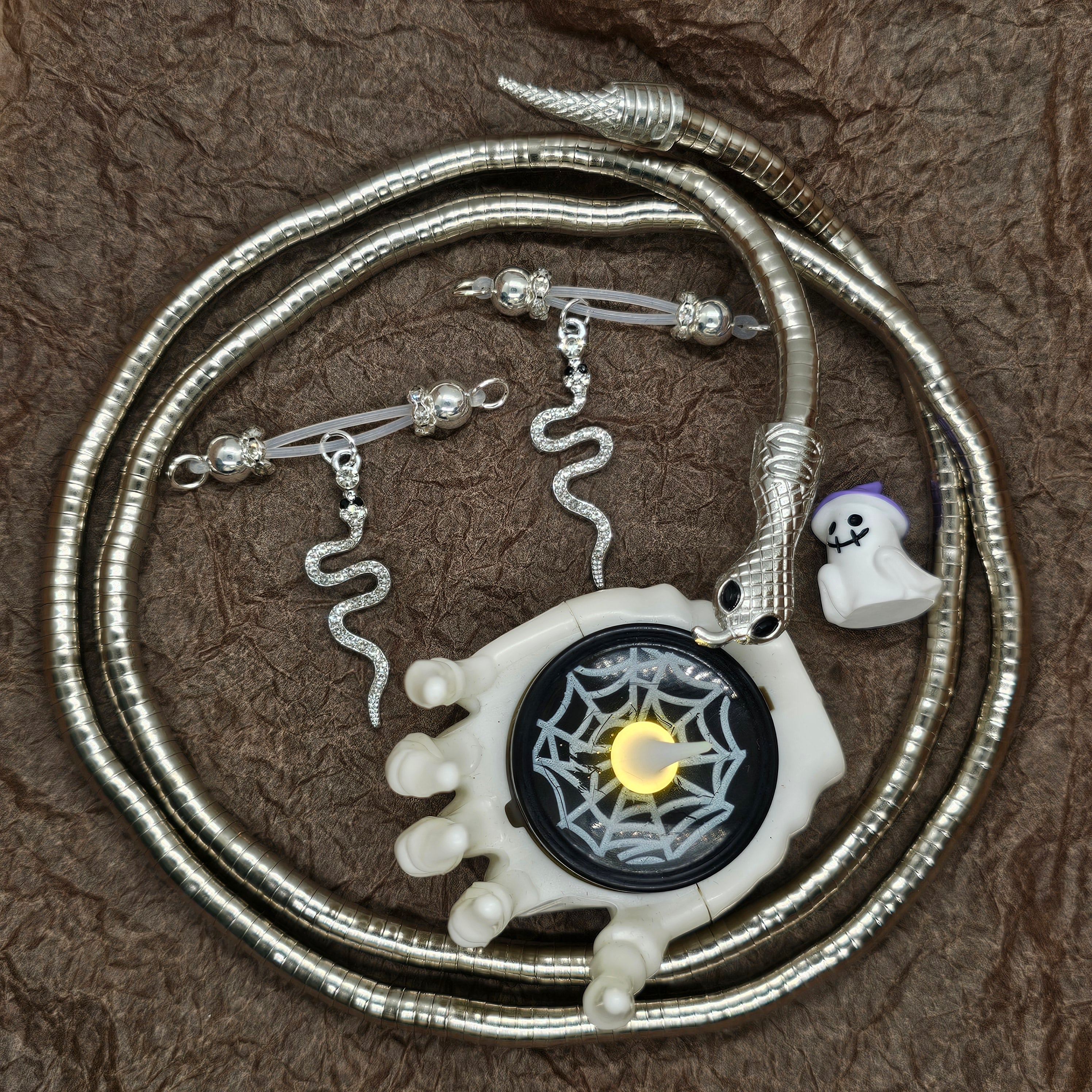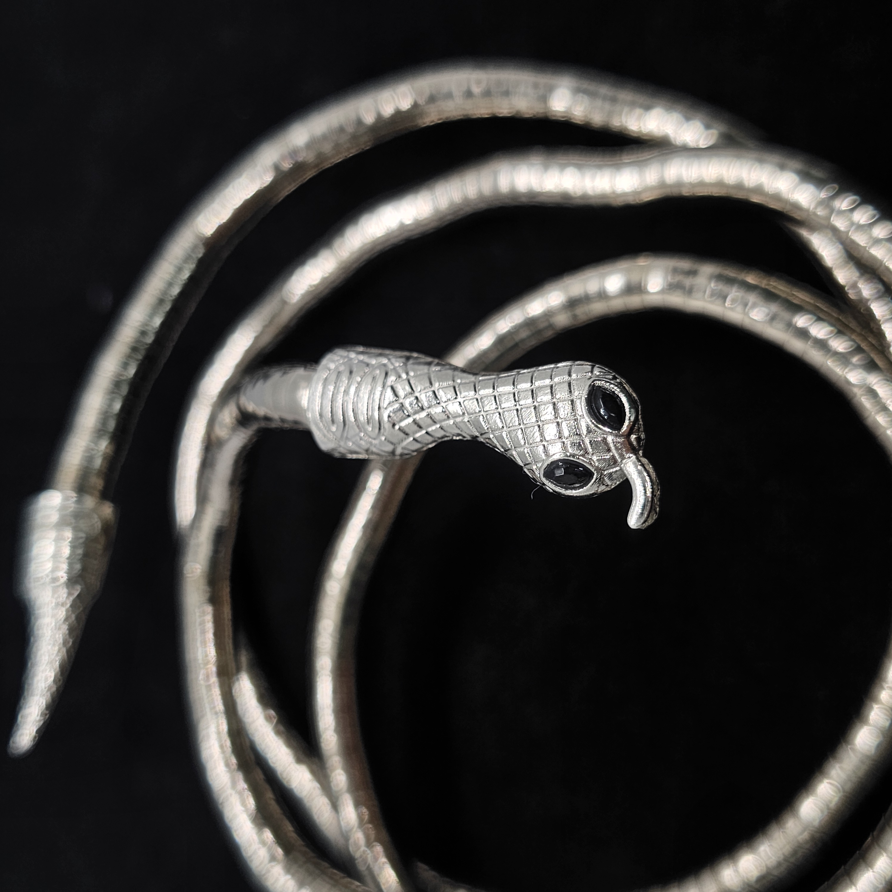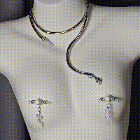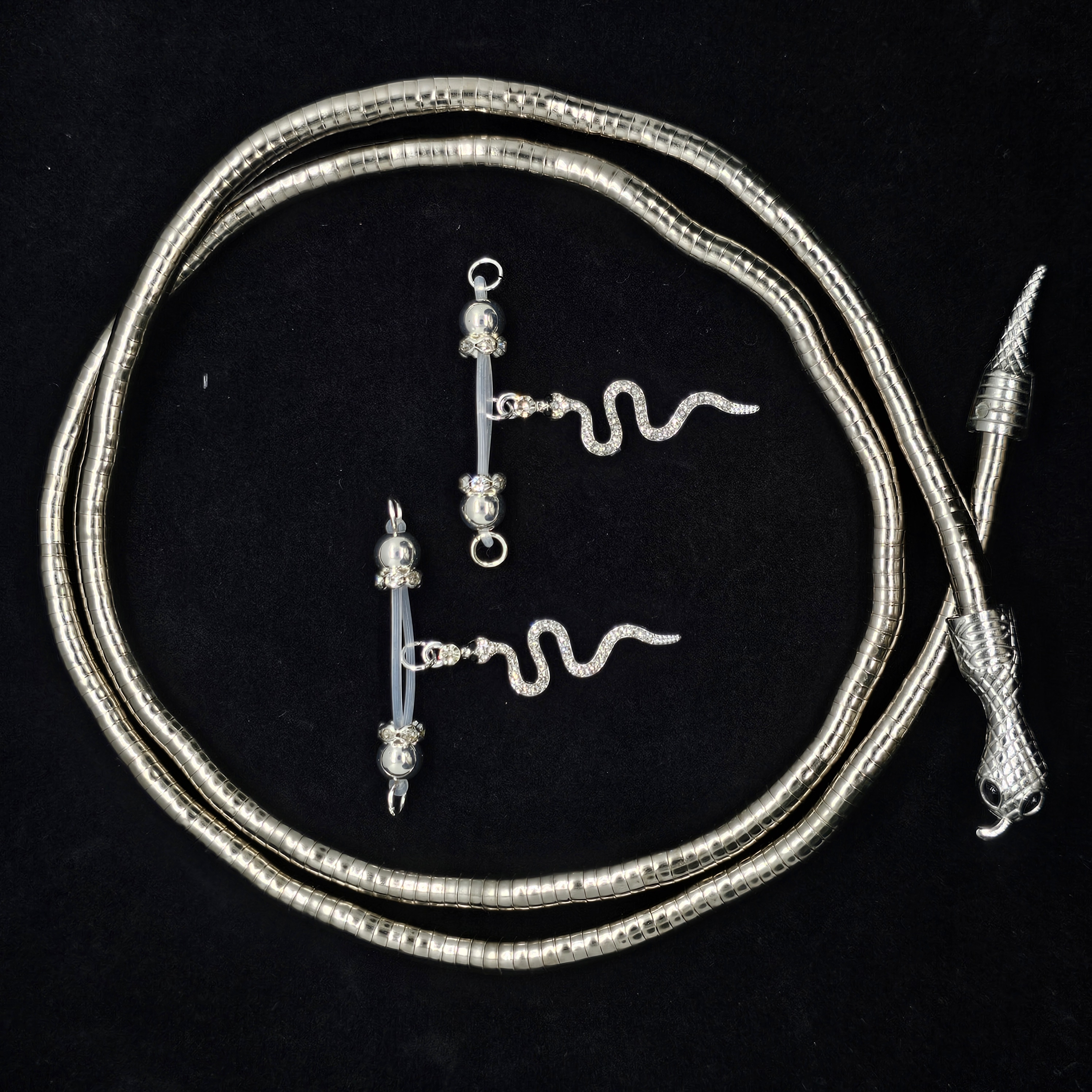 A striking silver ensemble featuring a serpentine ring chain, silver beads, and a serpent pendant—designed to serve elegantly as both a nipple clamp and a necklace.