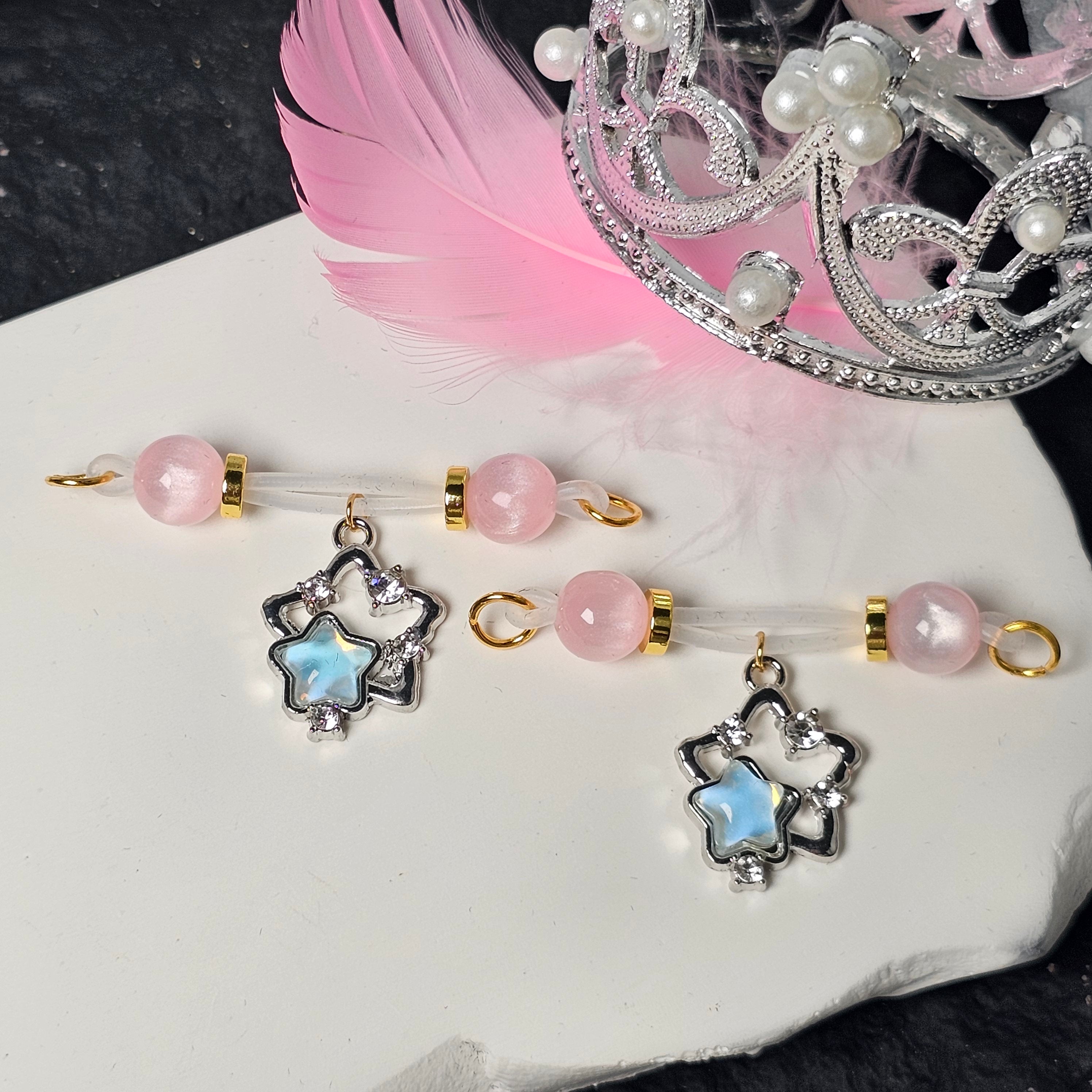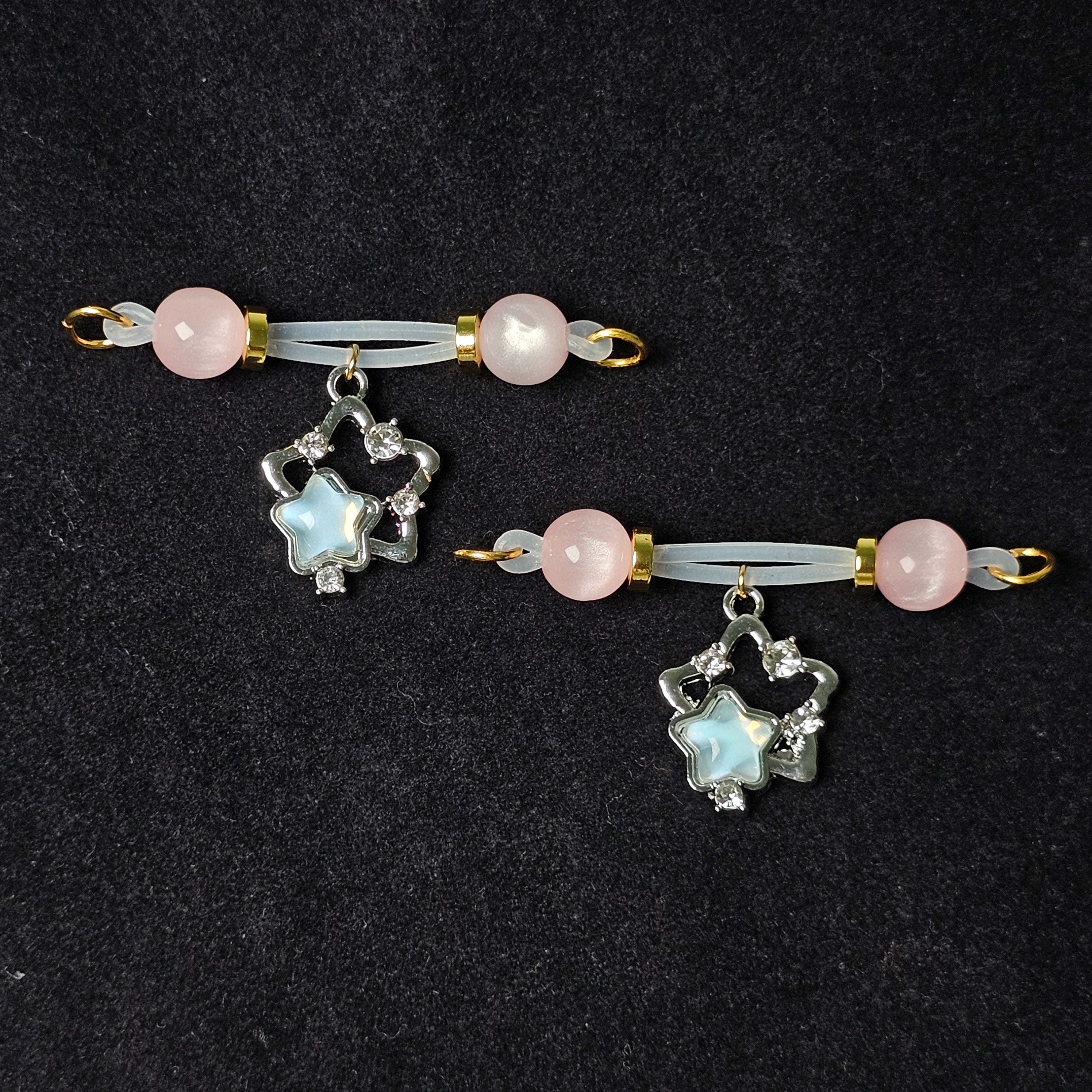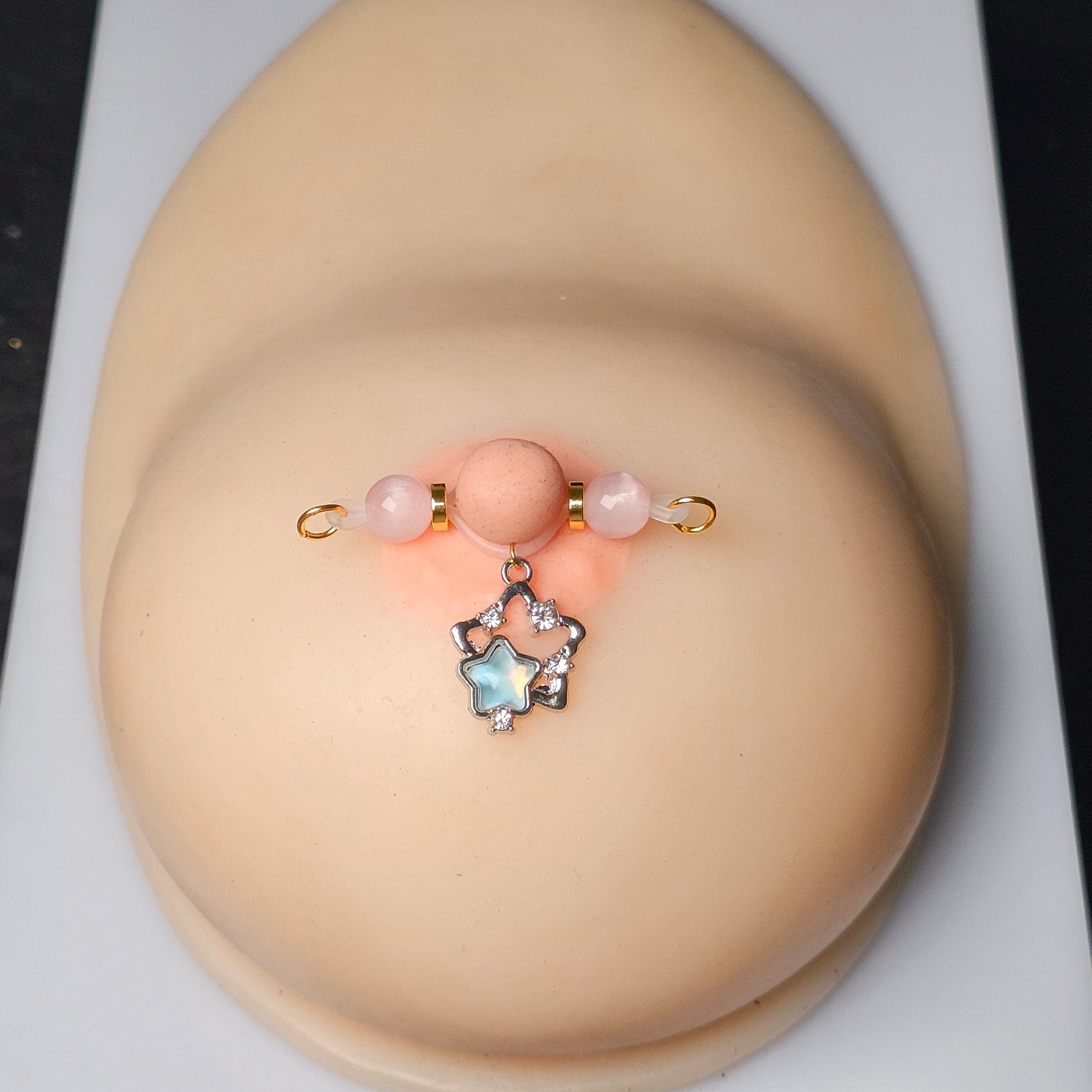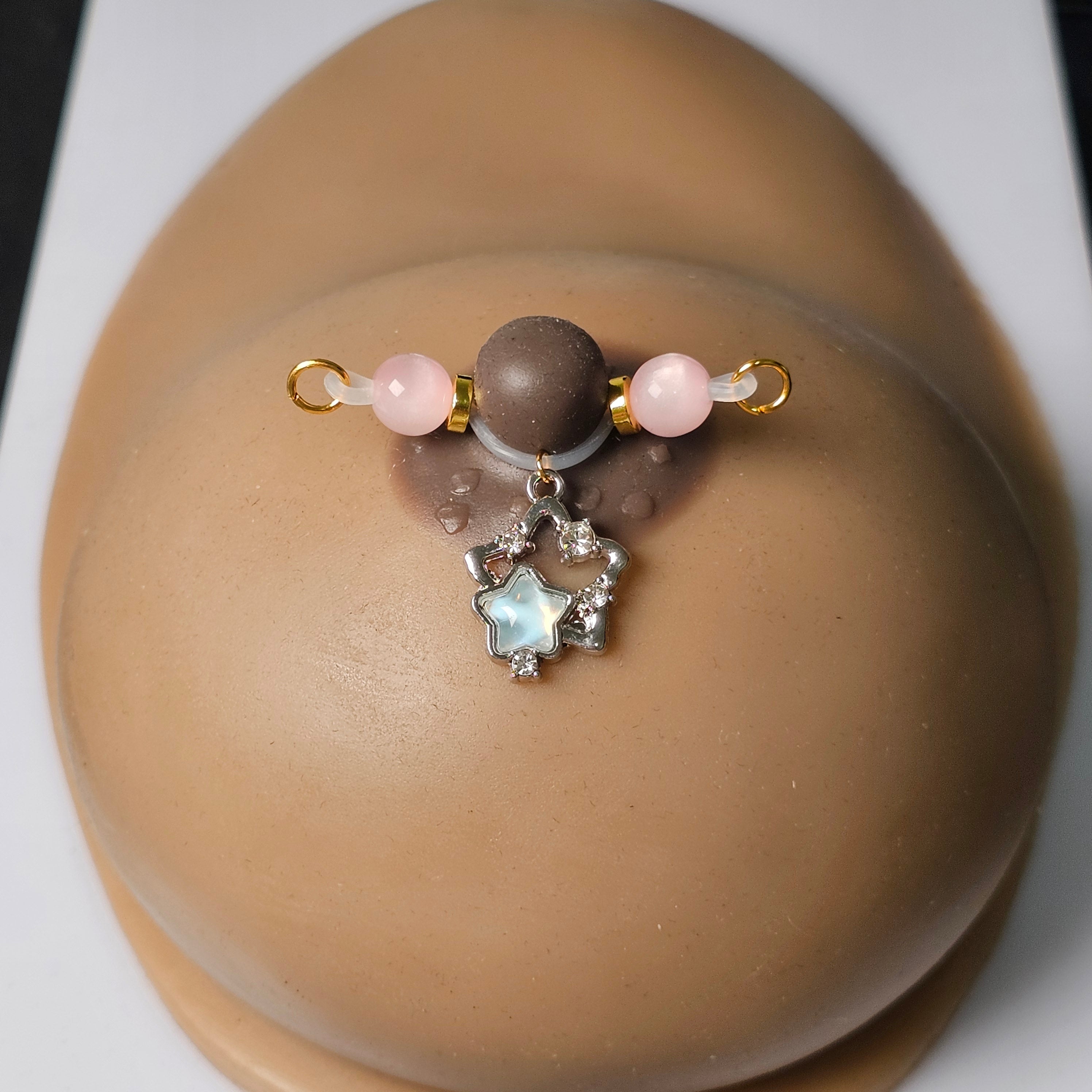 This barbell-style adjustable nipple clamp embodies femininity and elegance. Polished pale pink gemstone beads, framed by a delicate five-petal flower design and accented with a light blue gemstone pendant, add a tranquil and sophisticated touch. The sturdy barbell construction ensures durability, while the adjustable design provides a comfortable and secure fit. The smooth beads gently conform to the skin, creating a harmonious balance of style and sensuality. Perfect for those who appreciate understated luxury and feminine allure, this piece is more than just an accessory; it's a statement of confidence, romance, and allure.