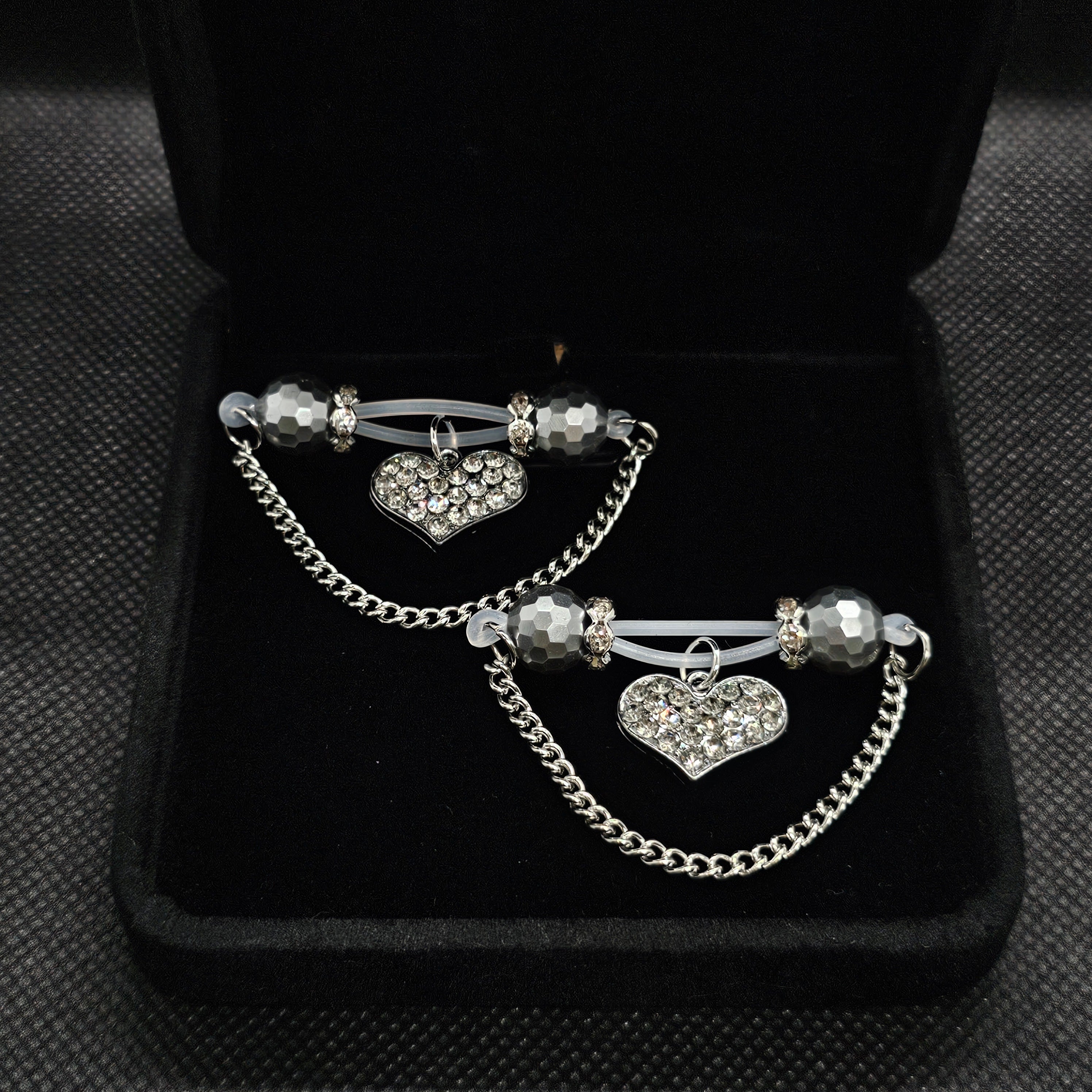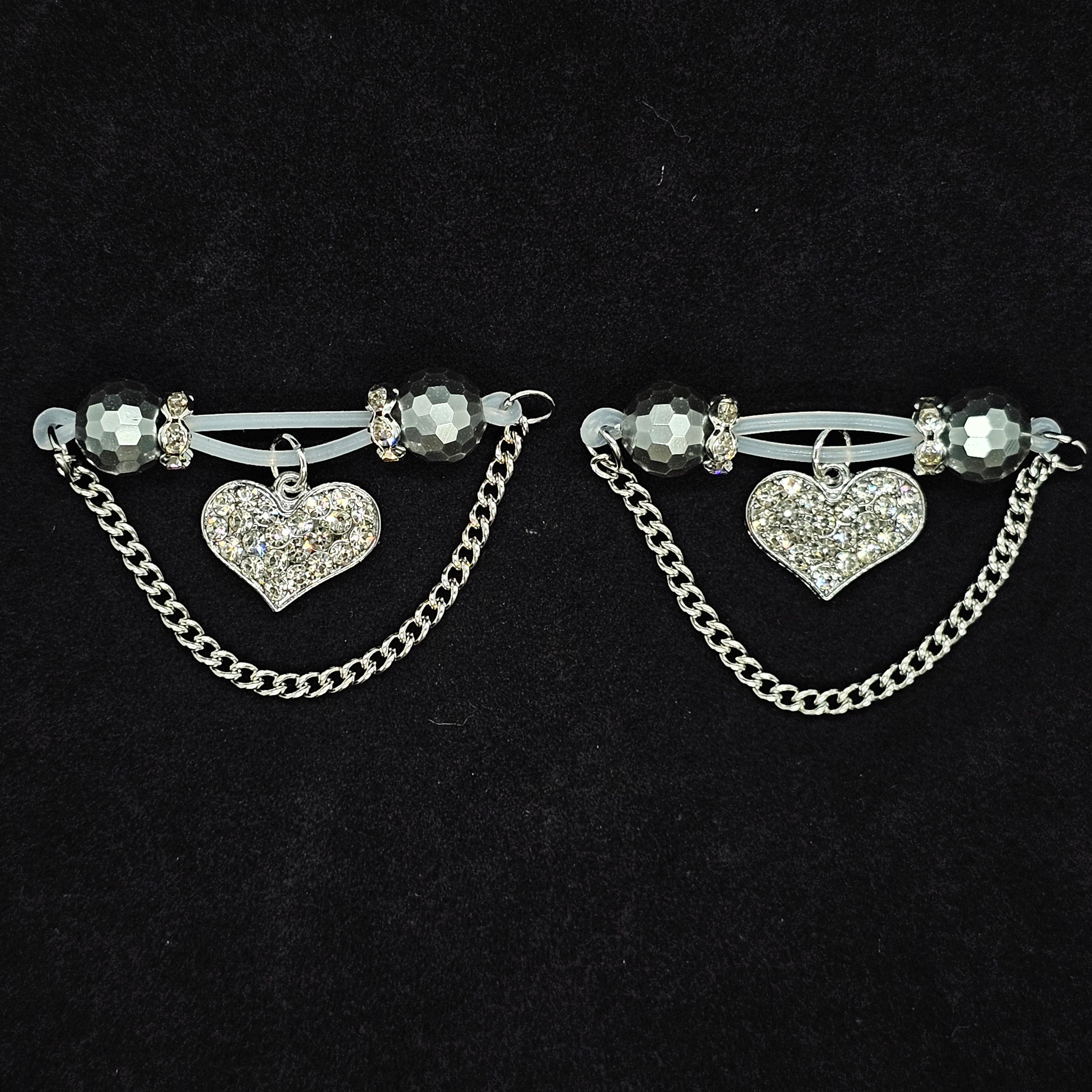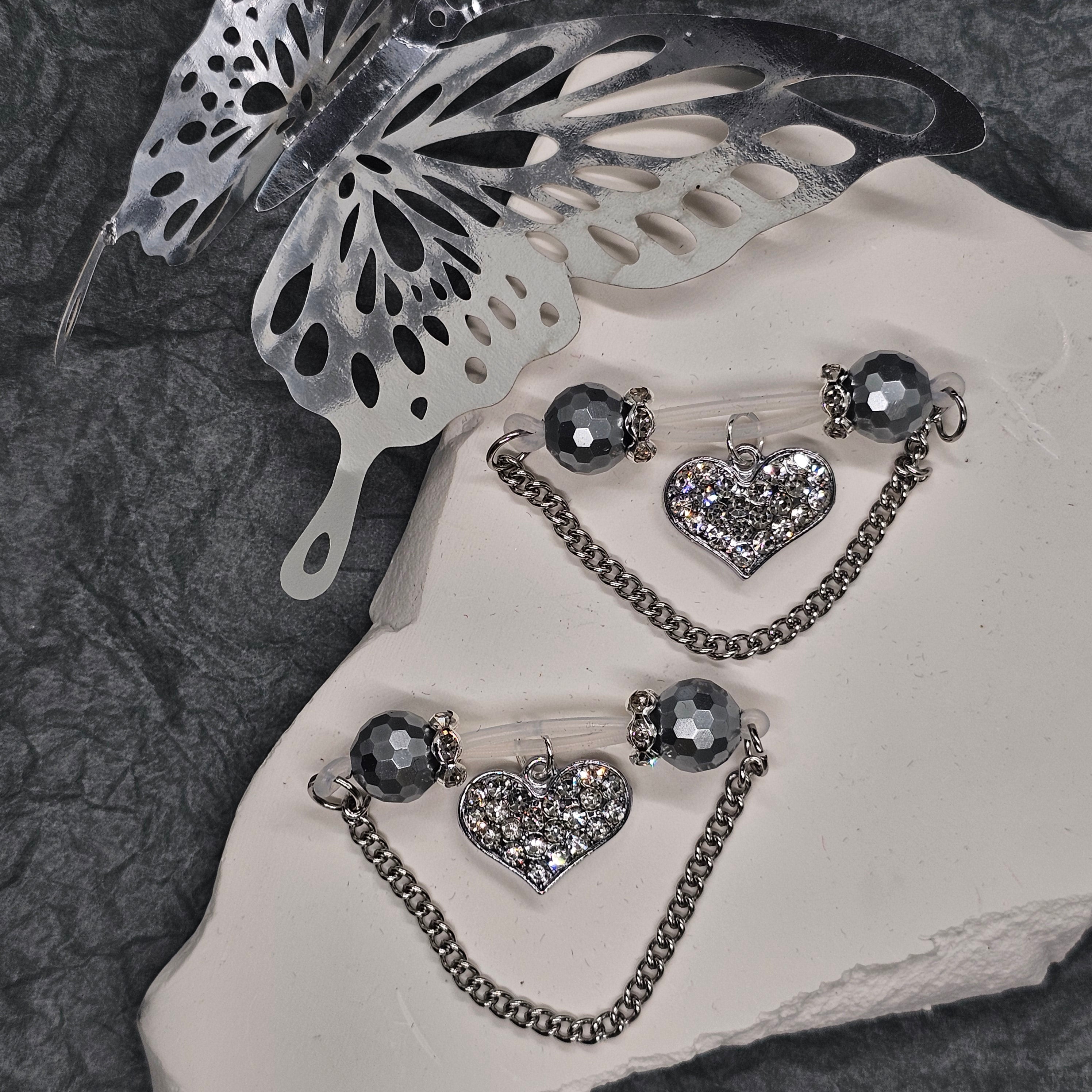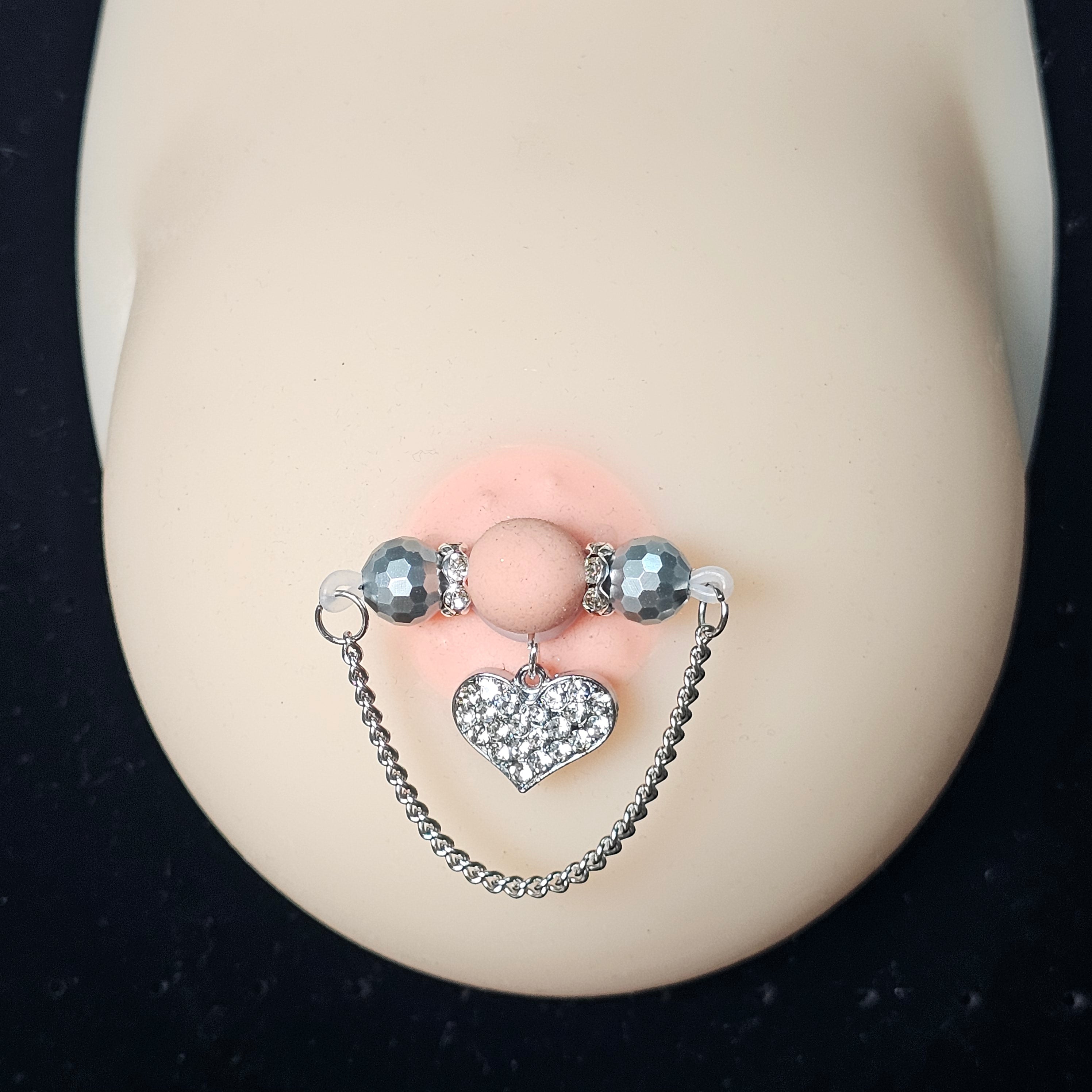 This barbell-style adjustable nipple clamp combines silver faceted beads, a delicate silver chain, and a diamond-encrusted heart pendant for a look of refined allure. The polished metallic sheen contrasts beautifully with the brilliance of the stones, creating understated elegance. Designed for both comfort and stability, it offers a customizable fit. A perfect blend of confidence, sophistication, and sensual grace.