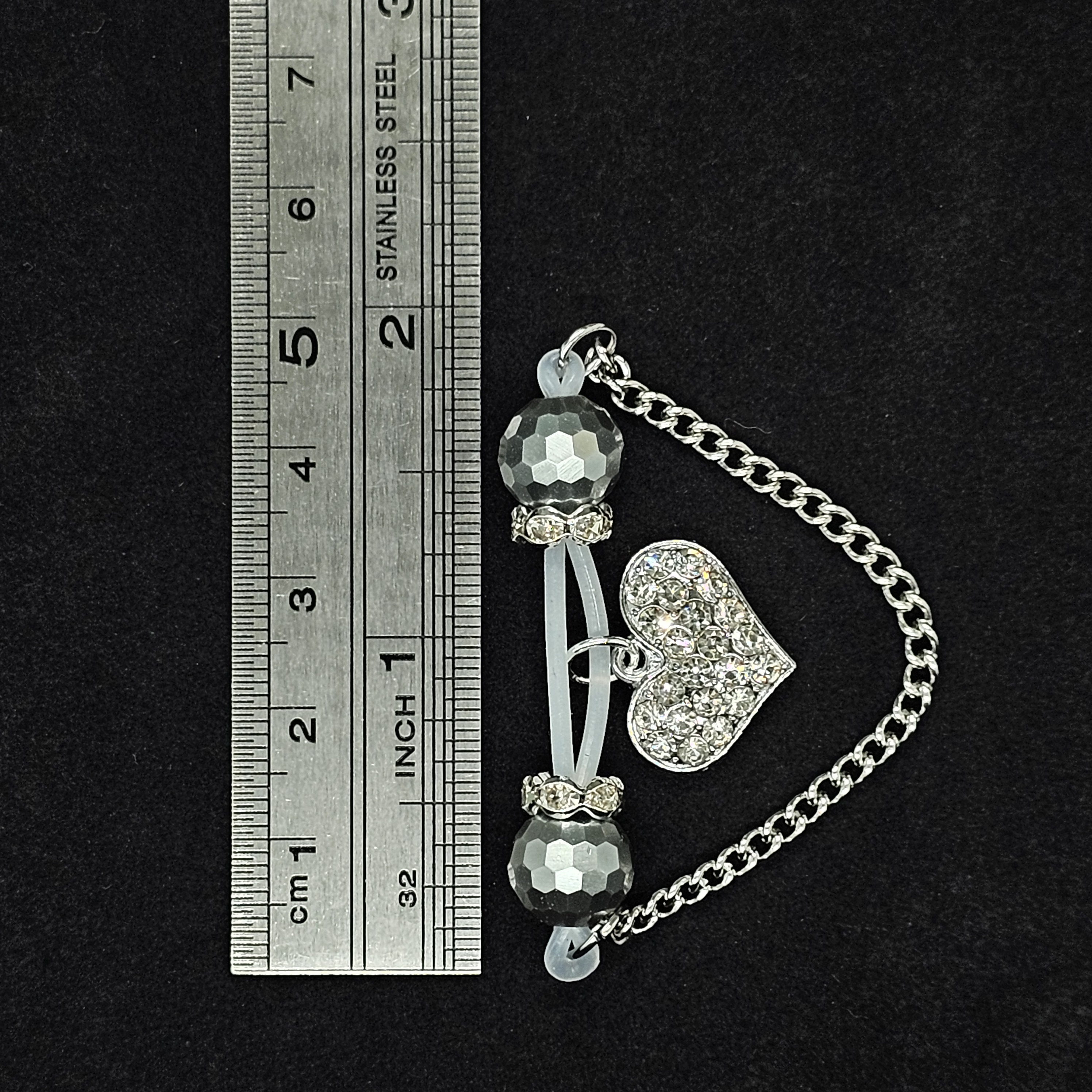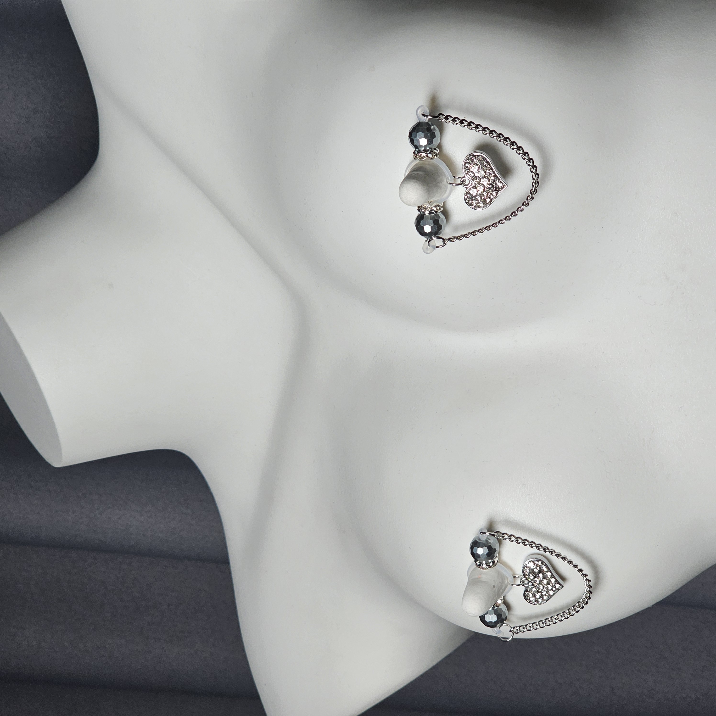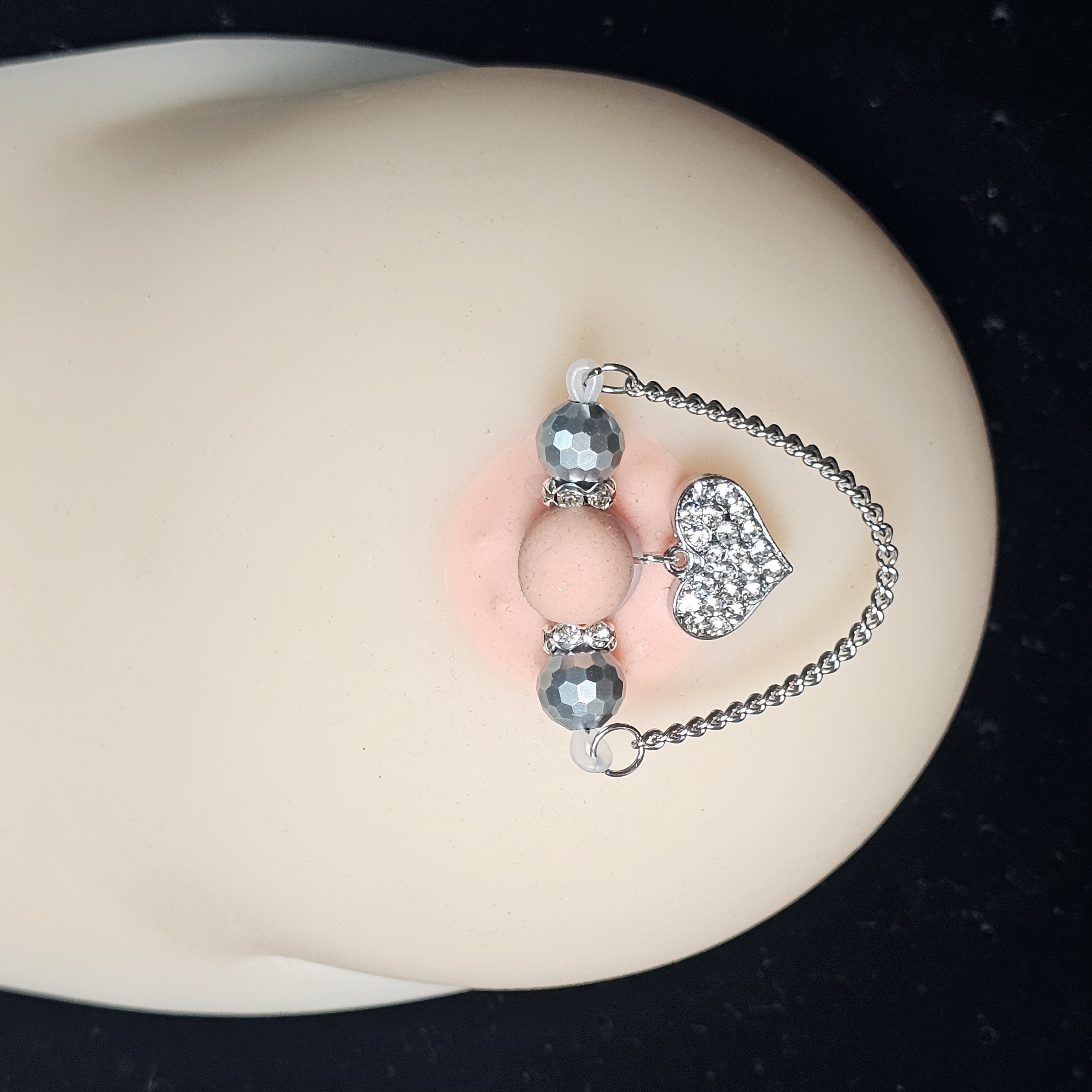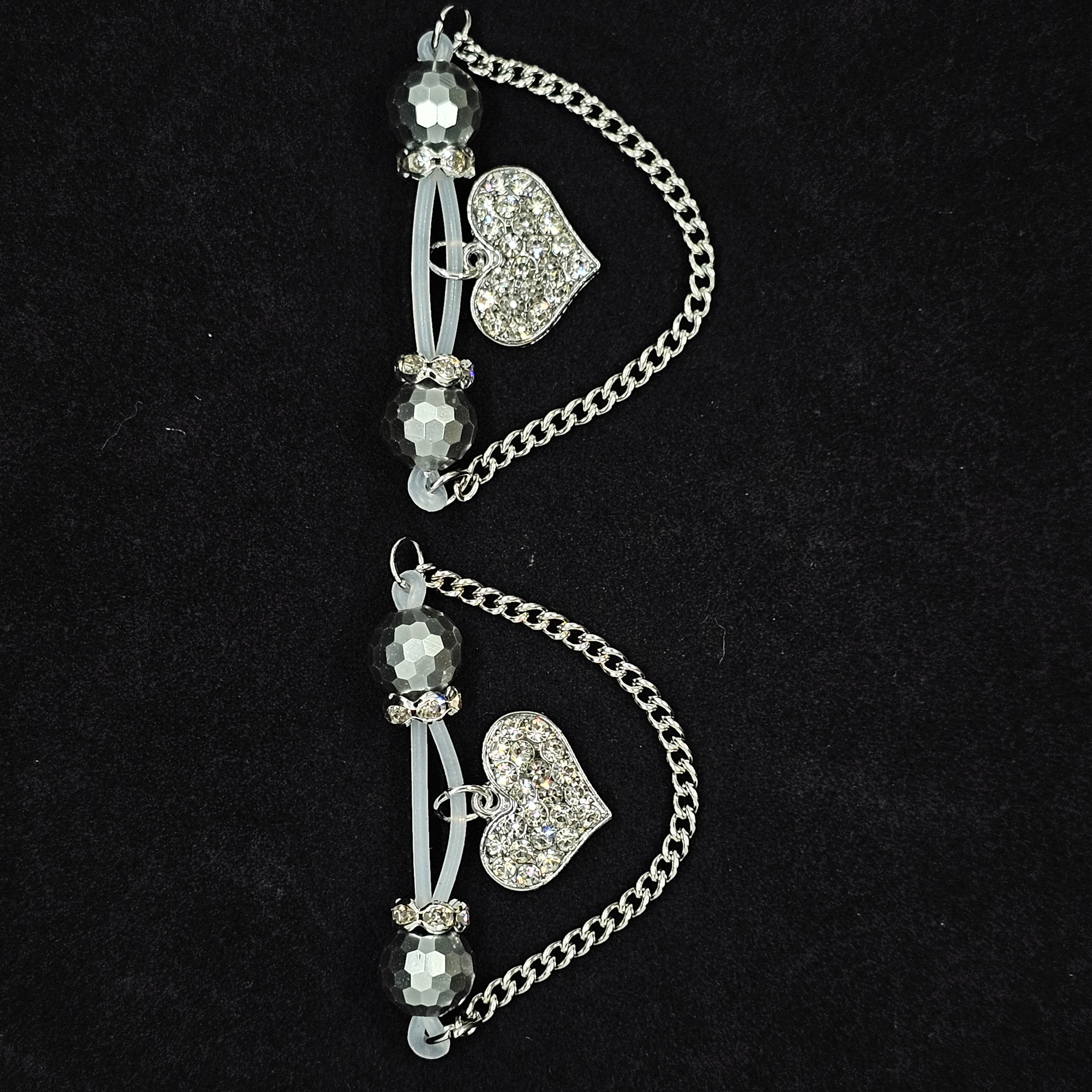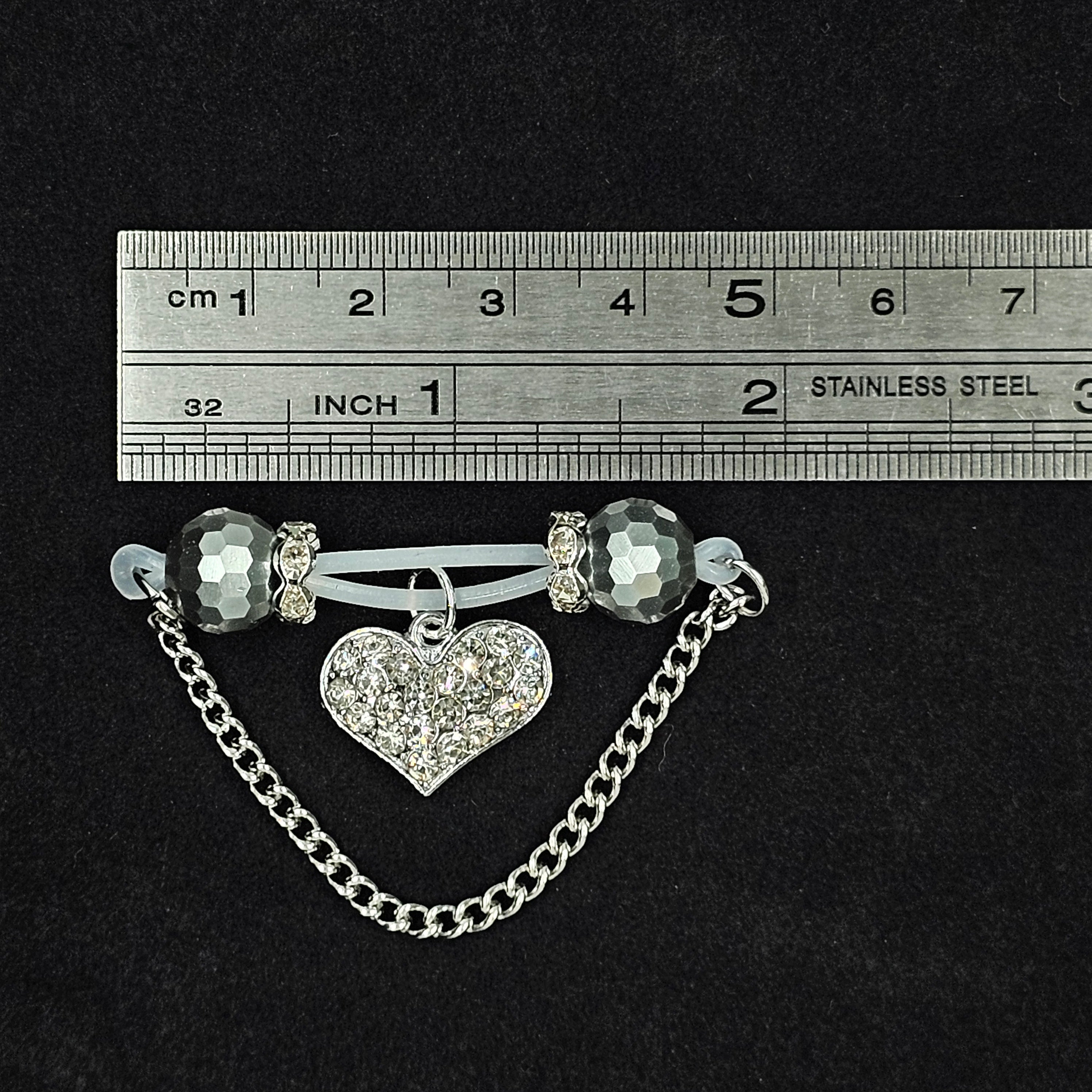 This barbell-style adjustable nipple clamp combines silver faceted beads, a delicate silver chain, and a diamond-encrusted heart pendant for a look of refined allure. The polished metallic sheen contrasts beautifully with the brilliance of the stones, creating understated elegance. Designed for both comfort and stability, it offers a customizable fit. A perfect blend of confidence, sophistication, and sensual grace.