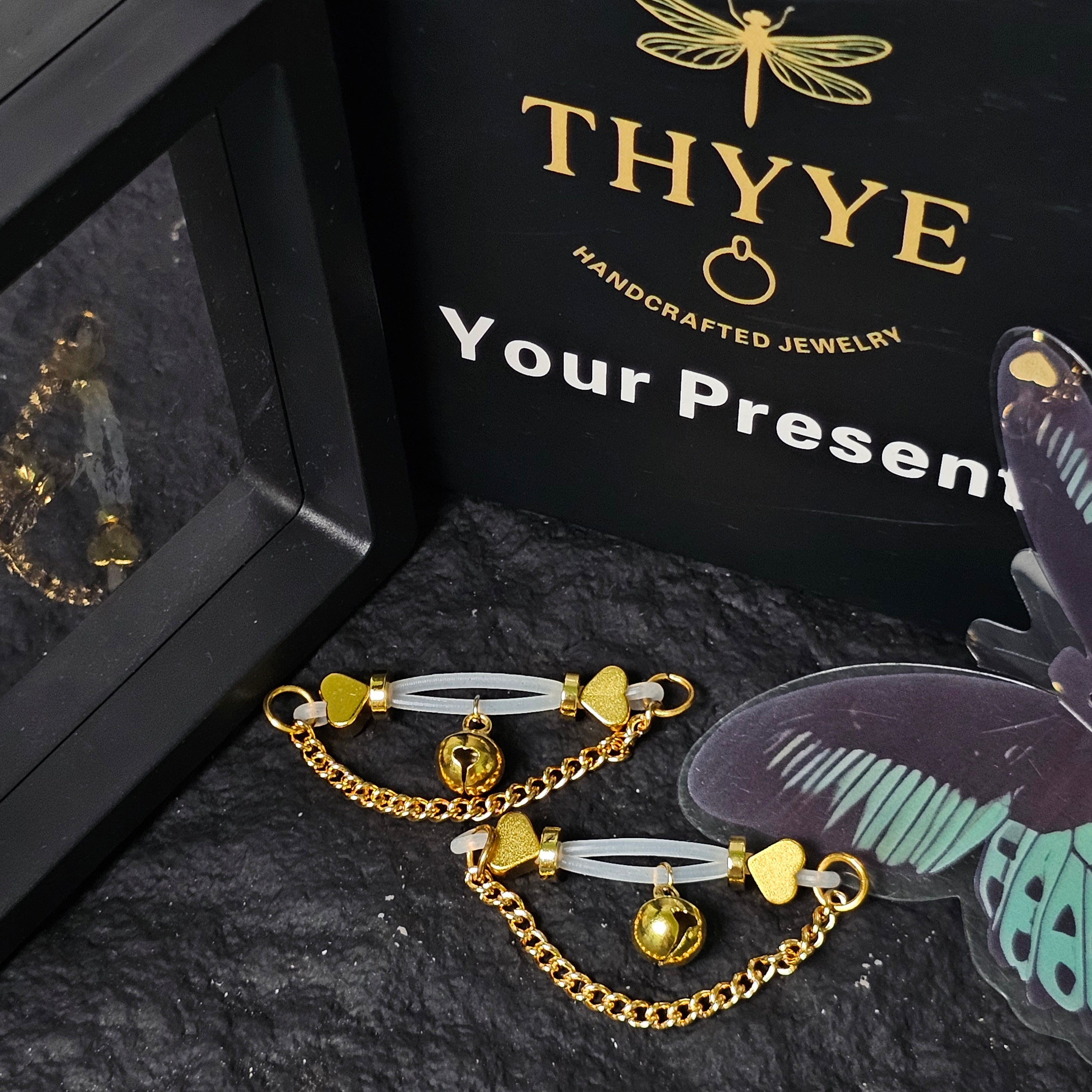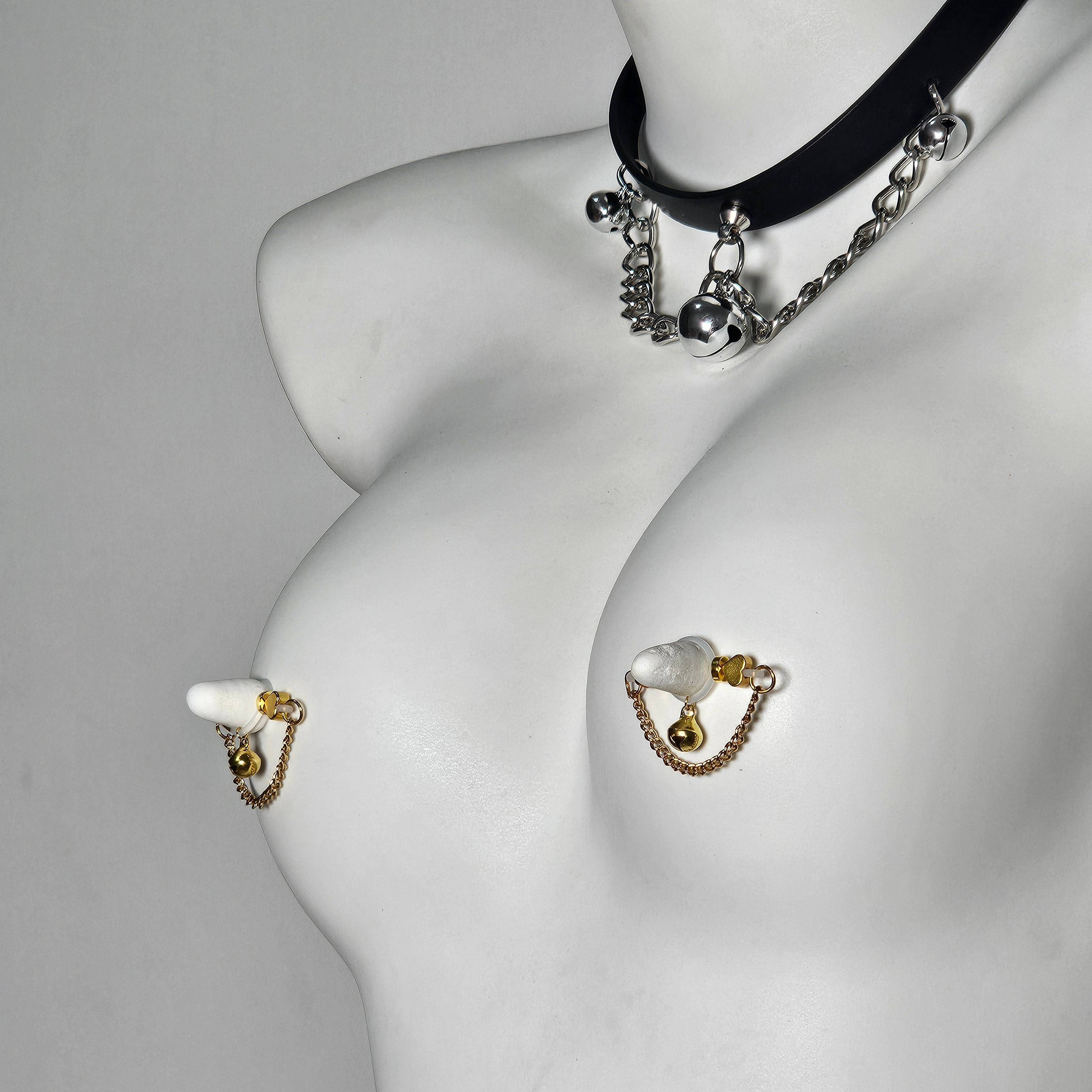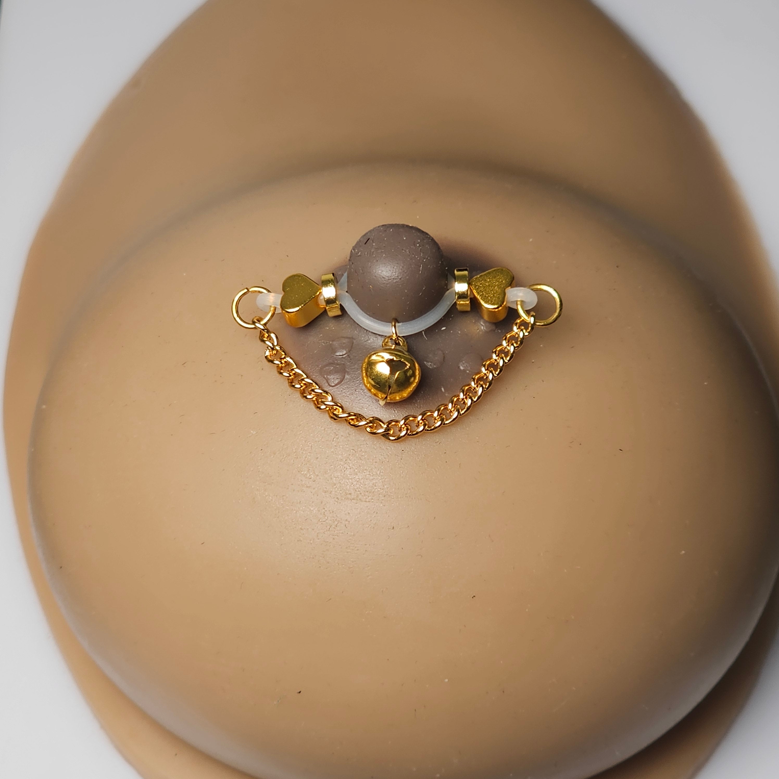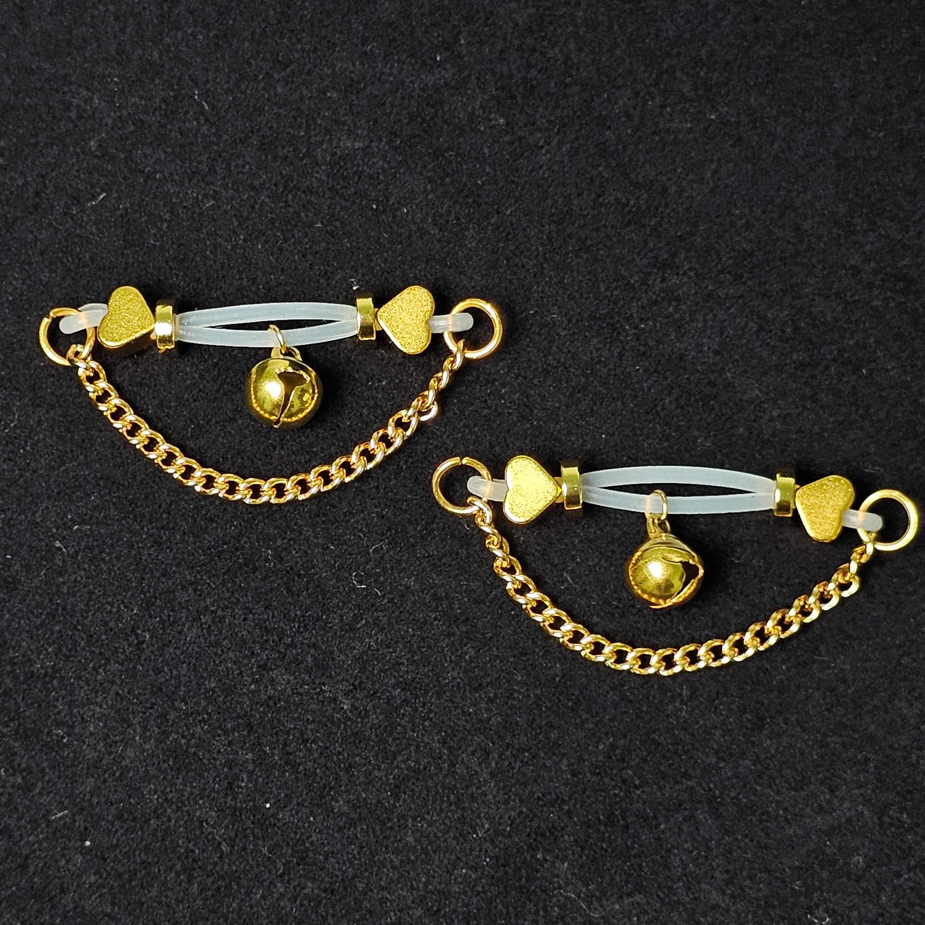This barbell-style adjustable nipple clamp features a delicate bell-shaped pendant adorned with gold heart-shaped beads and a polished gold chain, exuding a playful elegance. The heart-shaped element conveys romance and warmth, while the bell adds a touch of playfulness. The adjustable tension ensures comfort and versatility, adapting to every preference and occasion. Lightweight yet sturdy, it strikes a delicate balance between function and style. More than just a piece of jewelry, it's an expression of personality, confidence, and charm. Whether a luxurious self-pampering or a unique gift, this piece elevates intimate jewelry into an elegant and unique artistic expression.