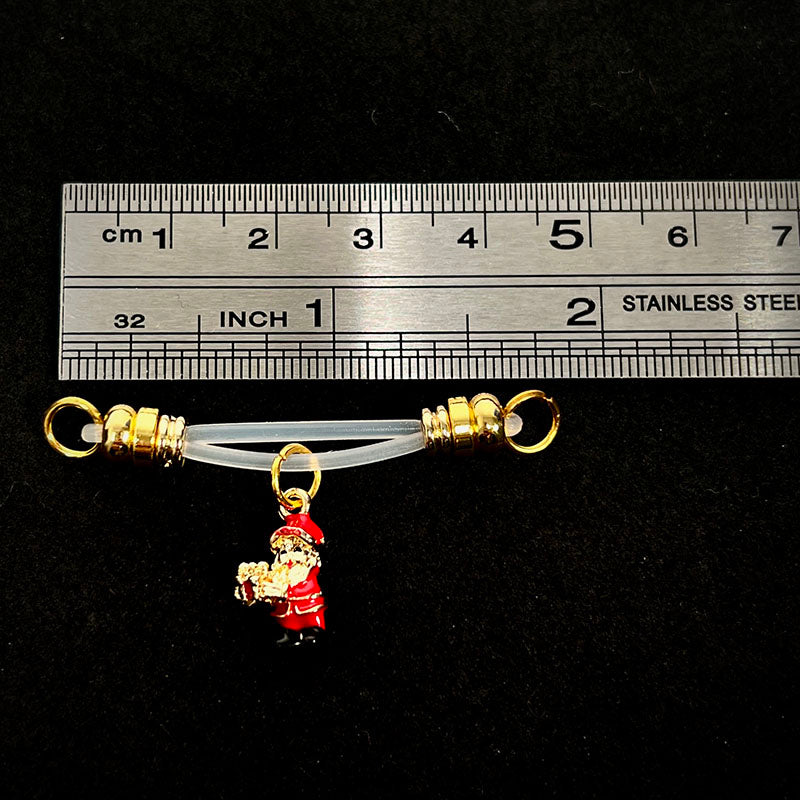 This adjustable nipple clamp features an exquisite Santa Claus enamel pendant paired with metallic gold accessories. The transparent elastic cord design offers both flexibility and a unique, understated style, cleverly blending the joyful Christmas spirit with a touch of sexy allure. The smooth metal surface contrasts beautifully with the vibrant colors of Santa Claus, creating a unique accessory that is both festive and captivating. ✨