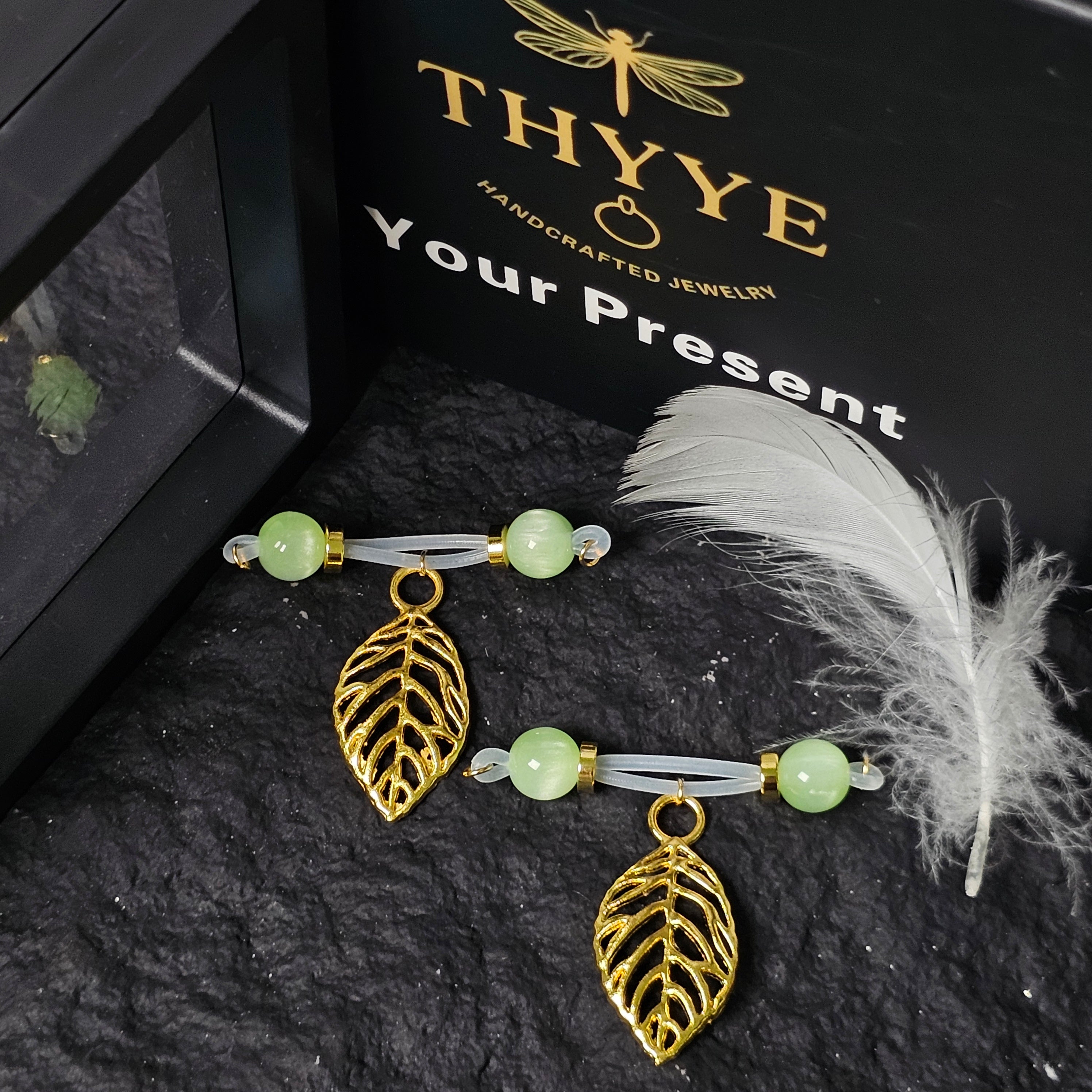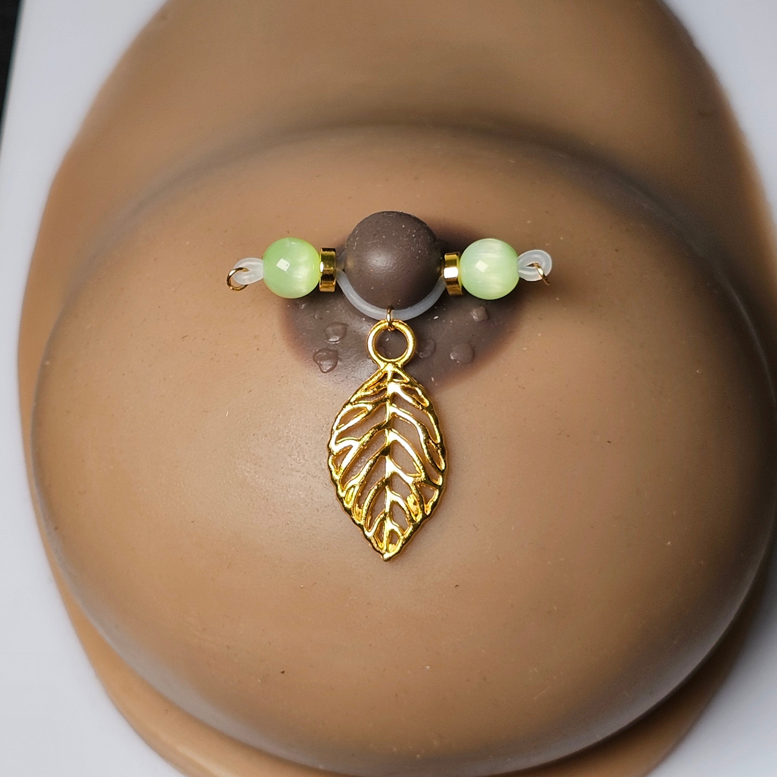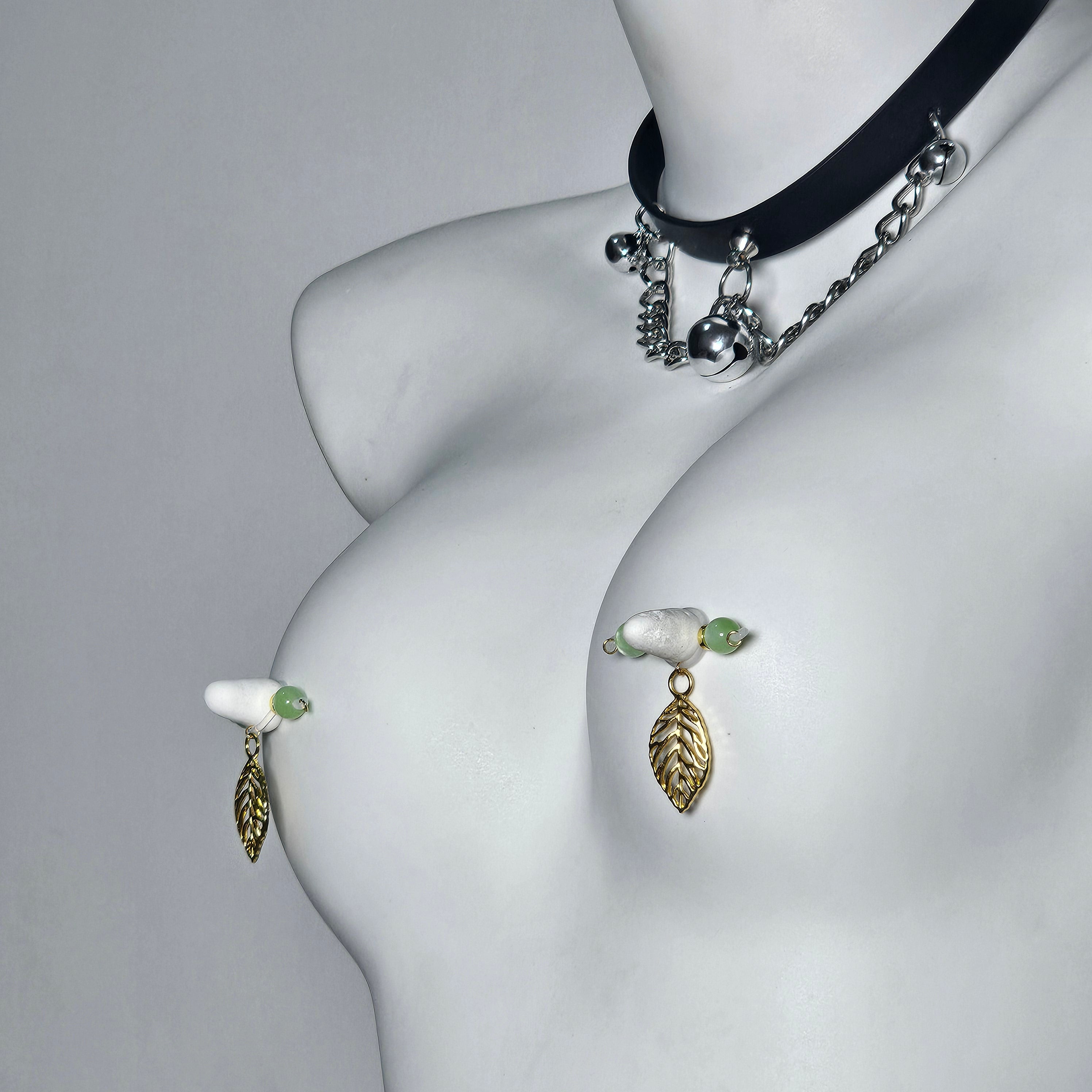 This barbell-style adjustable nipple clamp, featuring pale green beads and a gold leaf pendant, exudes a unique elegance. The refreshing green evokes a sense of balance and nature, while the gold leaf symbolizes elegance and agility. The adjustable tension ensures comfort and flexibility, adapting to every mood and occasion. Lightweight yet sturdy, it embodies a sophisticated fusion of function and style. More than just a piece of jewelry, it's an expression of personality, charm, and confidence. Whether a sophisticated self-pampering or a unique gift, this design elevates intimate jewelry into a work of art that showcases natural beauty and sophistication.