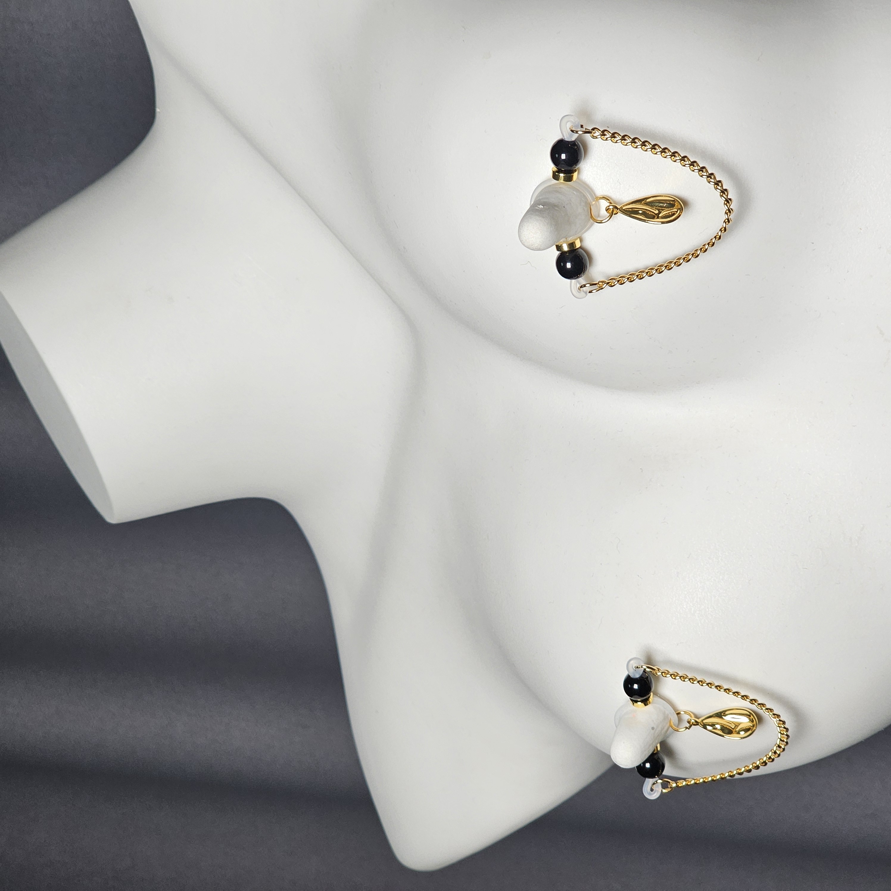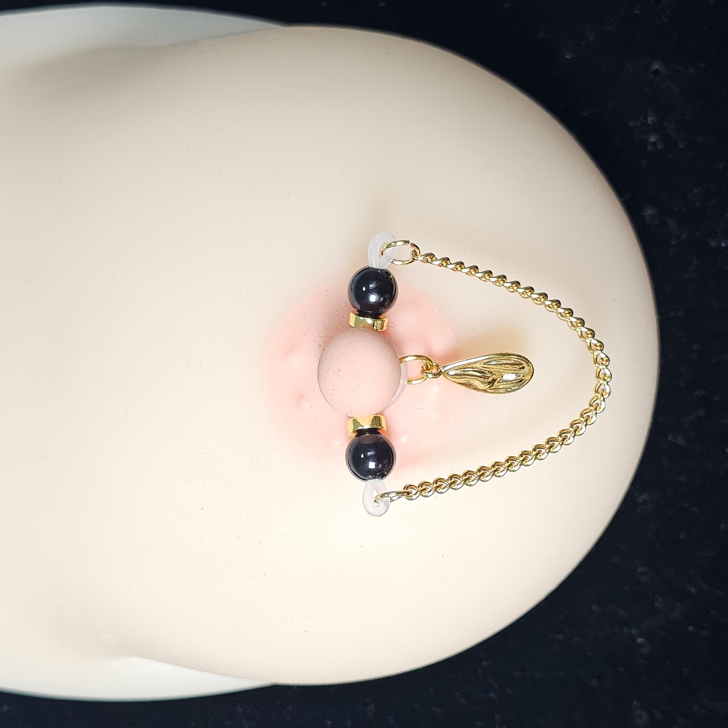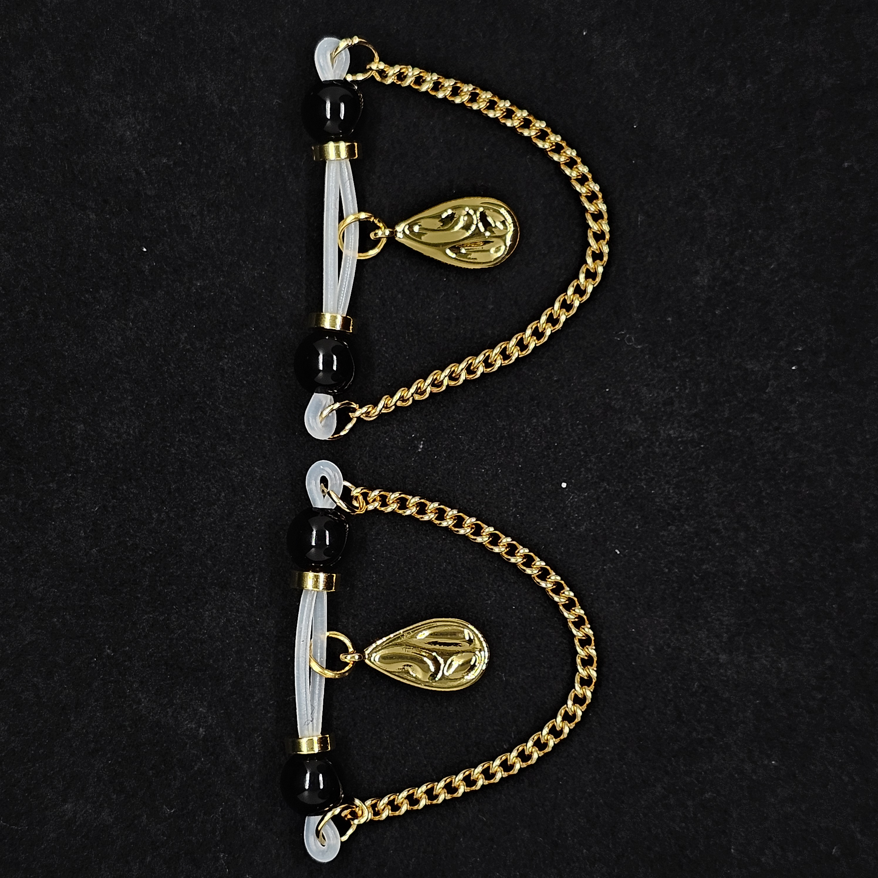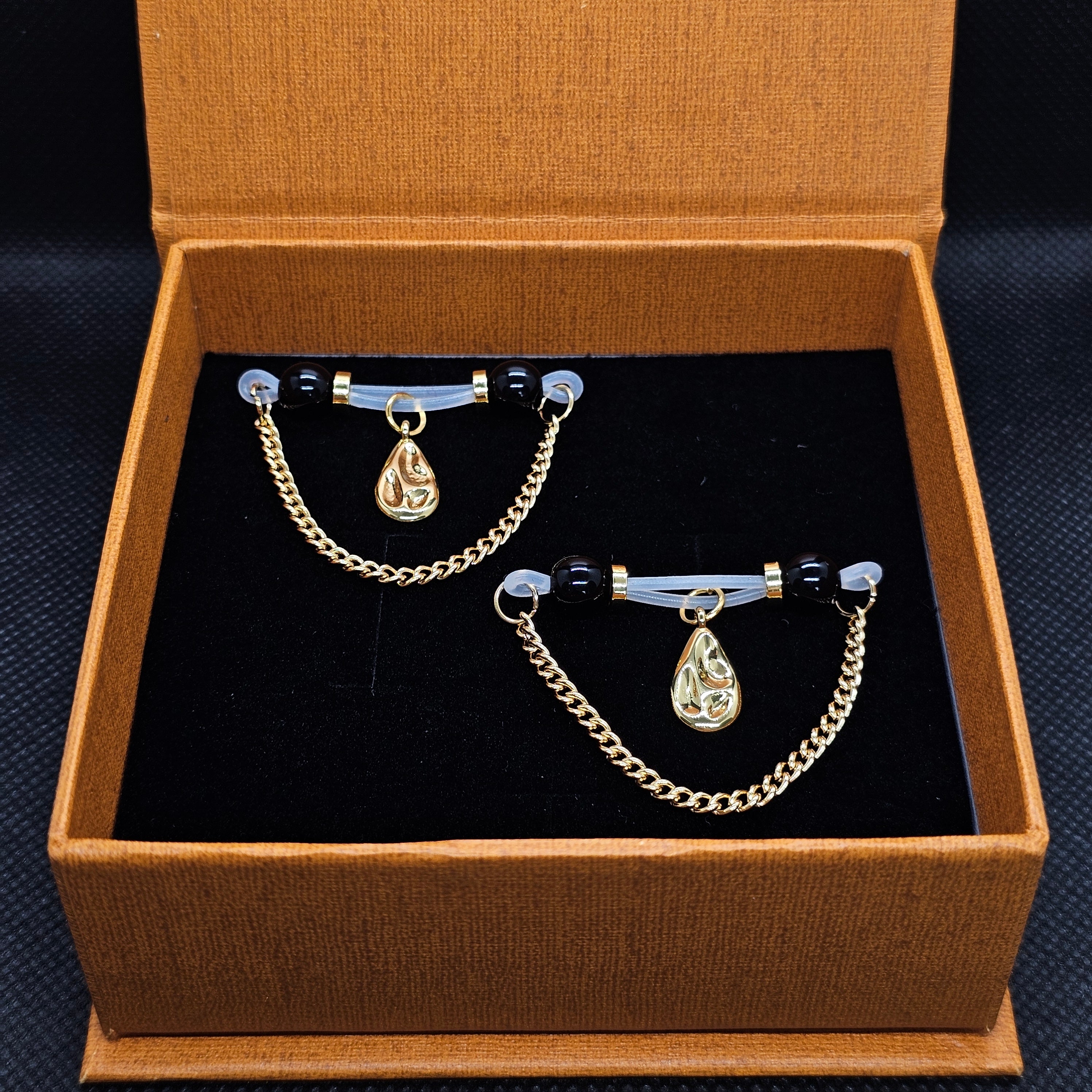 This barbell-style adjustable nipple clip captures the allure of black and gold elegance. The deep black beads contrast beautifully with the shimmering gold teardrop pendant, creating a refined balance of strength and sophistication. A delicate gold chain adds texture and shine, enhancing its luxurious appeal. The adjustable fit ensures comfort and ease, while the timeless design exudes confidence and allure — a statement piece that commands attention.