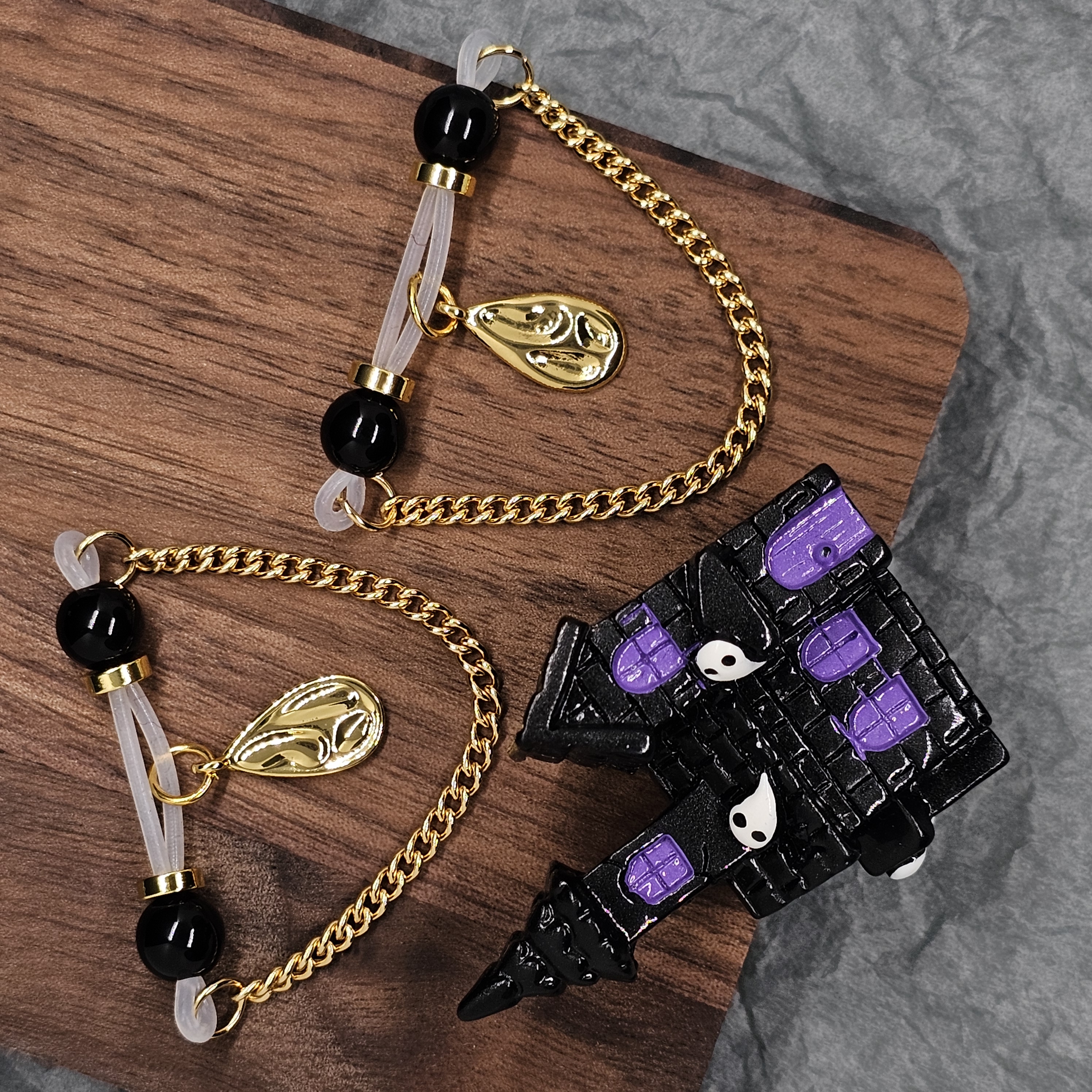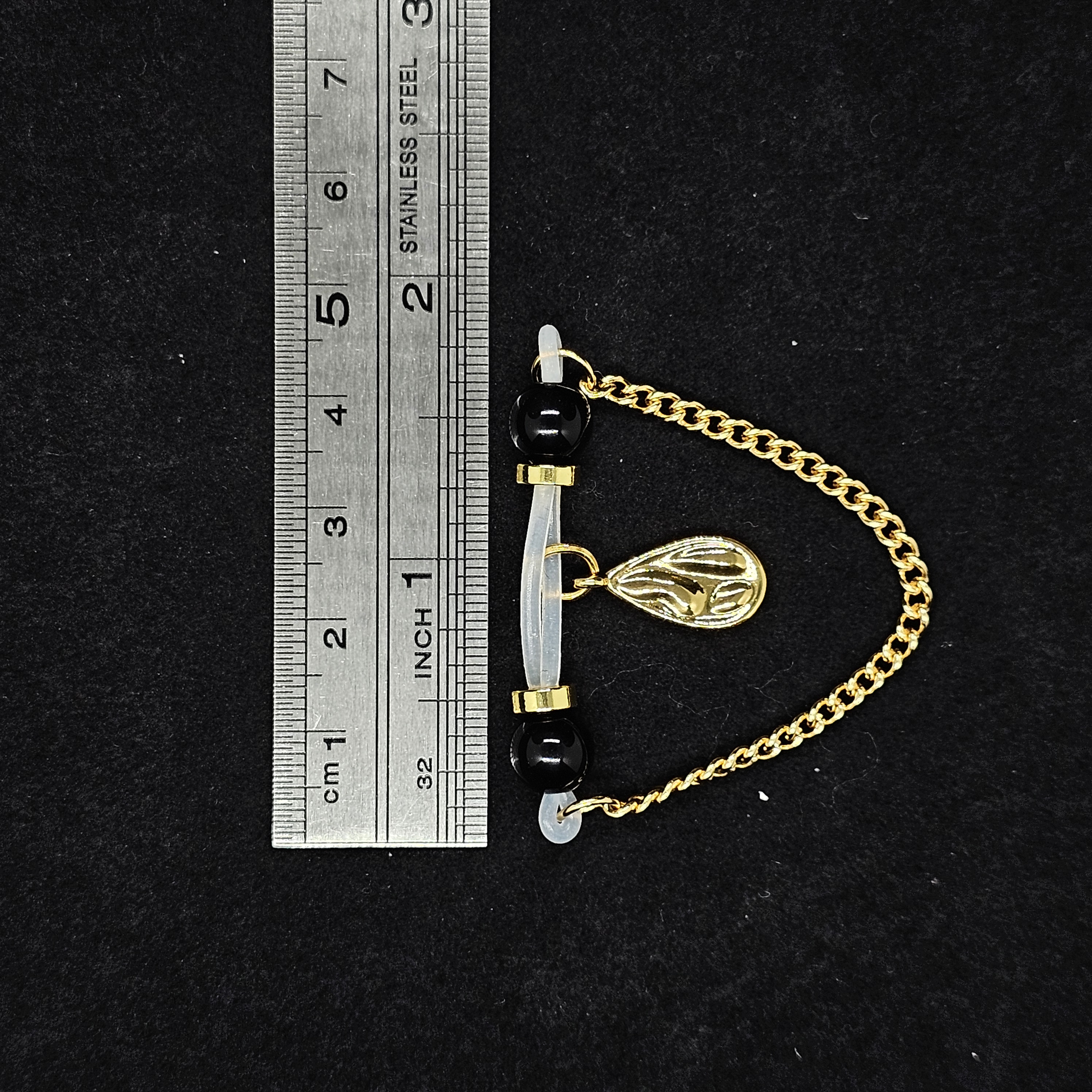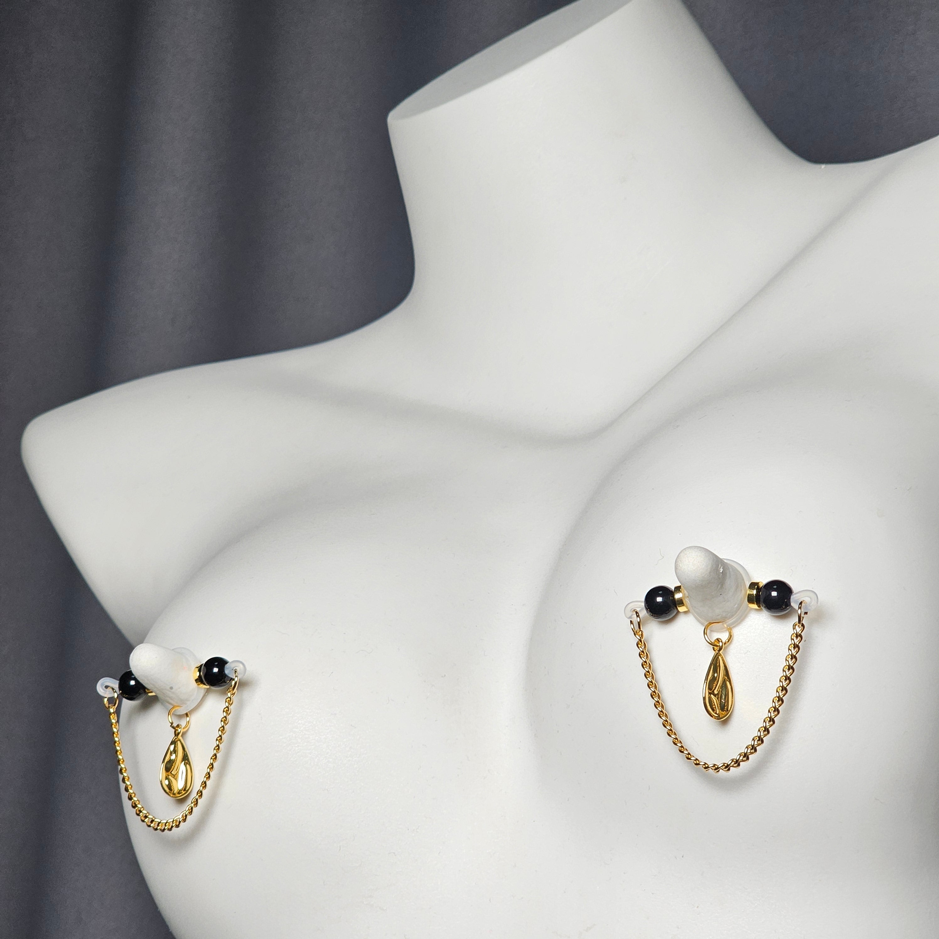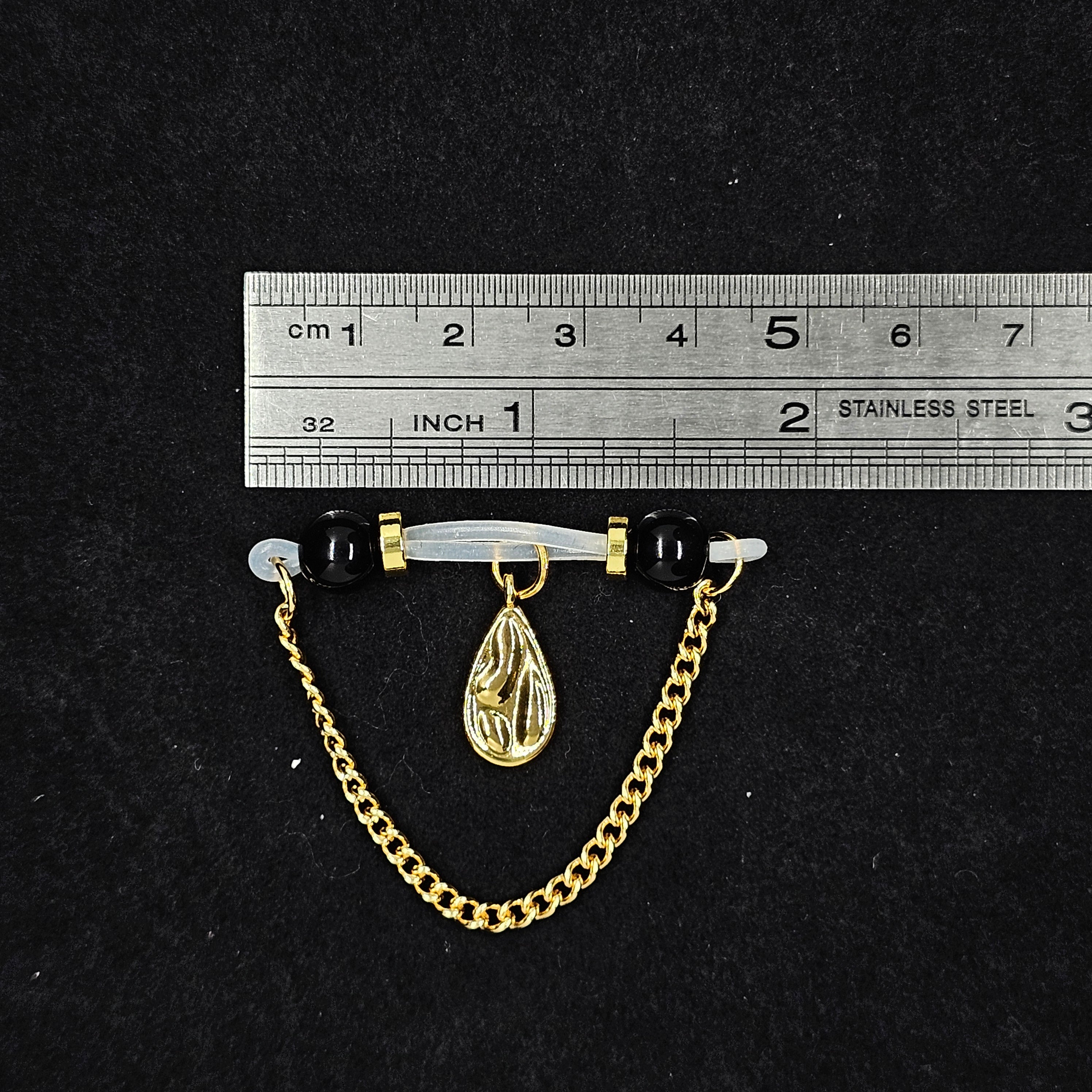 This barbell-style adjustable nipple clip captures the allure of black and gold elegance. The deep black beads contrast beautifully with the shimmering gold teardrop pendant, creating a refined balance of strength and sophistication. A delicate gold chain adds texture and shine, enhancing its luxurious appeal. The adjustable fit ensures comfort and ease, while the timeless design exudes confidence and allure — a statement piece that commands attention.