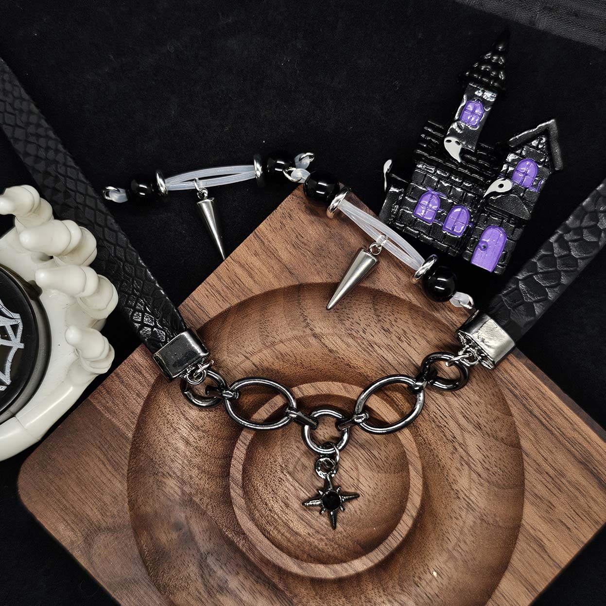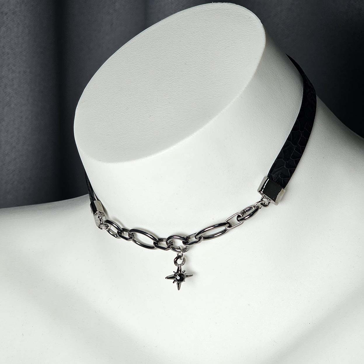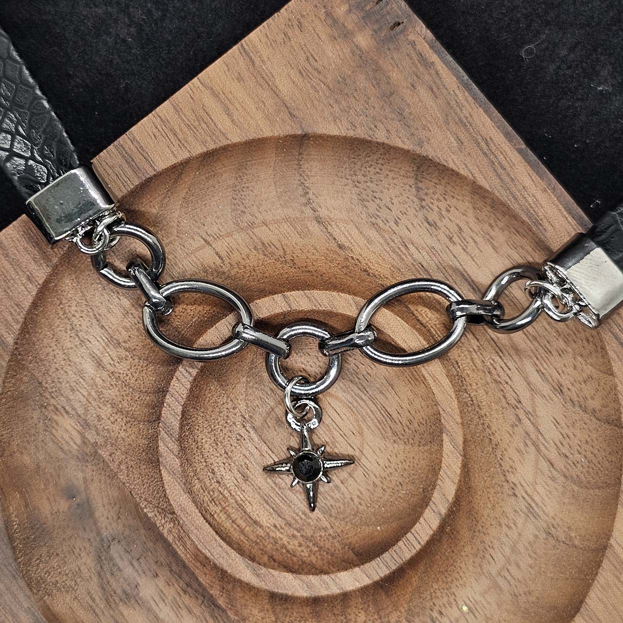 Each piece is handmade and made to order! A limited supply ensures uniqueness and rarity. With your purchase, you'll receive the latest necklace and nipple clamp set. An exquisite composition of glossy black beads with silver stud pendant nipple clips, paired with a lychee-textured black leather choker adorned with a black gemstone cross. The contrasting materials and intricate detailing create a seductive yet elegant statement with a distinct modern edge.