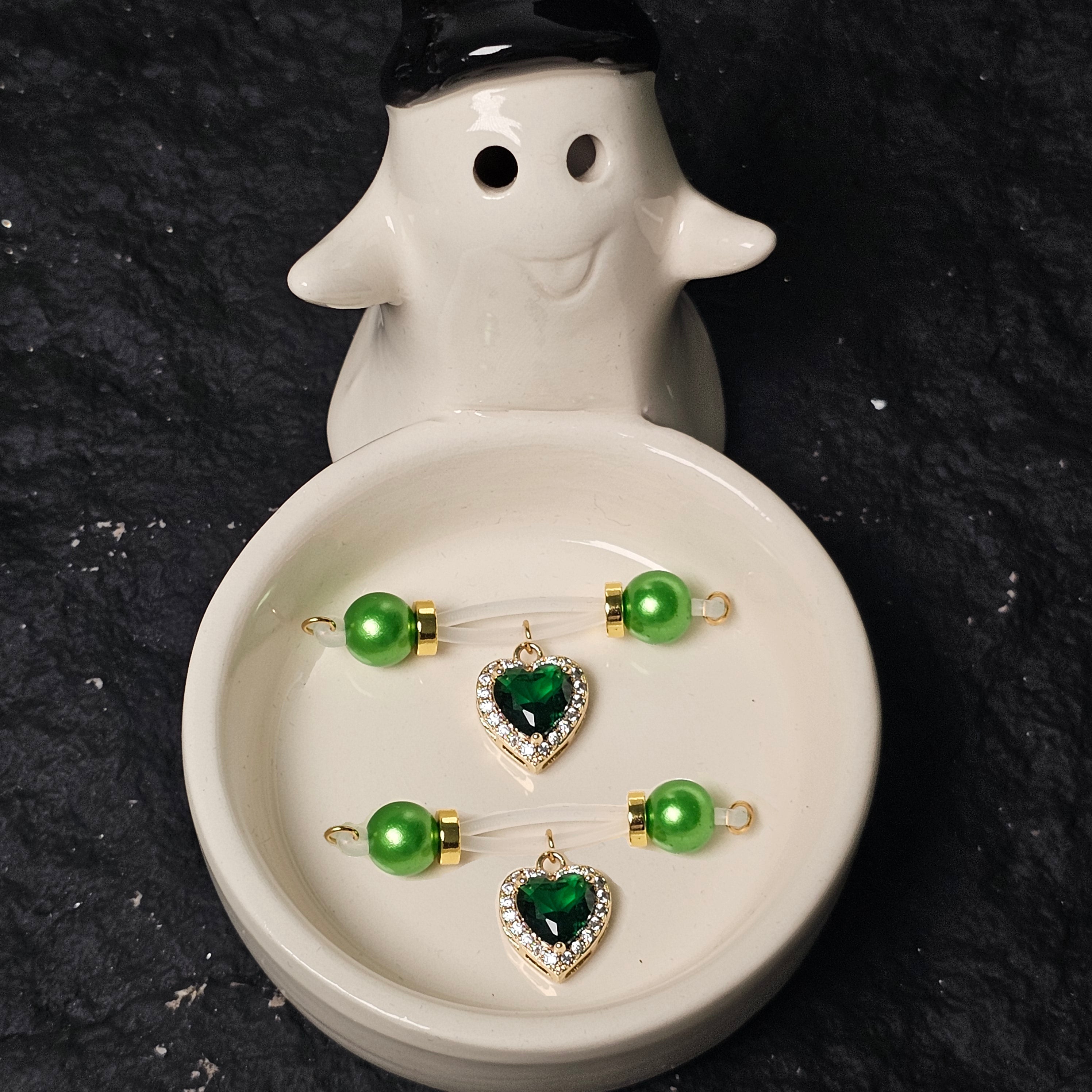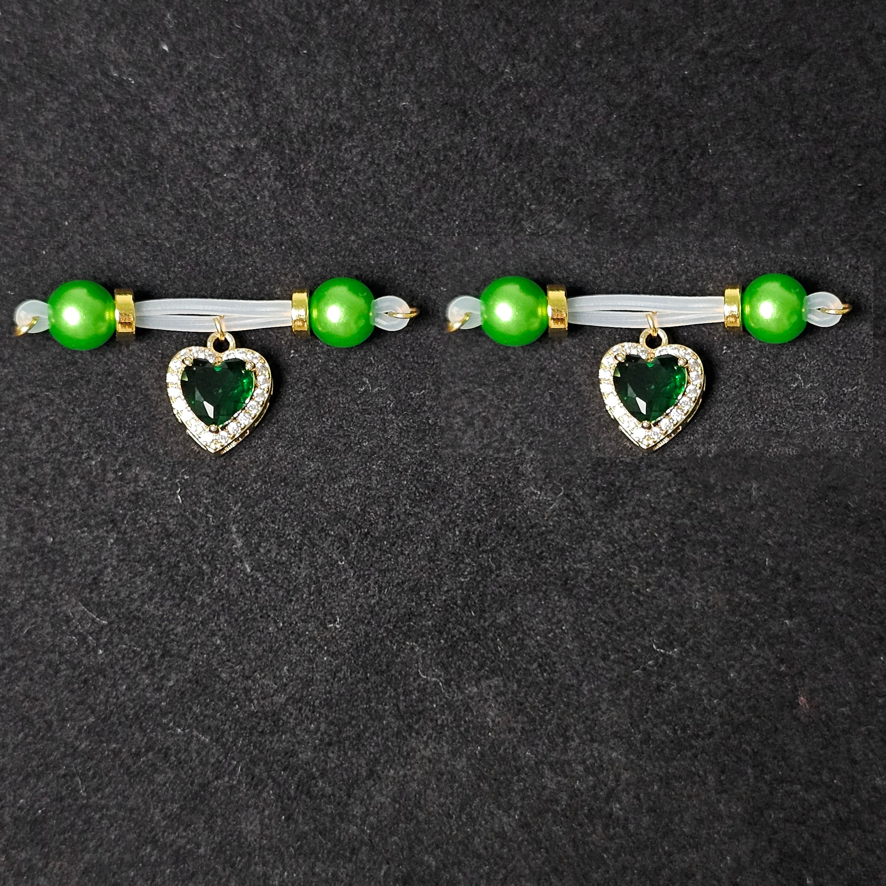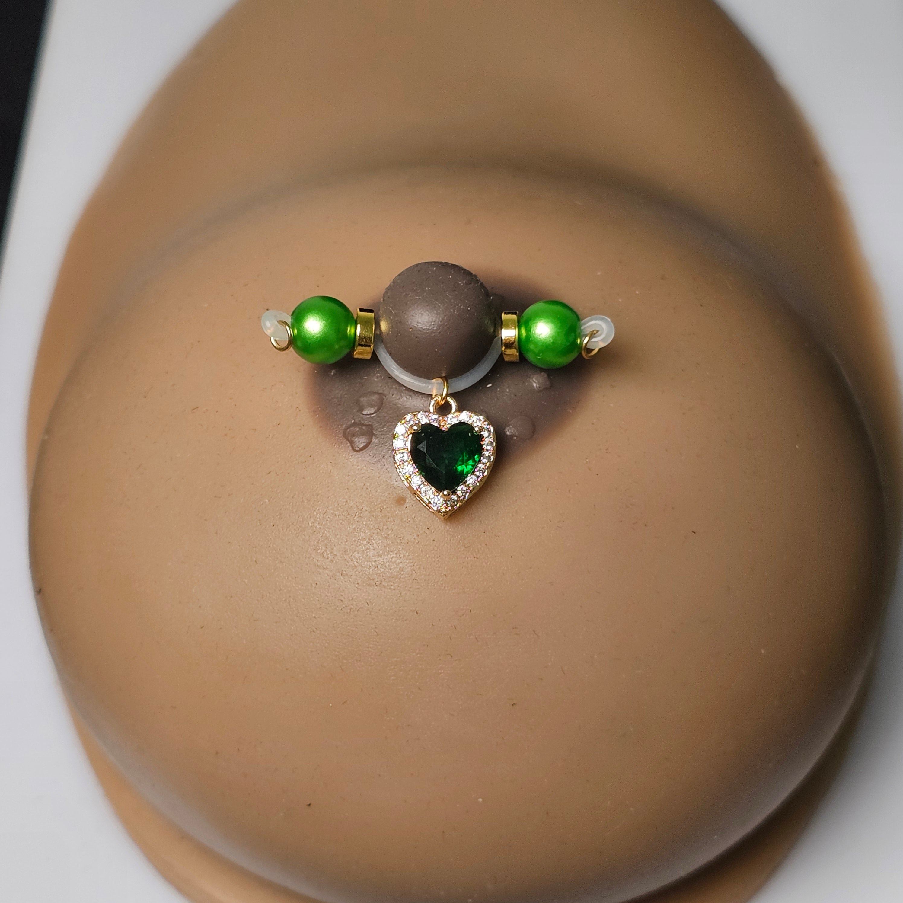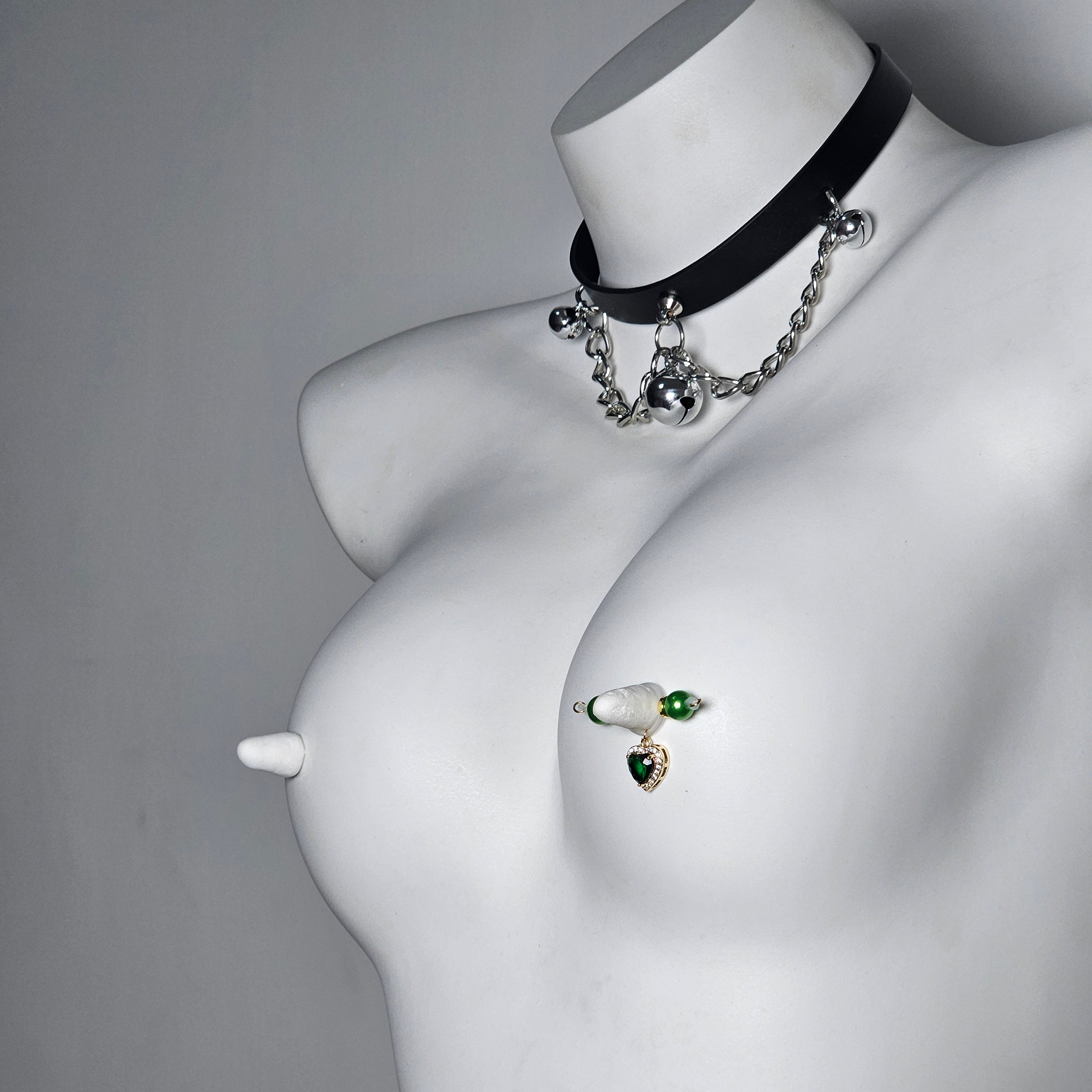 This barbell-style adjustable nipple clamp, featuring polished green jade beads and a diamond-encrusted green heart-shaped gemstone pendant, exudes elegance and charm. The combination of natural jade and sparkling diamonds creates a sophisticated balance of purity and luxury. The sturdy barbell construction ensures stability, while the adjustable design offers comfort and versatility. More than just a private accessory, it's a fashion statement that showcases individuality, confidence, and class. The vibrant green color symbolizes vitality and seduction, making it a unique and memorable addition to any collection. Perfect for those seeking elegance and a bold, modern look.