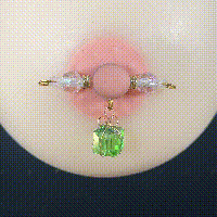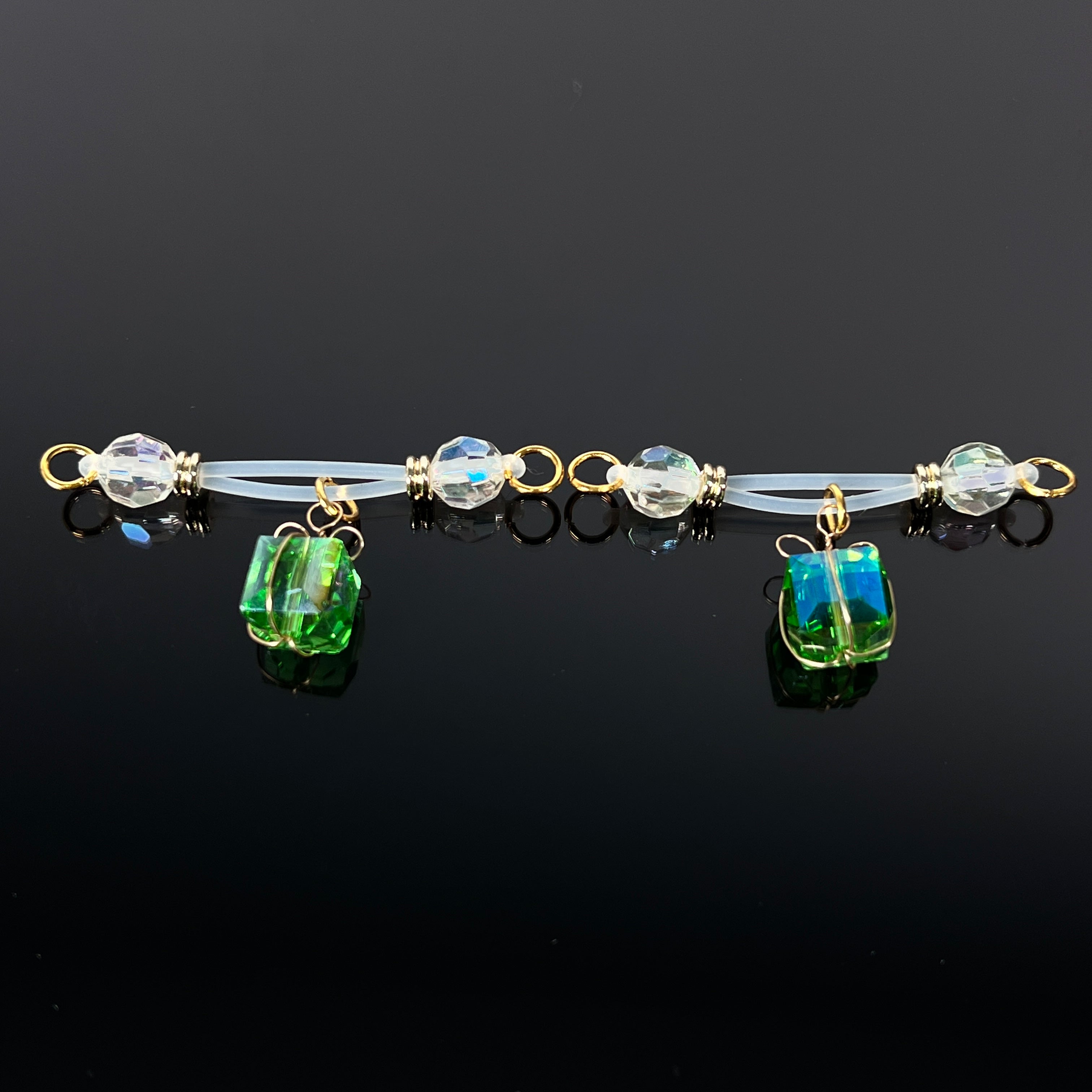 This barbell-style adjustable nipple clip features a translucent multifaceted bead and a green aurora cube pendant with gold filigree details. Combining modern elegance with subtle luxury, it offers a refined, versatile accessory that accentuates unique personal style effortlessly.