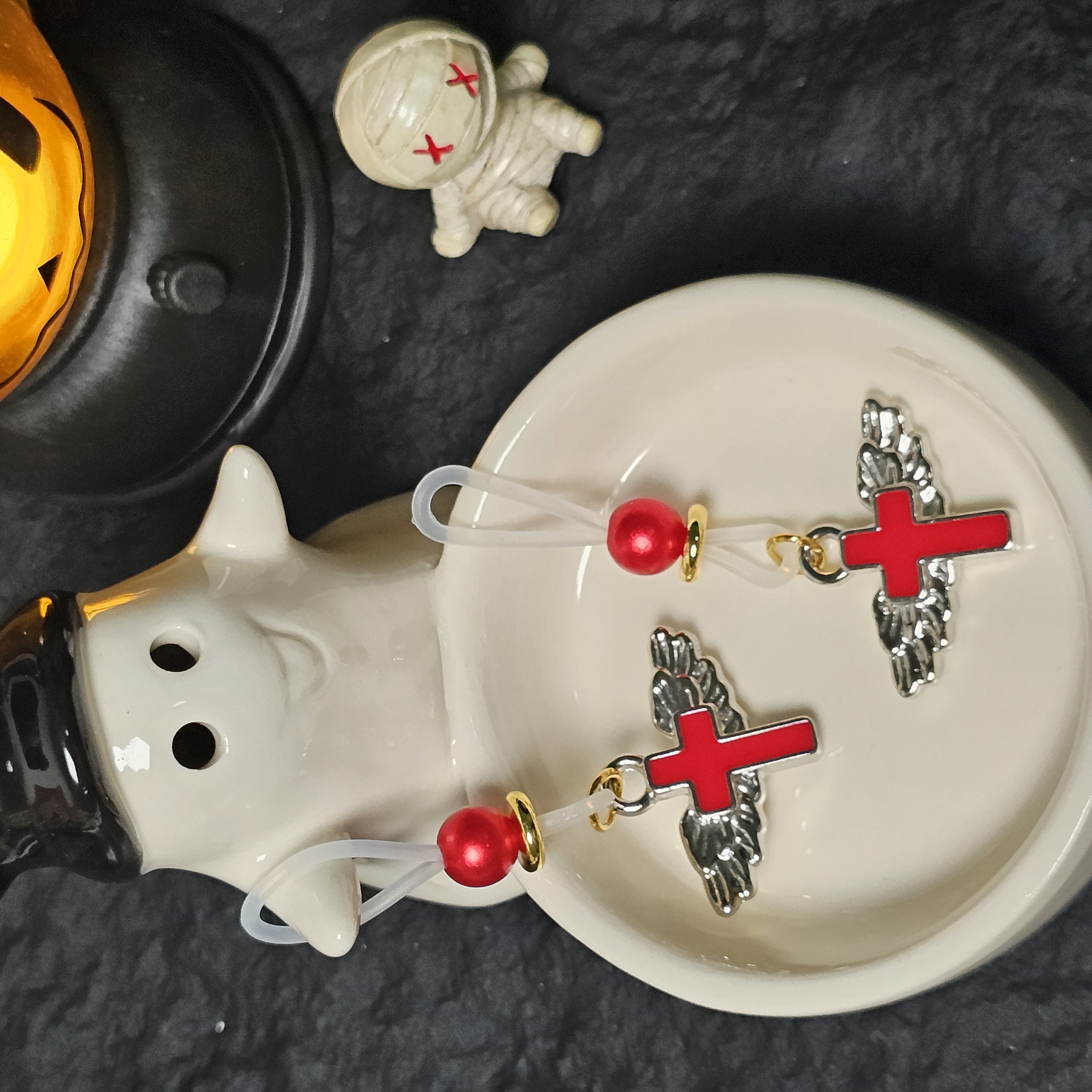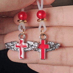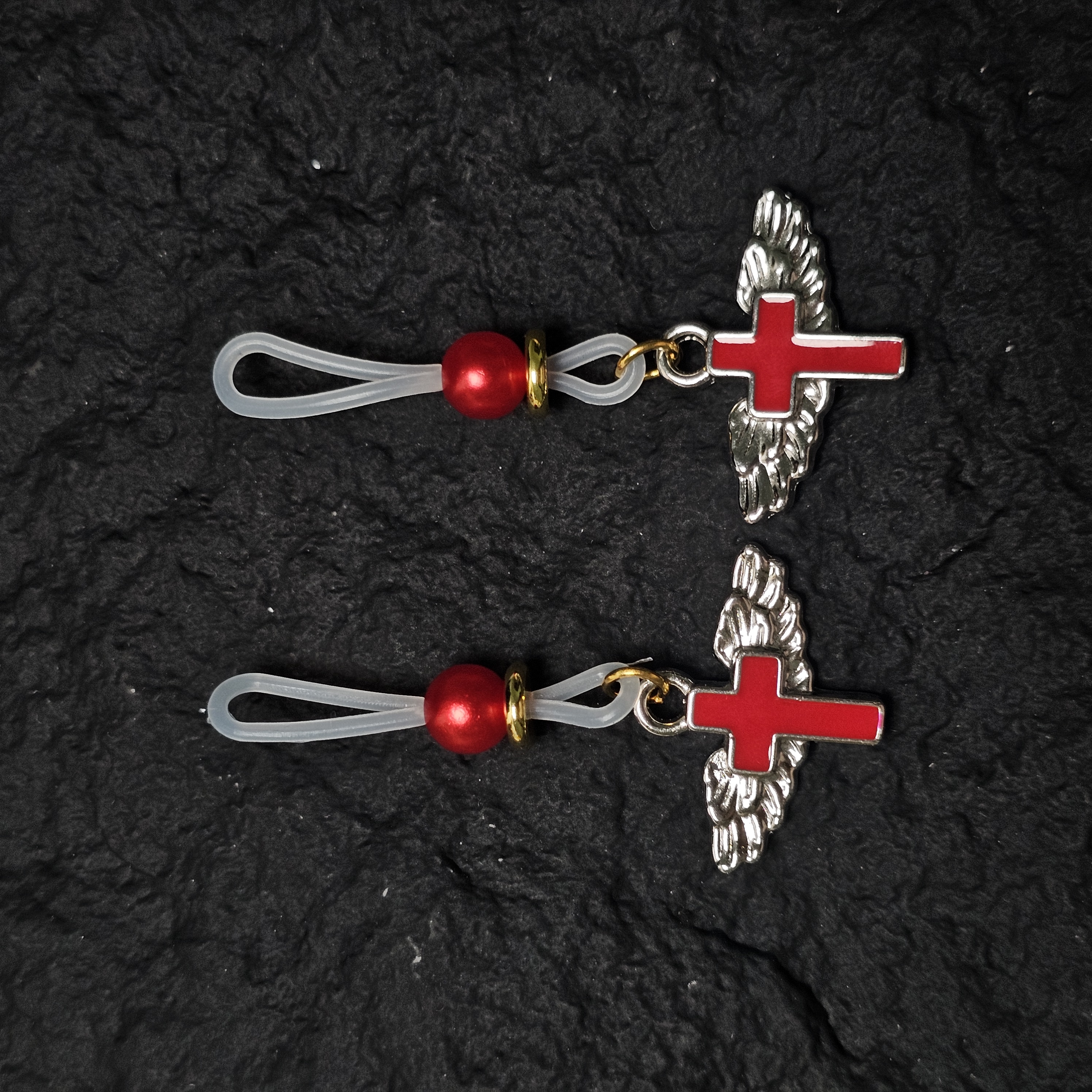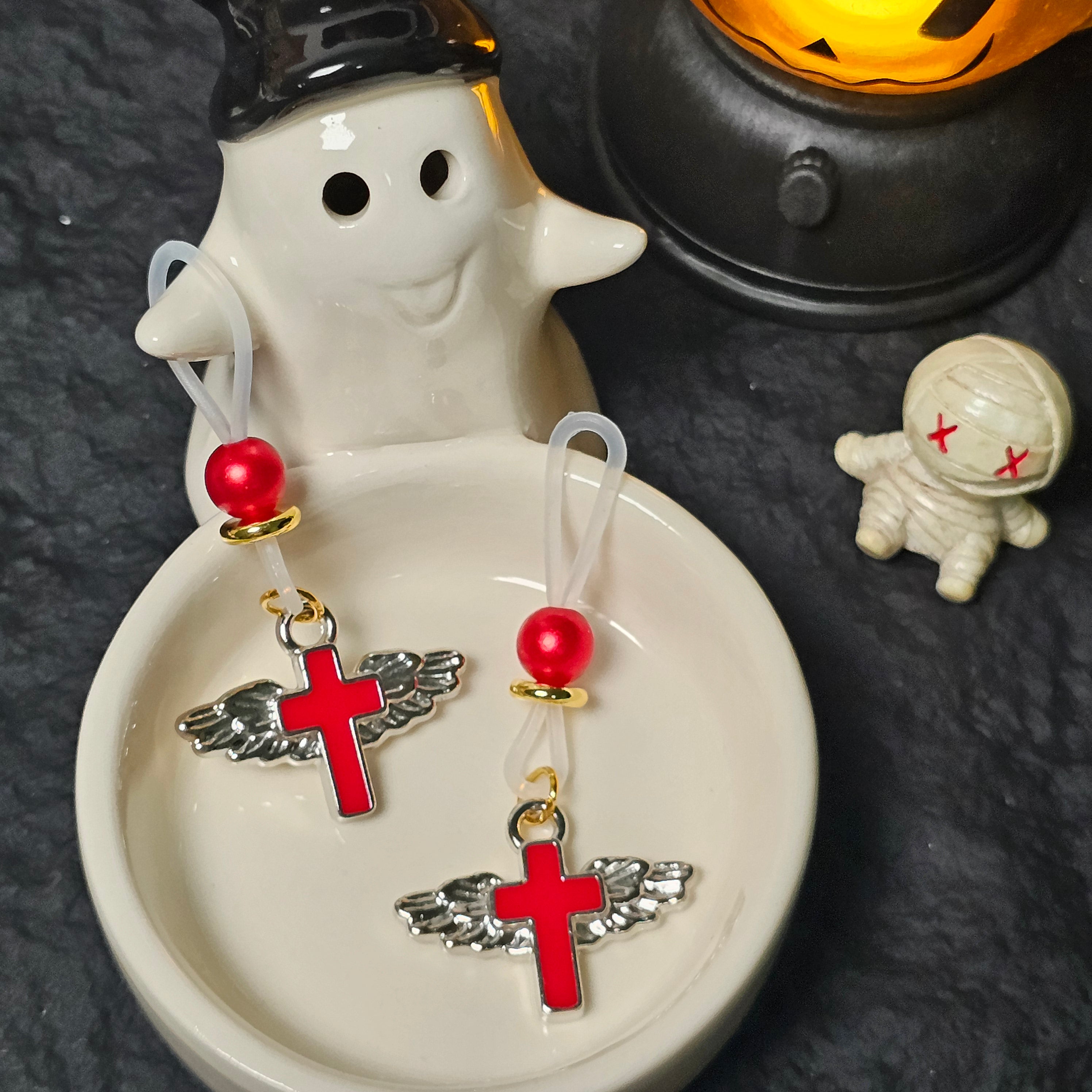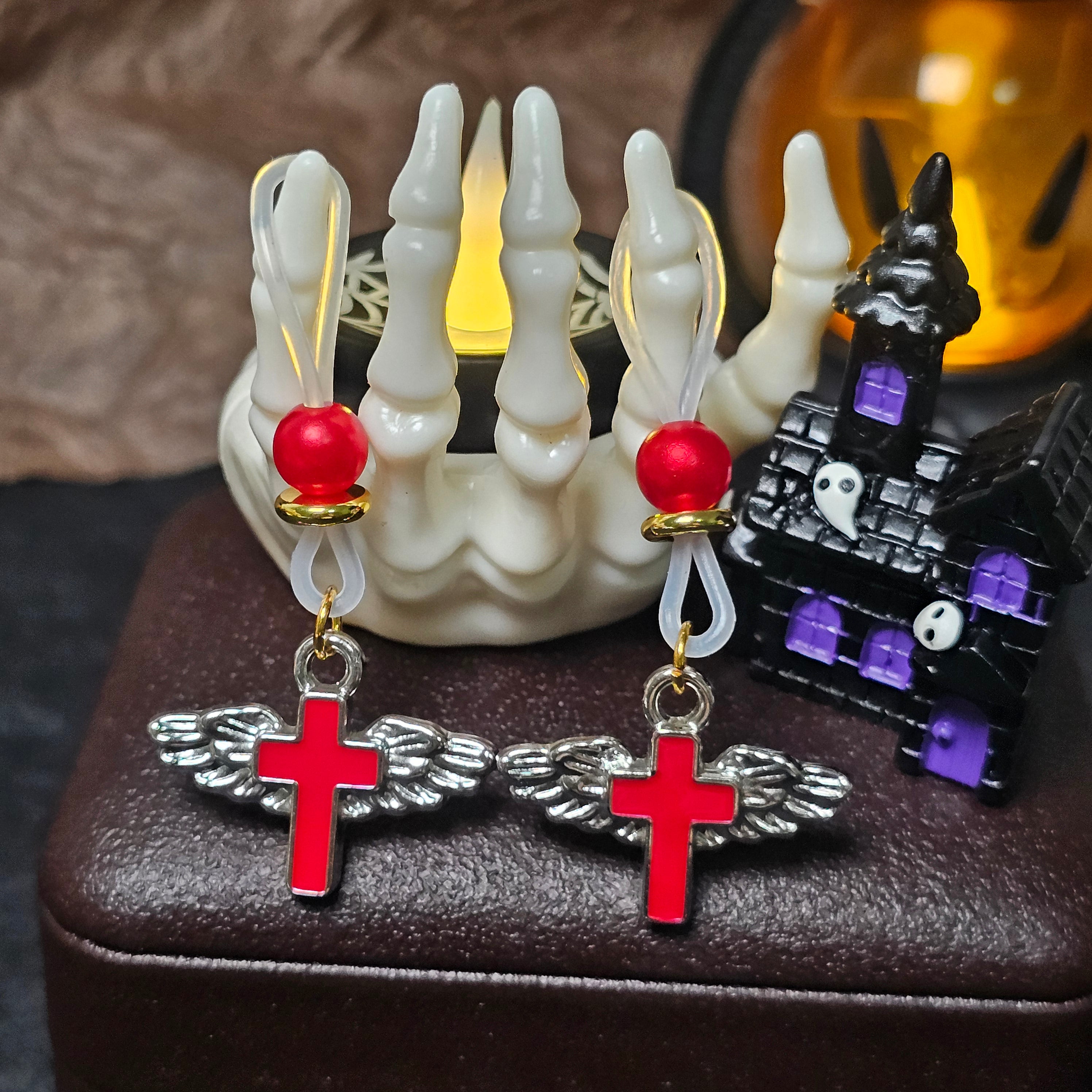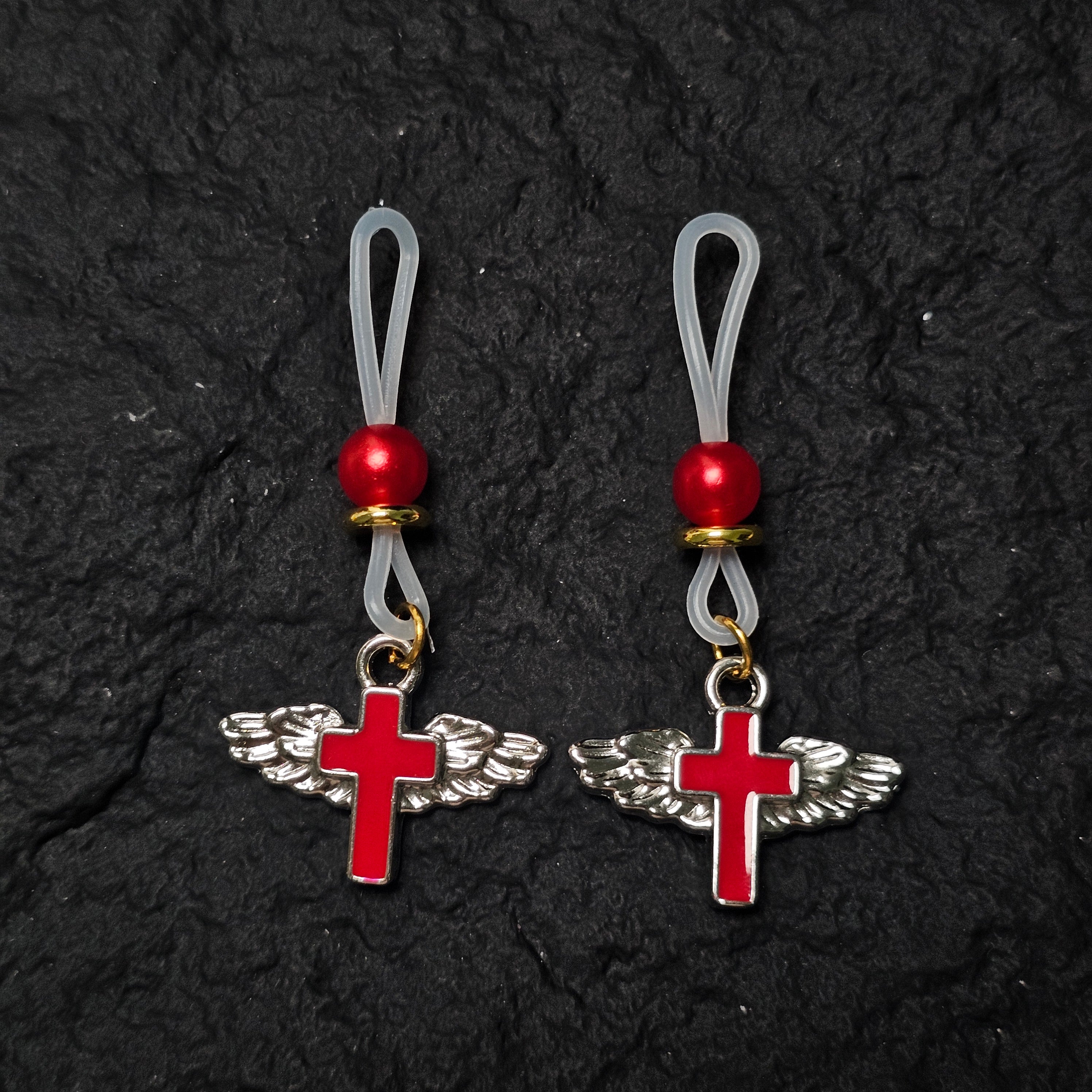 This nipple clamp blends passion and mystery, showcasing unique personality and charm. The vibrant red beads on the clamps evoke vitality and passion, instantly capturing the eye. The pendant, a delicate red cross, accented with flowing feathers, exudes a sense of mystery and power. The contrast between the deep red cross and the feathers creates a unique artistic allure, a perfect blend of elegance and rebellion. The adjustable design ensures a comfortable fit, adapting to different body shapes and maintaining comfort even for extended wear. Whether worn daily or for special occasions, it adds a unique touch to your look, making it the perfect accessory to showcase confidence and individuality, and a creative gift for a loved one.
