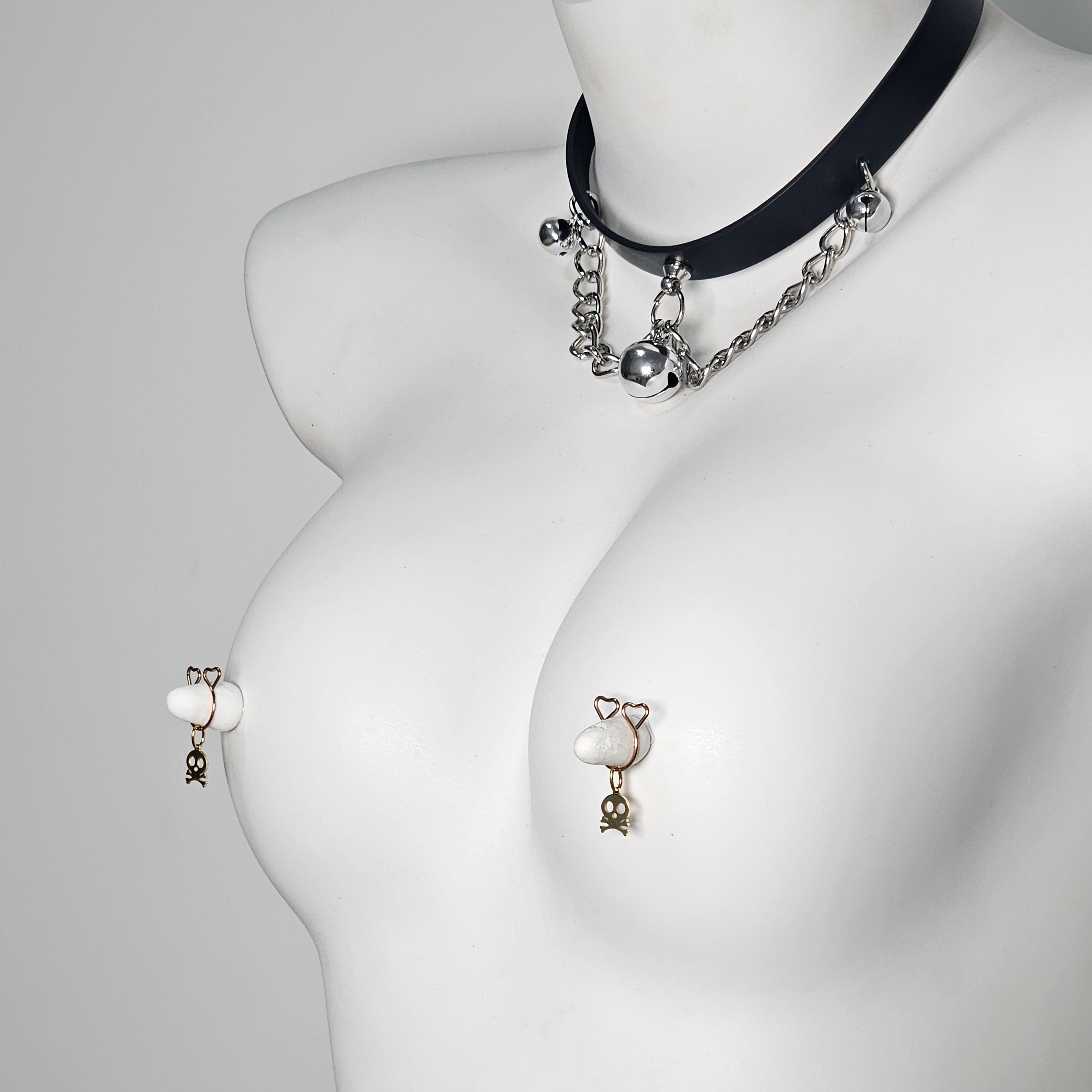 These nipple clamps showcase a bold and elegant design, perfectly combining strength and individuality. The golden horseshoe ring symbolizes strength and luck, its smooth curves etched like a sculpture, showcasing a unique quality. The pendant, crafted in the shape of a golden skull, exudes a cool, uninhibited, and avant-garde artistic flair, adding a touch of rebelliousness and boldness to the overall look. The rich, lustrous metal surface and refined craftsmanship enhance the details with a premium feel. The adjustable design ensures comfortable and versatile wear, allowing for both a light touch and a bold statement. More than just a refined erotic accessory, it symbolizes confidence and attitude. Perfect for special moments, it adds a touch of ritual to intimate interactions and is a stylish way to showcase your individual charm.