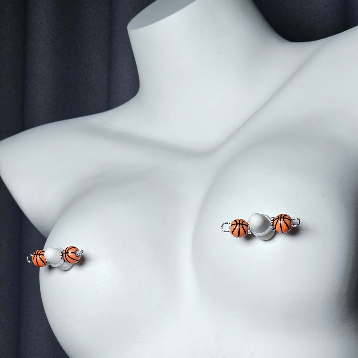 Vivid orange basketball-inspired beads paired with sleek threaded metal accents create a bold, sporty yet refined aesthetic. The barbell-style adjustable nipple clips balance playful energy with sophisticated design, adding a modern, confident edge. The vibrant hue and clean lines give this piece a distinctive character — chic, dynamic, and effortlessly stylish.