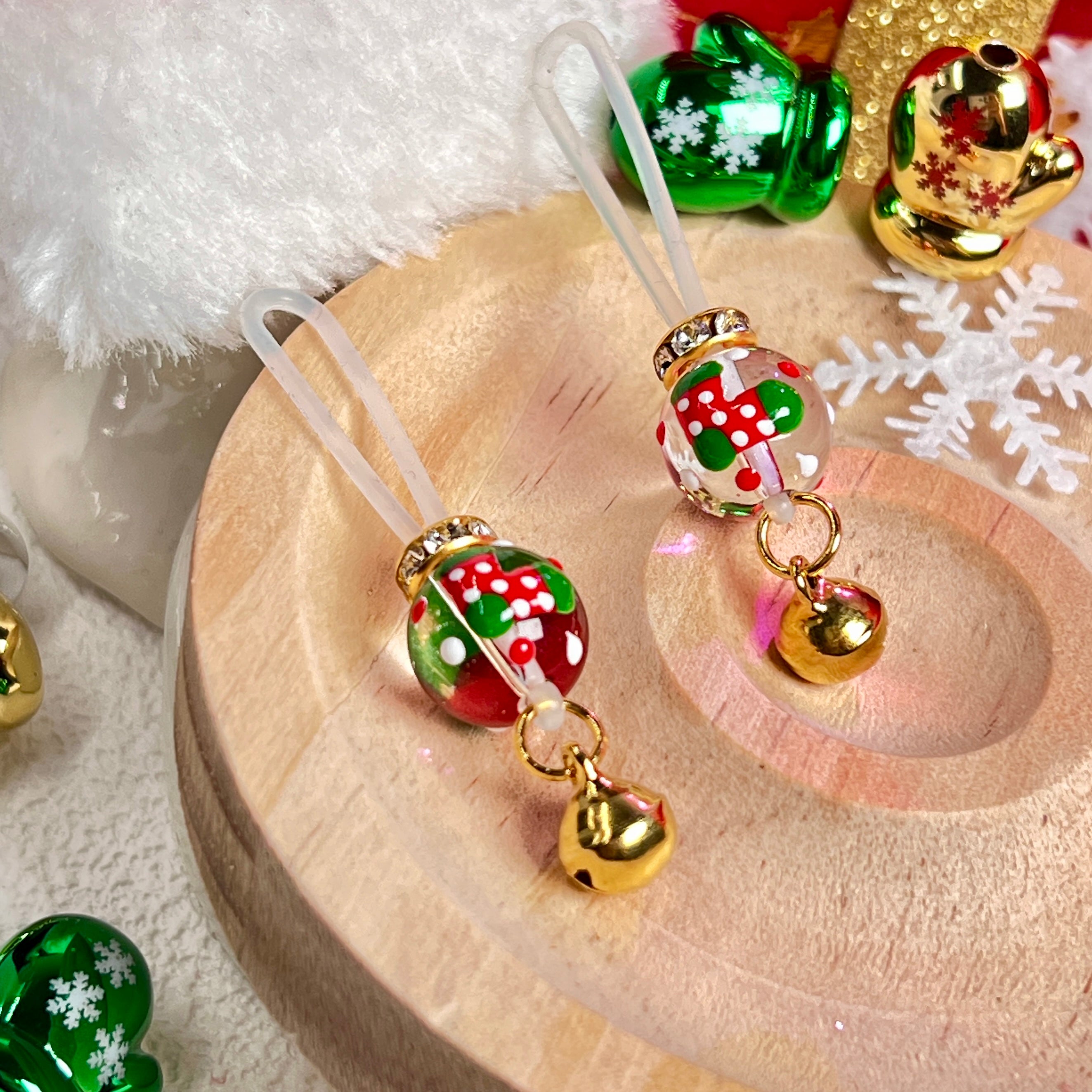 Translucent round beads paired with festive red and green Christmas stocking charms and golden bell pendants. The adjustable nipple clips combine elegance with playful allure, adding a touch of luxury to intimate moments.