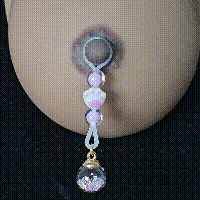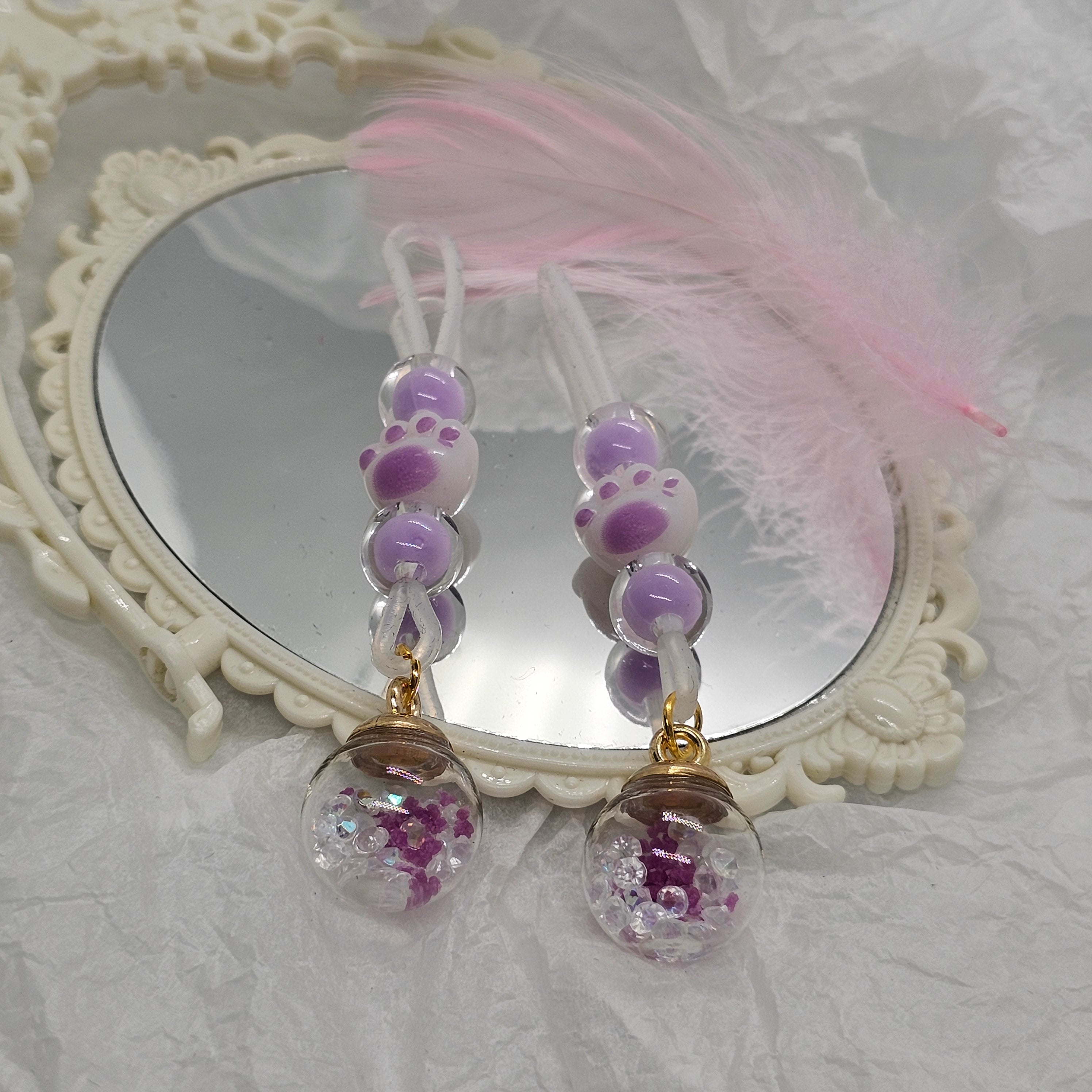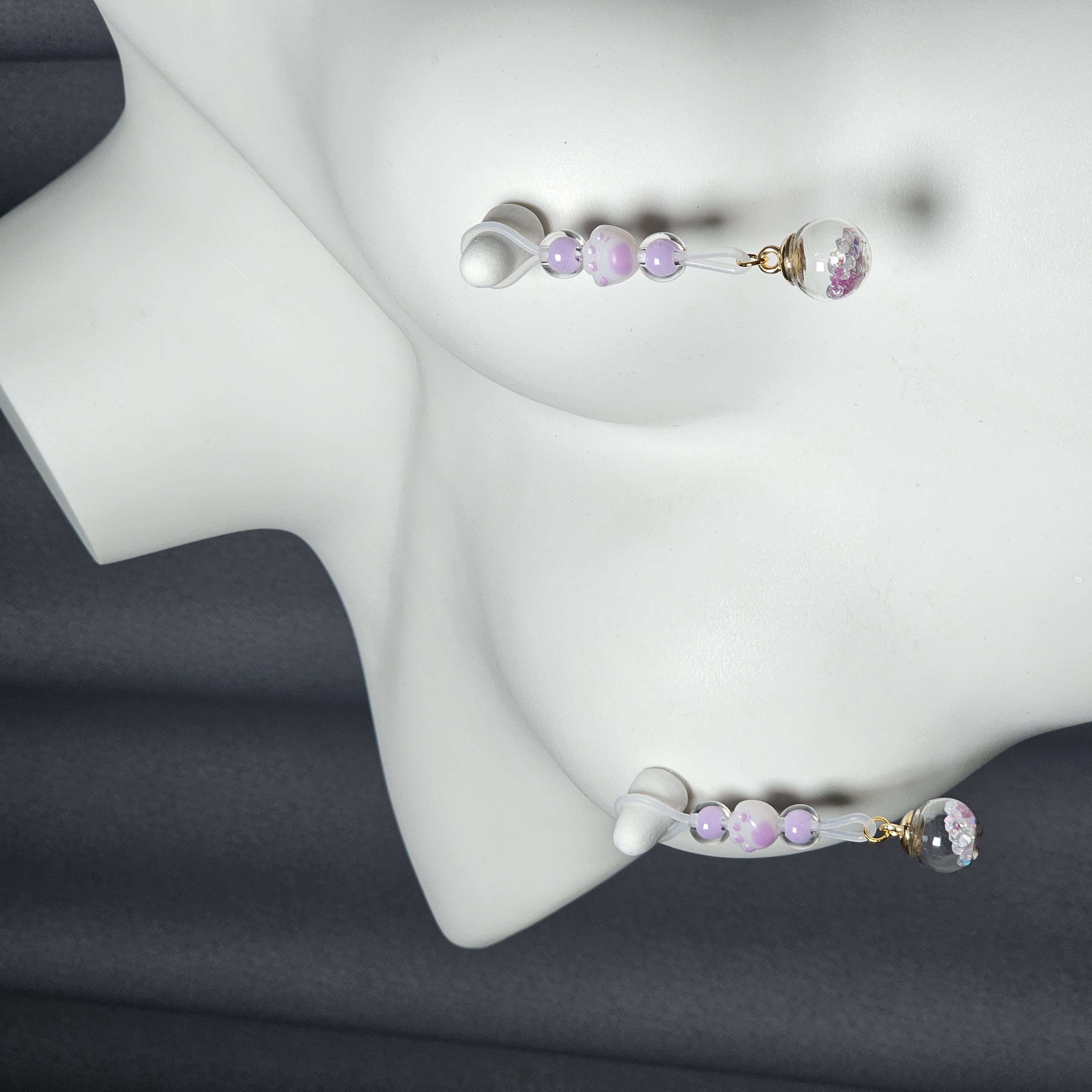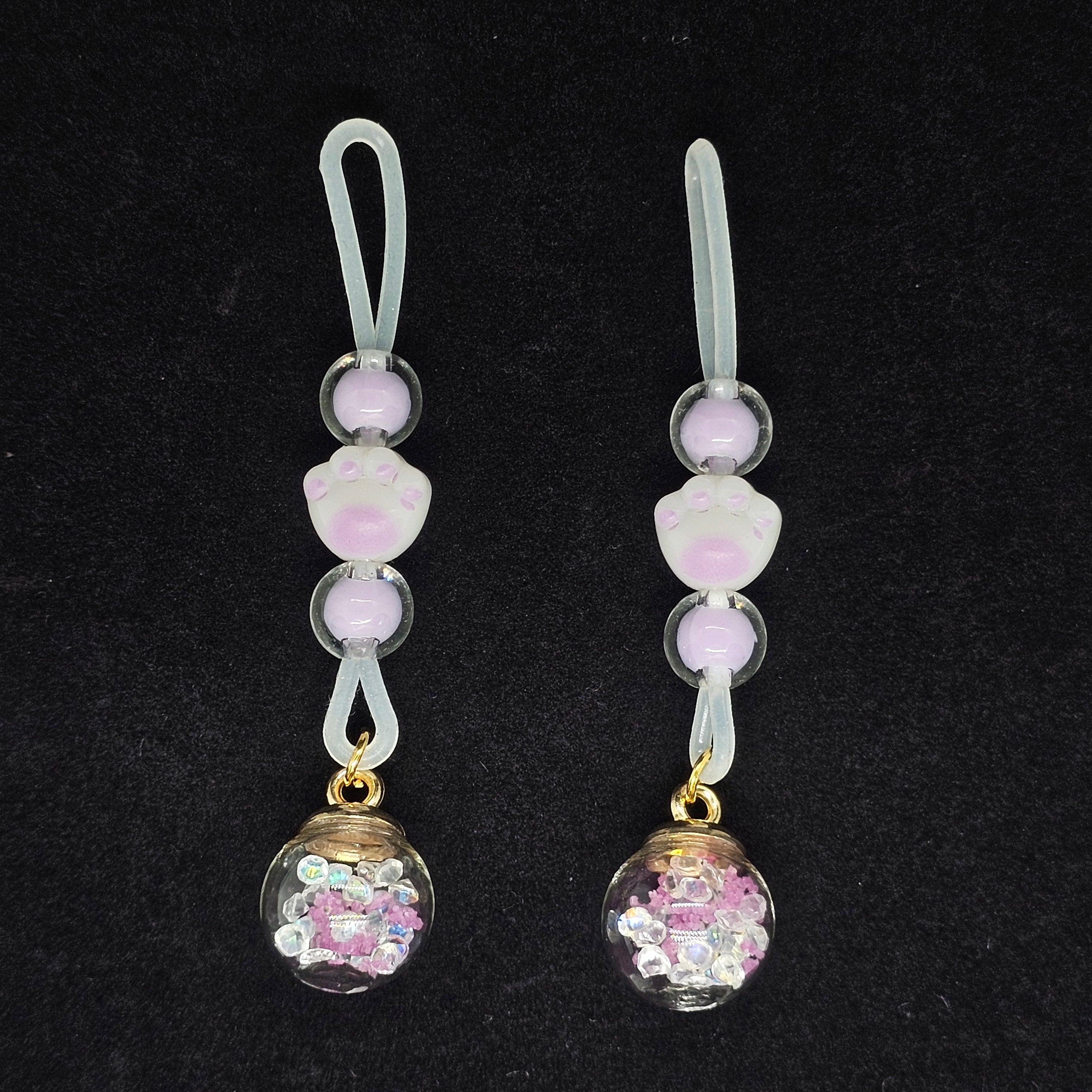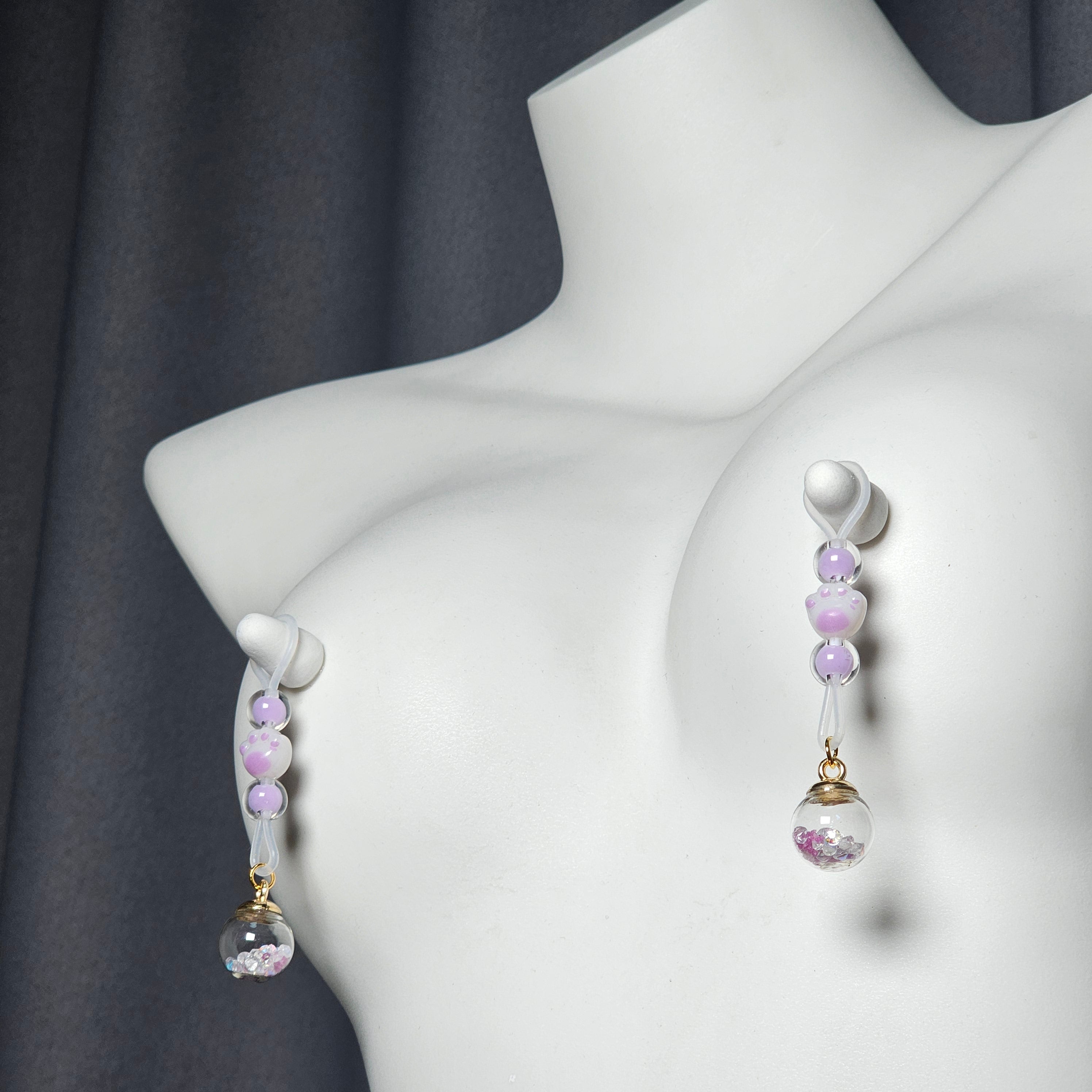 Enhance your intimate style with this adjustable barbell nipple clamp, featuring a charming white and purple cat paw, translucent lavender beads, and a miniature transparent treasure jar pendant. The open-ended barbell design ensures secure, comfortable wear and allows easy adjustment for a personalized fit. The delicate interplay of soft purple tones, whimsical cat paw, and sparkling treasure jar creates a sophisticated yet playful aesthetic. Lightweight yet durable, this piece combines artistic craftsmanship with high-quality materials, making it a versatile accessory for layered styling or standalone statement wear. Perfect for those who appreciate elegance infused with charm and individuality, this nipple clamp exudes subtle luxury and captivating design.
