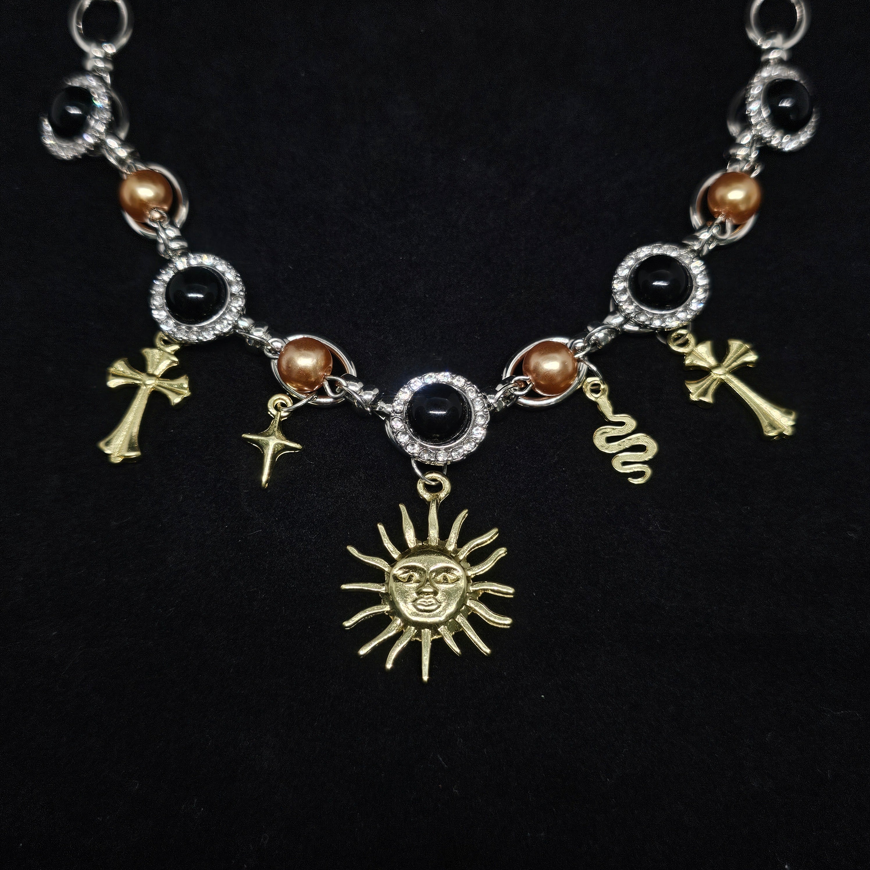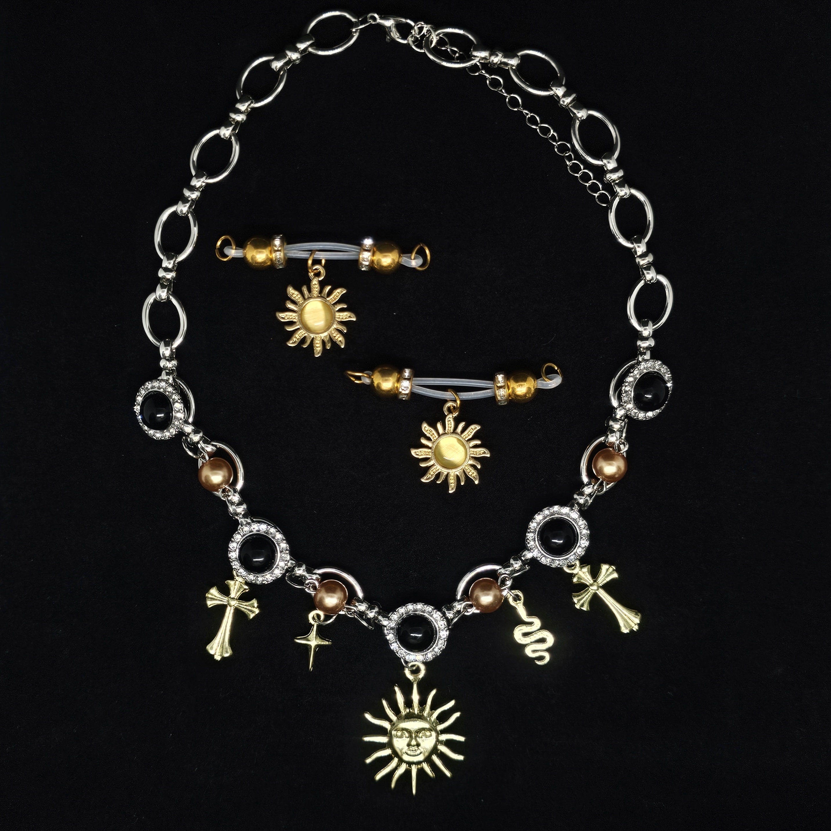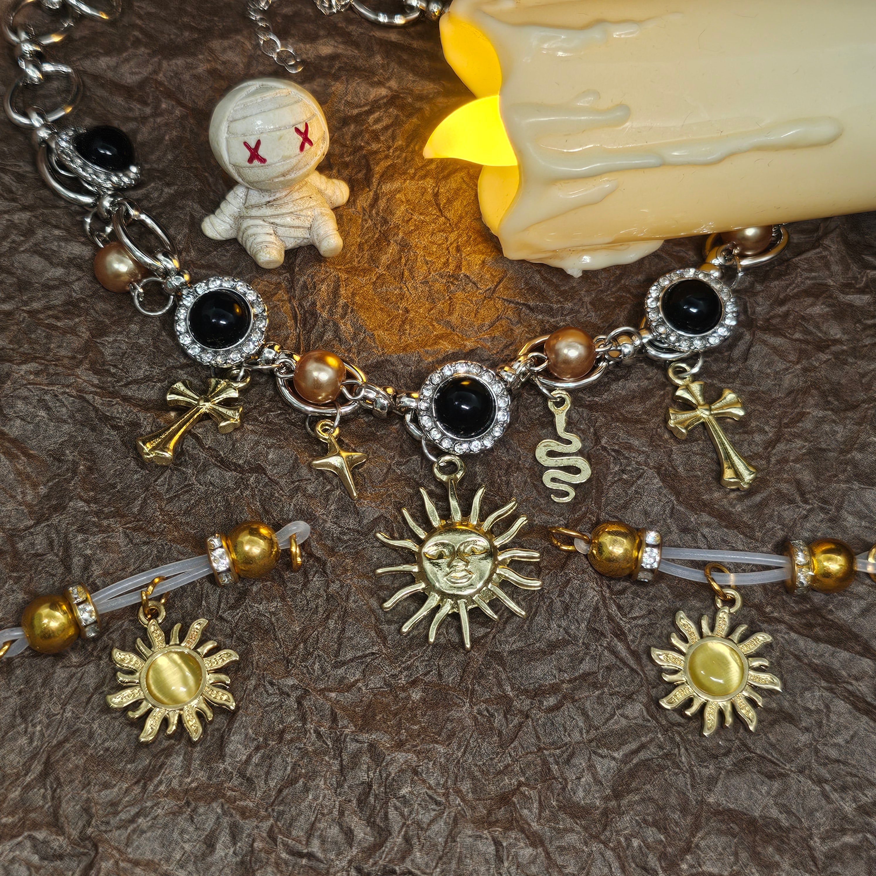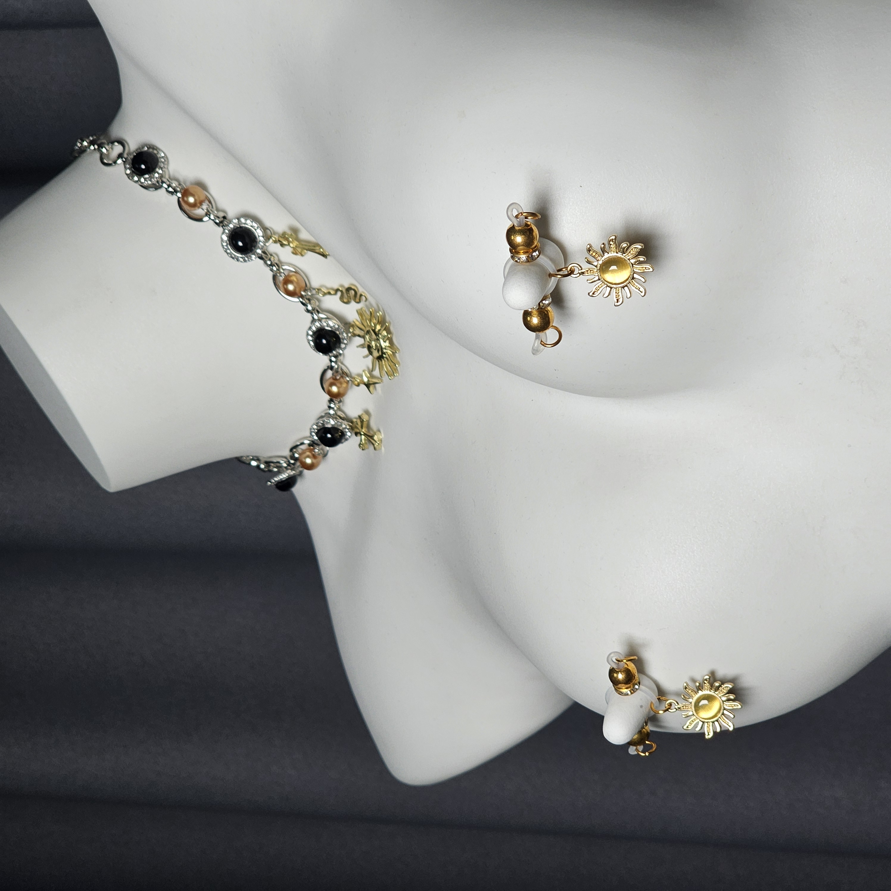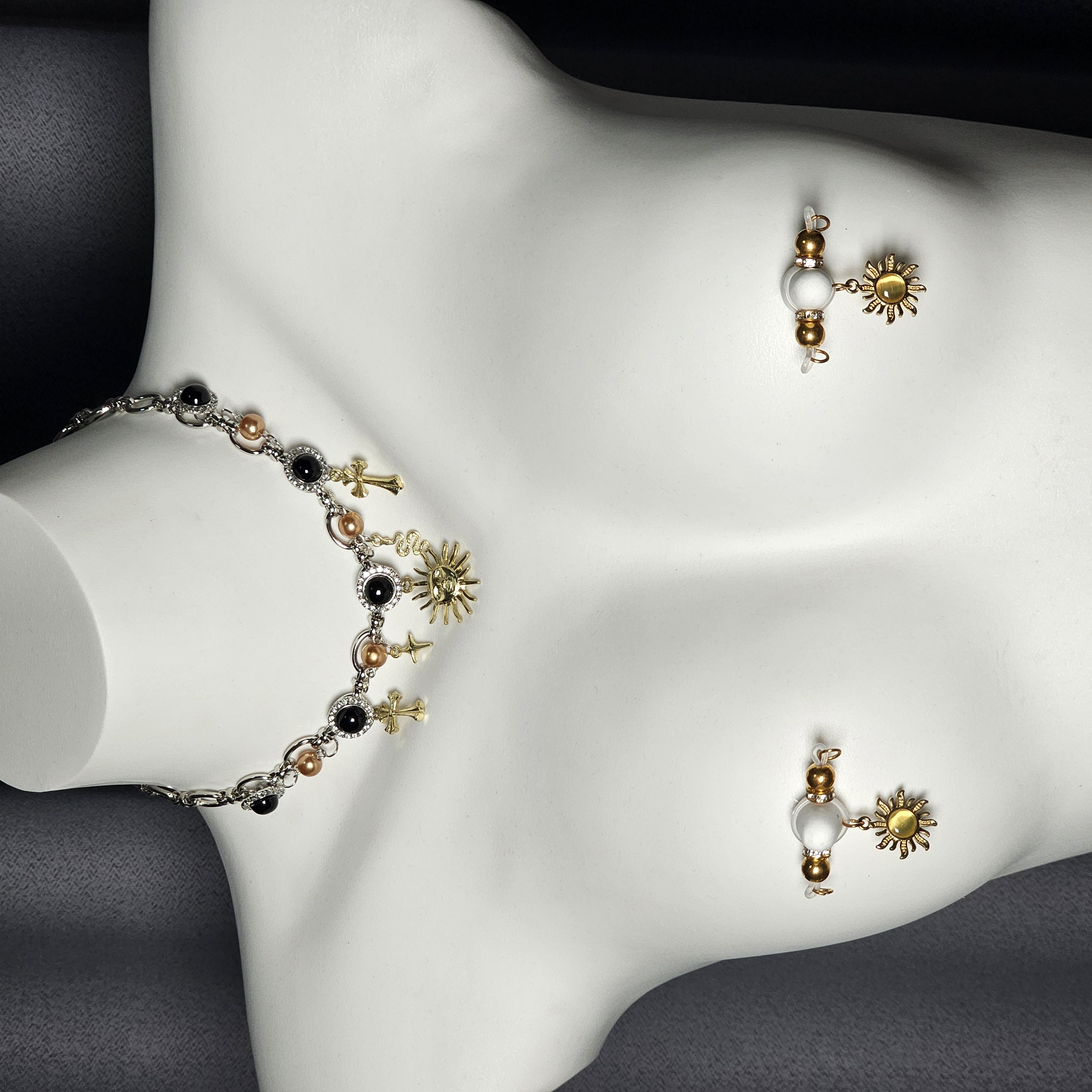 A luxurious ensemble featuring gold beads, gemstone sunflowers, black diamond energy stones, vintage cross, brown energy beads, and a golden serpent pendant—versatile as a nipple clamp and necklace.