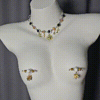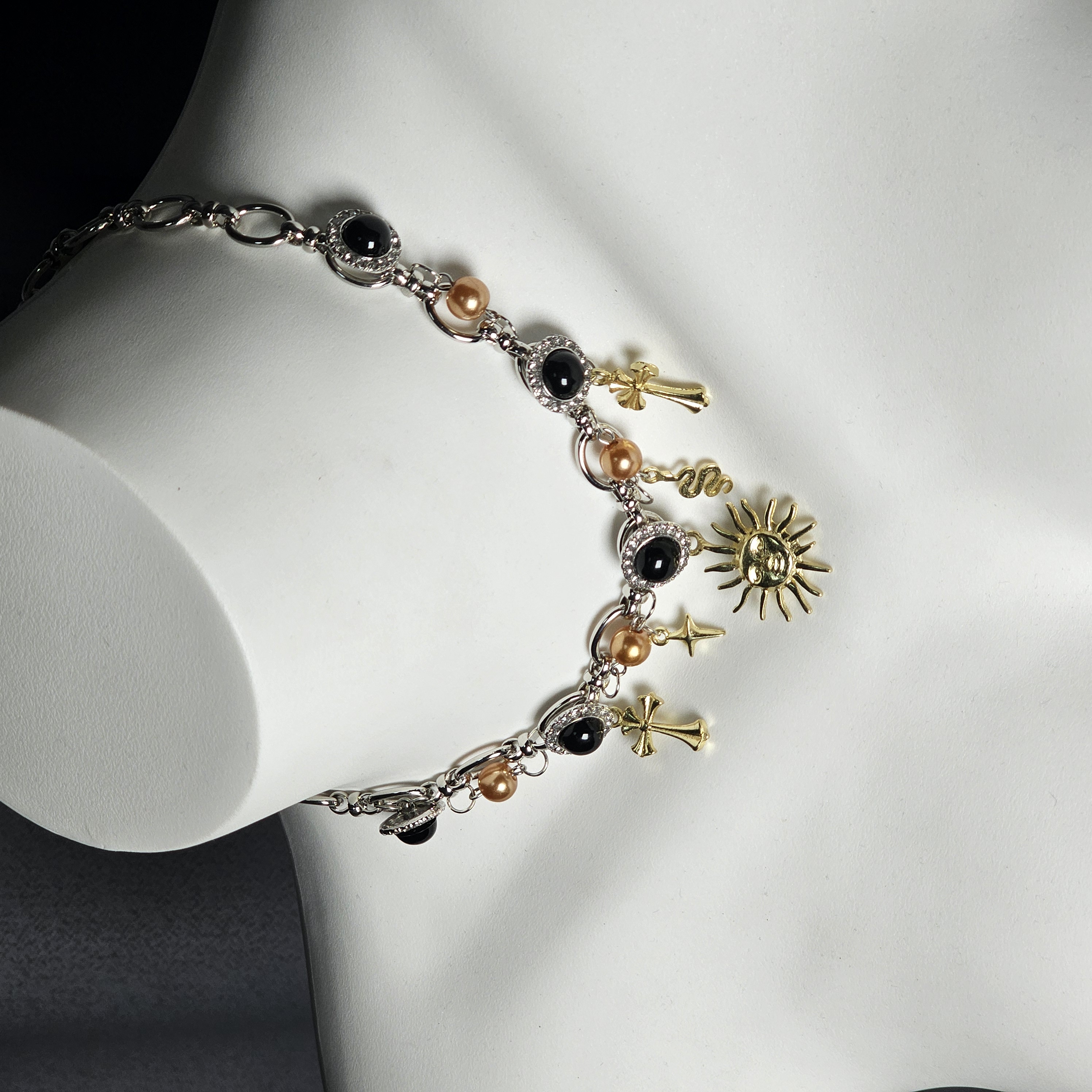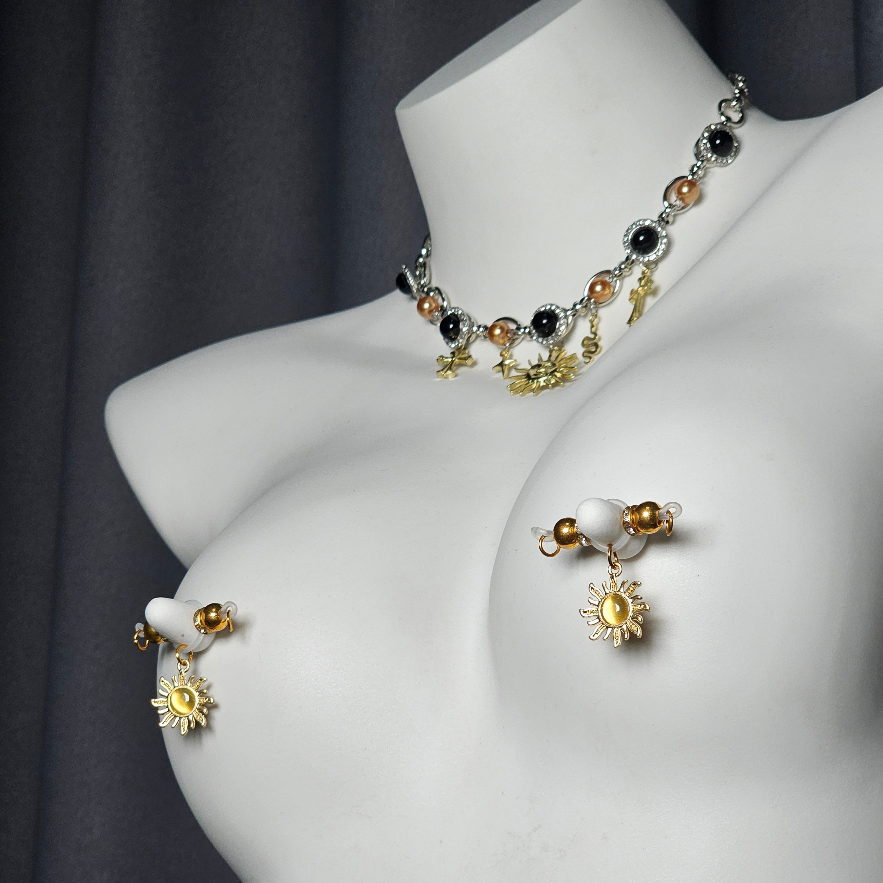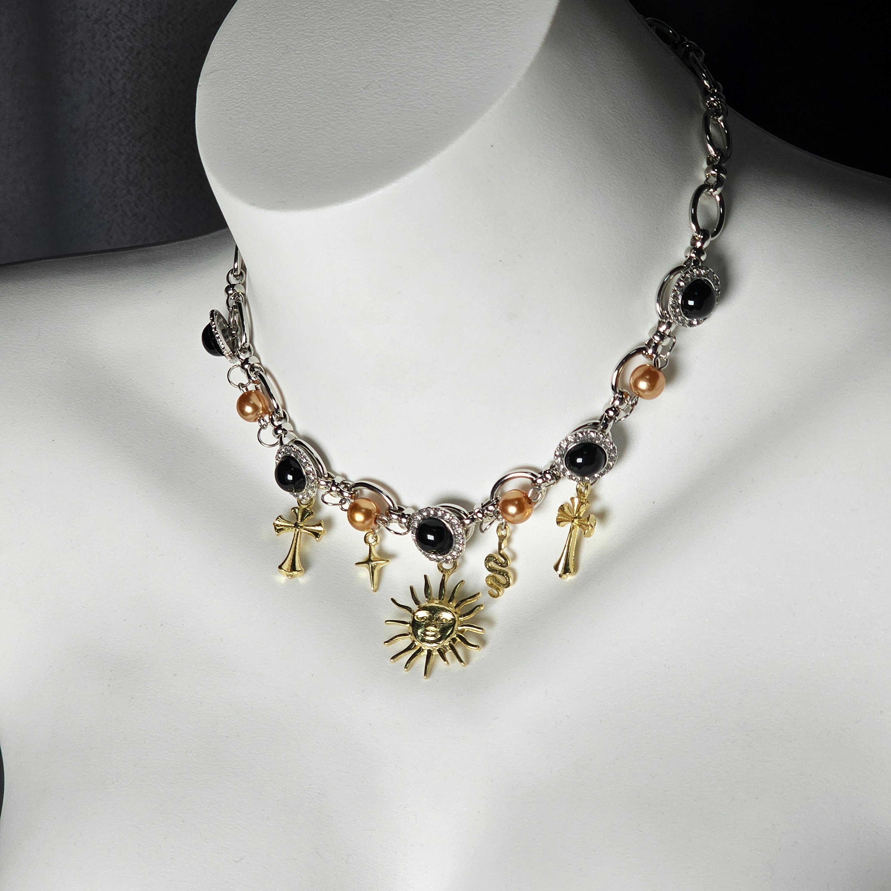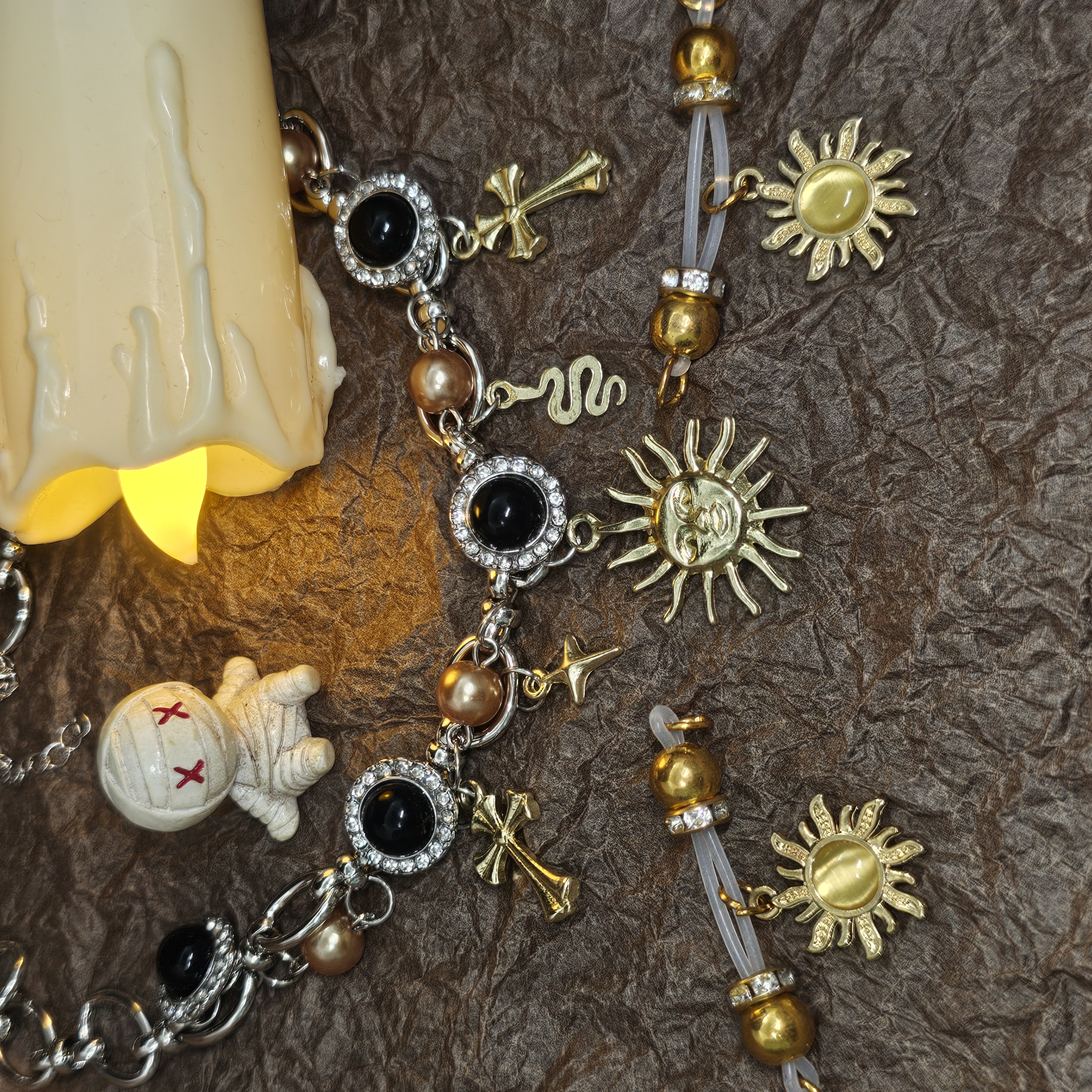 A luxurious ensemble featuring gold beads, gemstone sunflowers, black diamond energy stones, vintage cross, brown energy beads, and a golden serpent pendant—versatile as a nipple clamp and necklace.